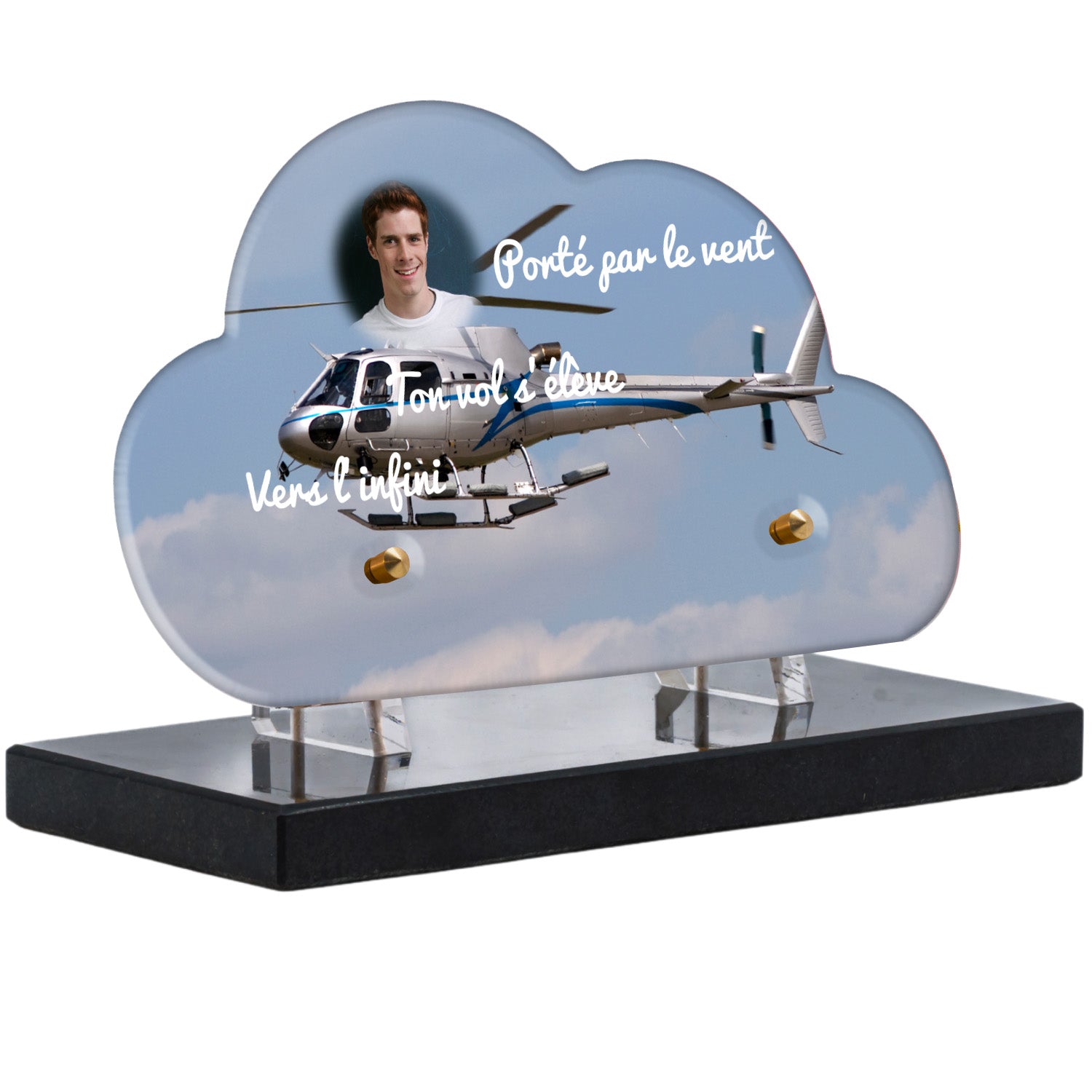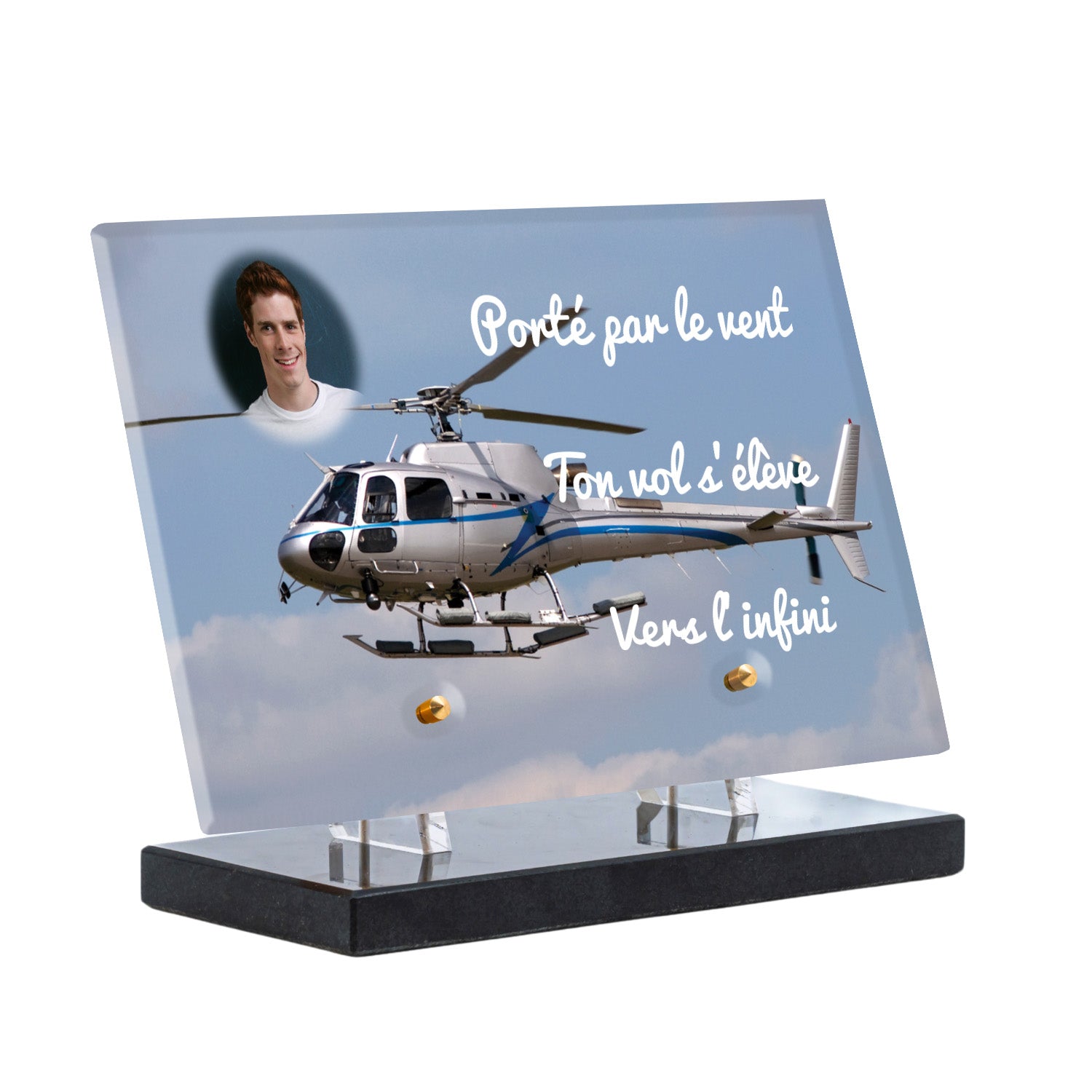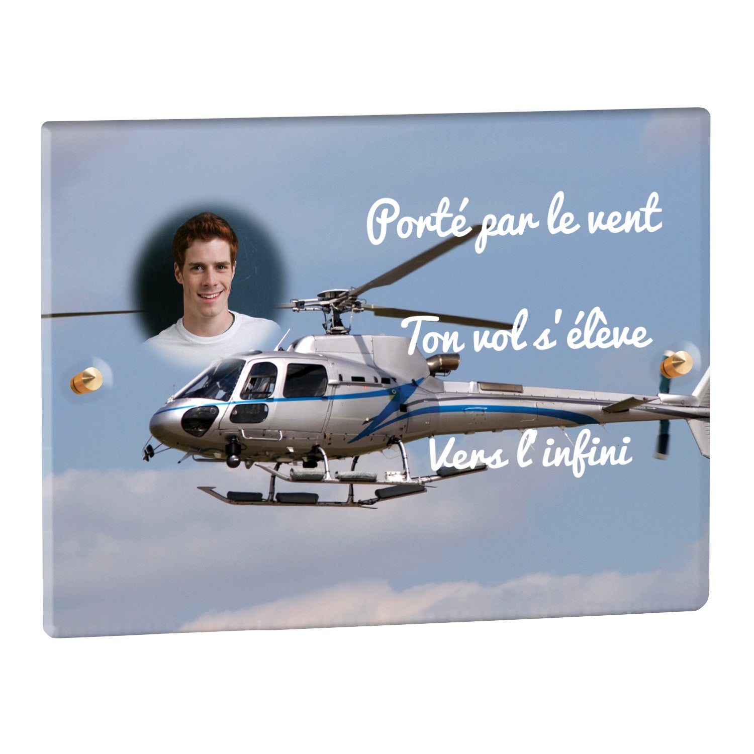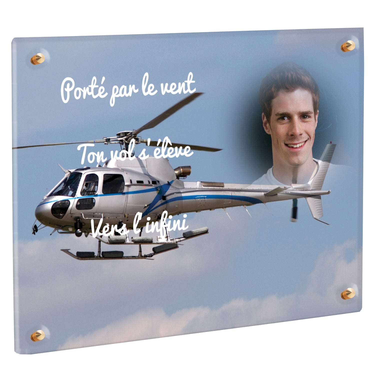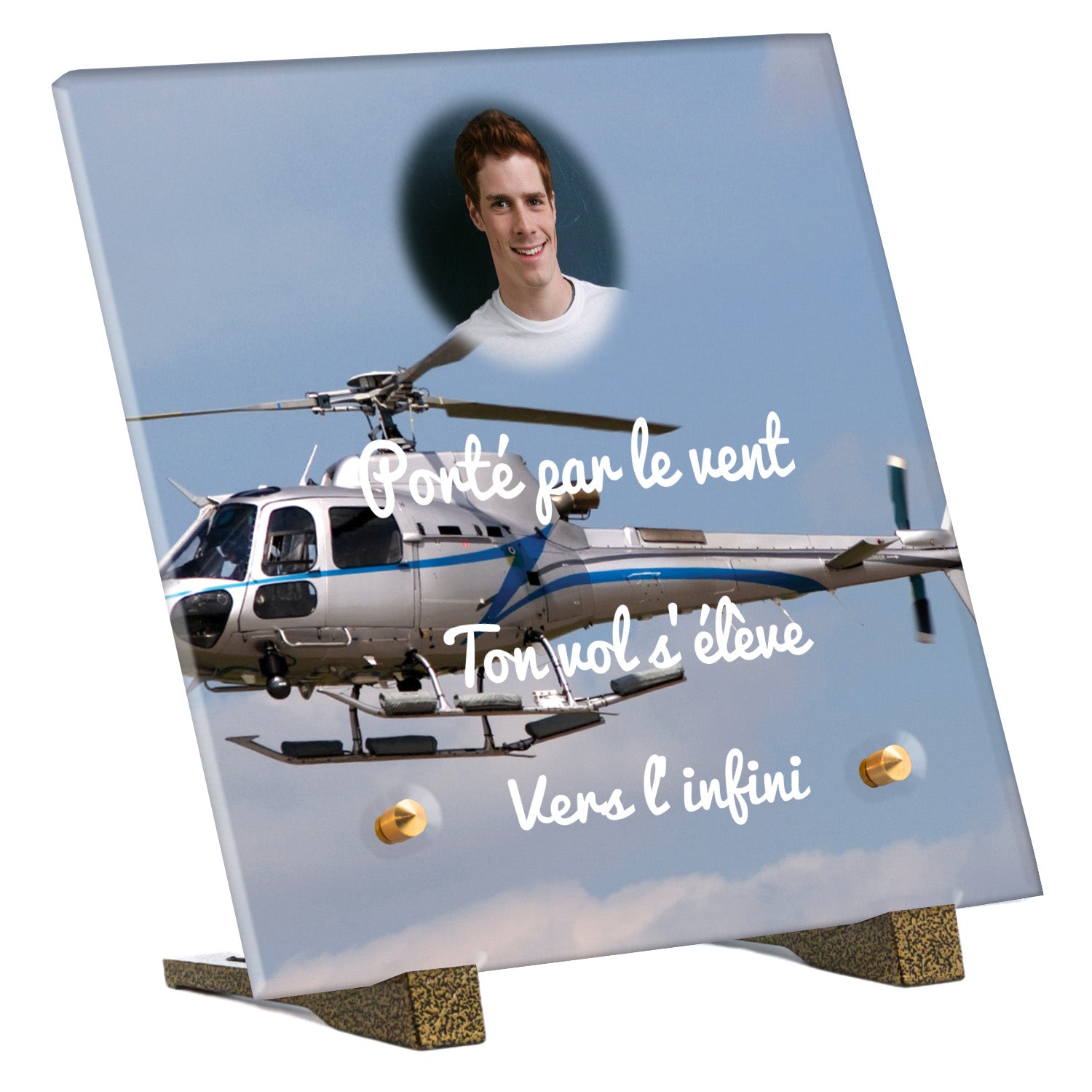 Cette plaque funéraire personnalisée représente un hélicoptère en vol, symbole de liberté et d’aventure, pour rendre un hommage unique et chargé de sens. Fabriquée en plexiglas, cette plaque mortuaire allie modernité et élégance, parfaite pour une plaque funéraire moderne qui valorise la mémoire de manière originale et durable.