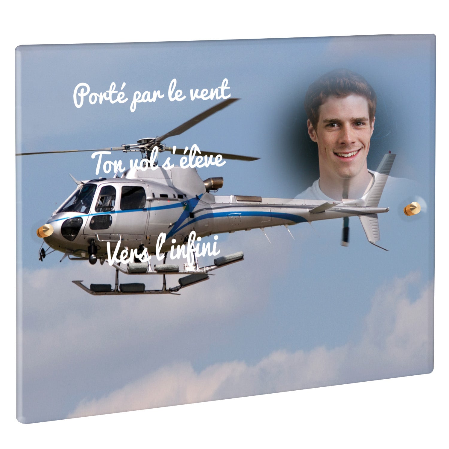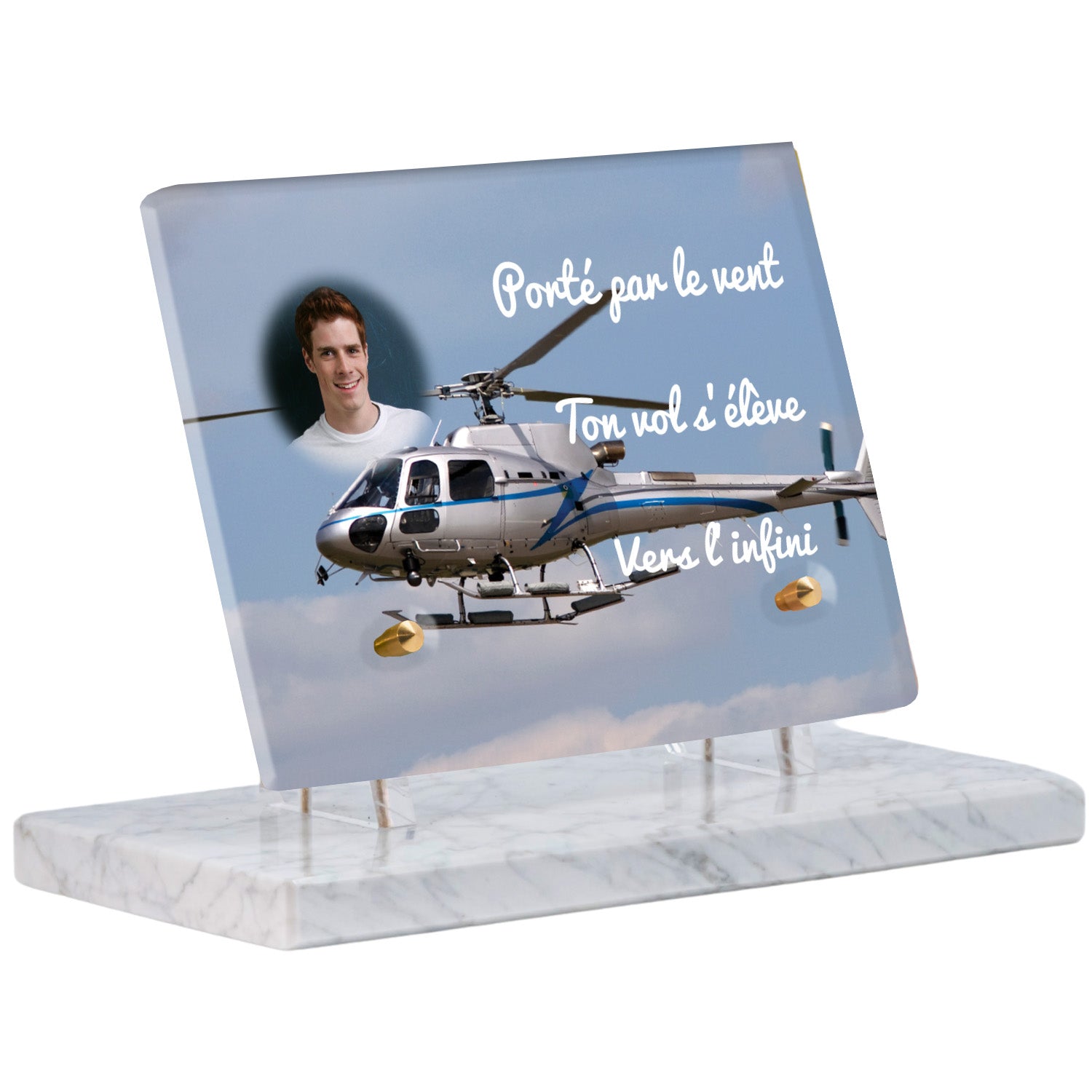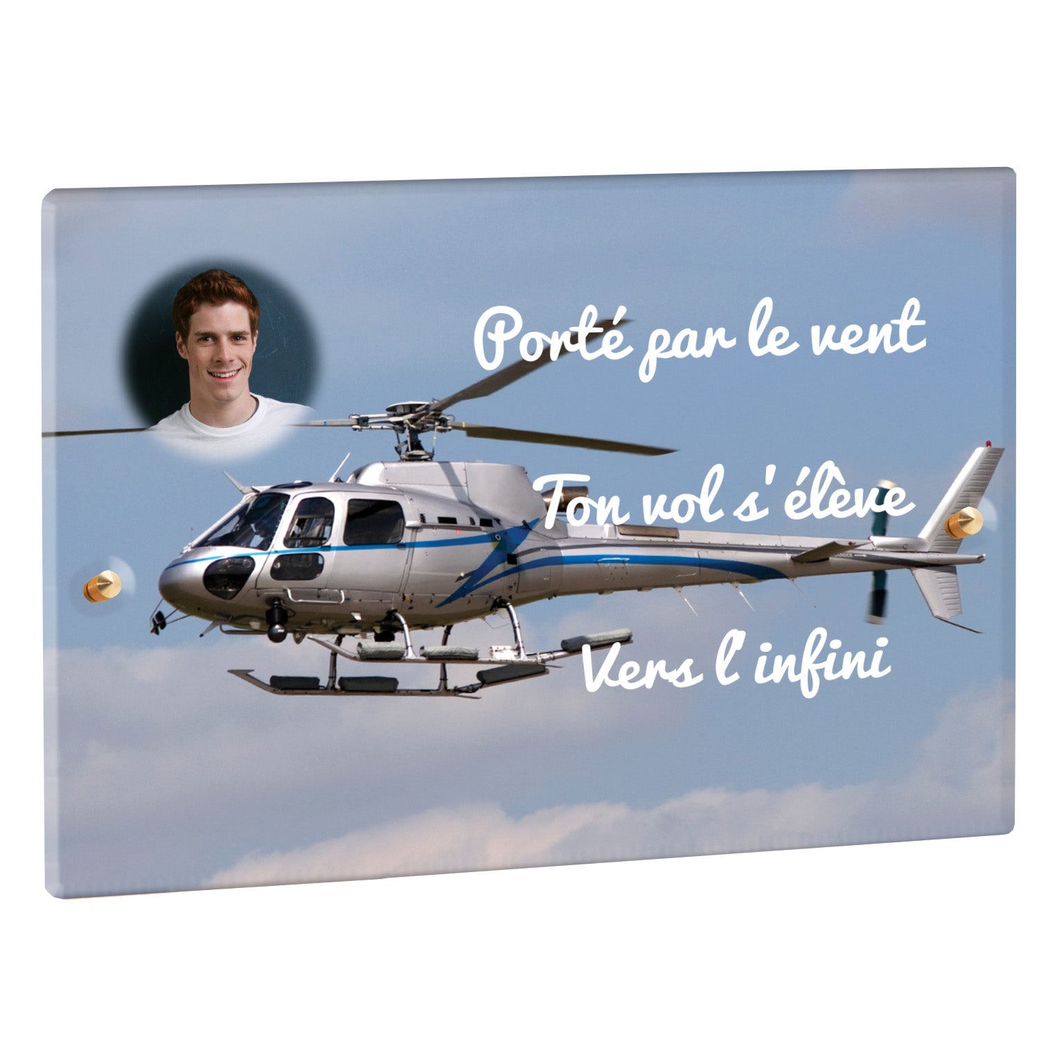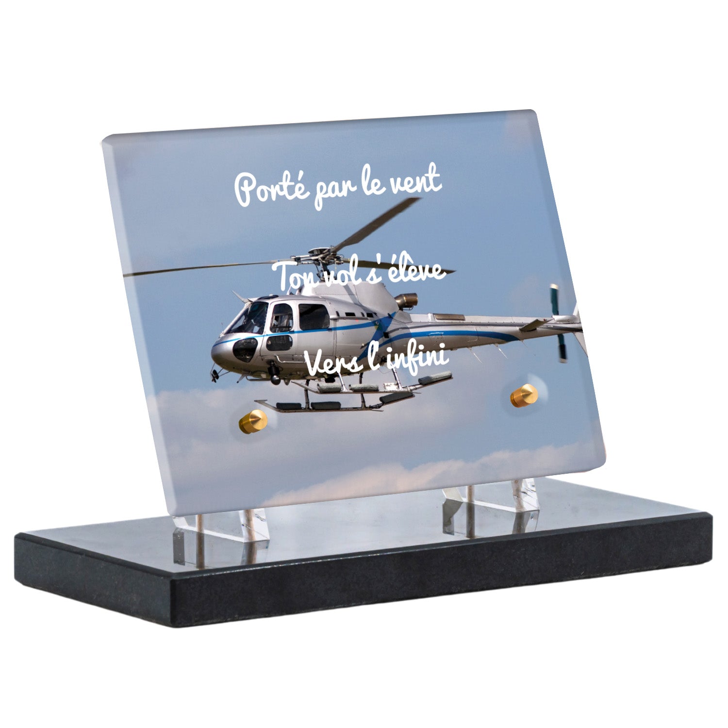 Cette plaque funéraire personnalisée représente un hélicoptère en vol, symbole de liberté et d’aventure, pour rendre un hommage unique et chargé de sens. Fabriquée en plexiglas, cette plaque mortuaire allie modernité et élégance, parfaite pour une plaque funéraire moderne qui valorise la mémoire de manière originale et durable.