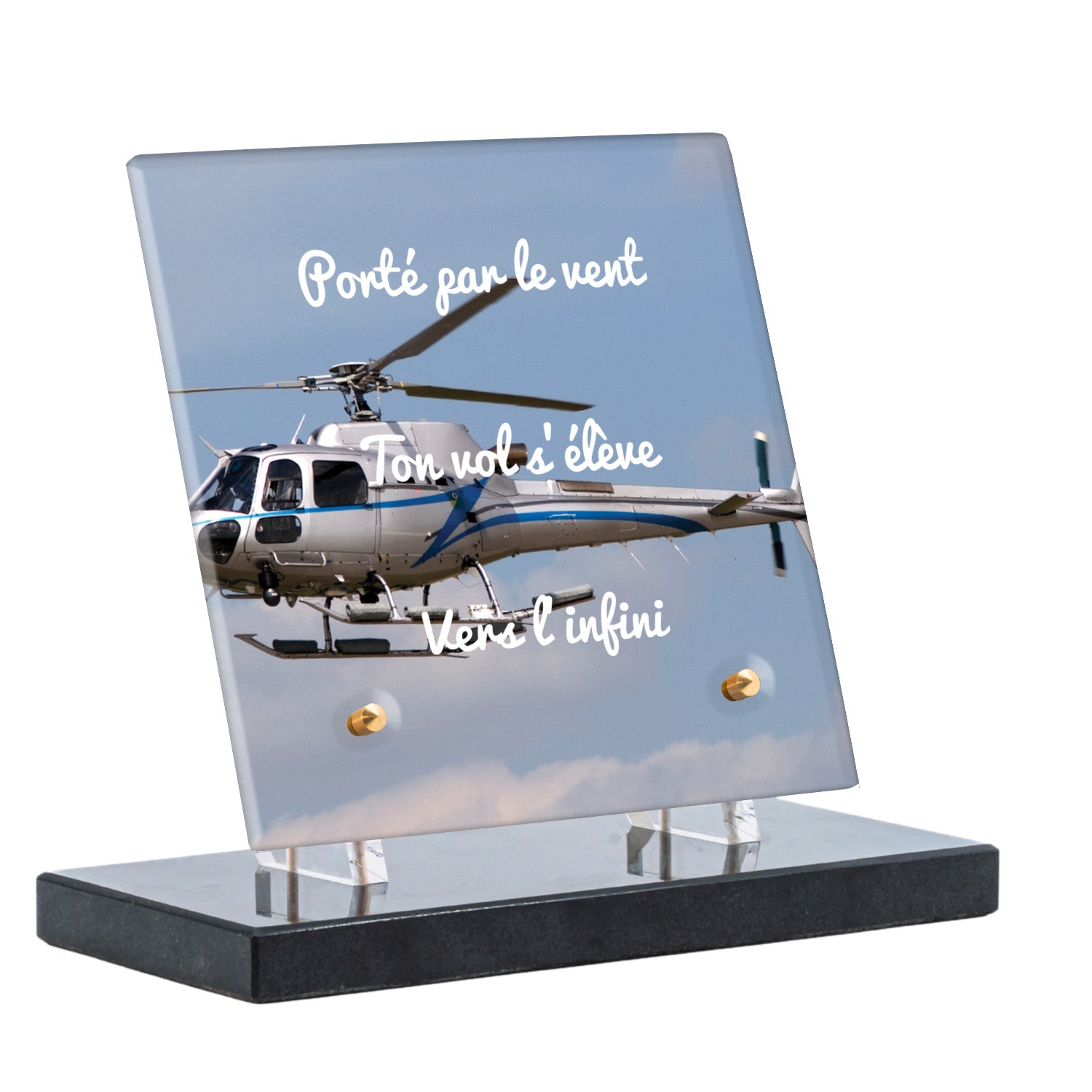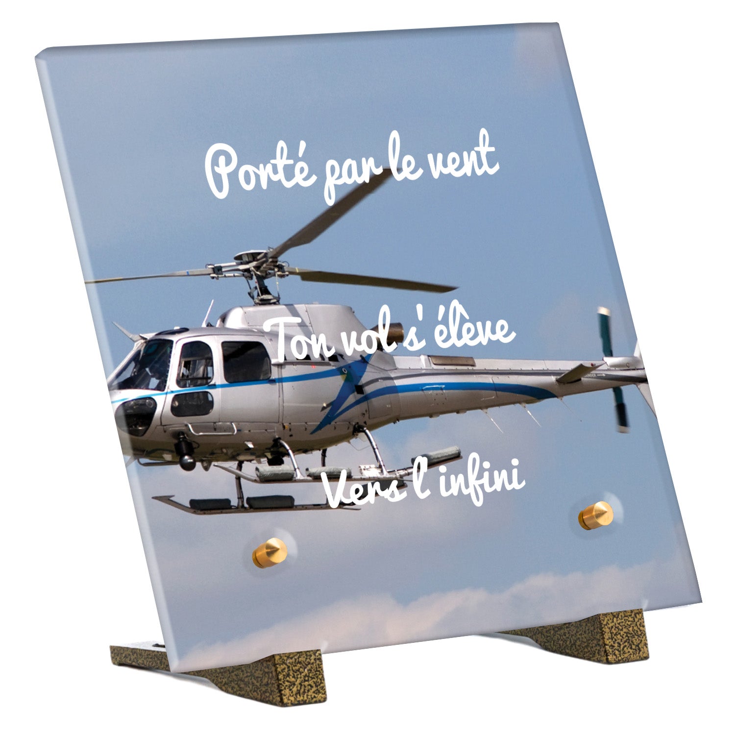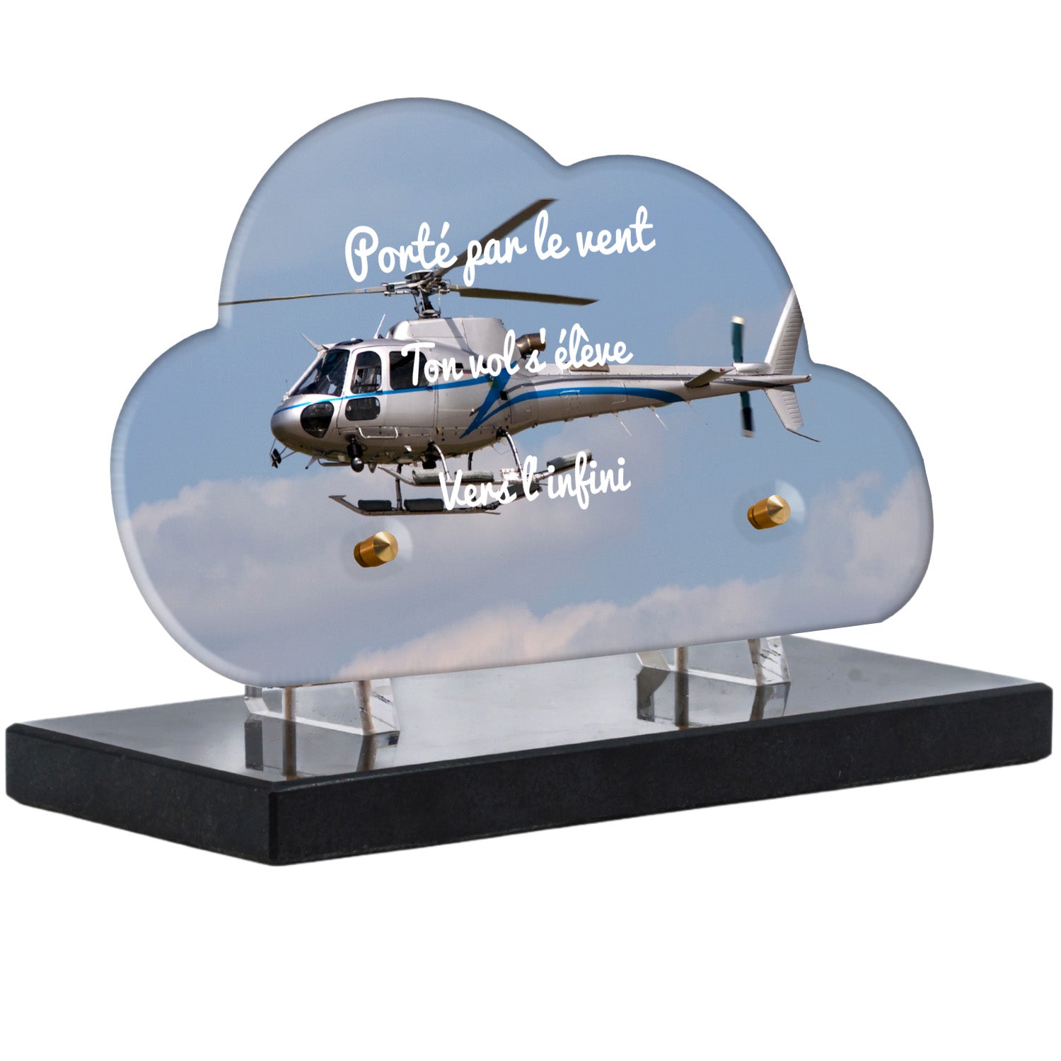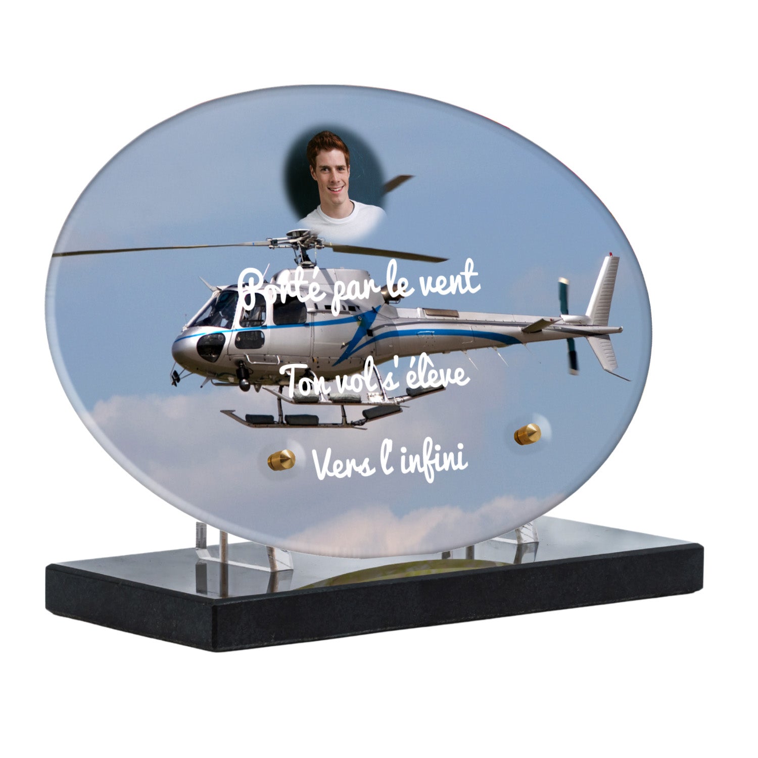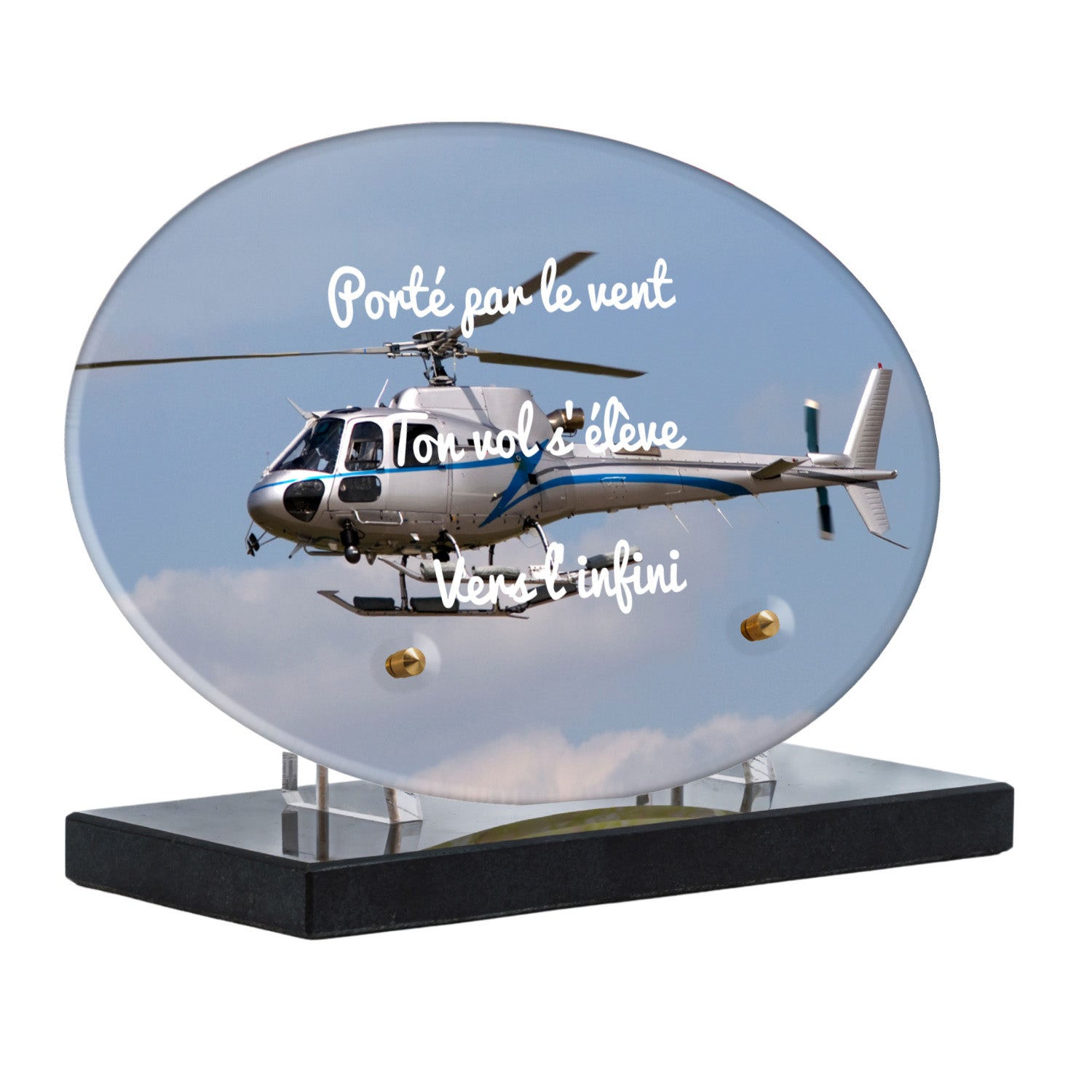 Cette plaque funéraire personnalisée représente un hélicoptère en vol, symbole de liberté et d’aventure, pour rendre un hommage unique et chargé de sens. Fabriquée en plexiglas, cette plaque mortuaire allie modernité et élégance, parfaite pour une plaque funéraire moderne qui valorise la mémoire de manière originale et durable.