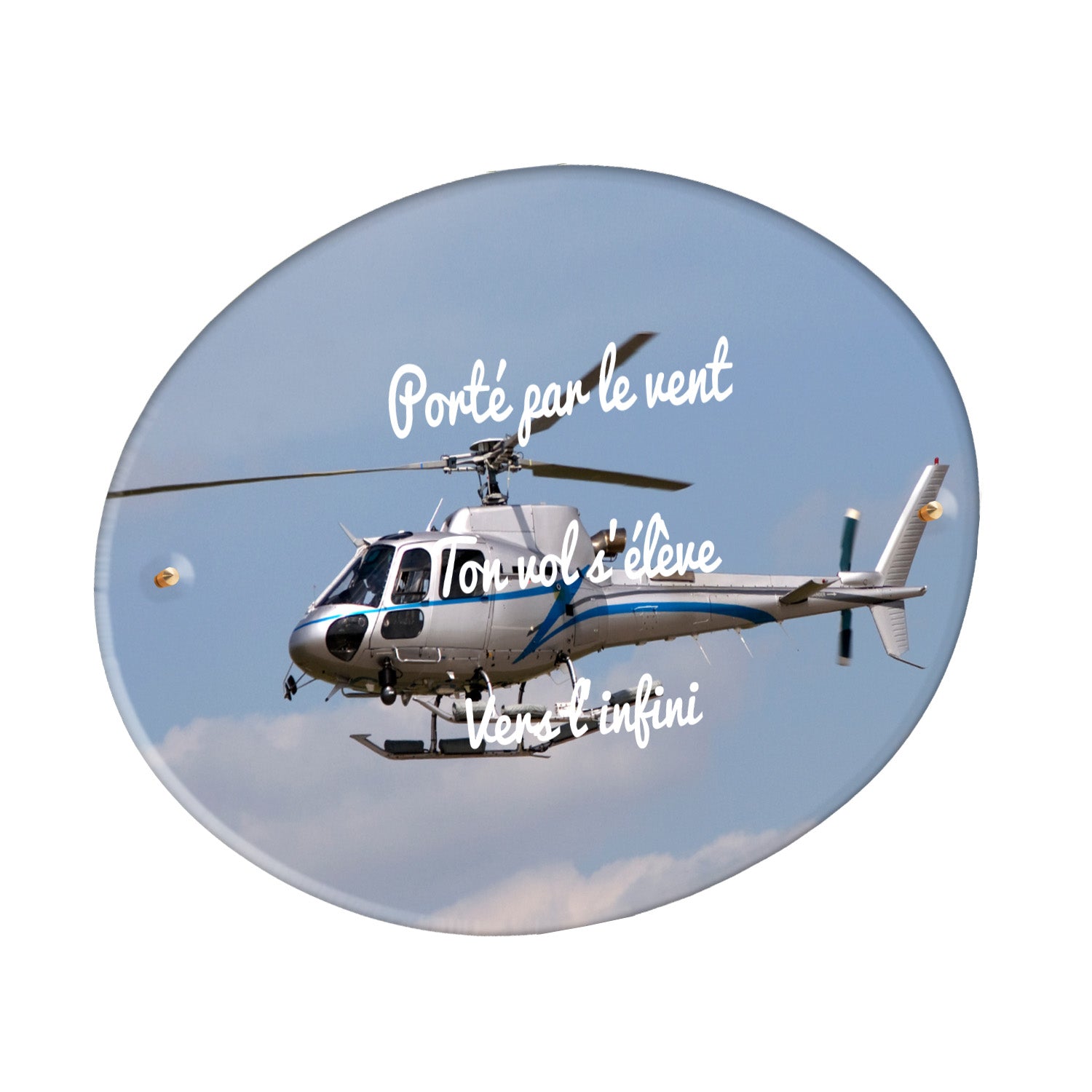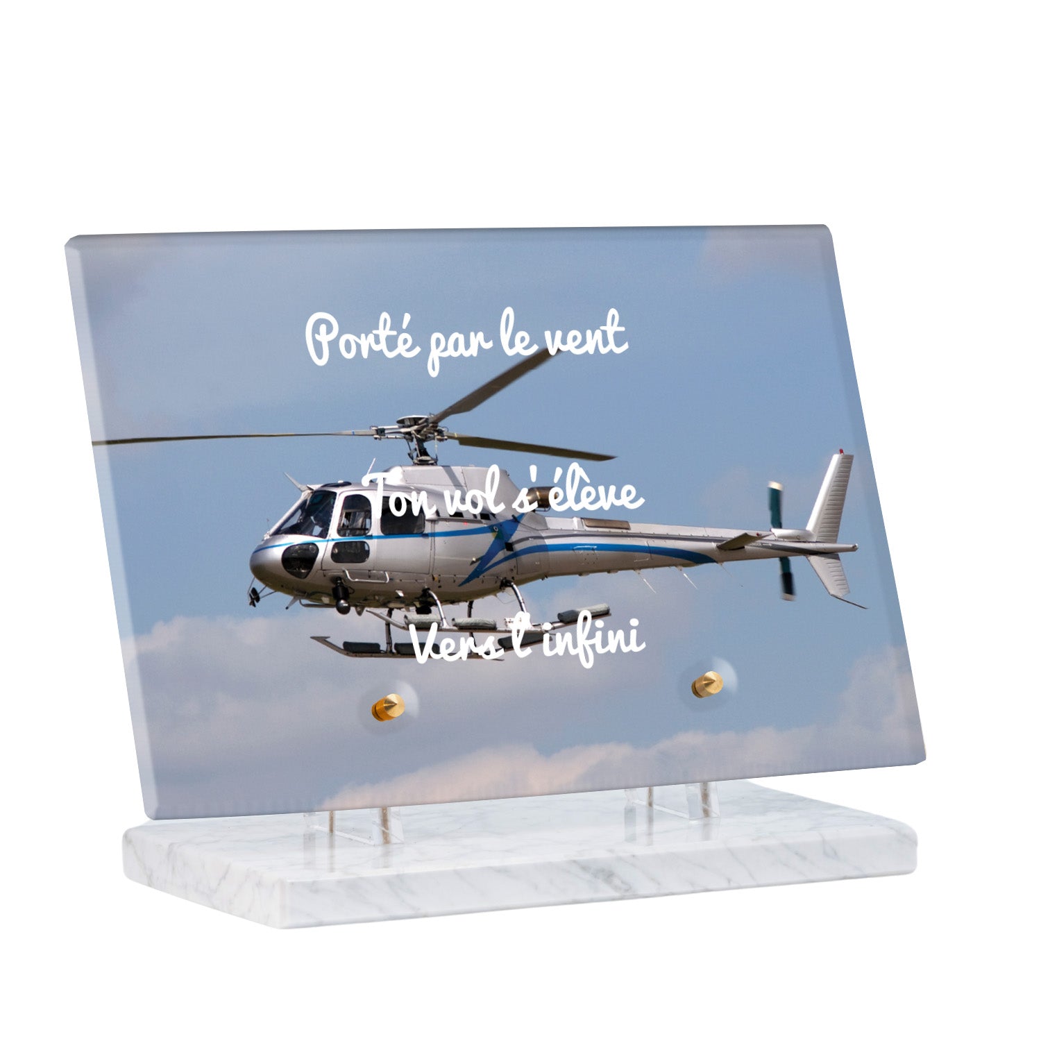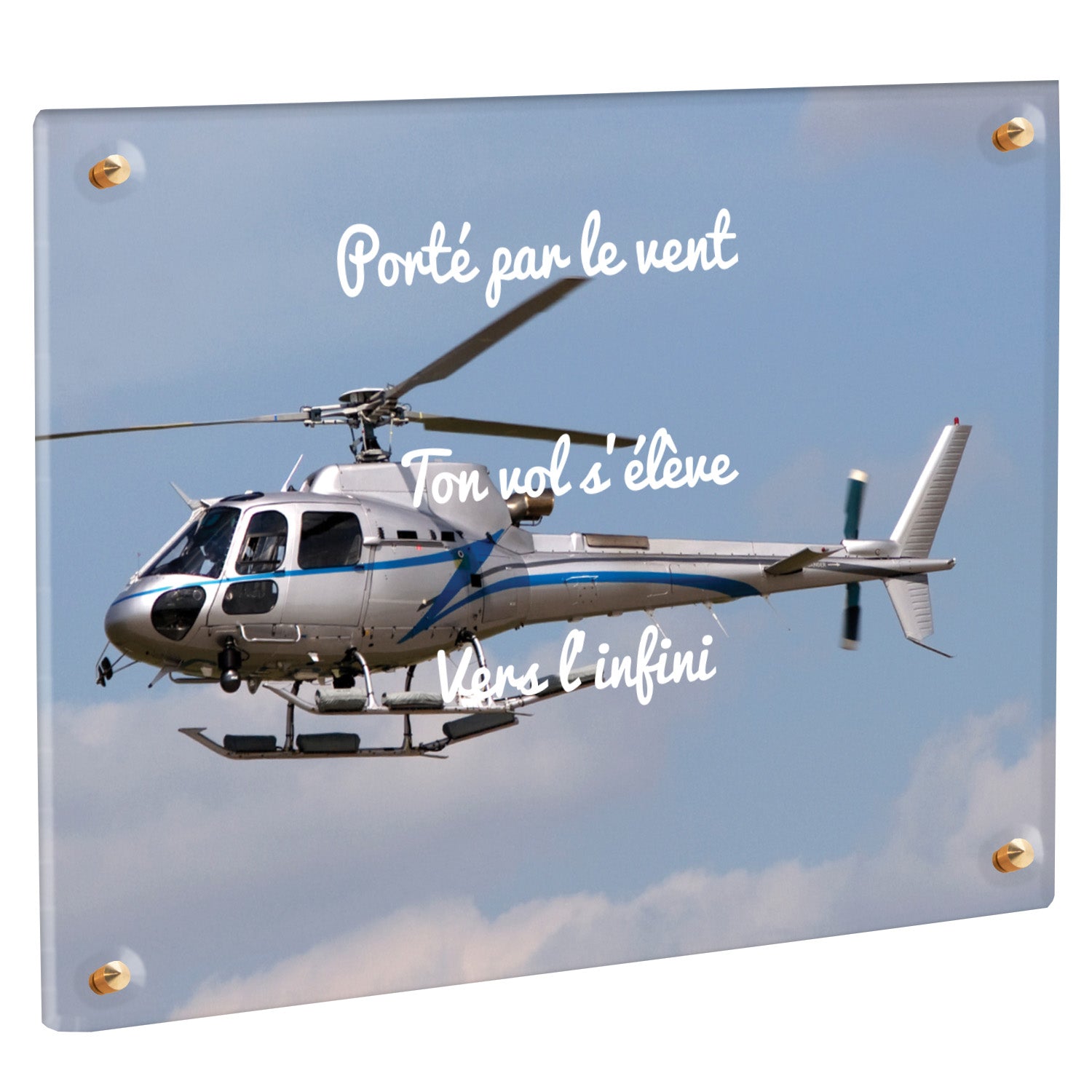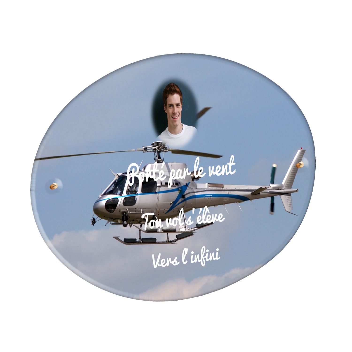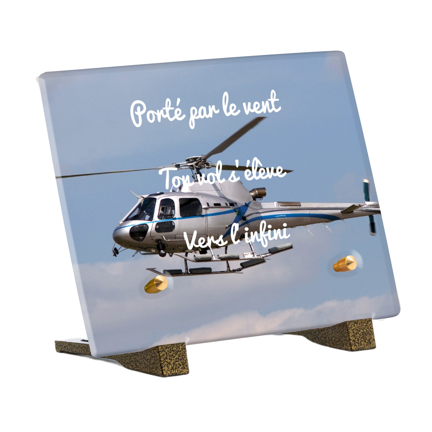 Cette plaque funéraire personnalisée représente un hélicoptère en vol, symbole de liberté et d’aventure, pour rendre un hommage unique et chargé de sens. Fabriquée en plexiglas, cette plaque mortuaire allie modernité et élégance, parfaite pour une plaque funéraire moderne qui valorise la mémoire de manière originale et durable.