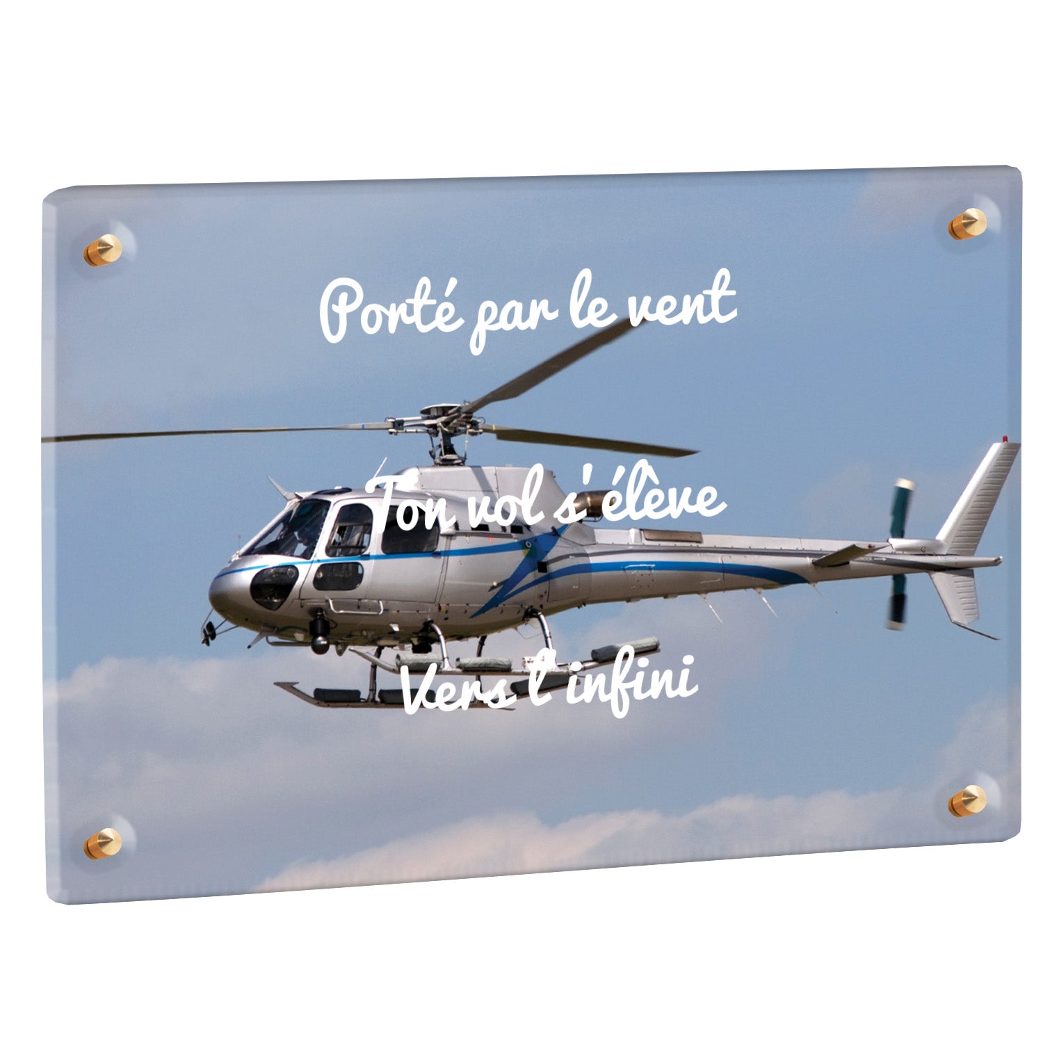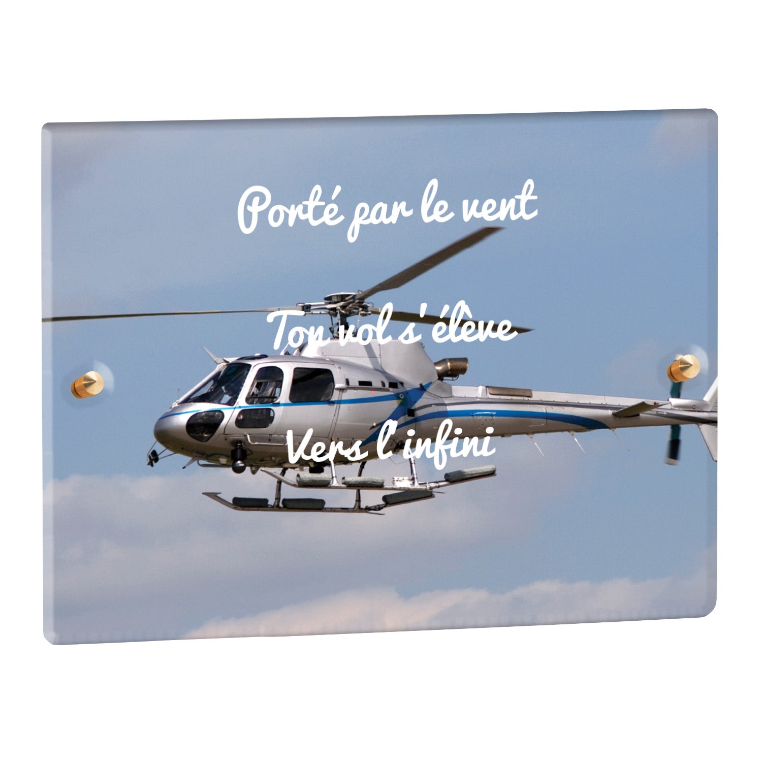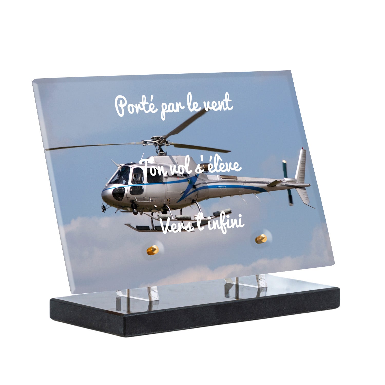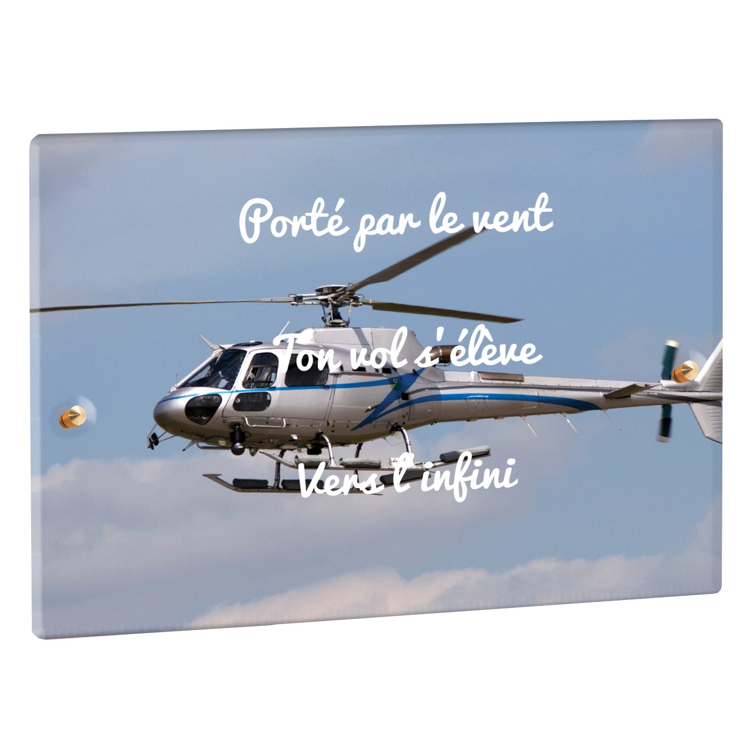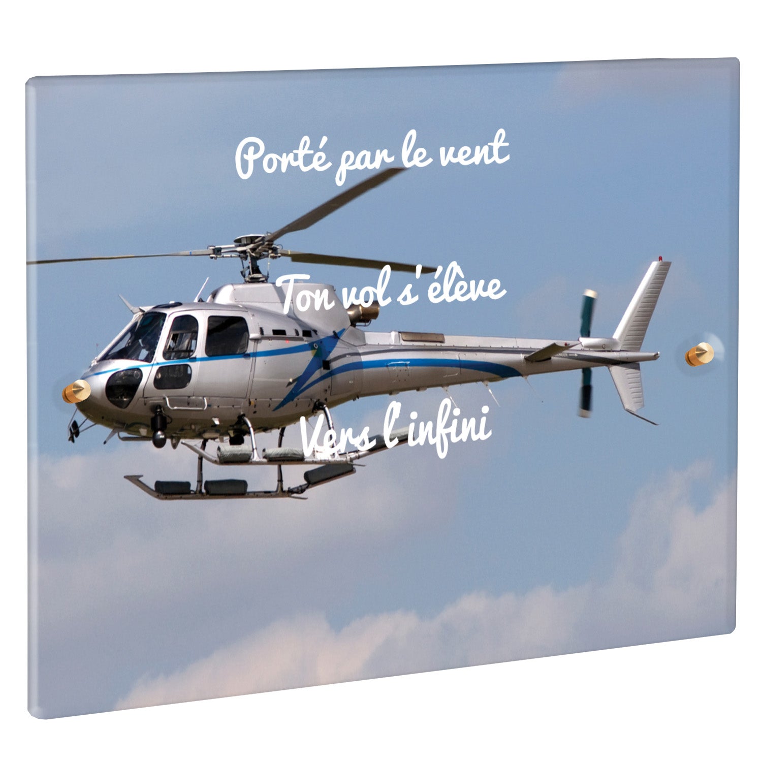 Cette plaque funéraire personnalisée représente un hélicoptère en vol, symbole de liberté et d’aventure, pour rendre un hommage unique et chargé de sens. Fabriquée en plexiglas, cette plaque mortuaire allie modernité et élégance, parfaite pour une plaque funéraire moderne qui valorise la mémoire de manière originale et durable.