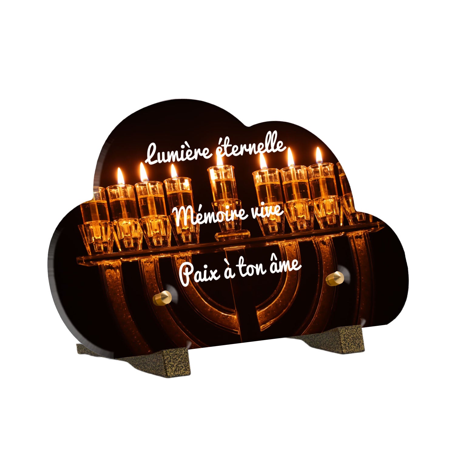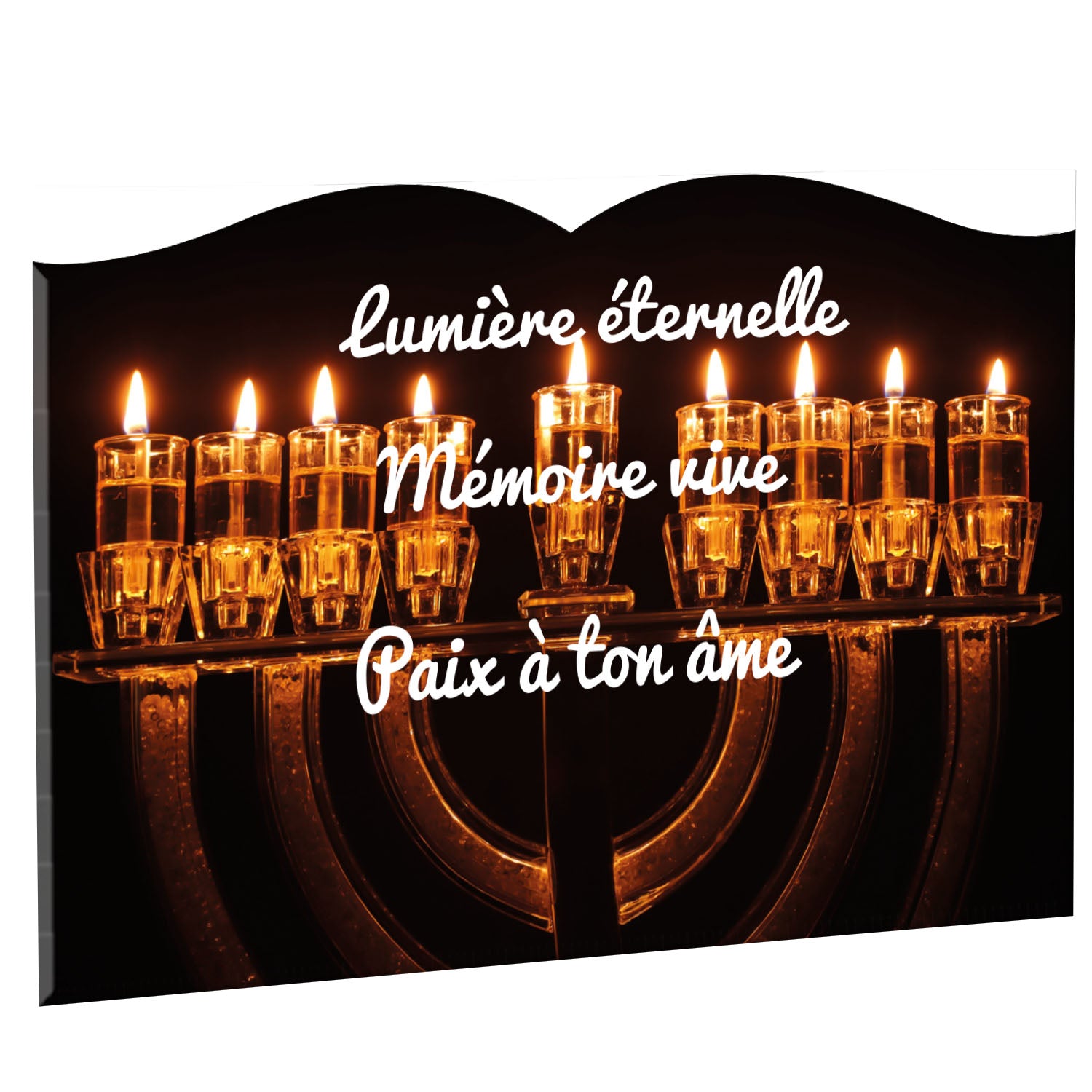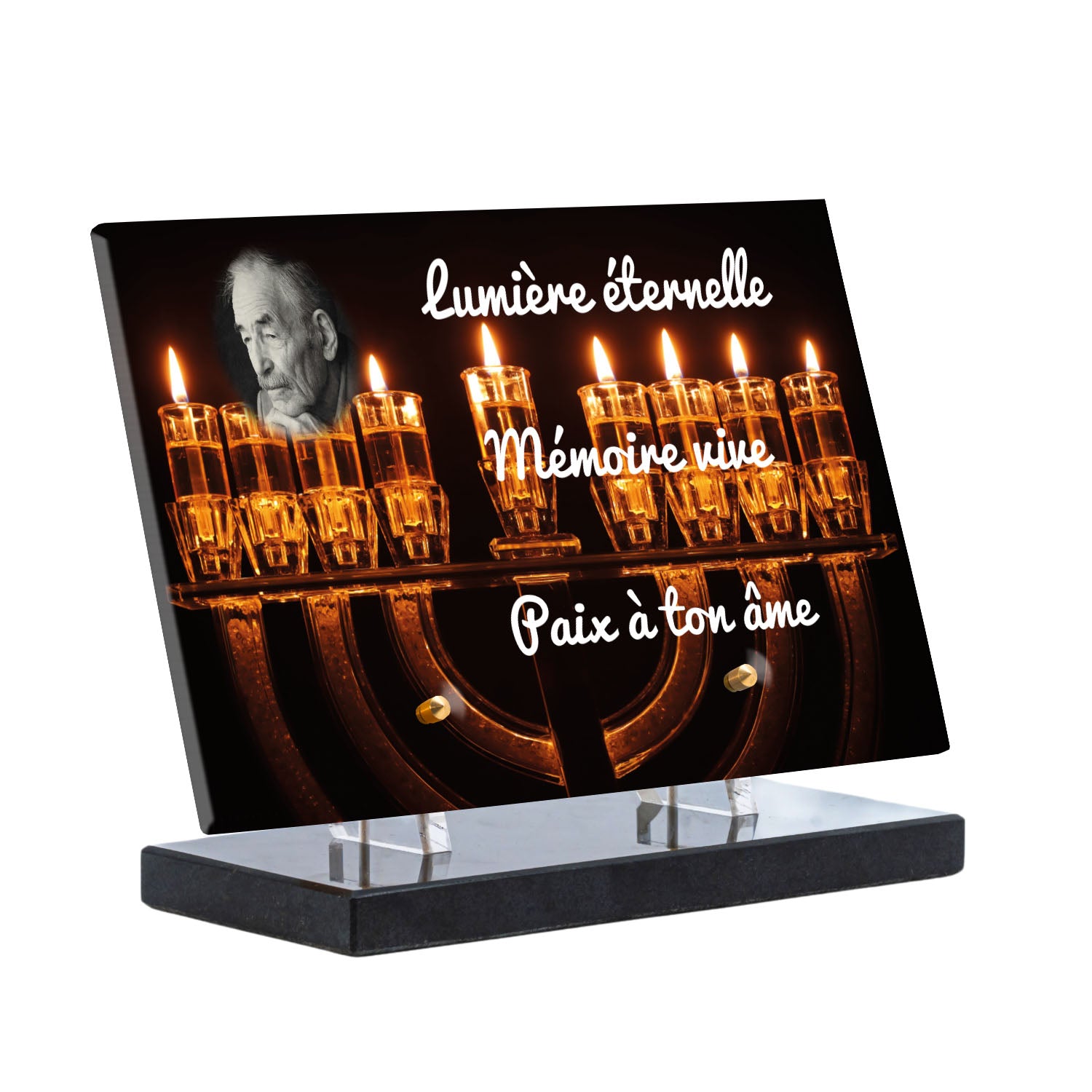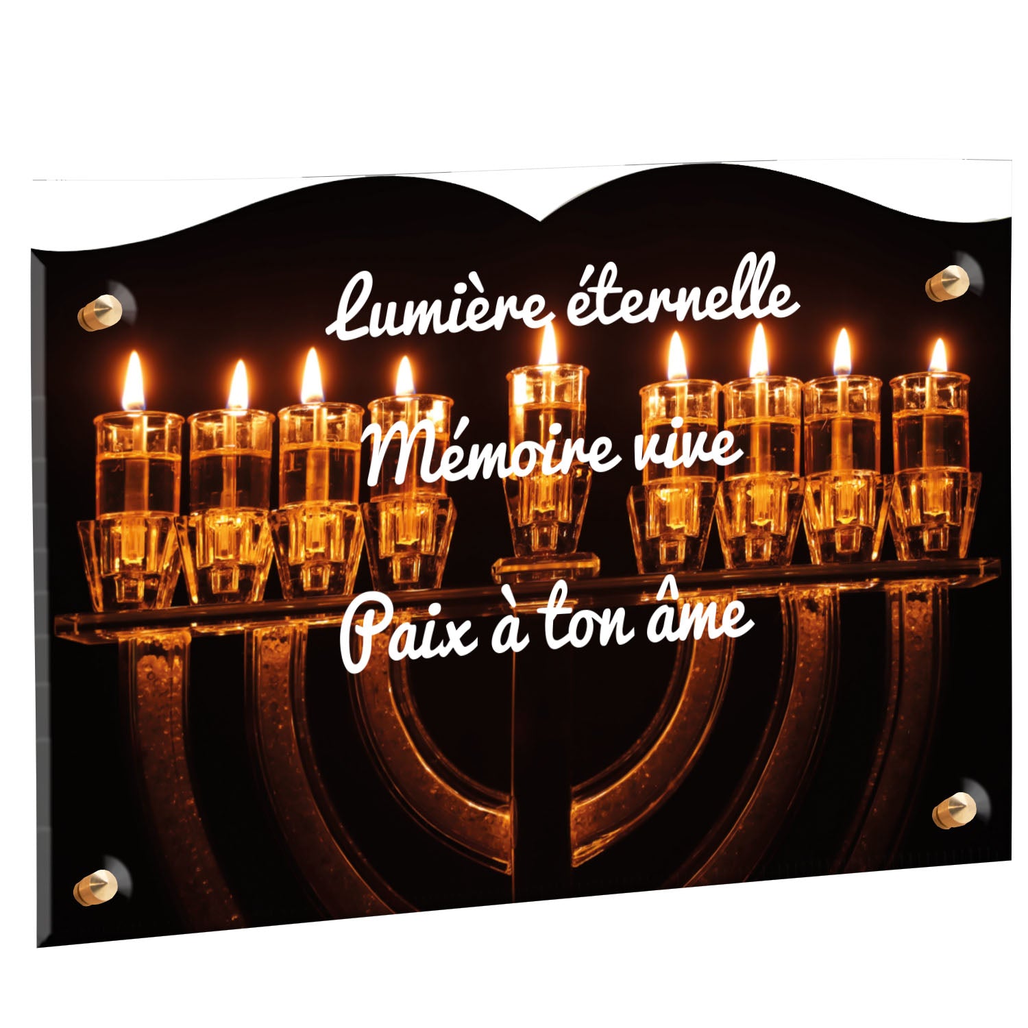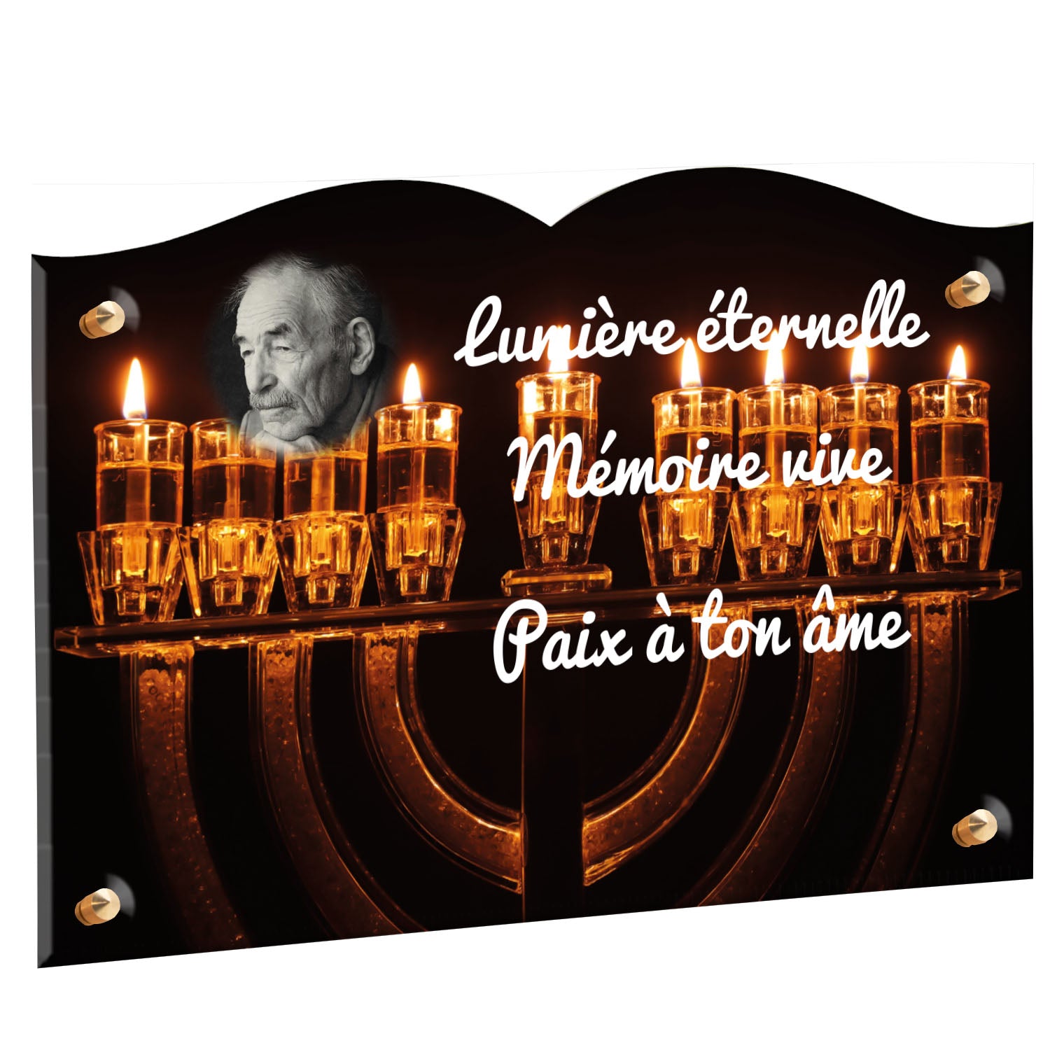 Exprimez un hommage respectueux avec cette plaque funéraire personnalisée représentant la Menorah, symbole de lumière et de mémoire. Réalisée en plexiglas, cette plaque funéraire moderne allie esthétique et solidité, offrant une plaque mortuaire qui respecte la tradition tout en bénéficiant d’un design contemporain.