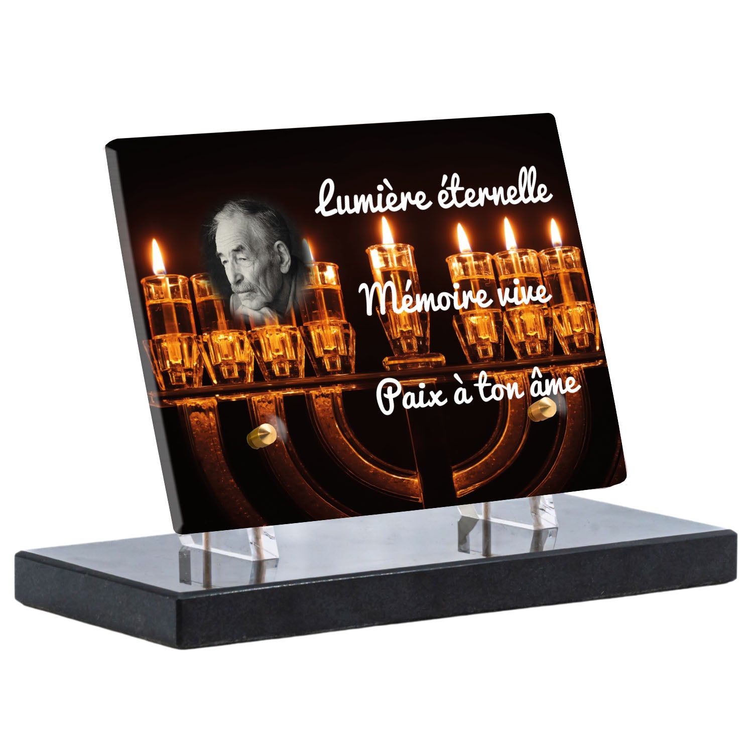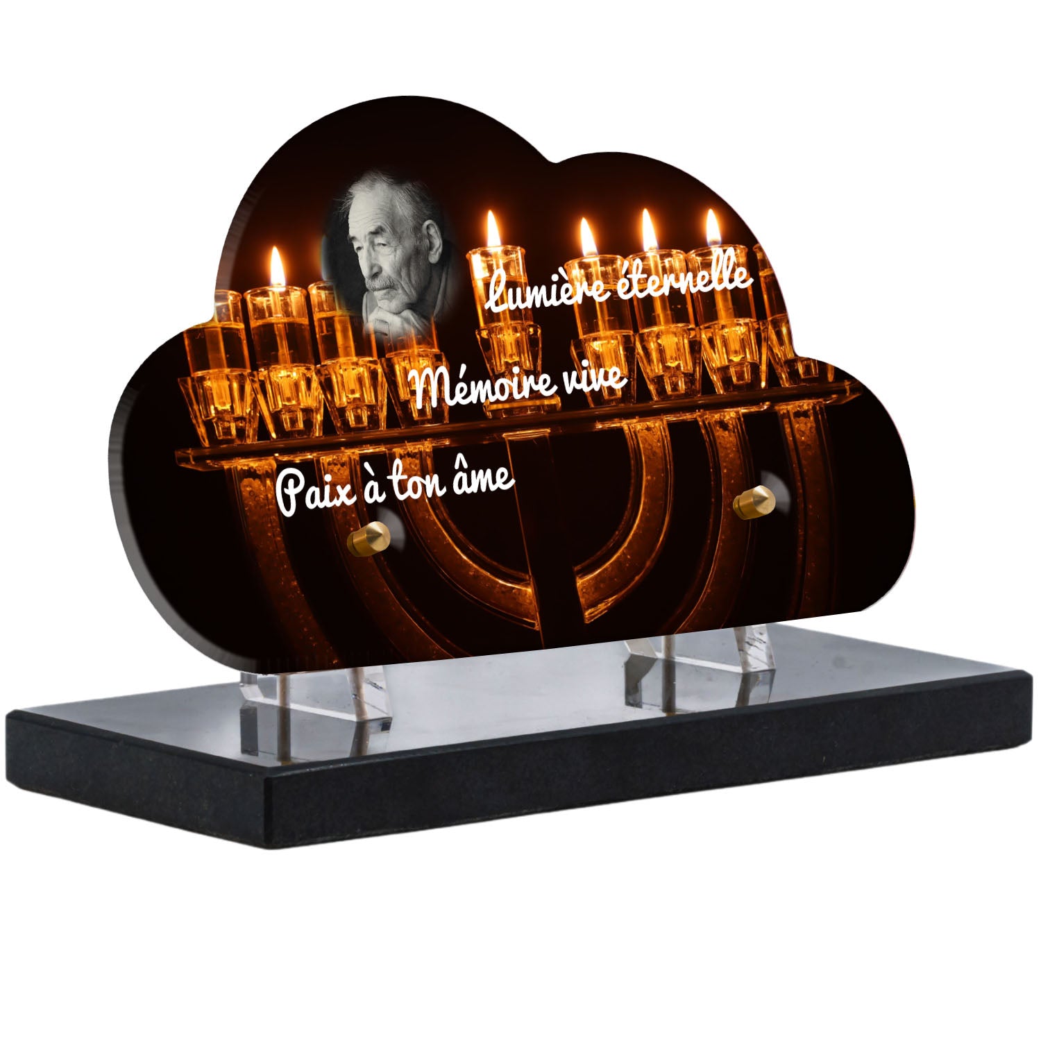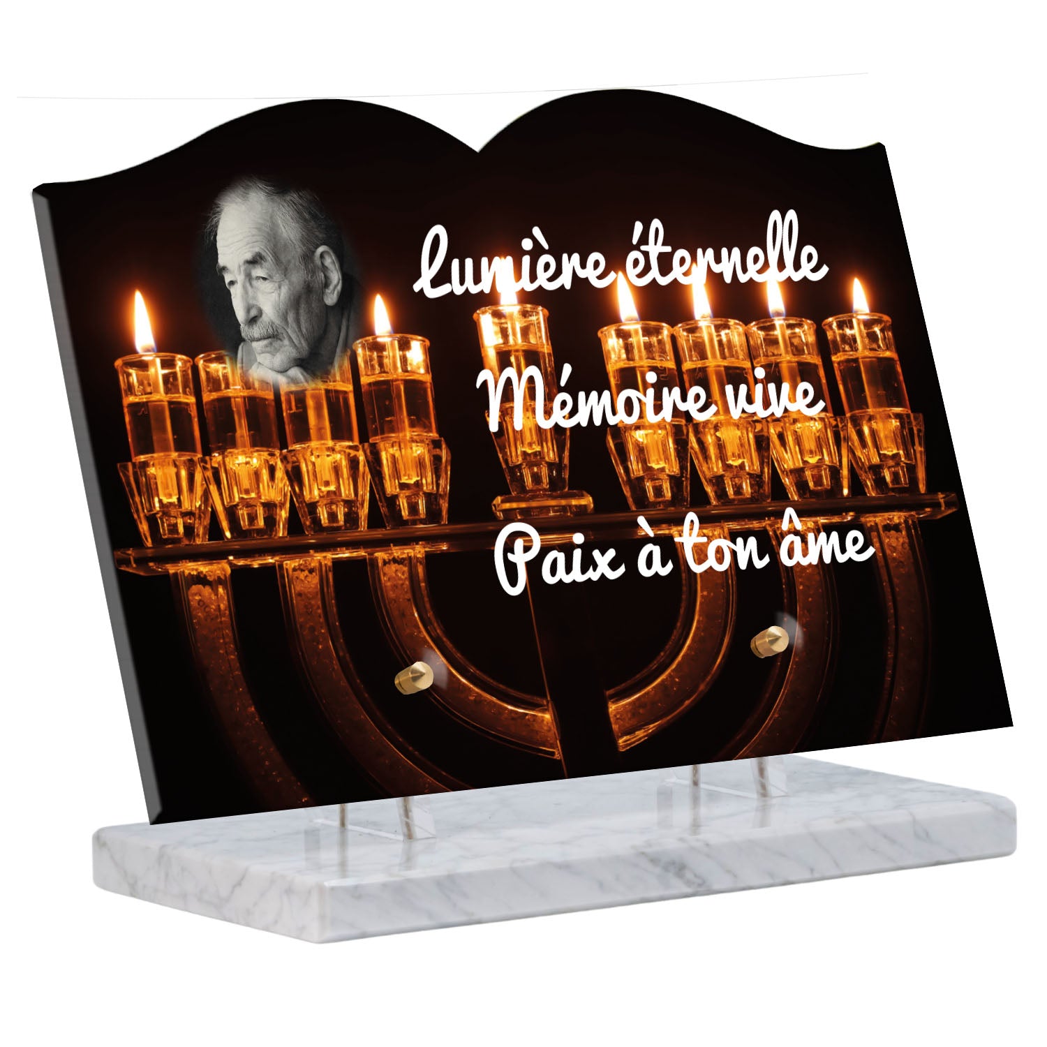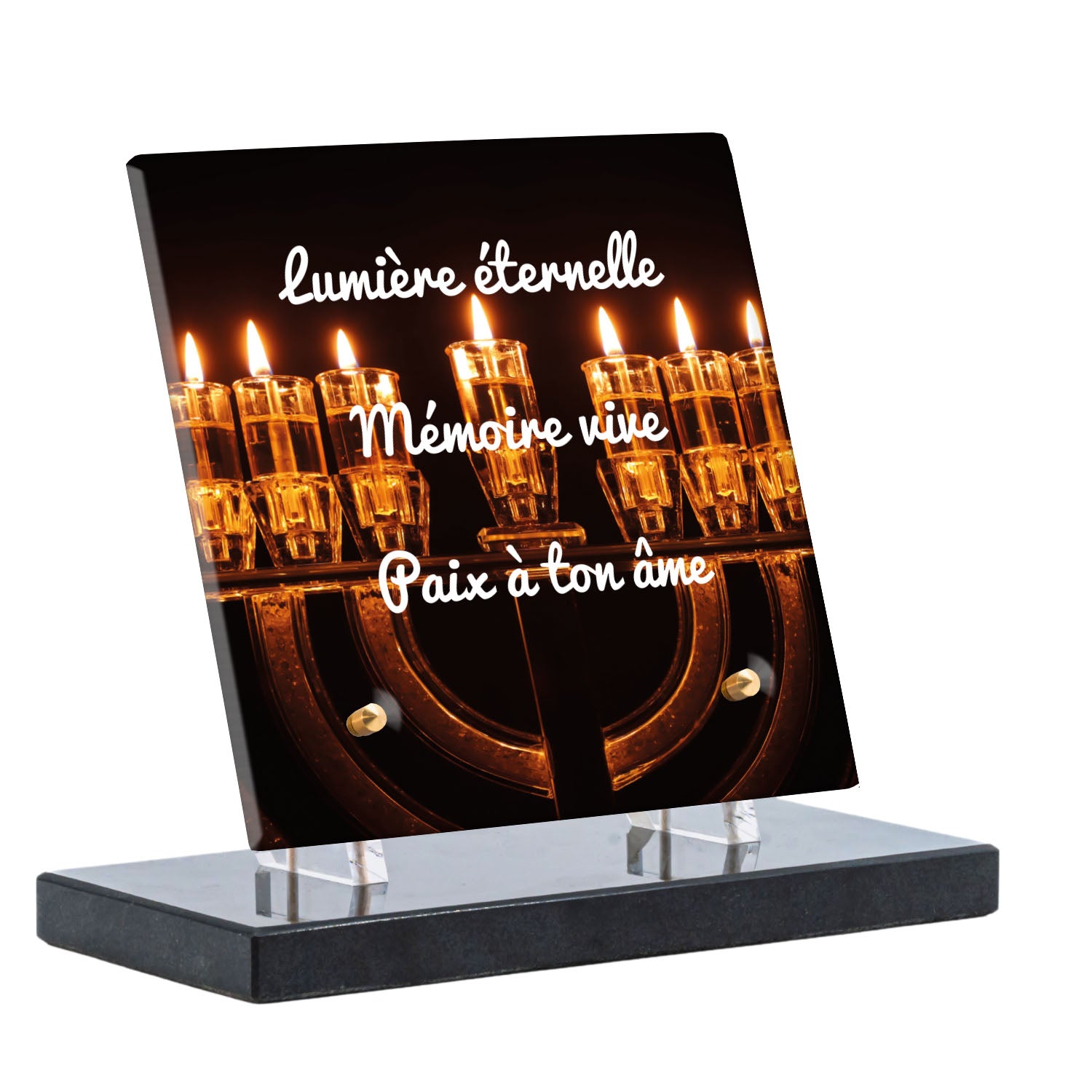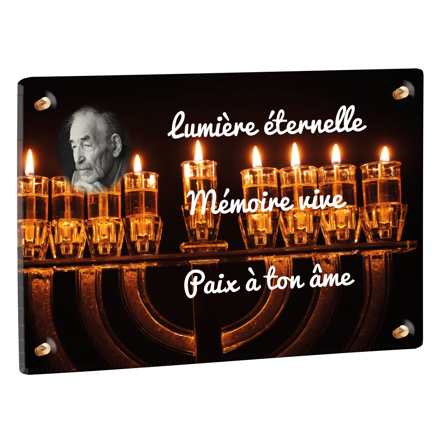 Exprimez un hommage respectueux avec cette plaque funéraire personnalisée représentant la Menorah, symbole de lumière et de mémoire. Réalisée en plexiglas, cette plaque funéraire moderne allie esthétique et solidité, offrant une plaque mortuaire qui respecte la tradition tout en bénéficiant d’un design contemporain.
