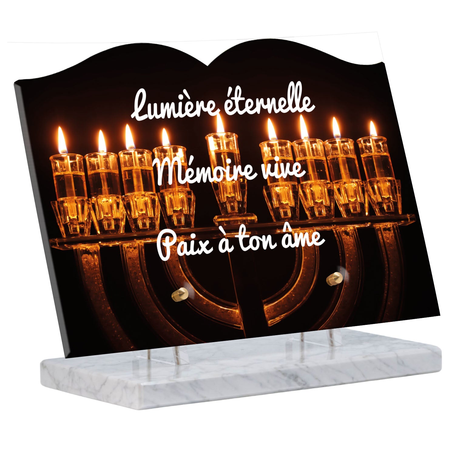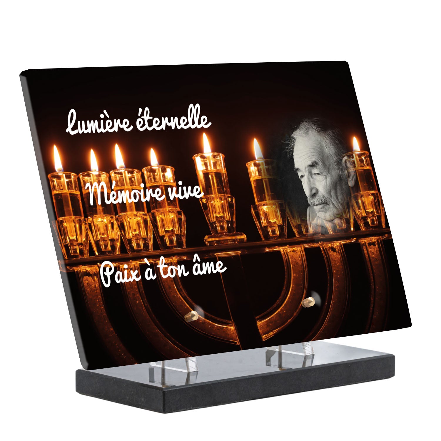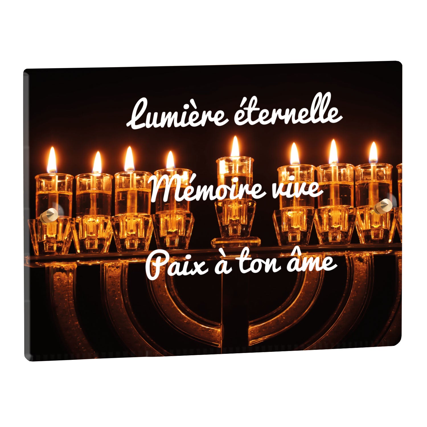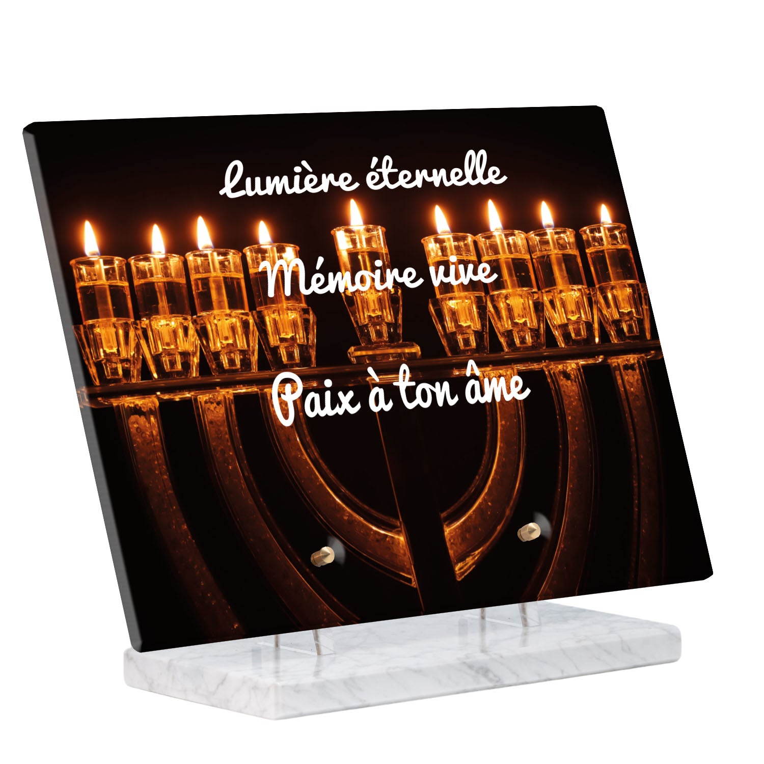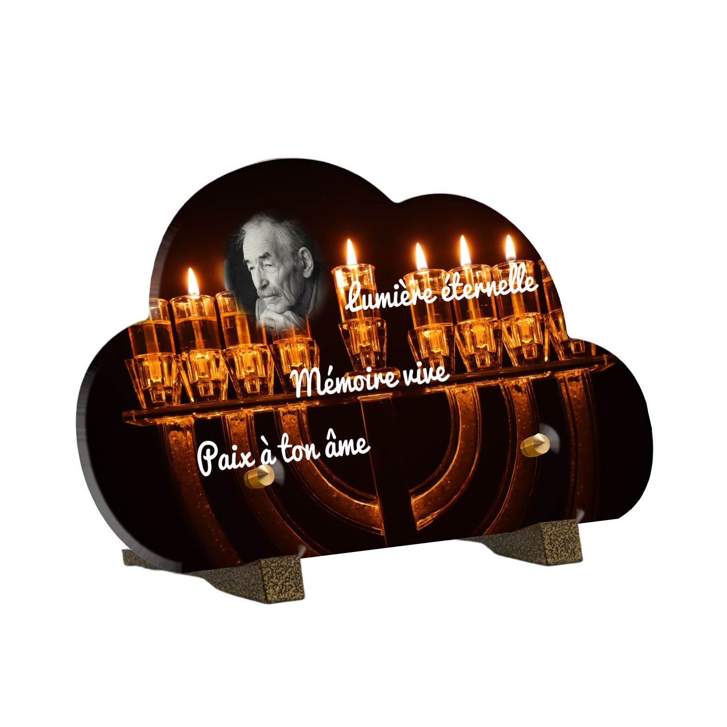 Exprimez un hommage respectueux avec cette plaque funéraire personnalisée représentant la Menorah, symbole de lumière et de mémoire. Réalisée en plexiglas, cette plaque funéraire moderne allie esthétique et solidité, offrant une plaque mortuaire qui respecte la tradition tout en bénéficiant d’un design contemporain.