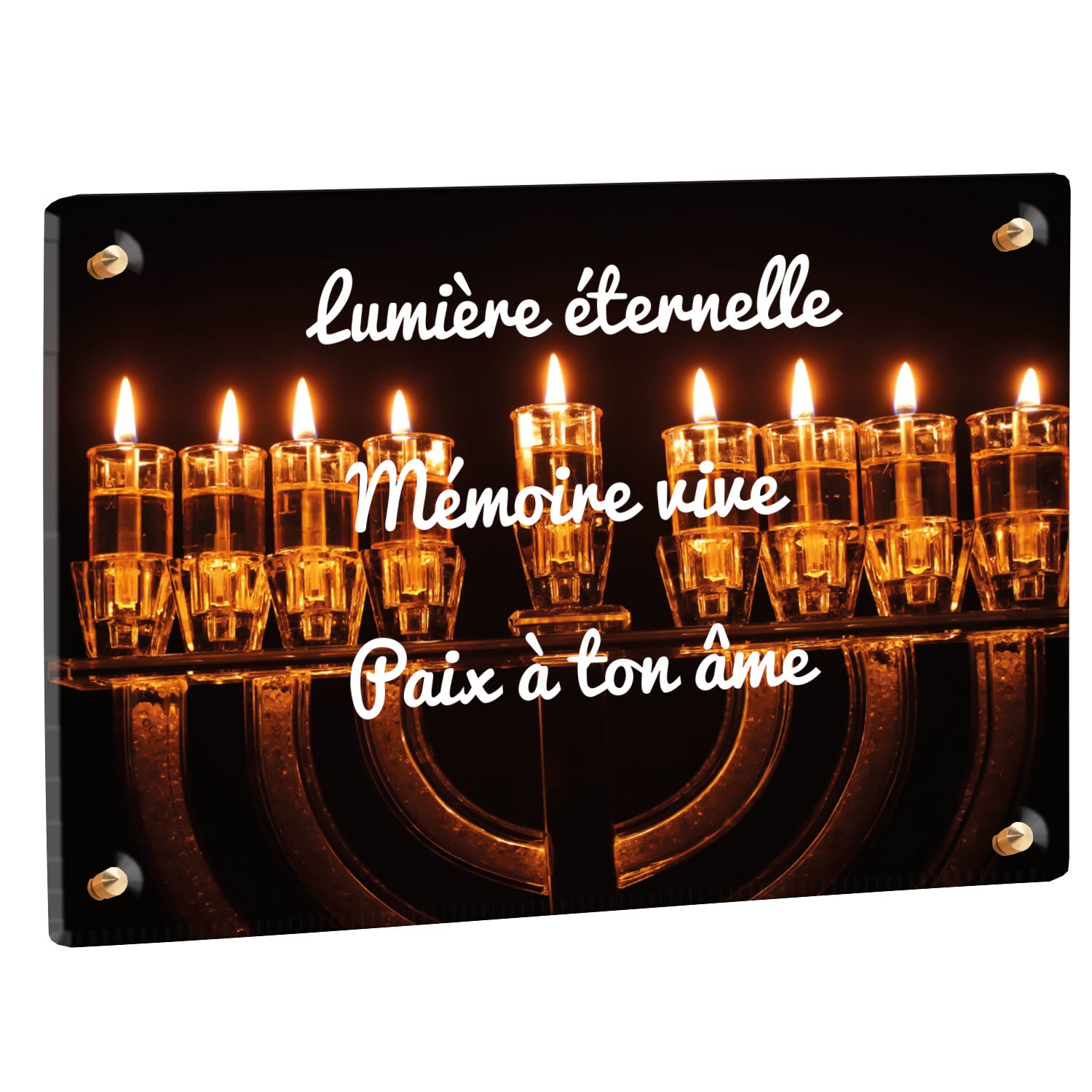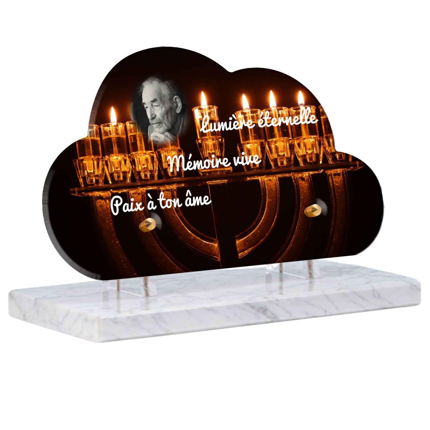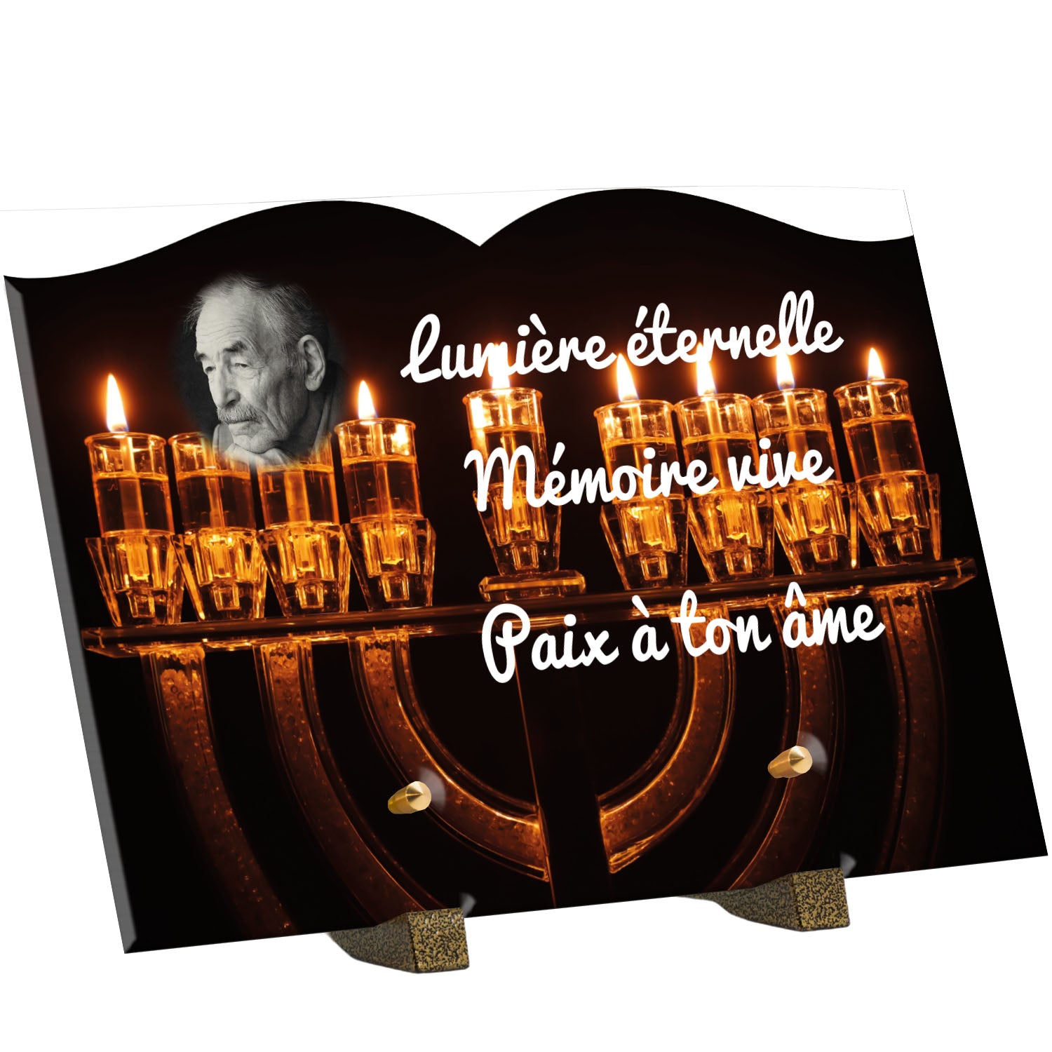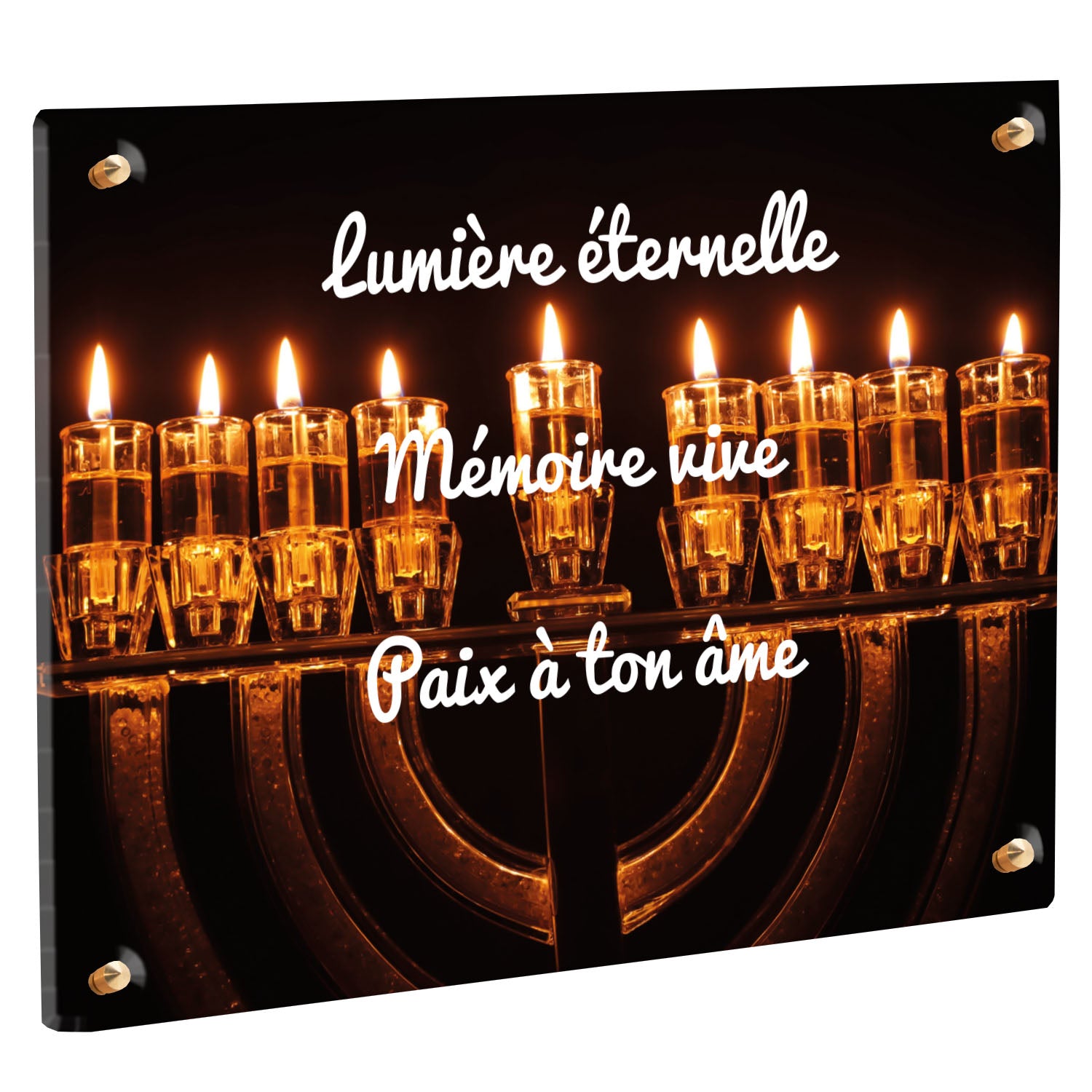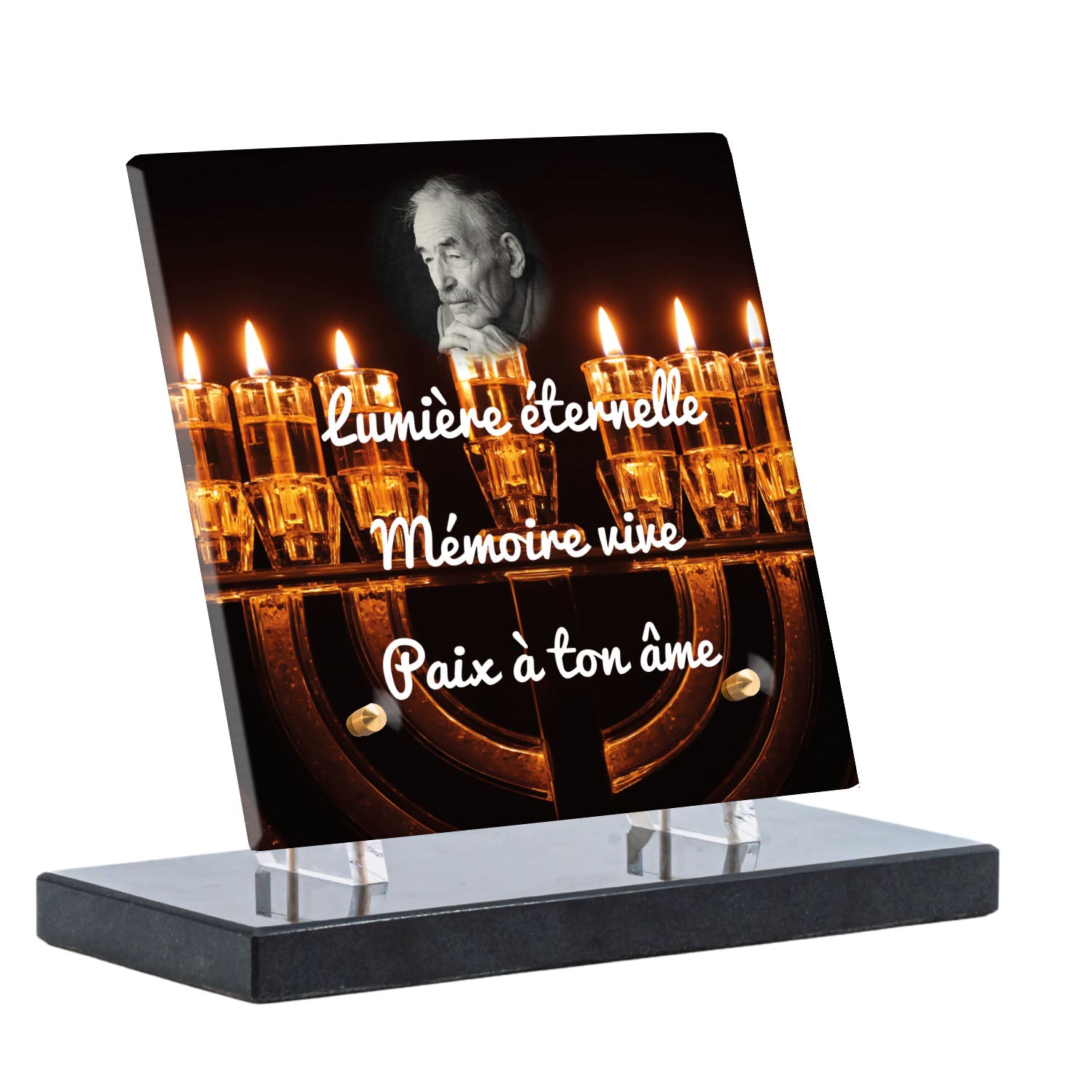 Exprimez un hommage respectueux avec cette plaque funéraire personnalisée représentant la Menorah, symbole de lumière et de mémoire. Réalisée en plexiglas, cette plaque funéraire moderne allie esthétique et solidité, offrant une plaque mortuaire qui respecte la tradition tout en bénéficiant d’un design contemporain.
