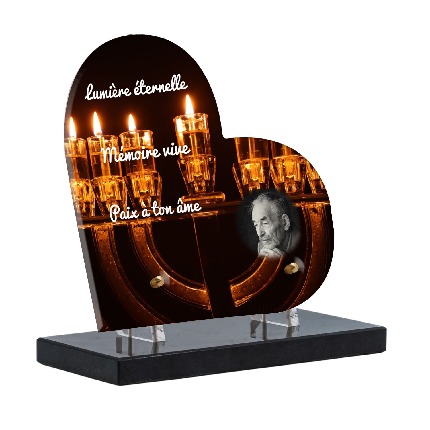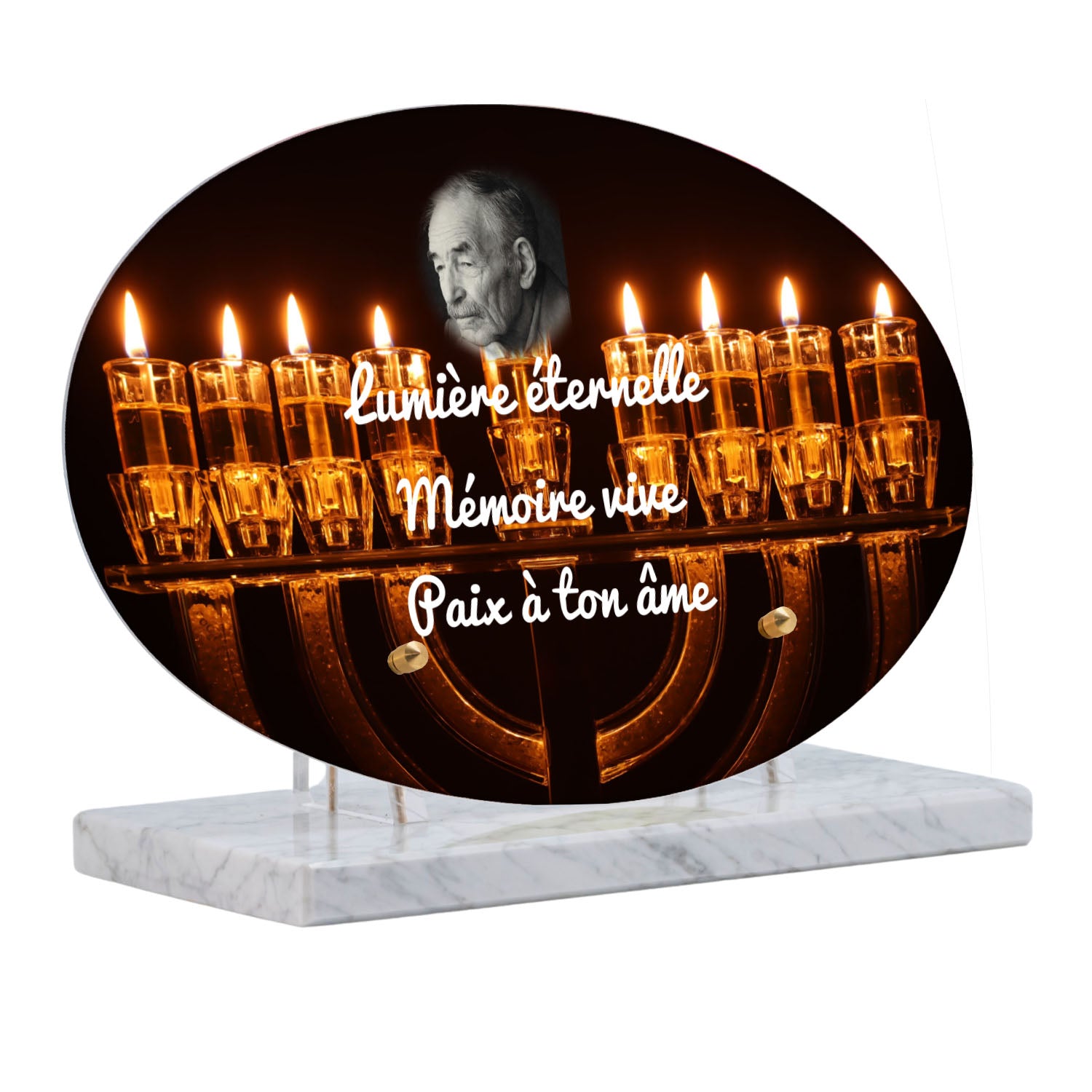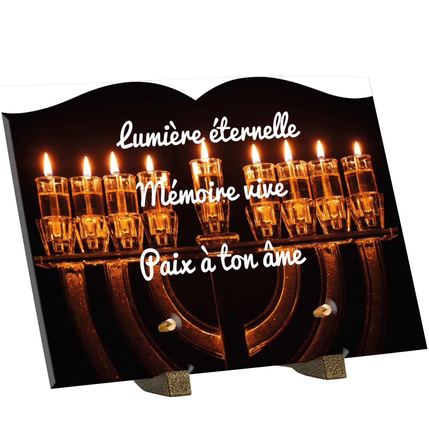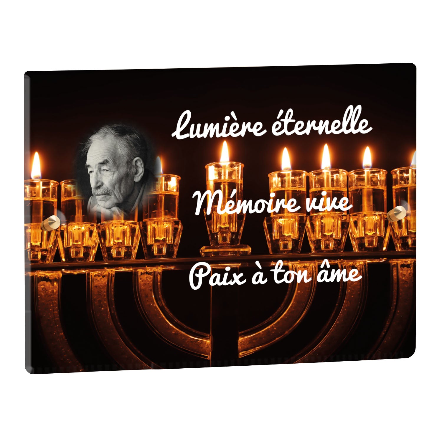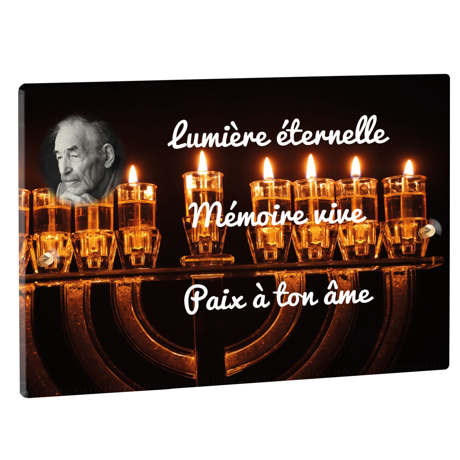 Exprimez un hommage respectueux avec cette plaque funéraire personnalisée représentant la Menorah, symbole de lumière et de mémoire. Réalisée en plexiglas, cette plaque funéraire moderne allie esthétique et solidité, offrant une plaque mortuaire qui respecte la tradition tout en bénéficiant d’un design contemporain.