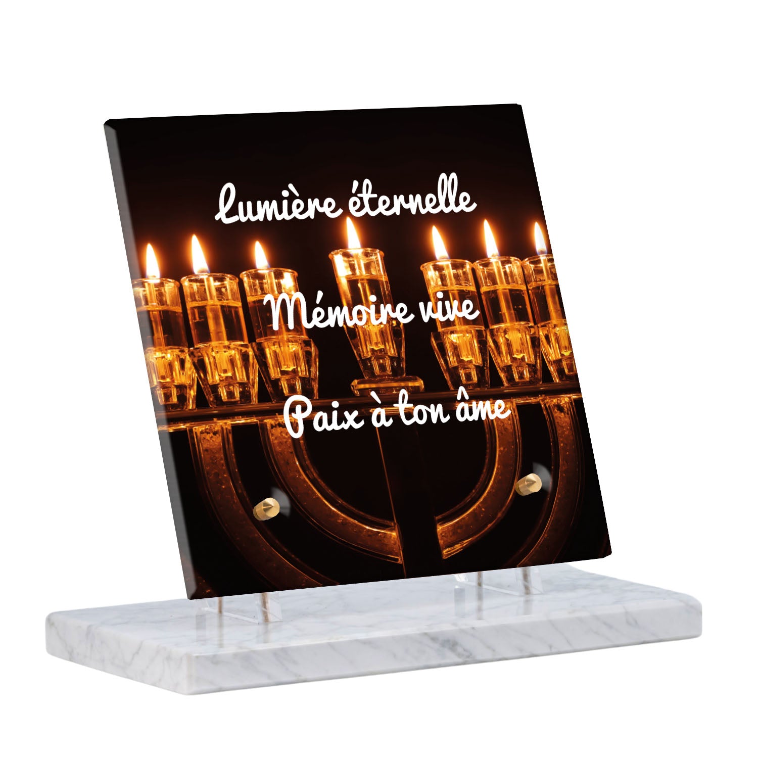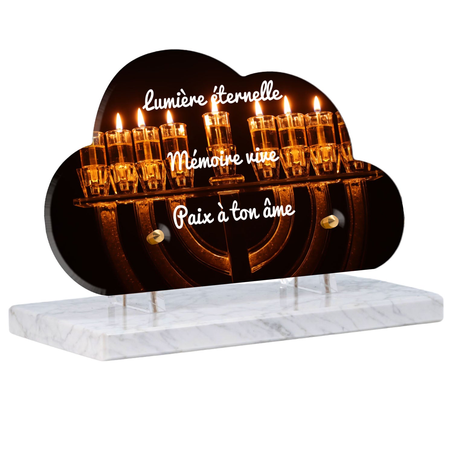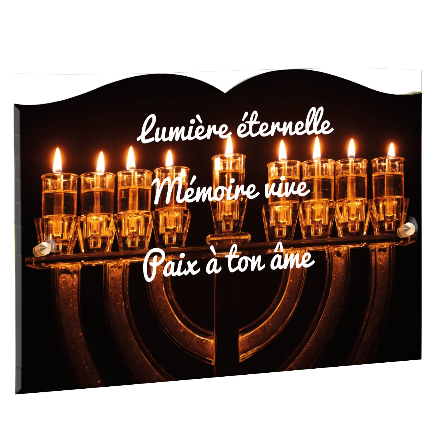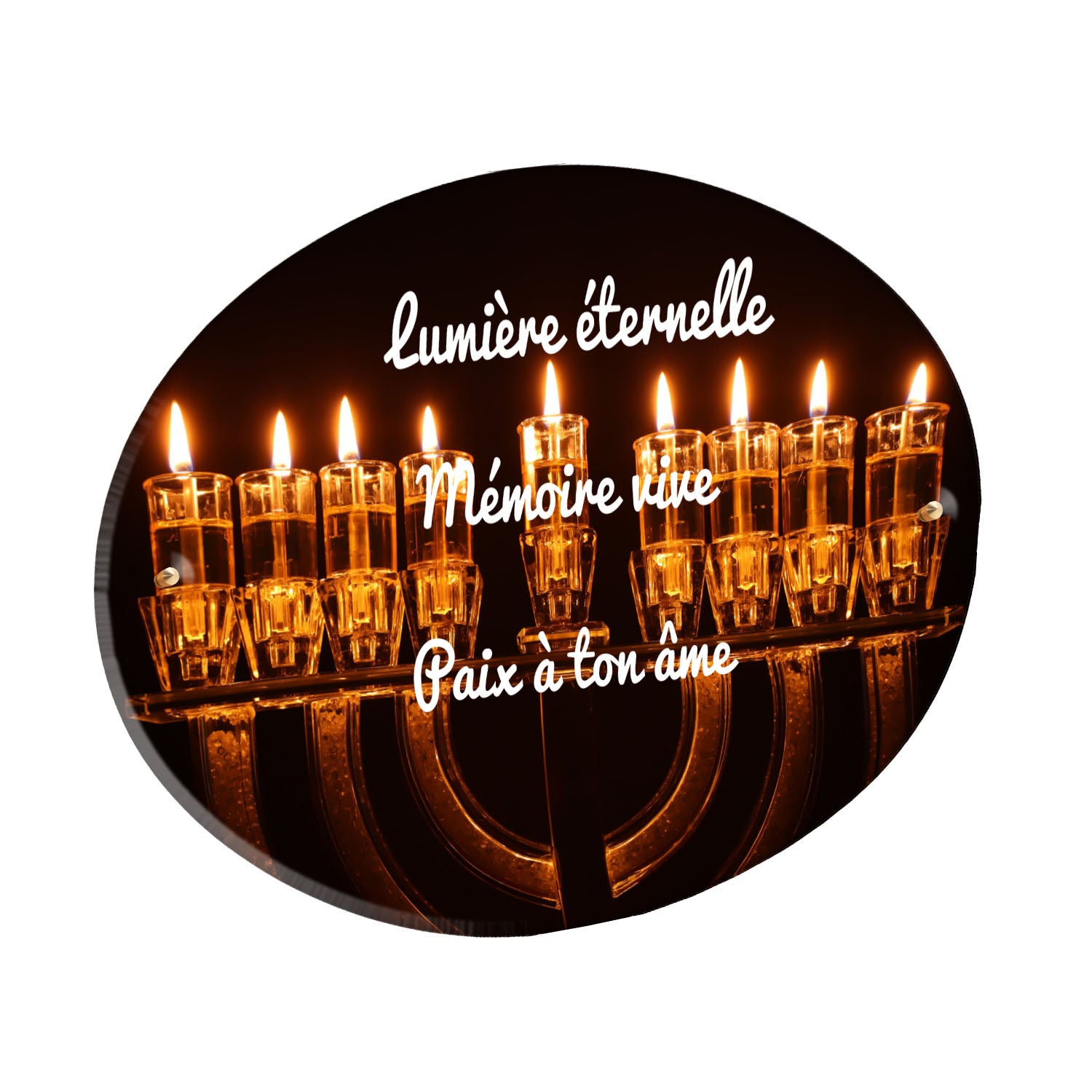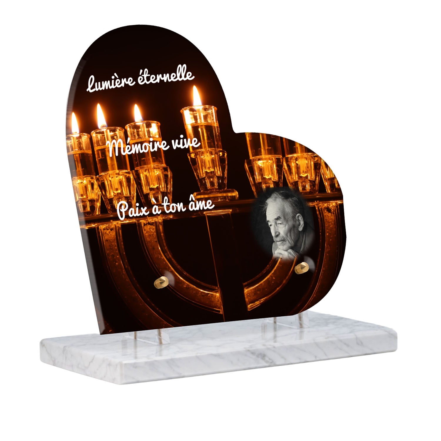 Exprimez un hommage respectueux avec cette plaque funéraire personnalisée représentant la Menorah, symbole de lumière et de mémoire. Réalisée en plexiglas, cette plaque funéraire moderne allie esthétique et solidité, offrant une plaque mortuaire qui respecte la tradition tout en bénéficiant d’un design contemporain.