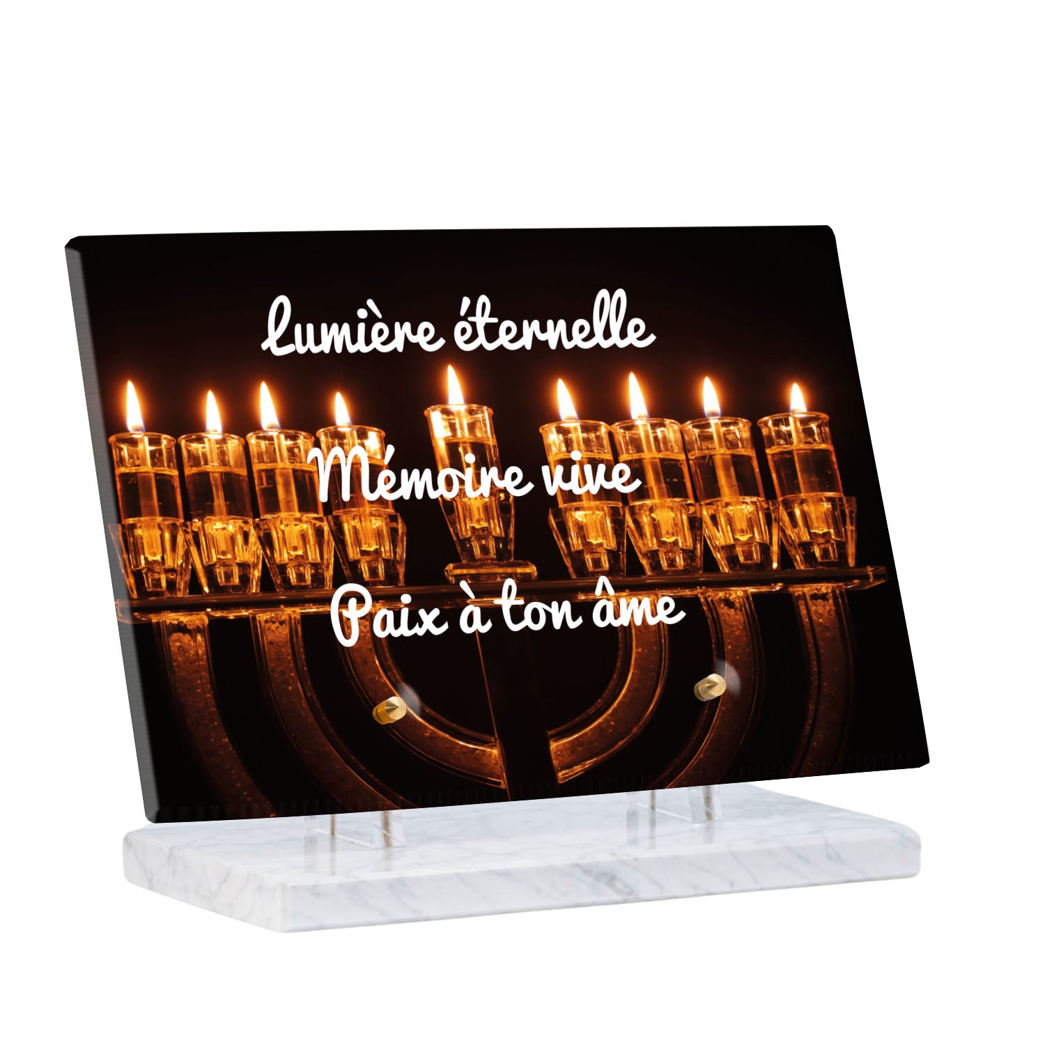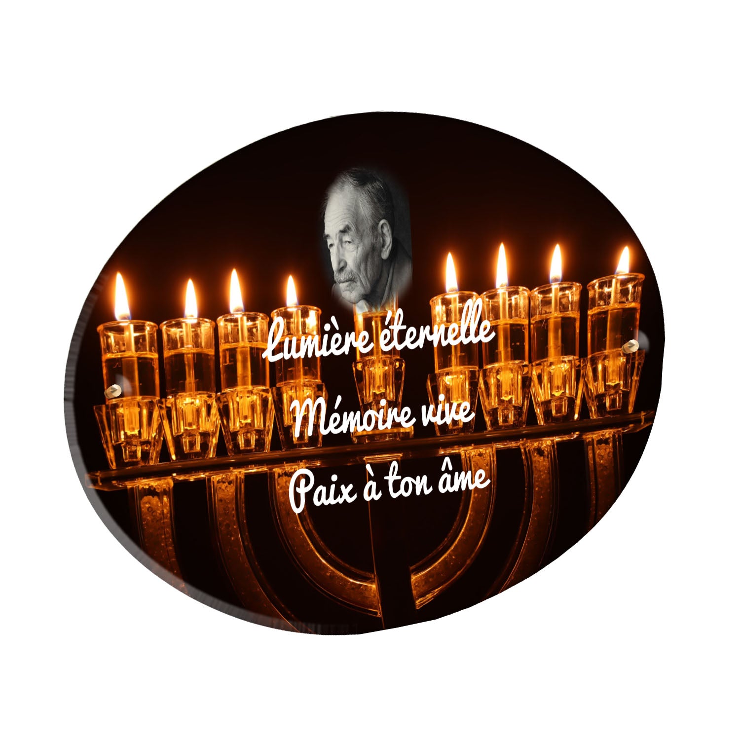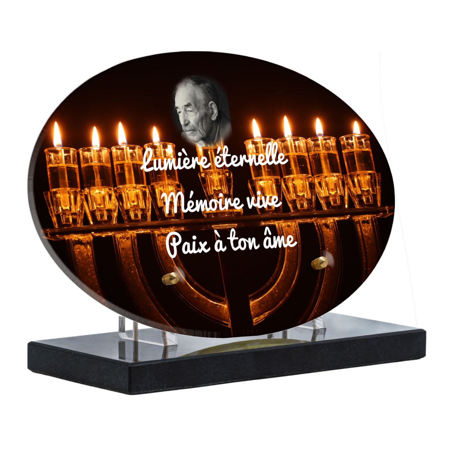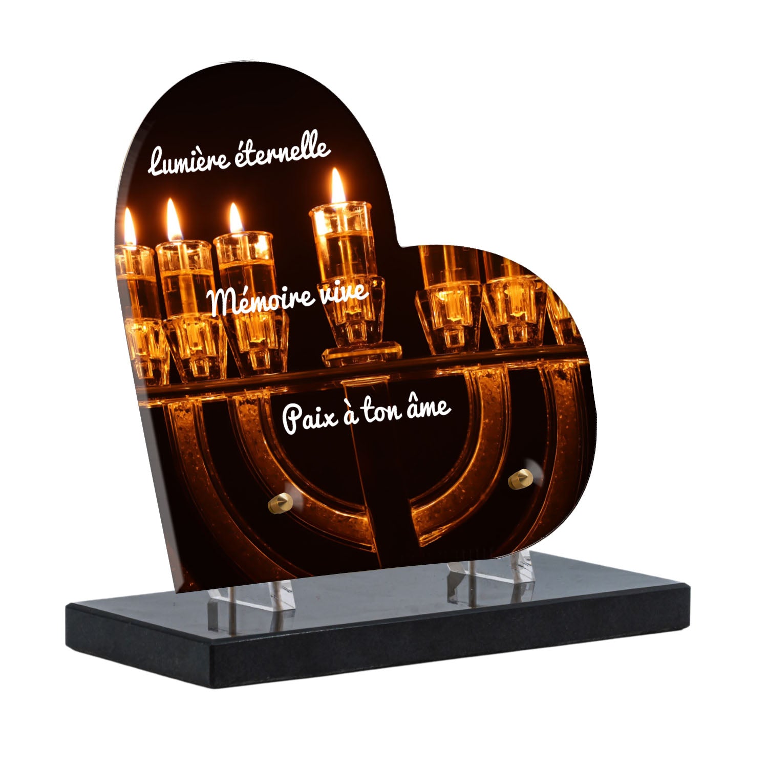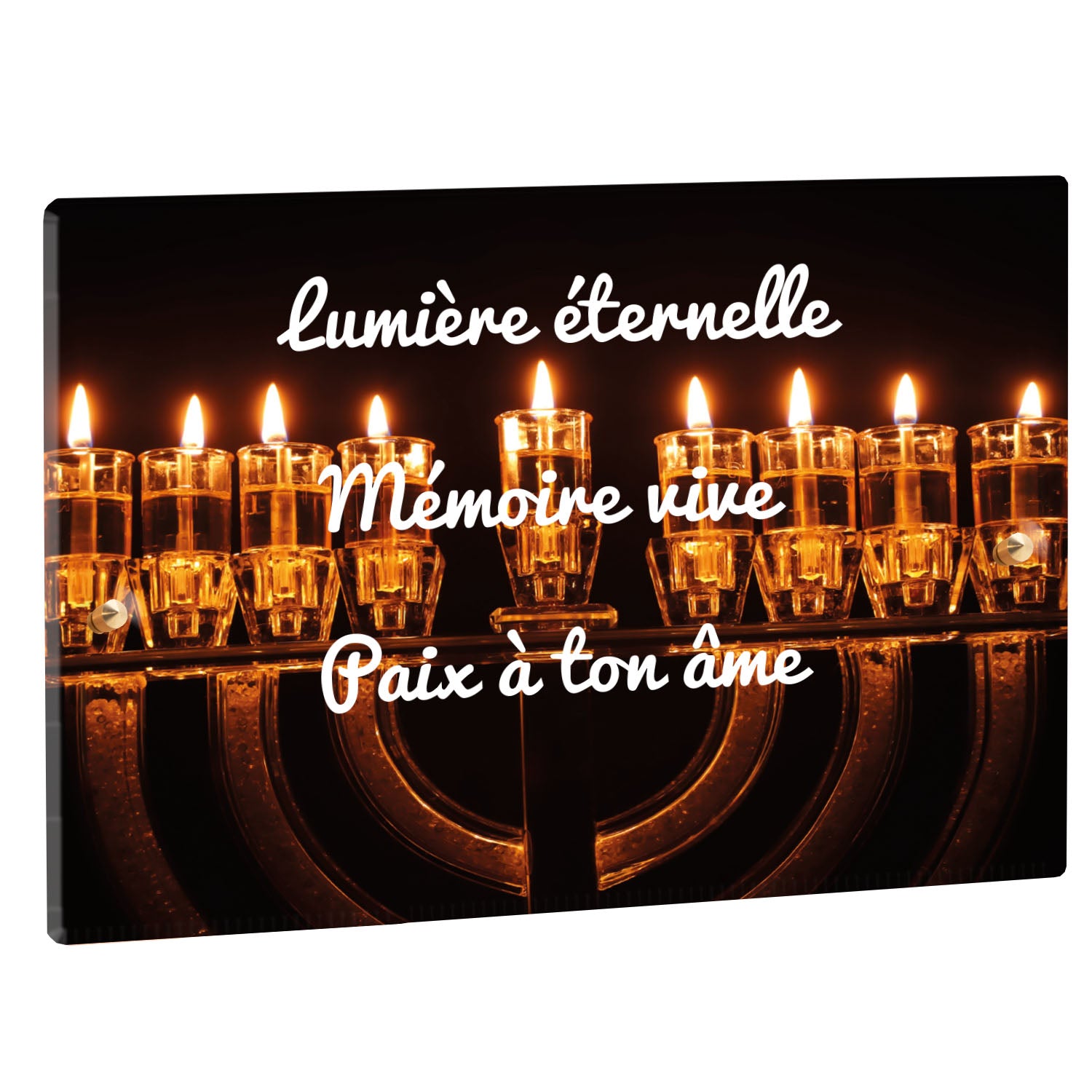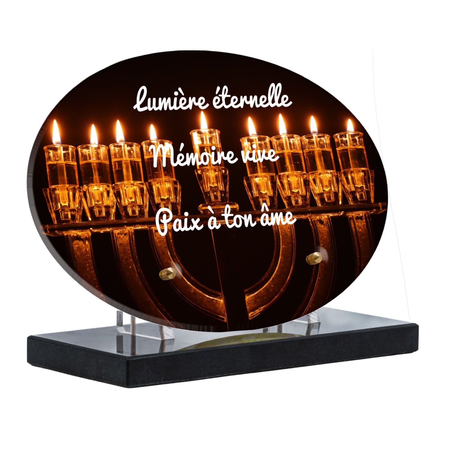 Exprimez un hommage respectueux avec cette plaque funéraire personnalisée représentant la Menorah, symbole de lumière et de mémoire. Réalisée en plexiglas, cette plaque funéraire moderne allie esthétique et solidité, offrant une plaque mortuaire qui respecte la tradition tout en bénéficiant d’un design contemporain.
