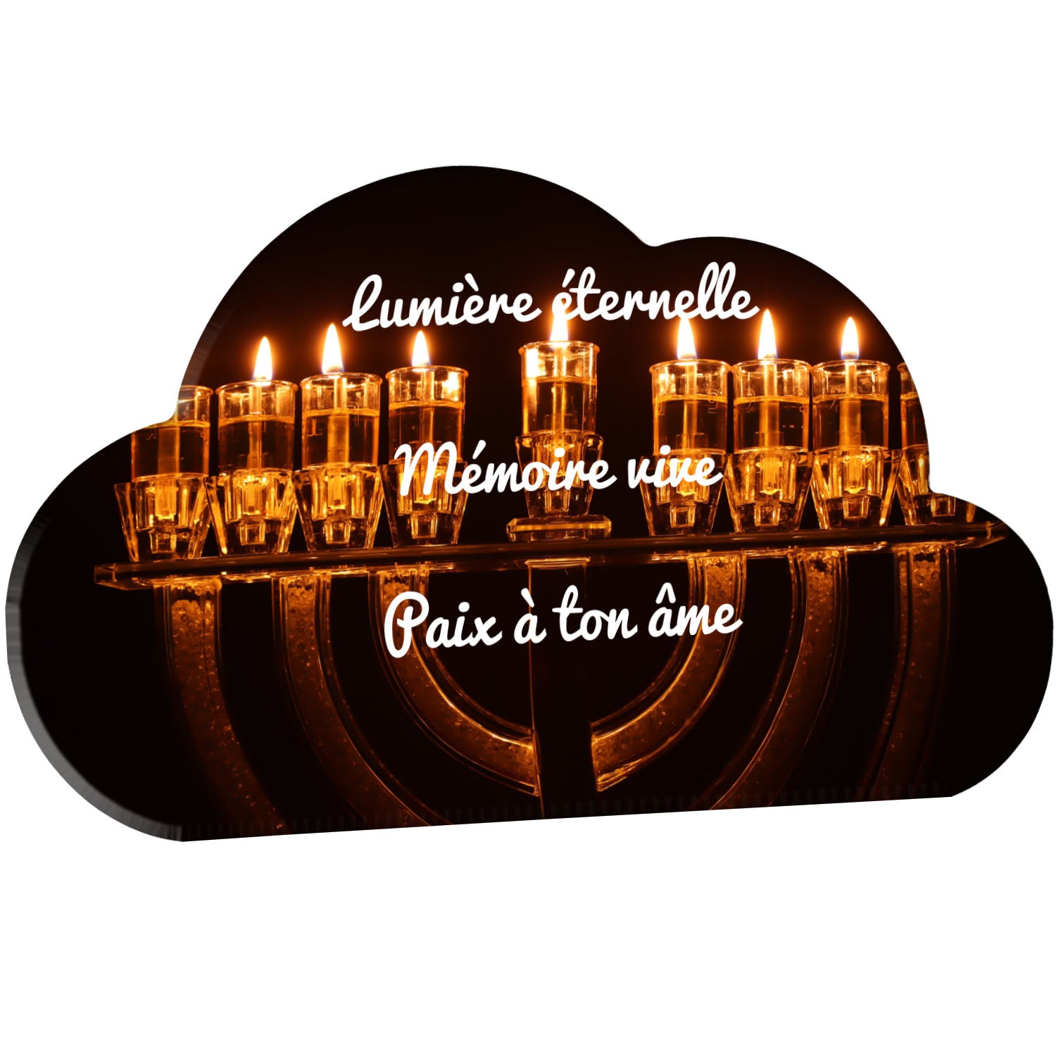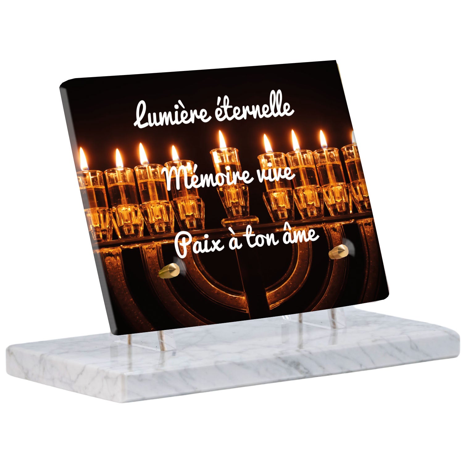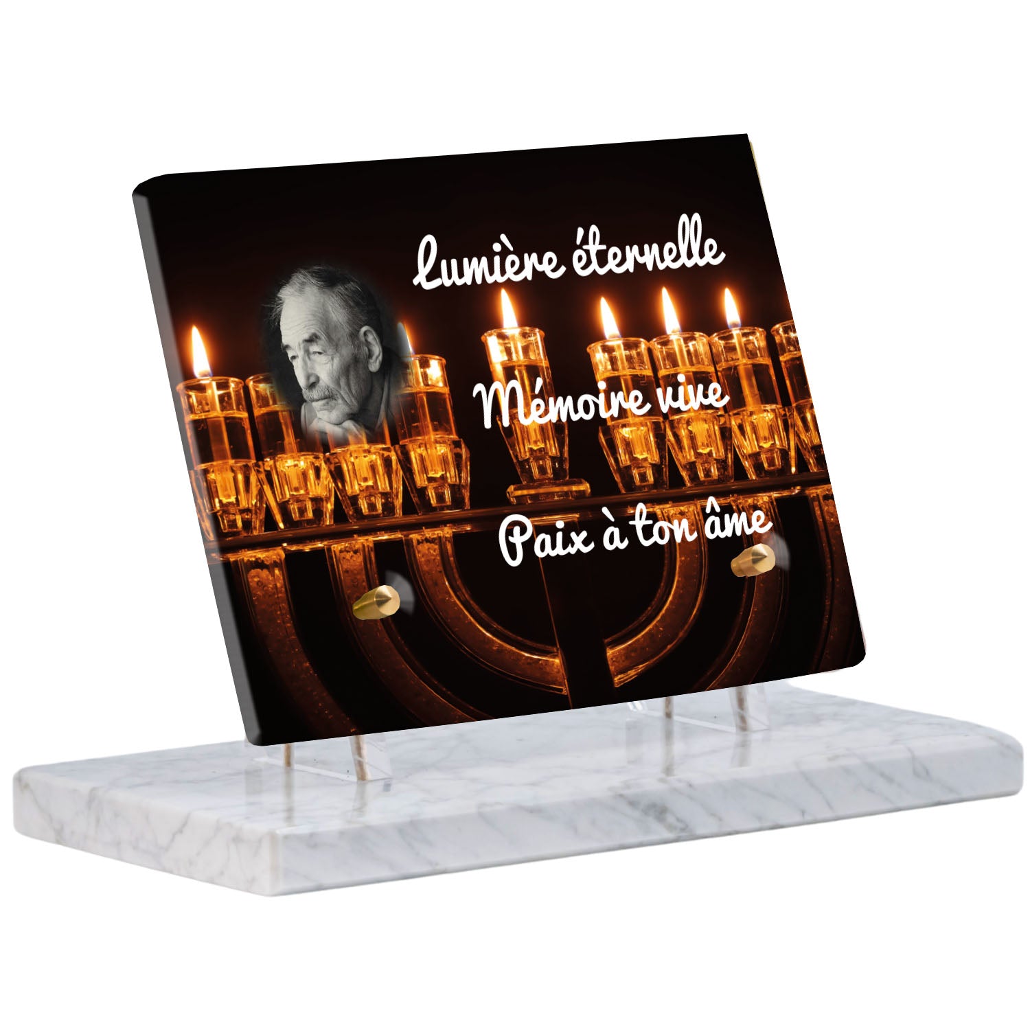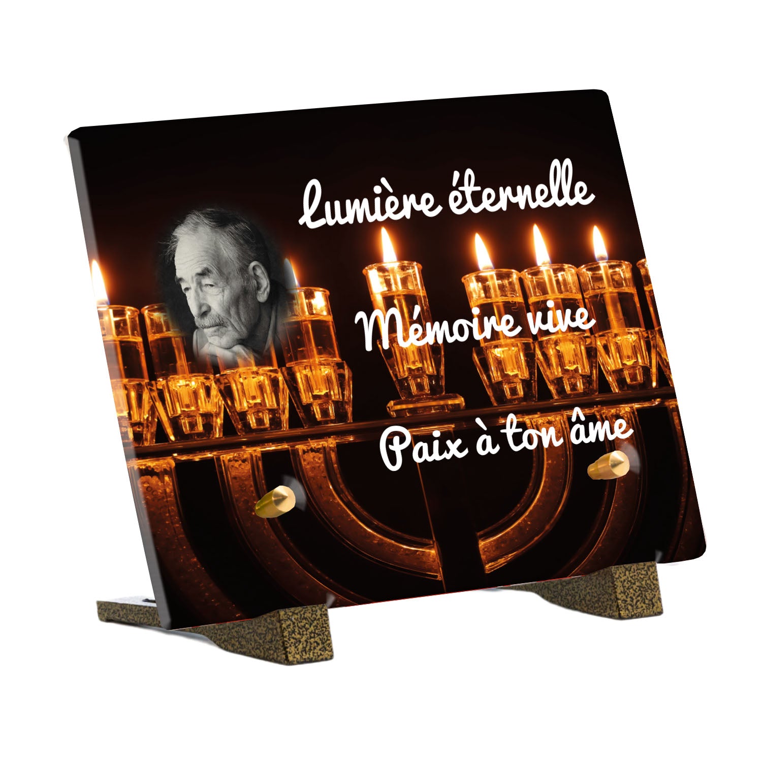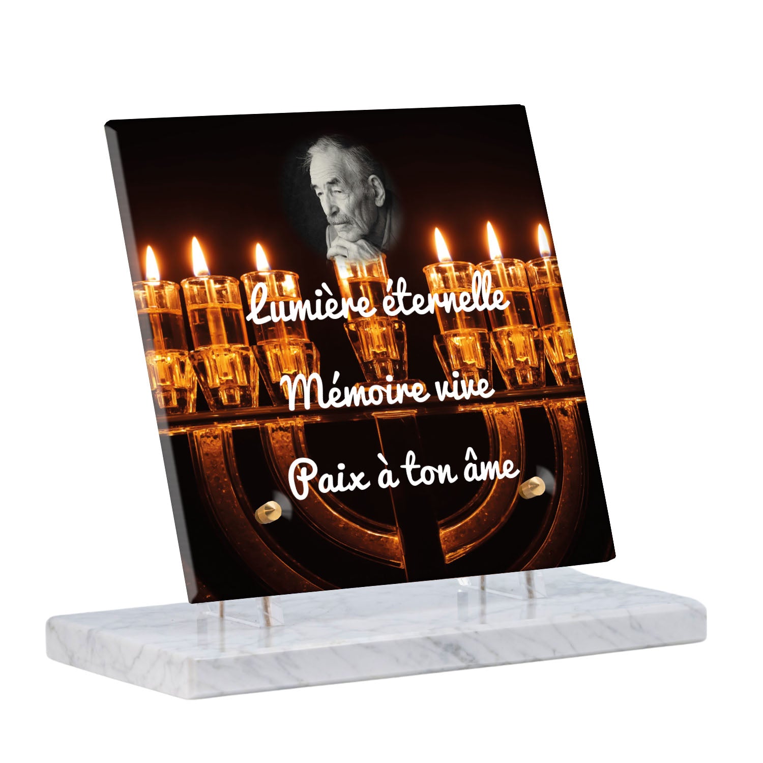 Exprimez un hommage respectueux avec cette plaque funéraire personnalisée représentant la Menorah, symbole de lumière et de mémoire. Réalisée en plexiglas, cette plaque funéraire moderne allie esthétique et solidité, offrant une plaque mortuaire qui respecte la tradition tout en bénéficiant d’un design contemporain.
