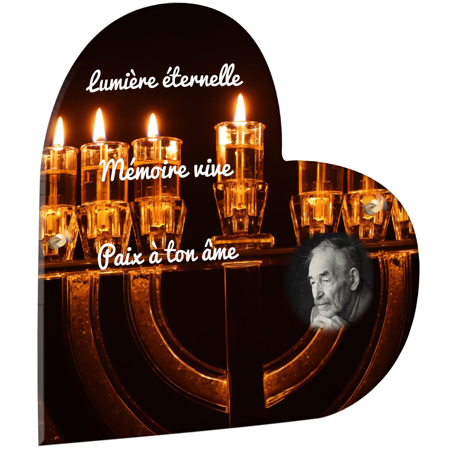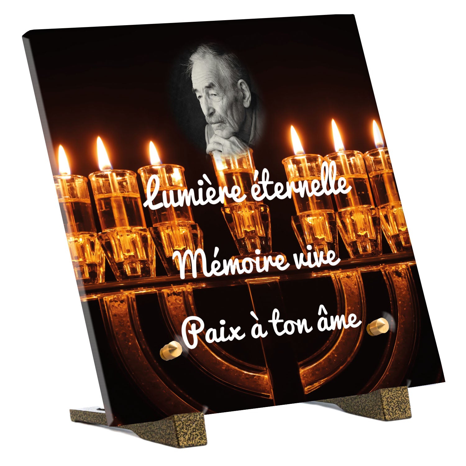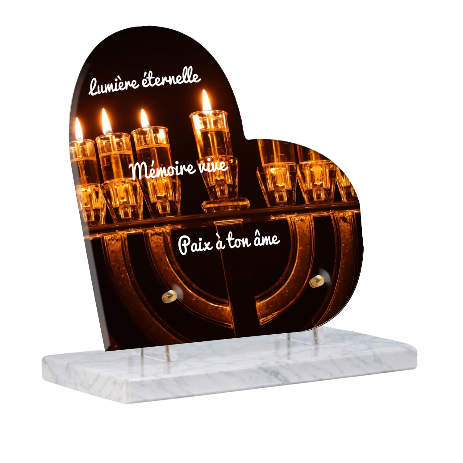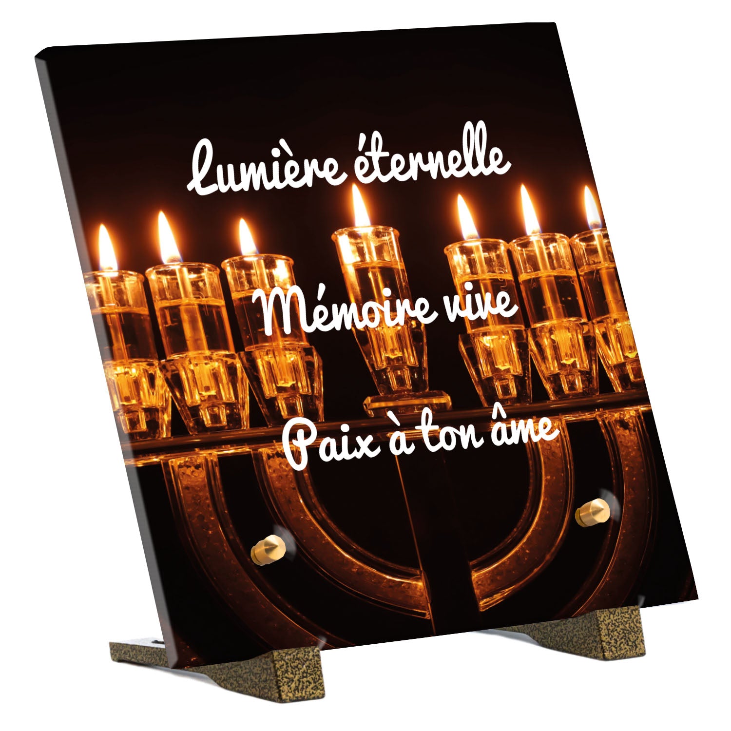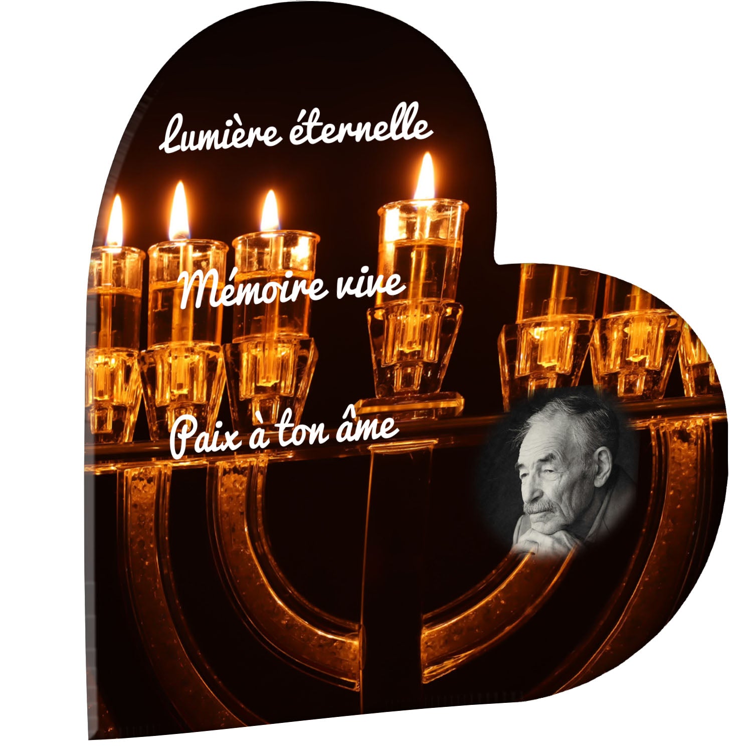 Exprimez un hommage respectueux avec cette plaque funéraire personnalisée représentant la Menorah, symbole de lumière et de mémoire. Réalisée en plexiglas, cette plaque funéraire moderne allie esthétique et solidité, offrant une plaque mortuaire qui respecte la tradition tout en bénéficiant d’un design contemporain.