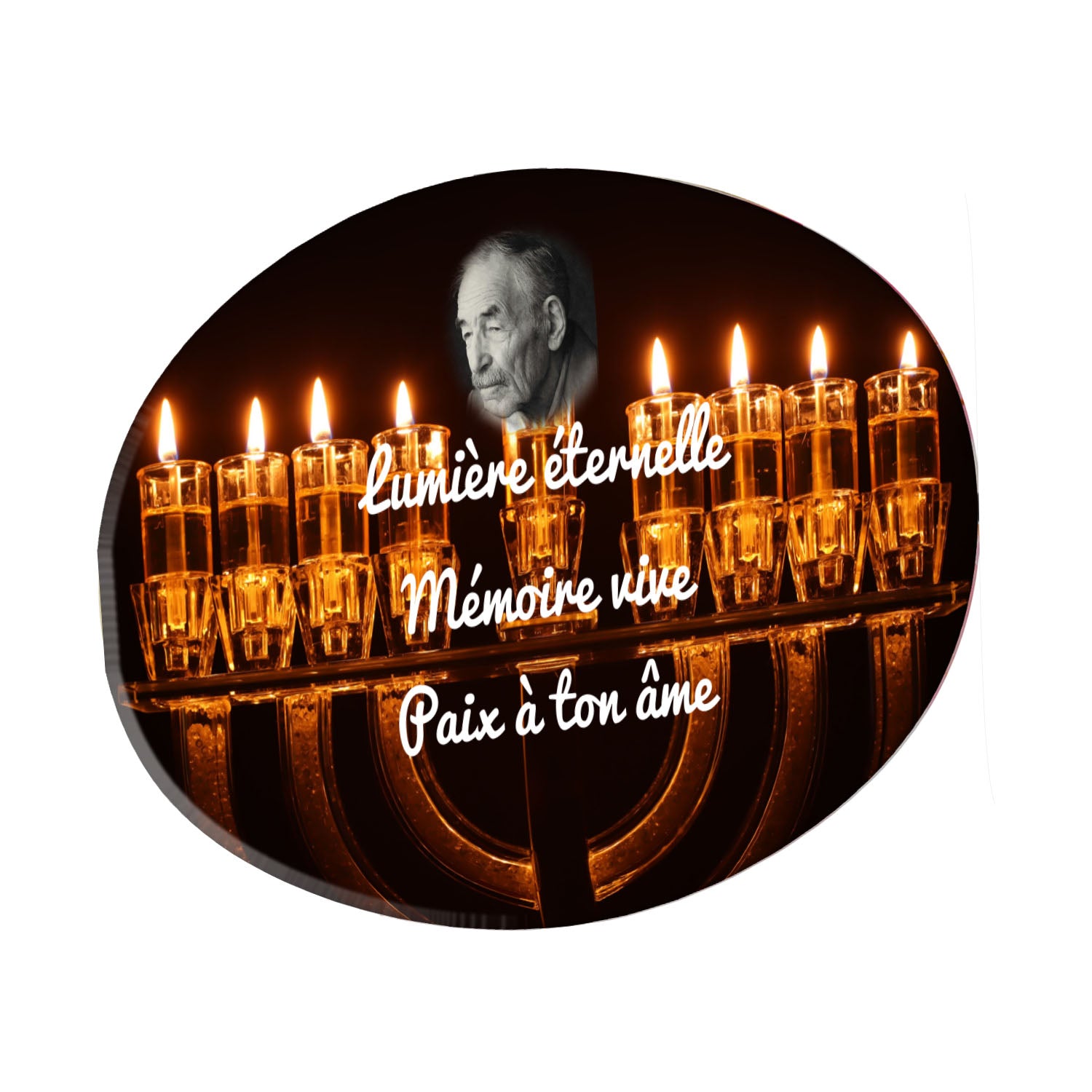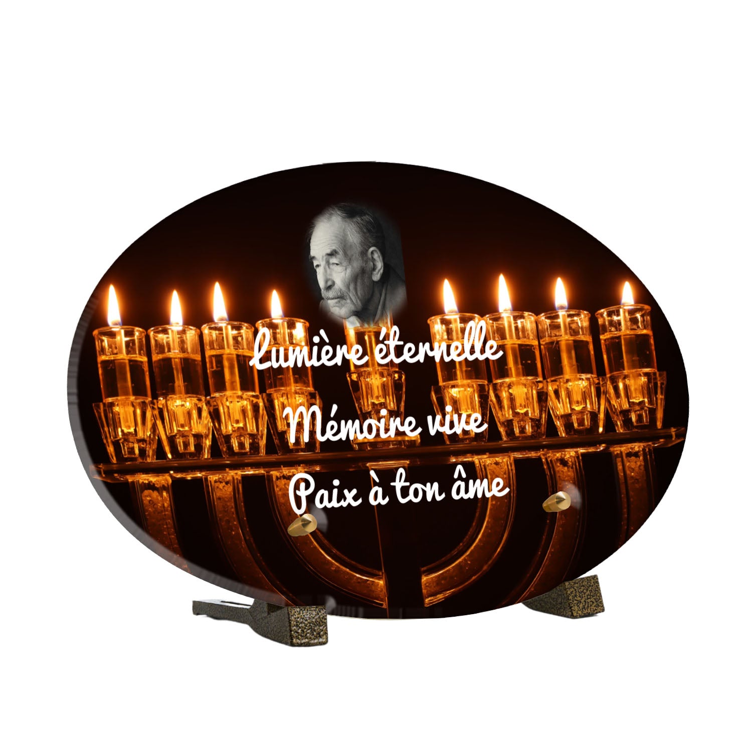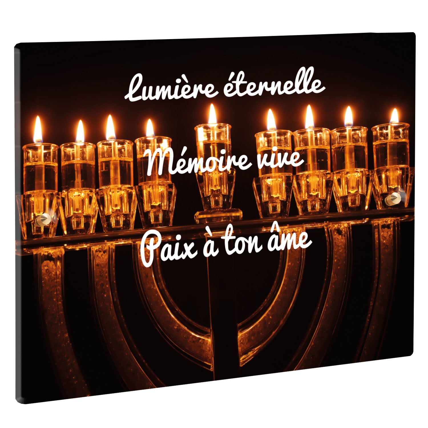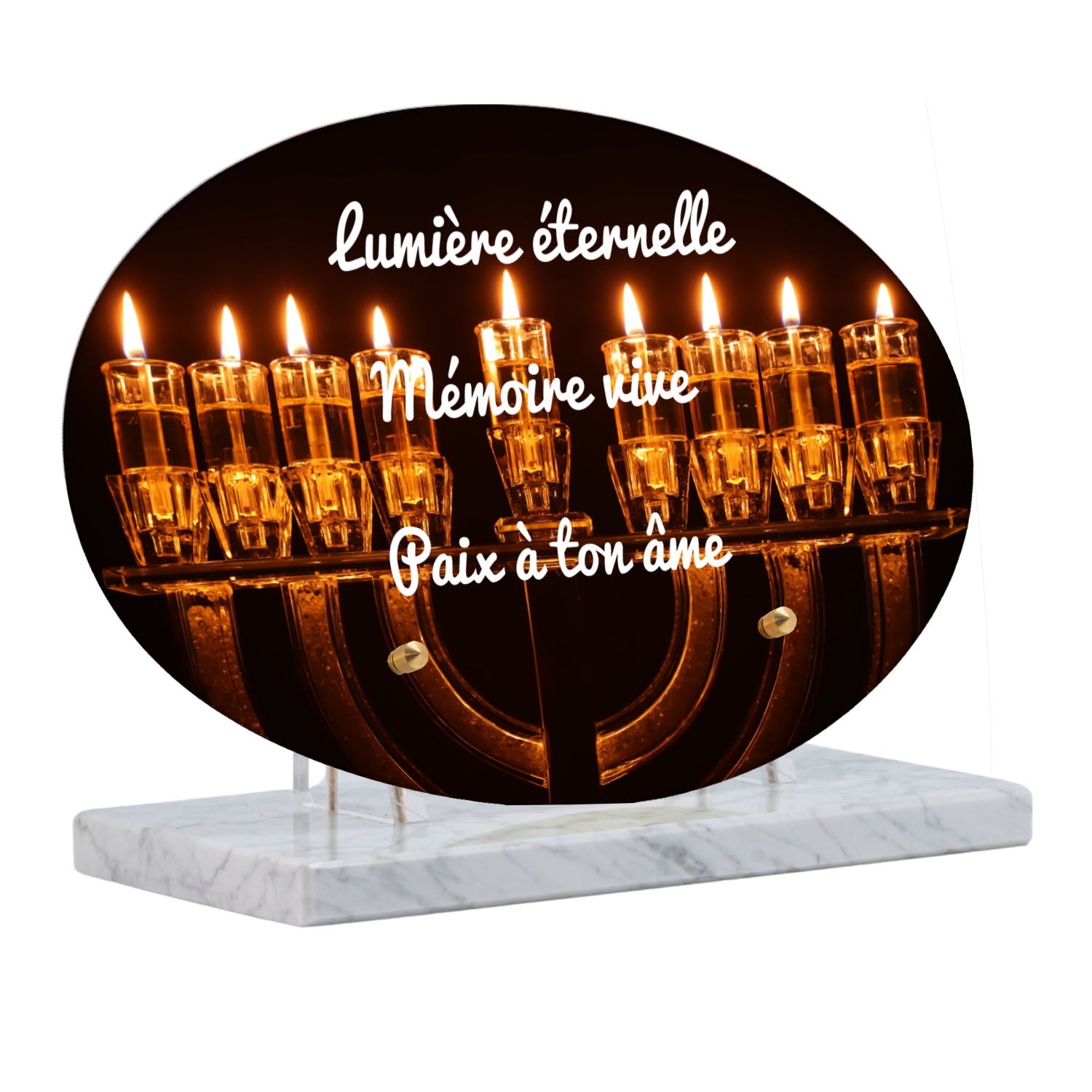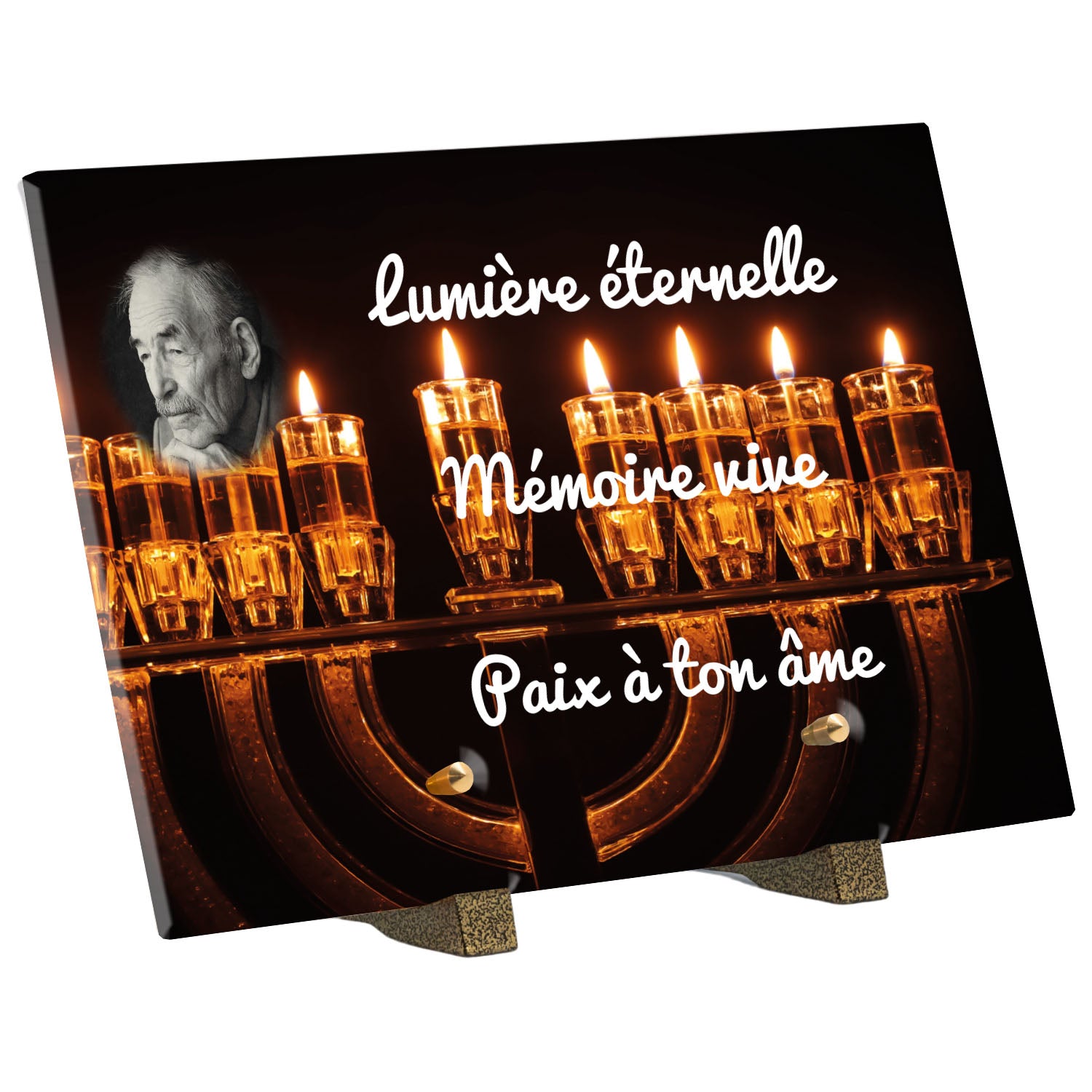 Exprimez un hommage respectueux avec cette plaque funéraire personnalisée représentant la Menorah, symbole de lumière et de mémoire. Réalisée en plexiglas, cette plaque funéraire moderne allie esthétique et solidité, offrant une plaque mortuaire qui respecte la tradition tout en bénéficiant d’un design contemporain.