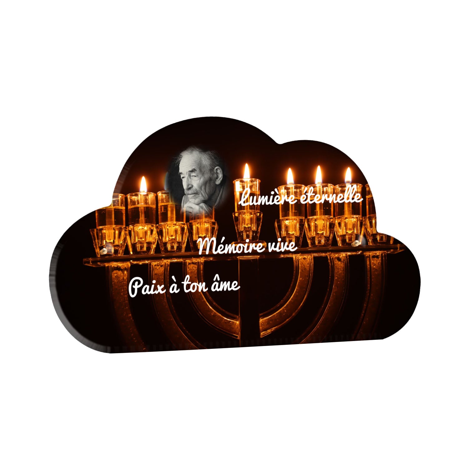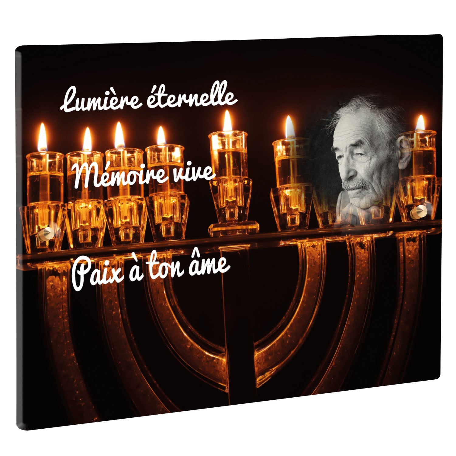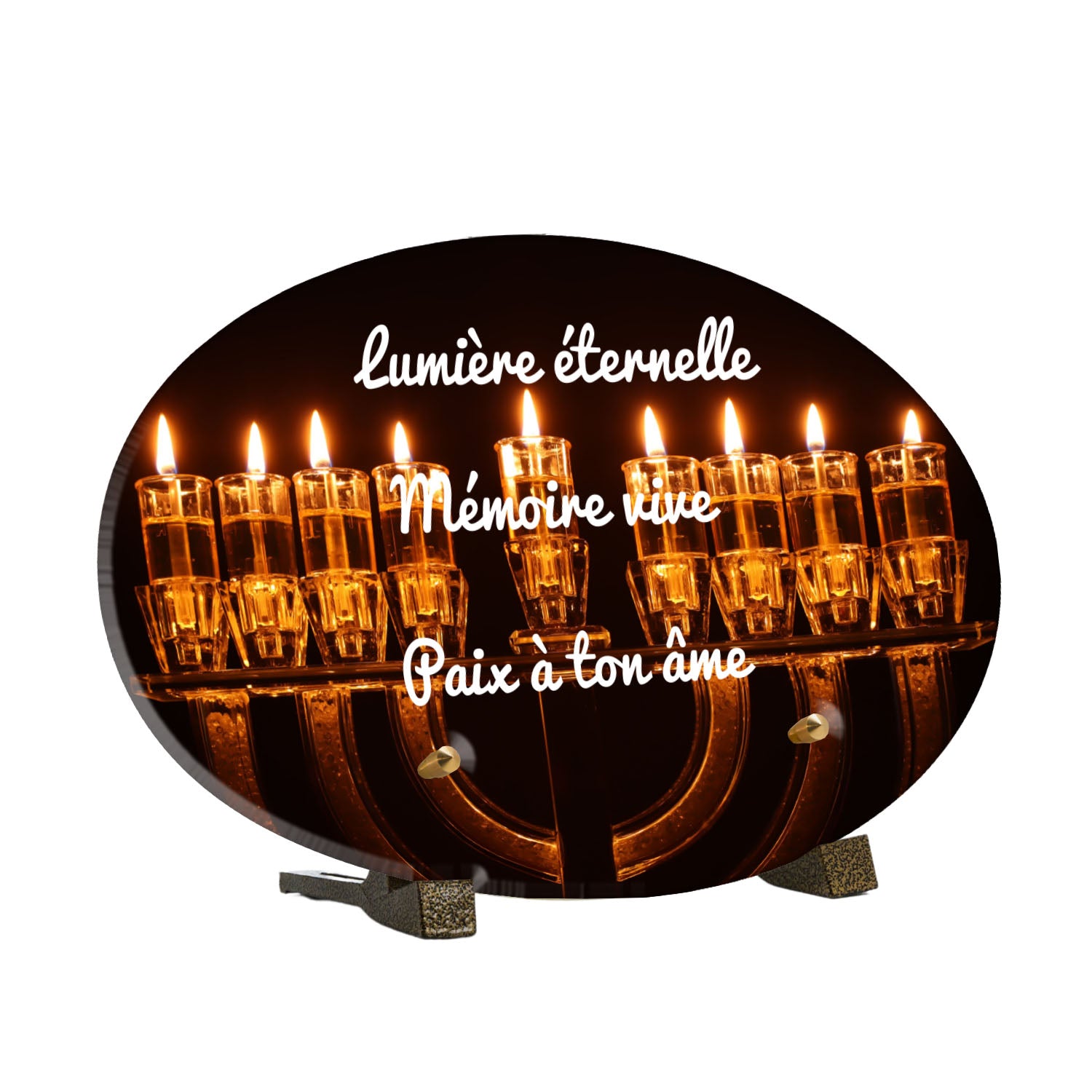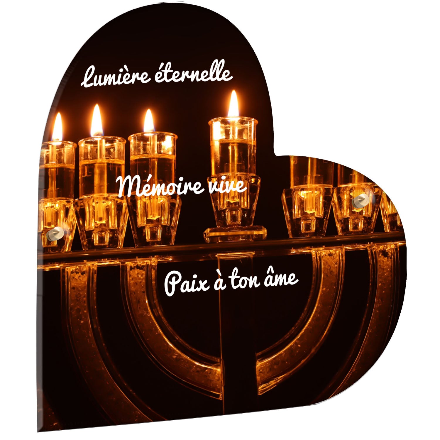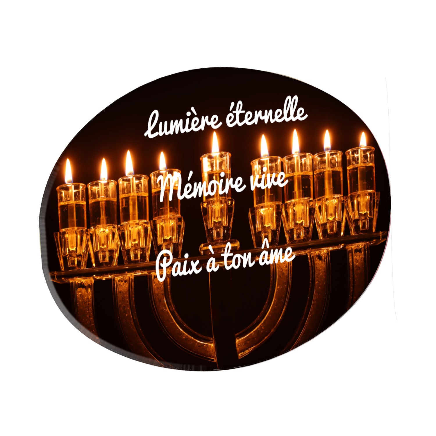 Exprimez un hommage respectueux avec cette plaque funéraire personnalisée représentant la Menorah, symbole de lumière et de mémoire. Réalisée en plexiglas, cette plaque funéraire moderne allie esthétique et solidité, offrant une plaque mortuaire qui respecte la tradition tout en bénéficiant d’un design contemporain.