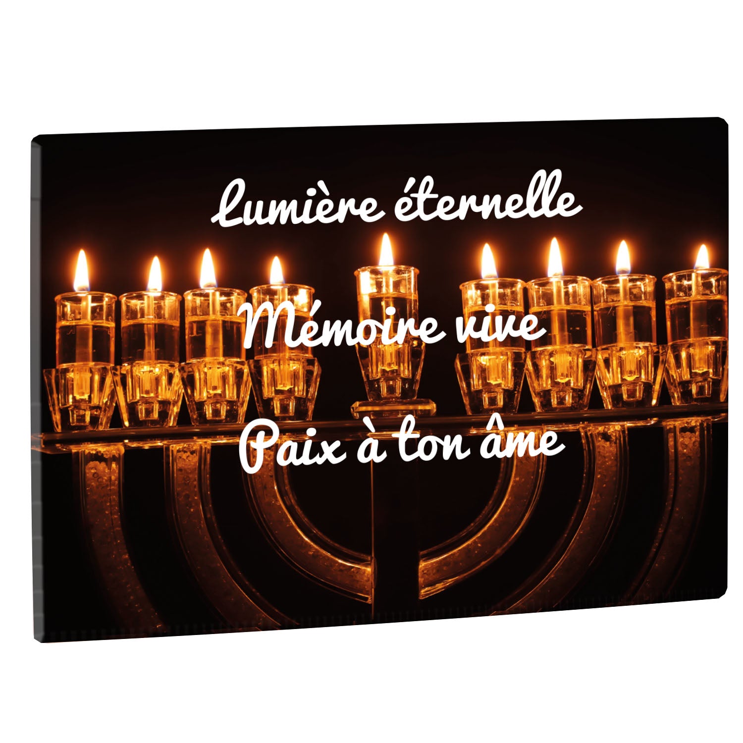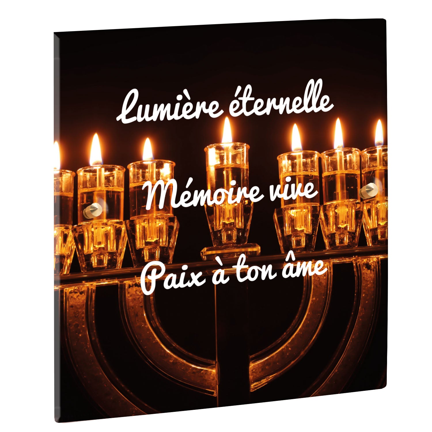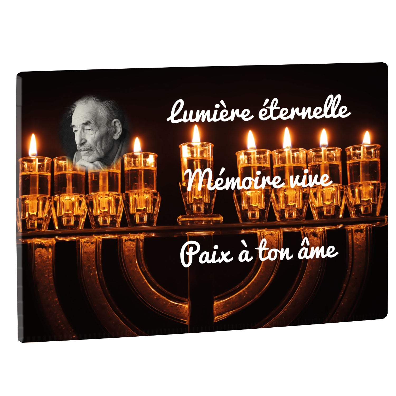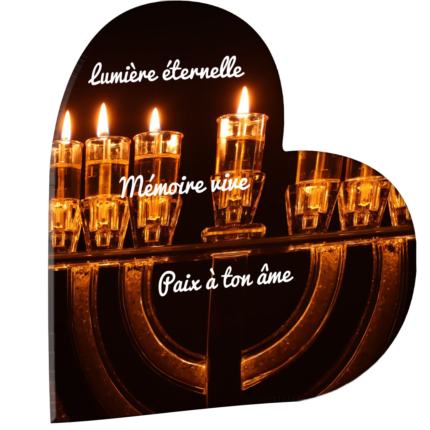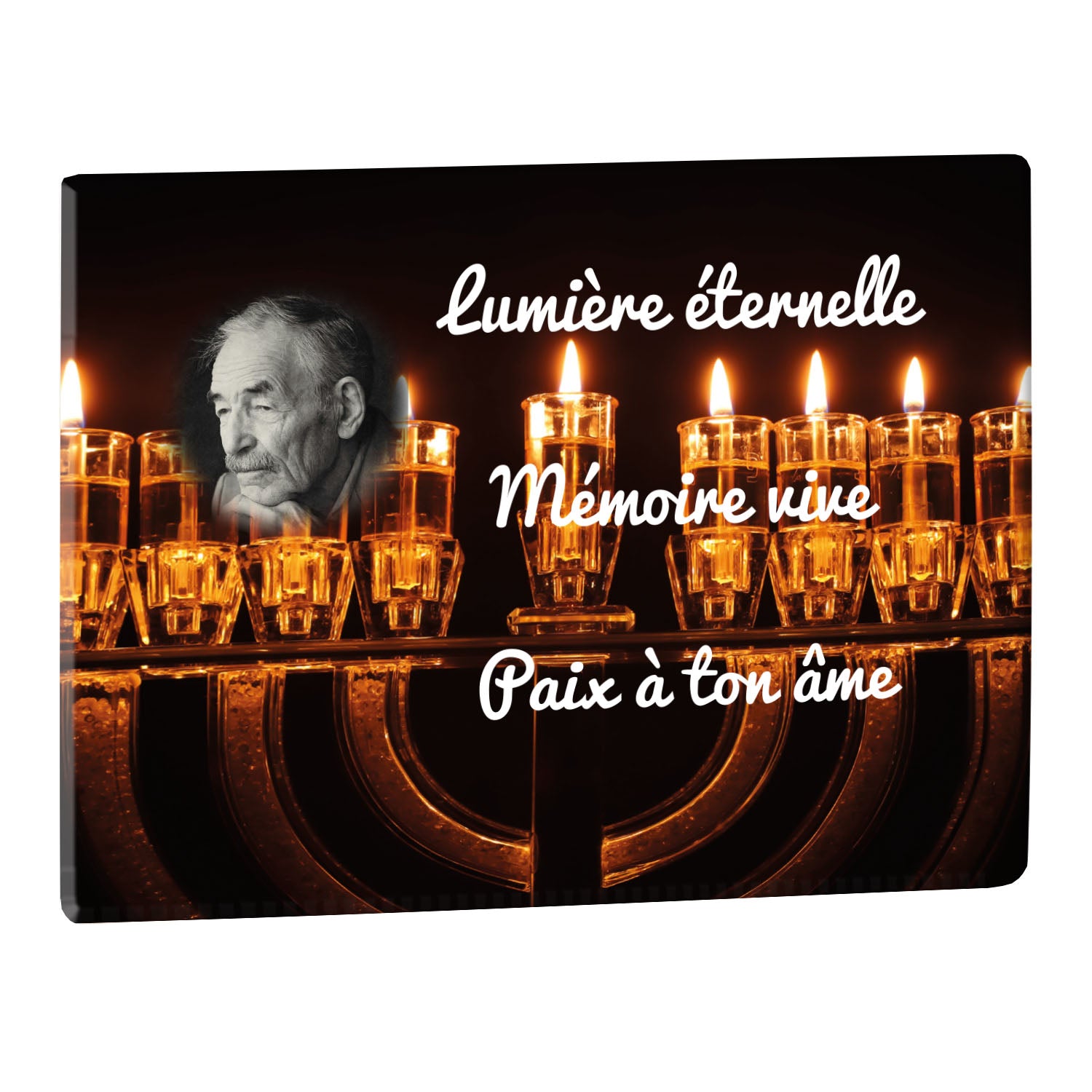 Exprimez un hommage respectueux avec cette plaque funéraire personnalisée représentant la Menorah, symbole de lumière et de mémoire. Réalisée en plexiglas, cette plaque funéraire moderne allie esthétique et solidité, offrant une plaque mortuaire qui respecte la tradition tout en bénéficiant d’un design contemporain.