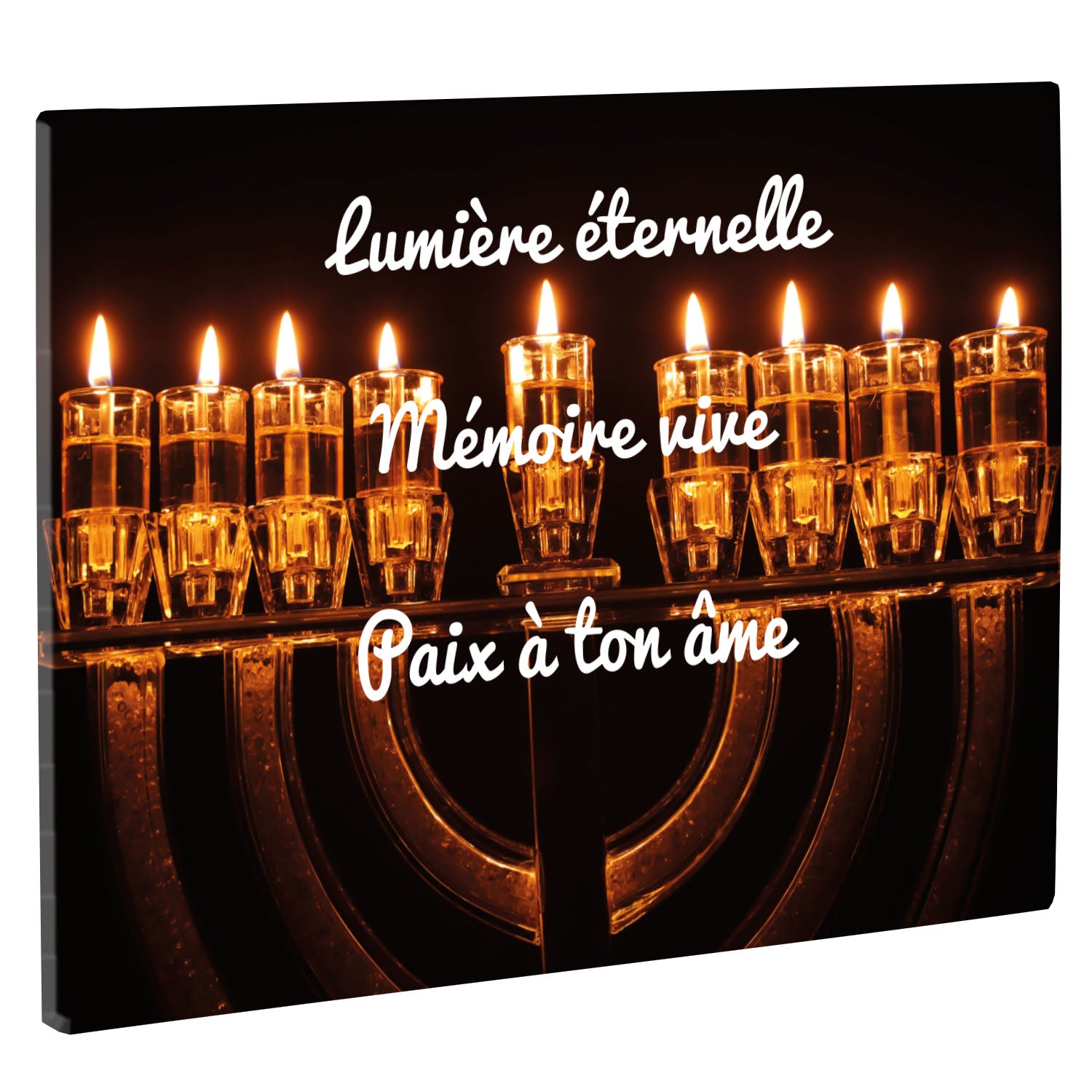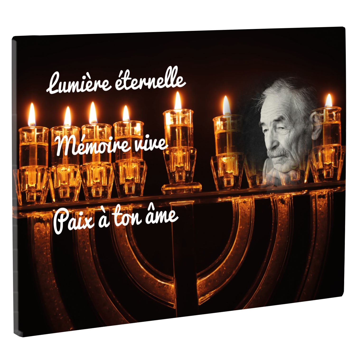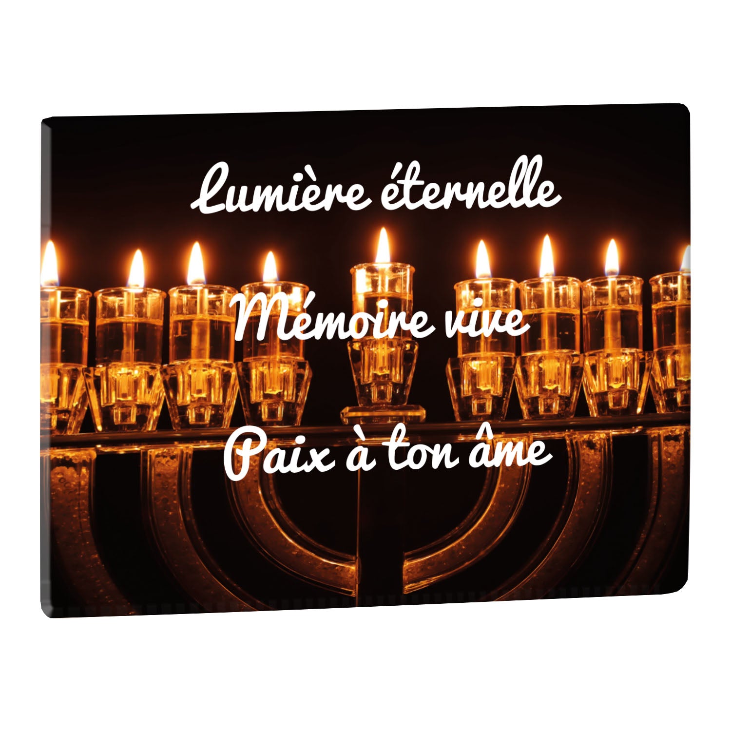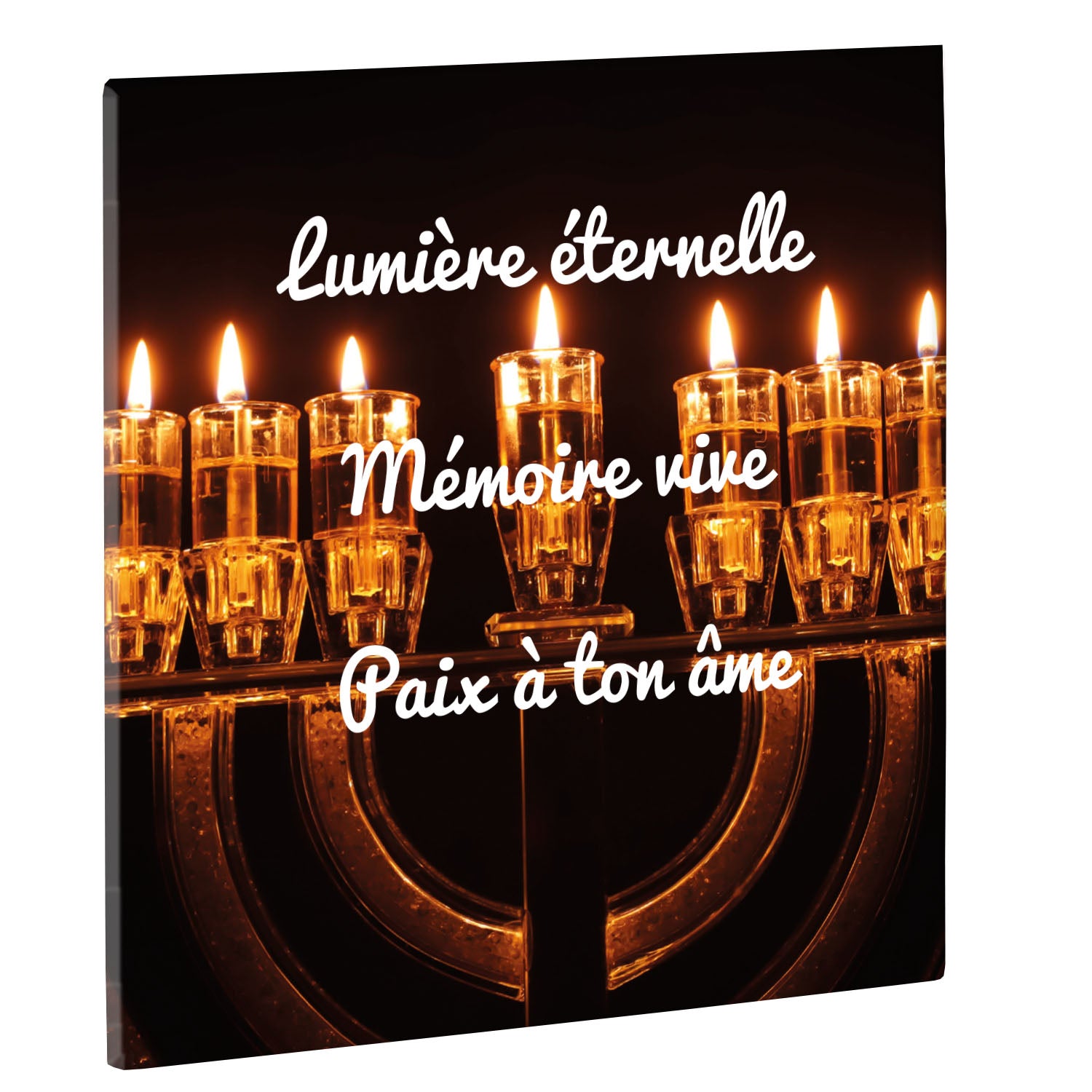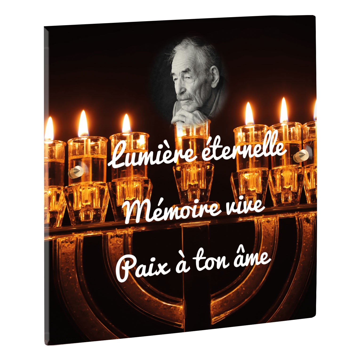 Exprimez un hommage respectueux avec cette plaque funéraire personnalisée représentant la Menorah, symbole de lumière et de mémoire. Réalisée en plexiglas, cette plaque funéraire moderne allie esthétique et solidité, offrant une plaque mortuaire qui respecte la tradition tout en bénéficiant d’un design contemporain.