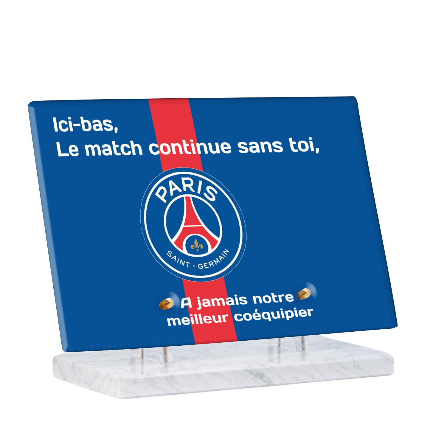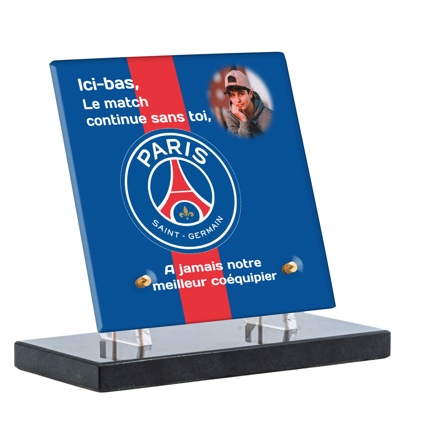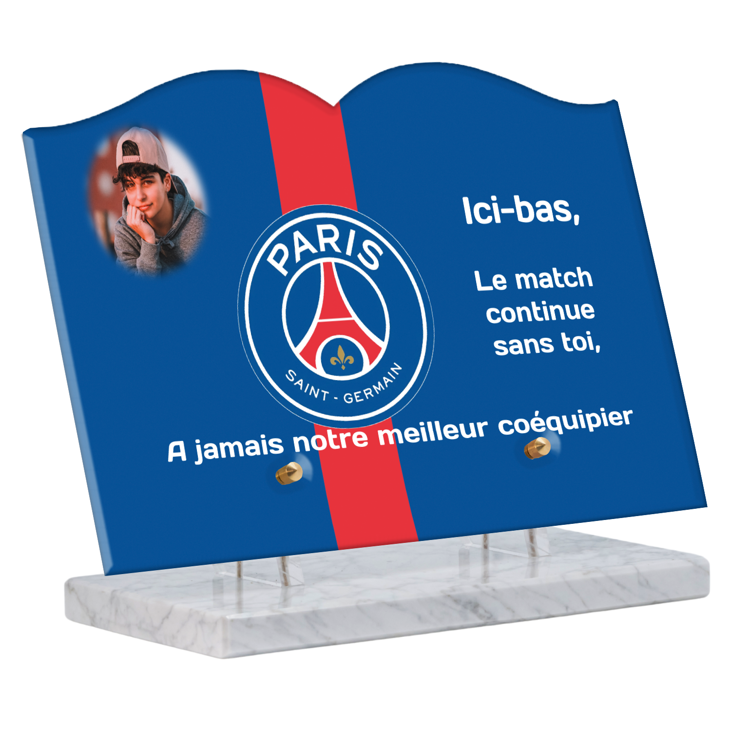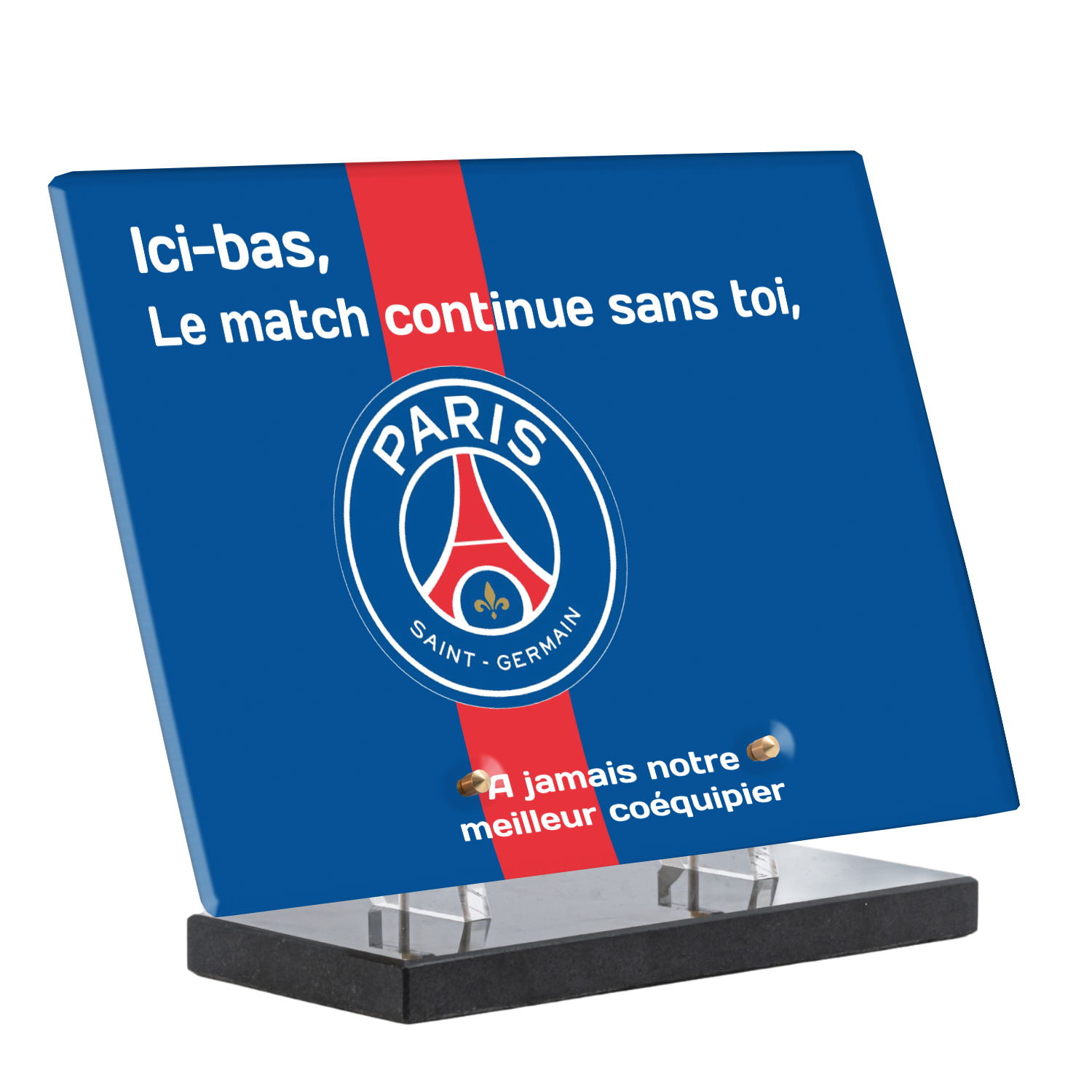 Offrez un hommage unique avec cette plaque funéraire personnalisée aux couleurs du PSG. Conçue en plexiglas moderne, elle allie élégance et durabilité pour célébrer la mémoire de vos proches.