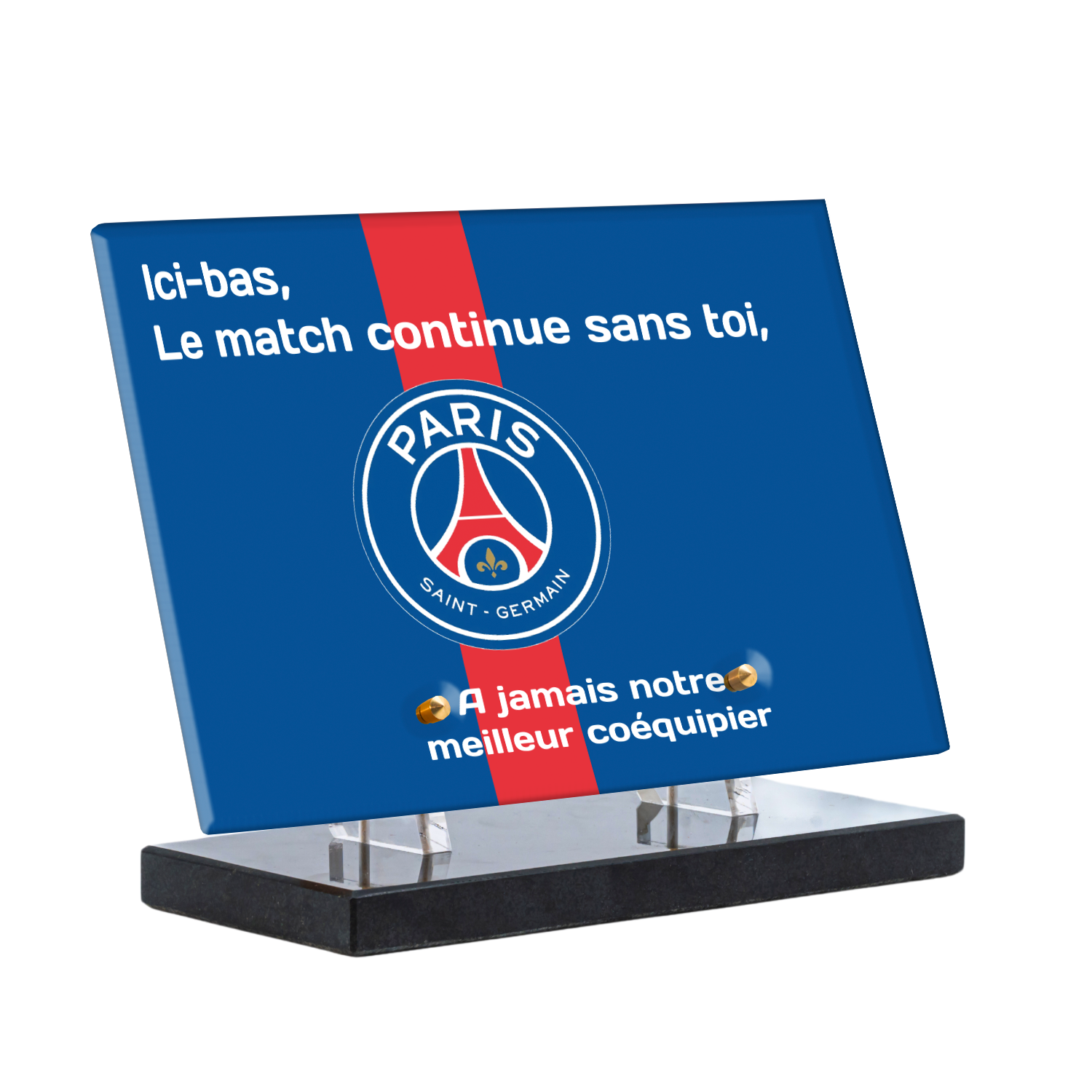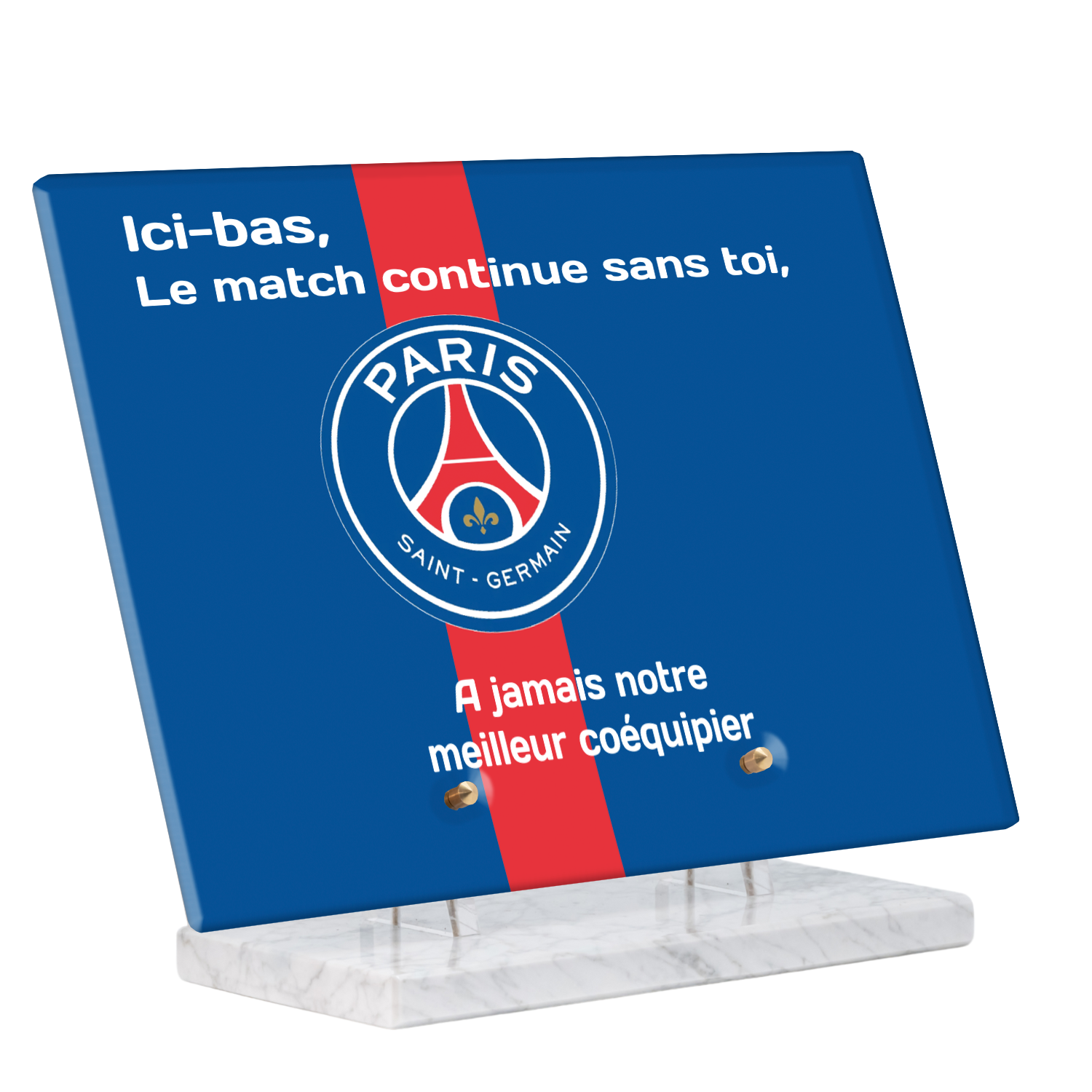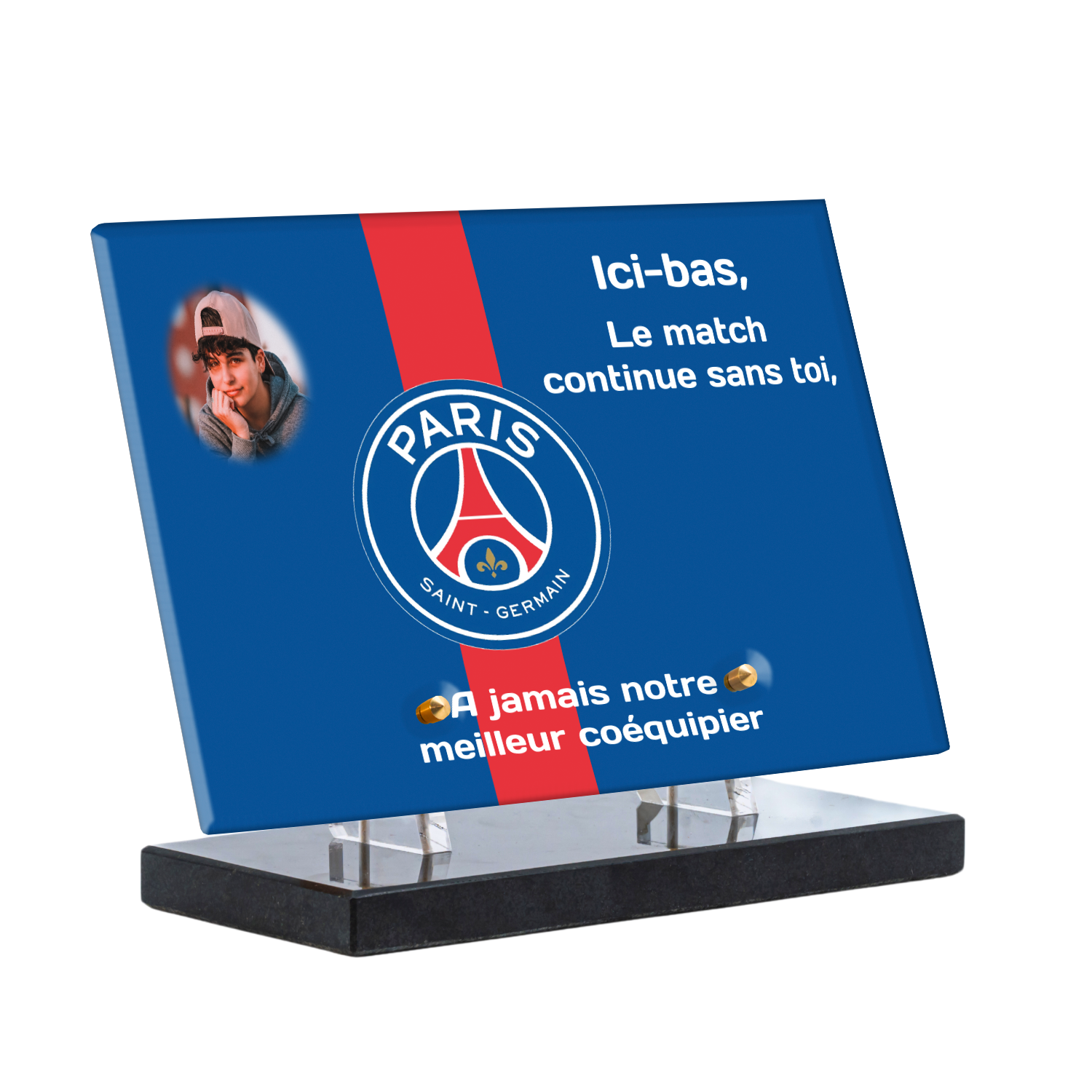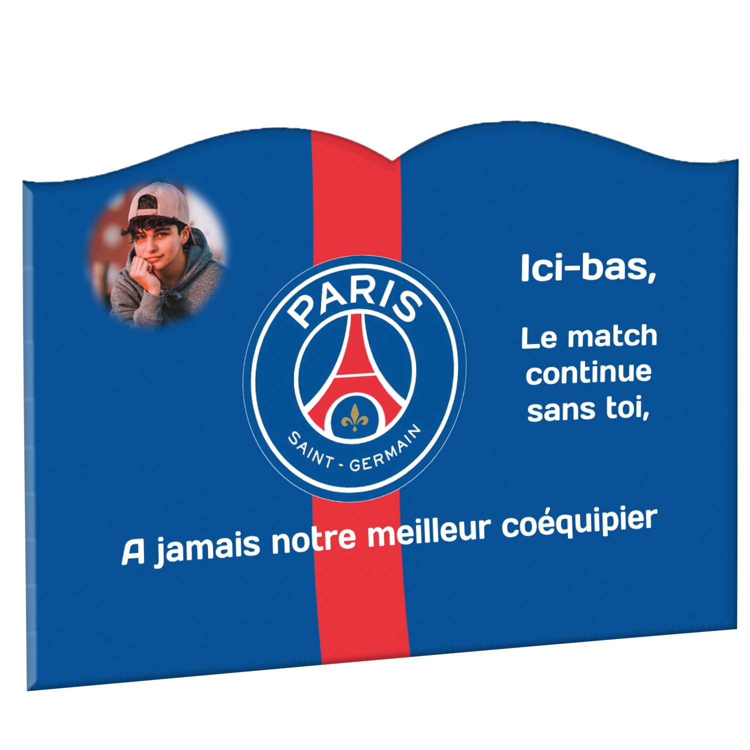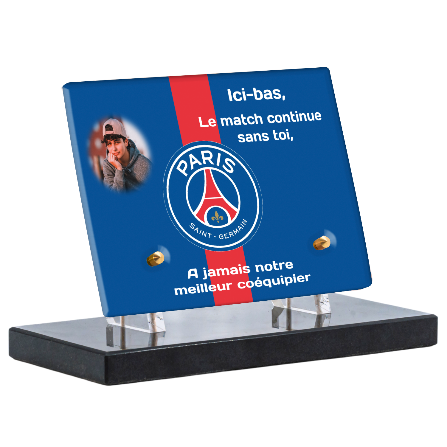 Offrez un hommage unique avec cette plaque funéraire personnalisée aux couleurs du PSG. Conçue en plexiglas moderne, elle allie élégance et durabilité pour célébrer la mémoire de vos proches.