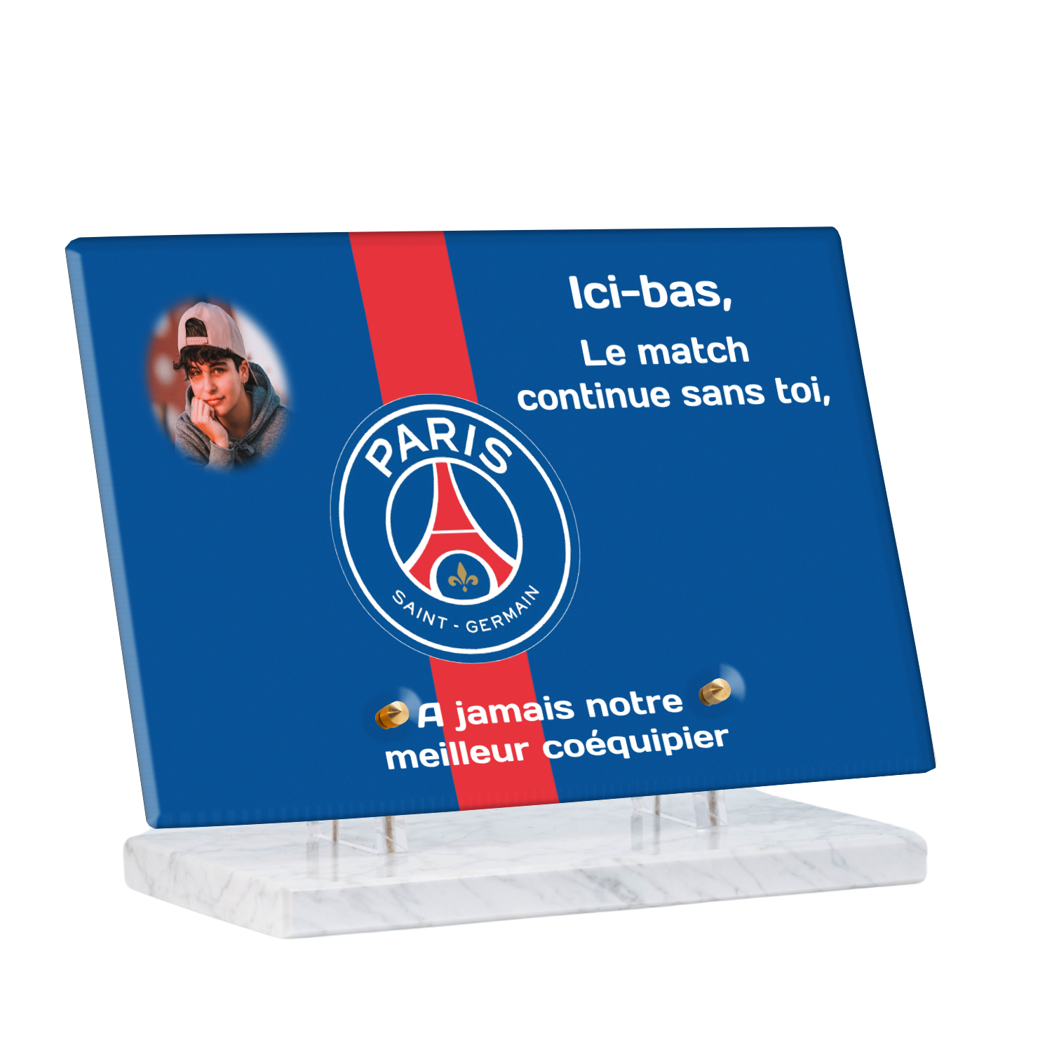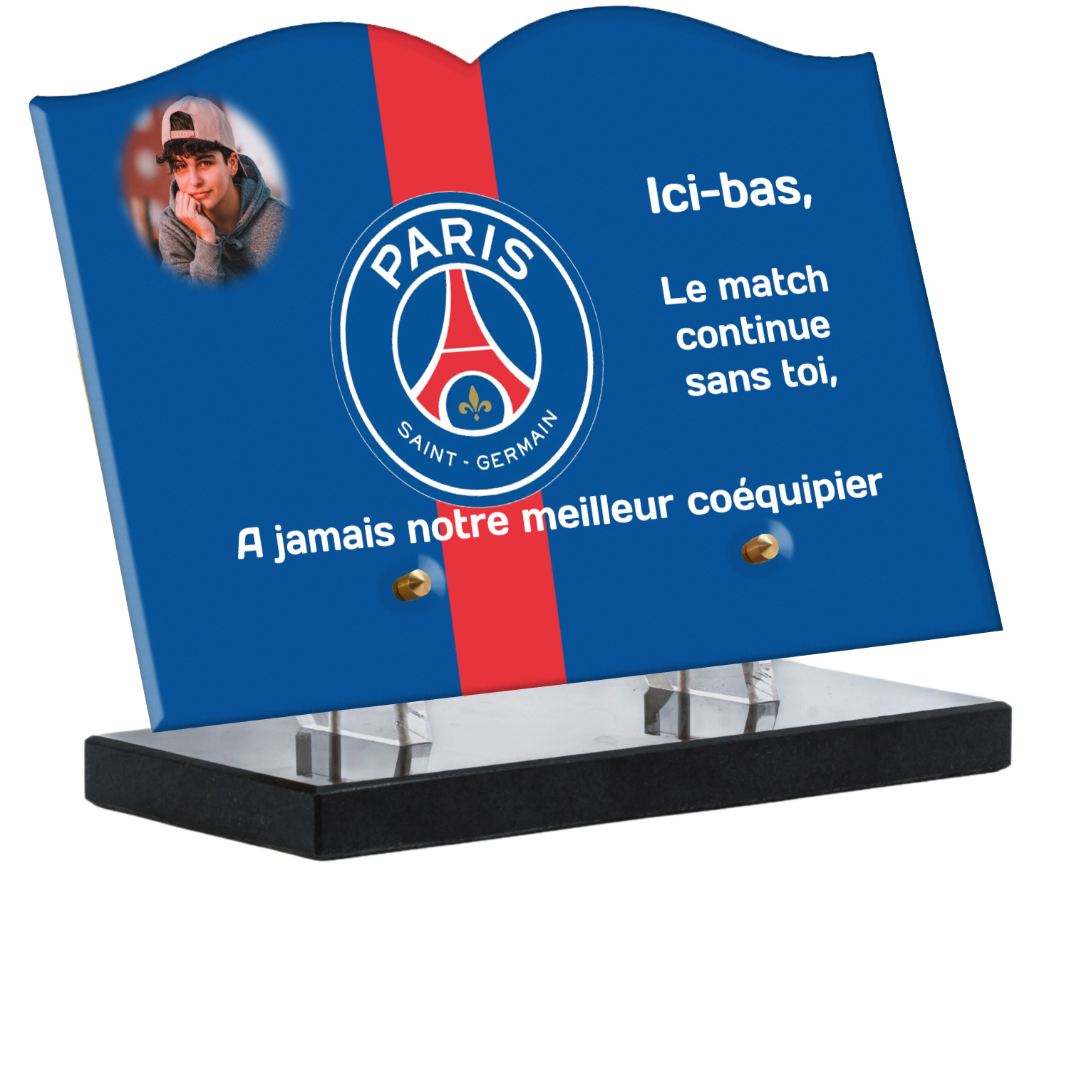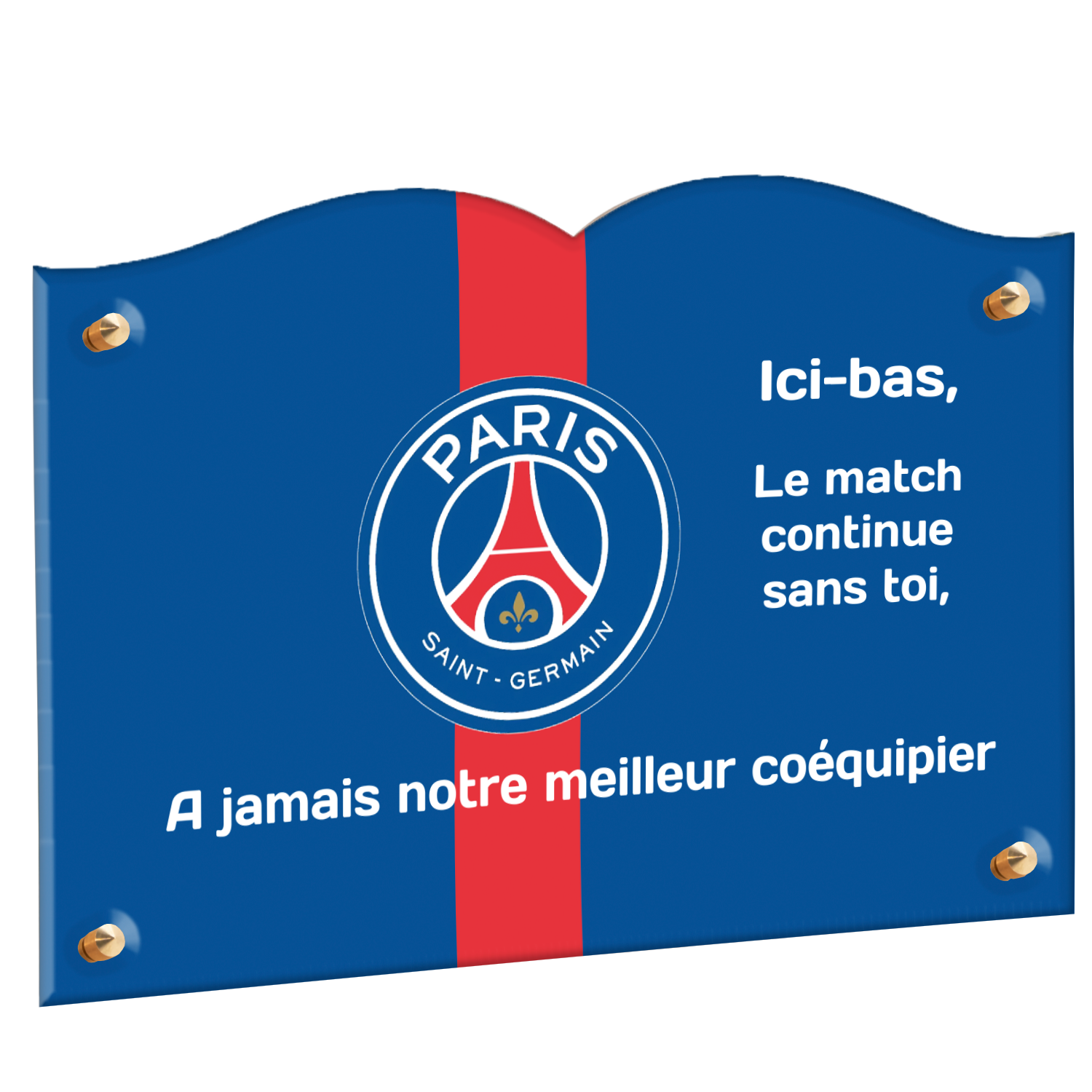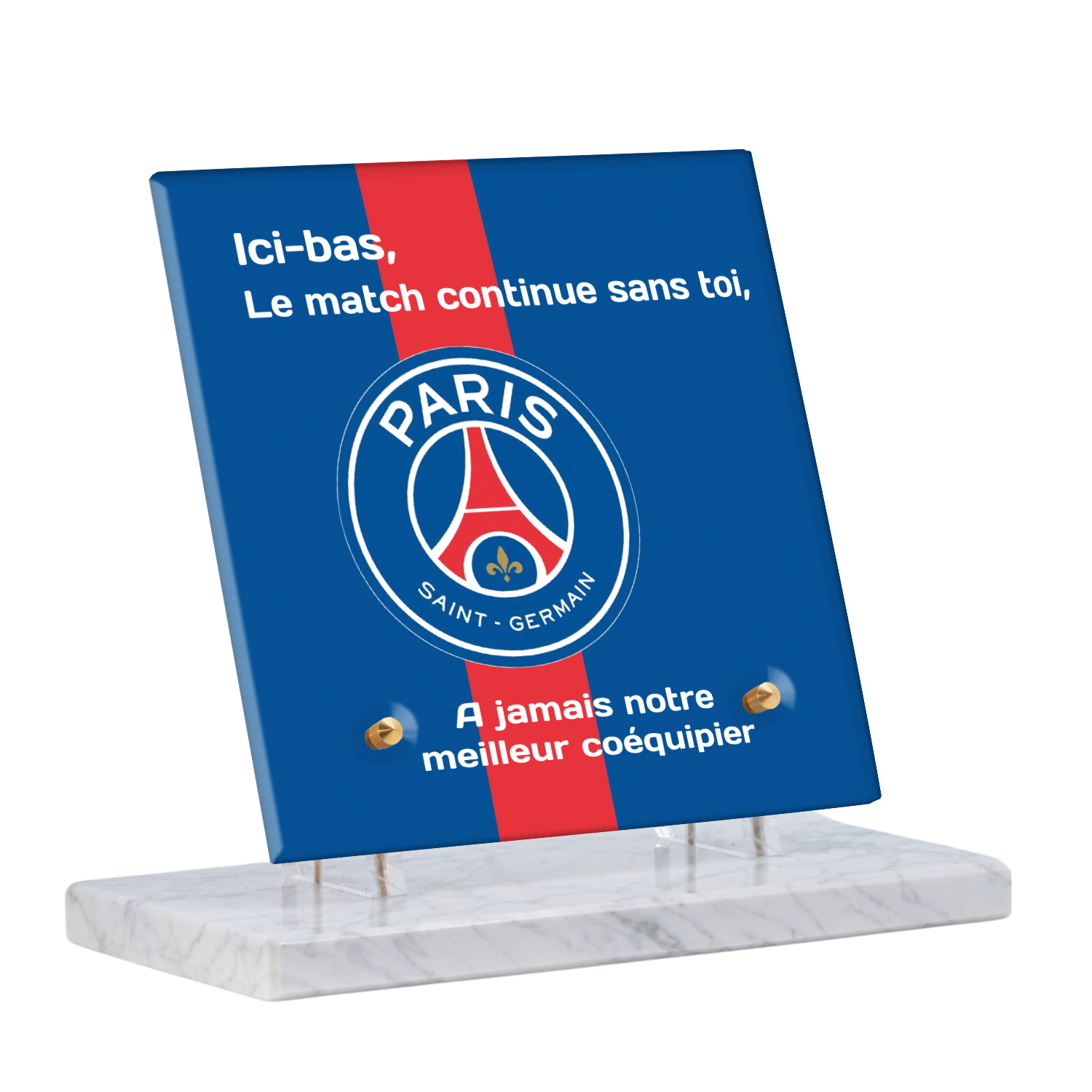 Offrez un hommage unique avec cette plaque funéraire personnalisée aux couleurs du PSG. Conçue en plexiglas moderne, elle allie élégance et durabilité pour célébrer la mémoire de vos proches.