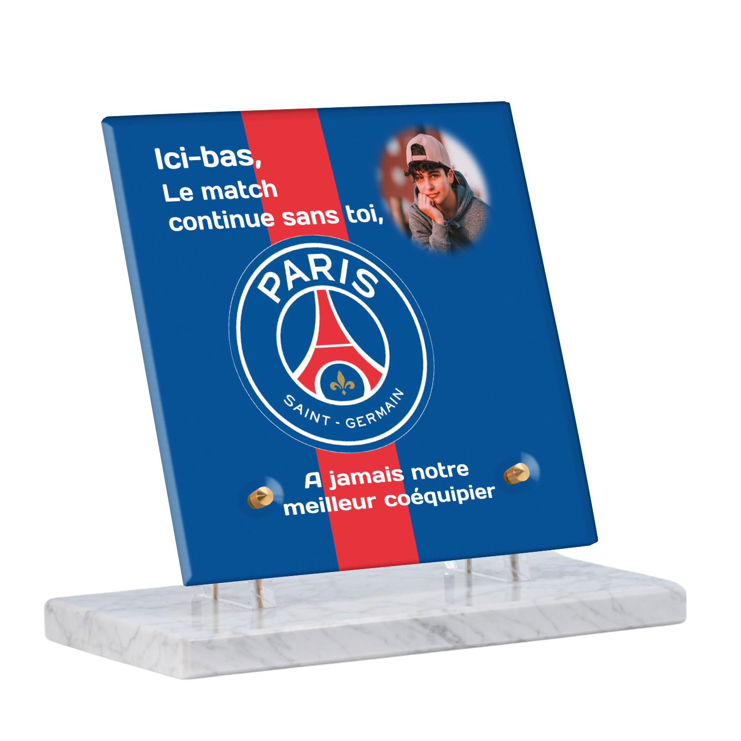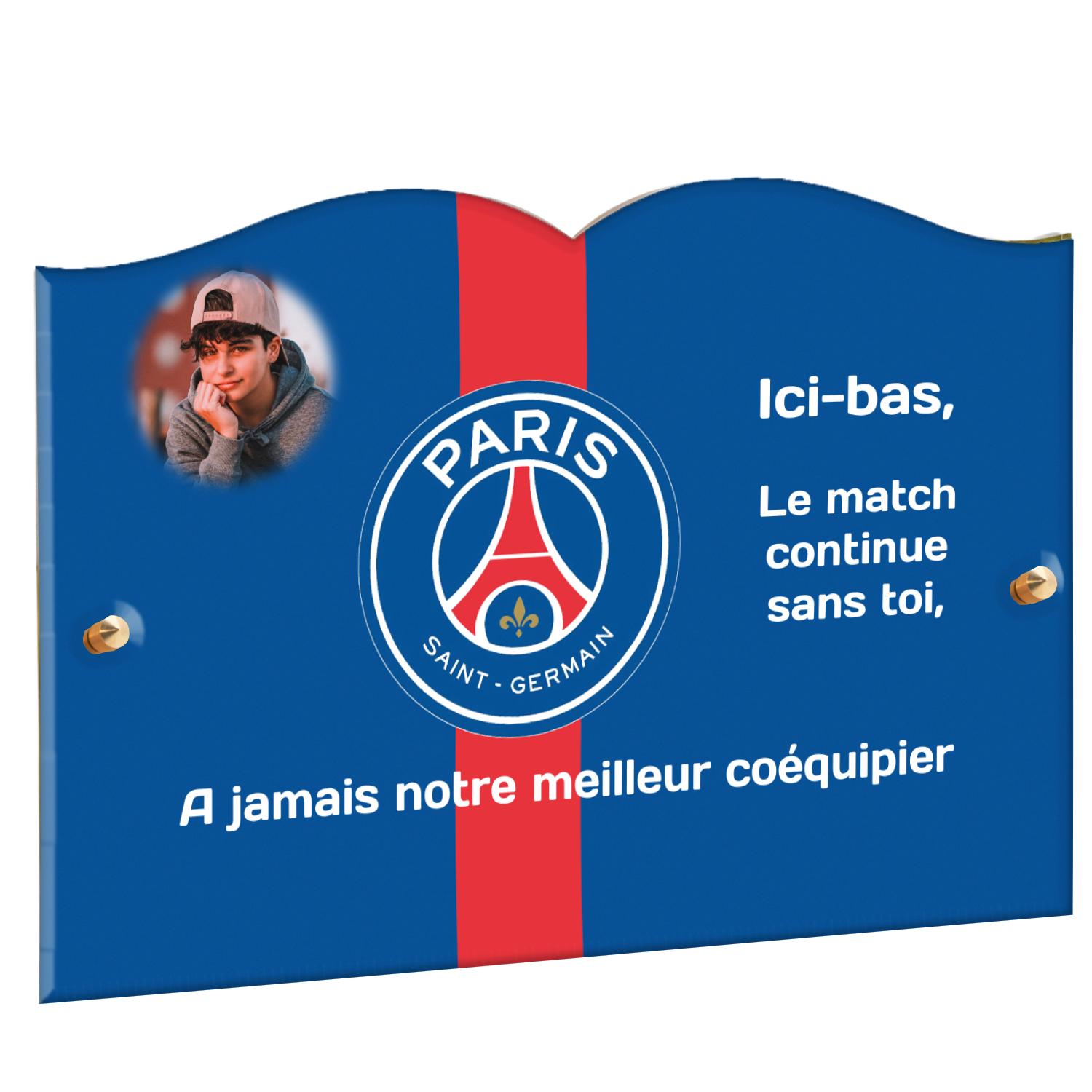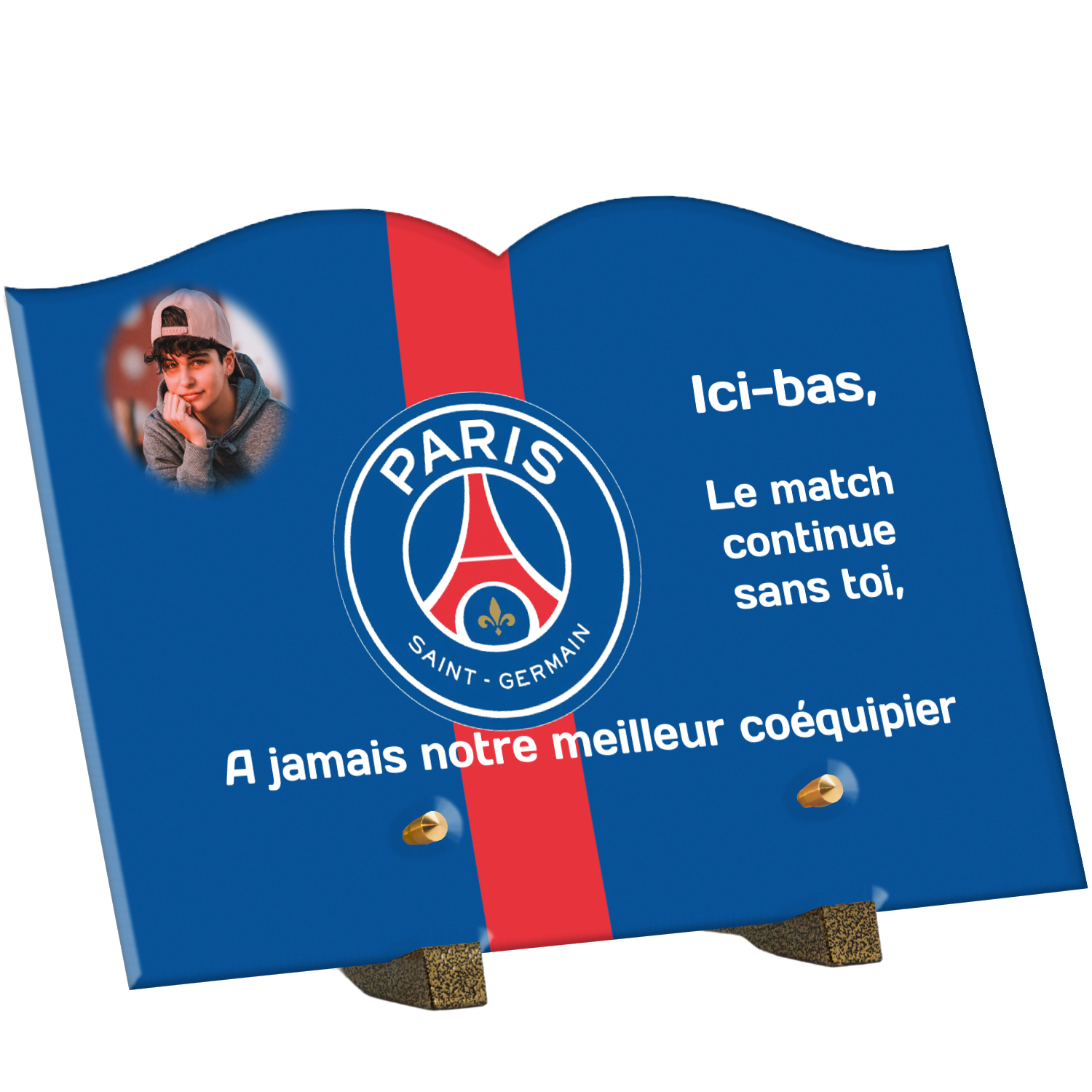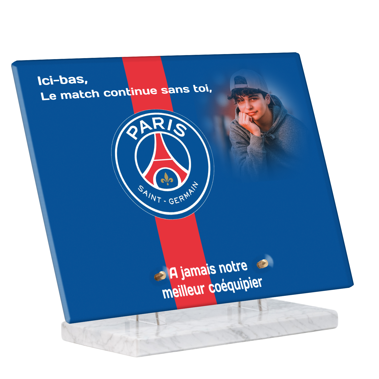 Offrez un hommage unique avec cette plaque funéraire personnalisée aux couleurs du PSG. Conçue en plexiglas moderne, elle allie élégance et durabilité pour célébrer la mémoire de vos proches.