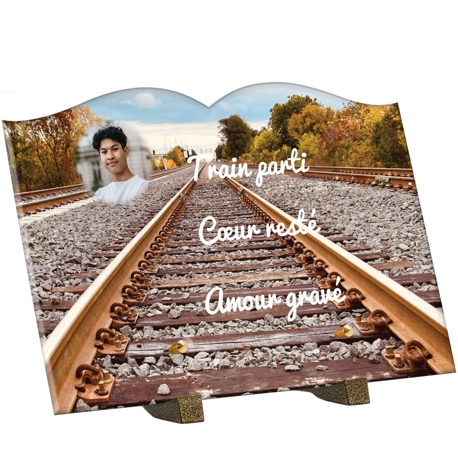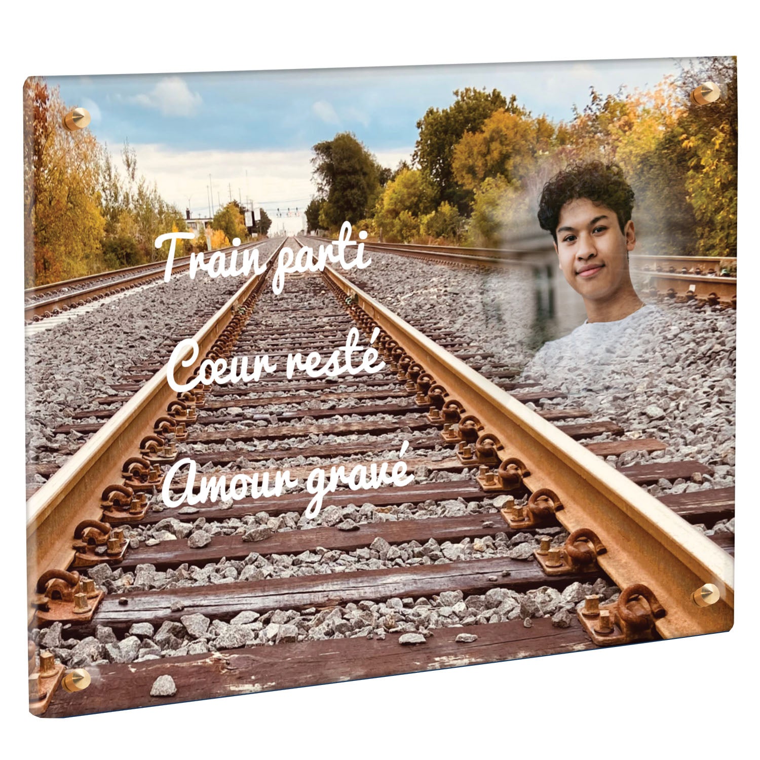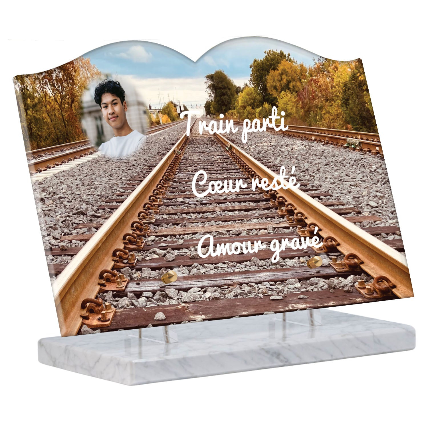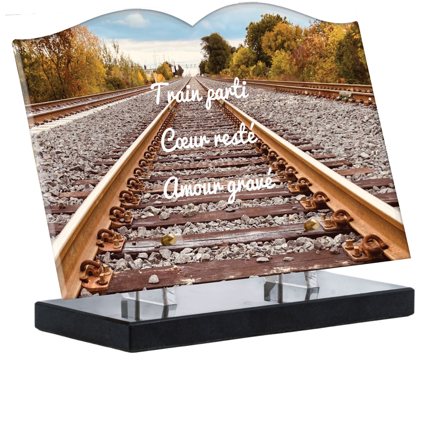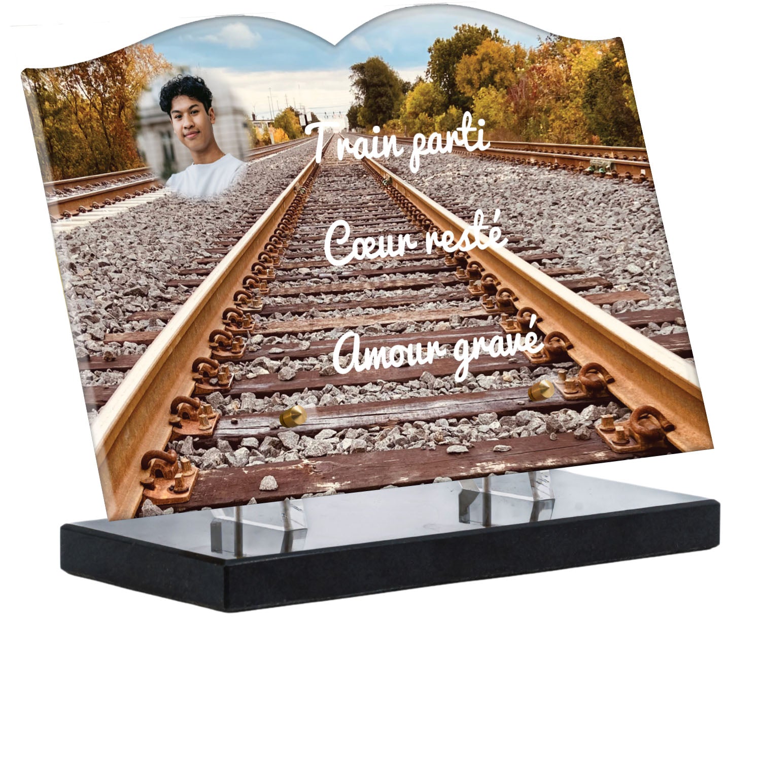 Exprimez votre hommage avec cette plaque funéraire personnalisée au motif unique d’un rail de train, symbolisant un voyage qui continue au-delà de la vie. Conçue en plexiglas moderne, cette plaque mortuaire allie esthétisme et simplicité, idéale pour une plaque funéraire moderne qui met en valeur à la fois mémoire et élégance.