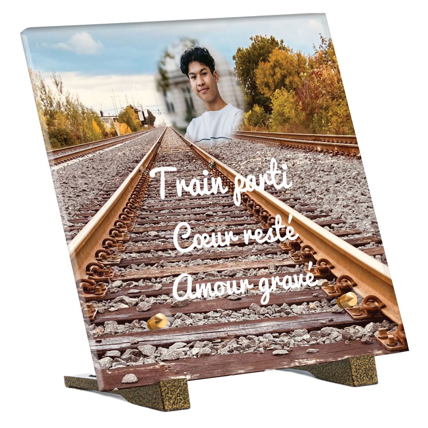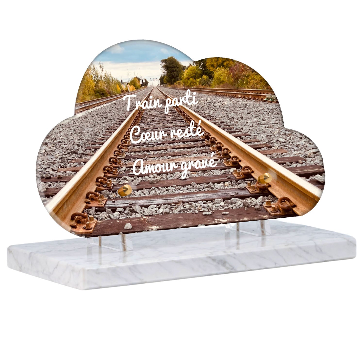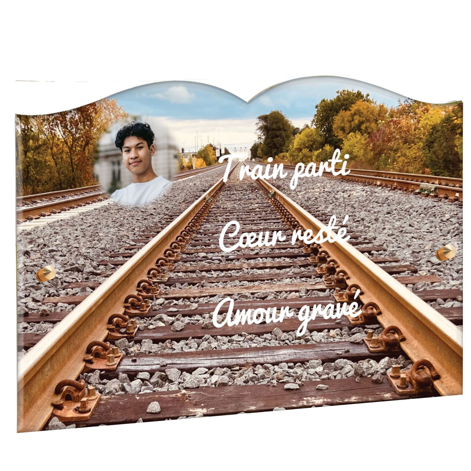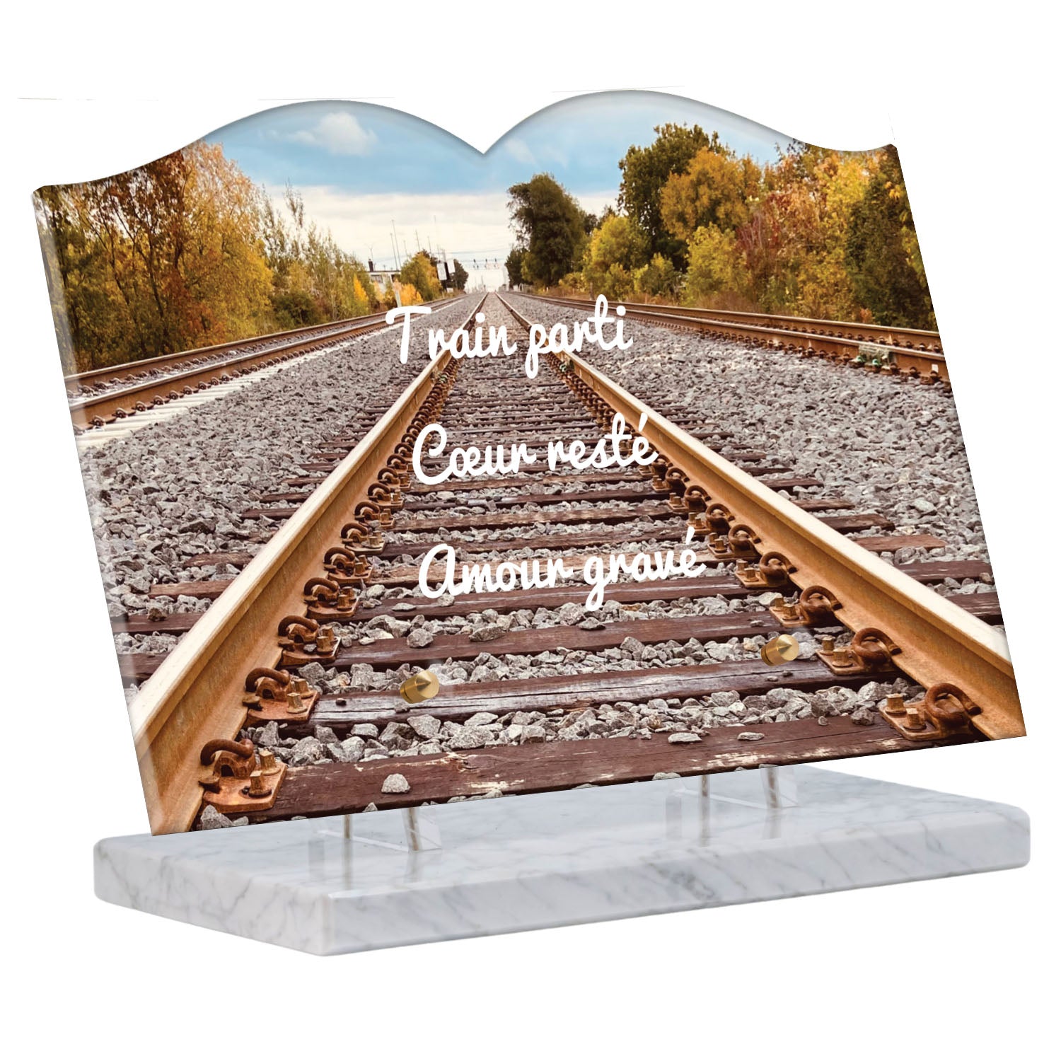 Exprimez votre hommage avec cette plaque funéraire personnalisée au motif unique d’un rail de train, symbolisant un voyage qui continue au-delà de la vie. Conçue en plexiglas moderne, cette plaque mortuaire allie esthétisme et simplicité, idéale pour une plaque funéraire moderne qui met en valeur à la fois mémoire et élégance.