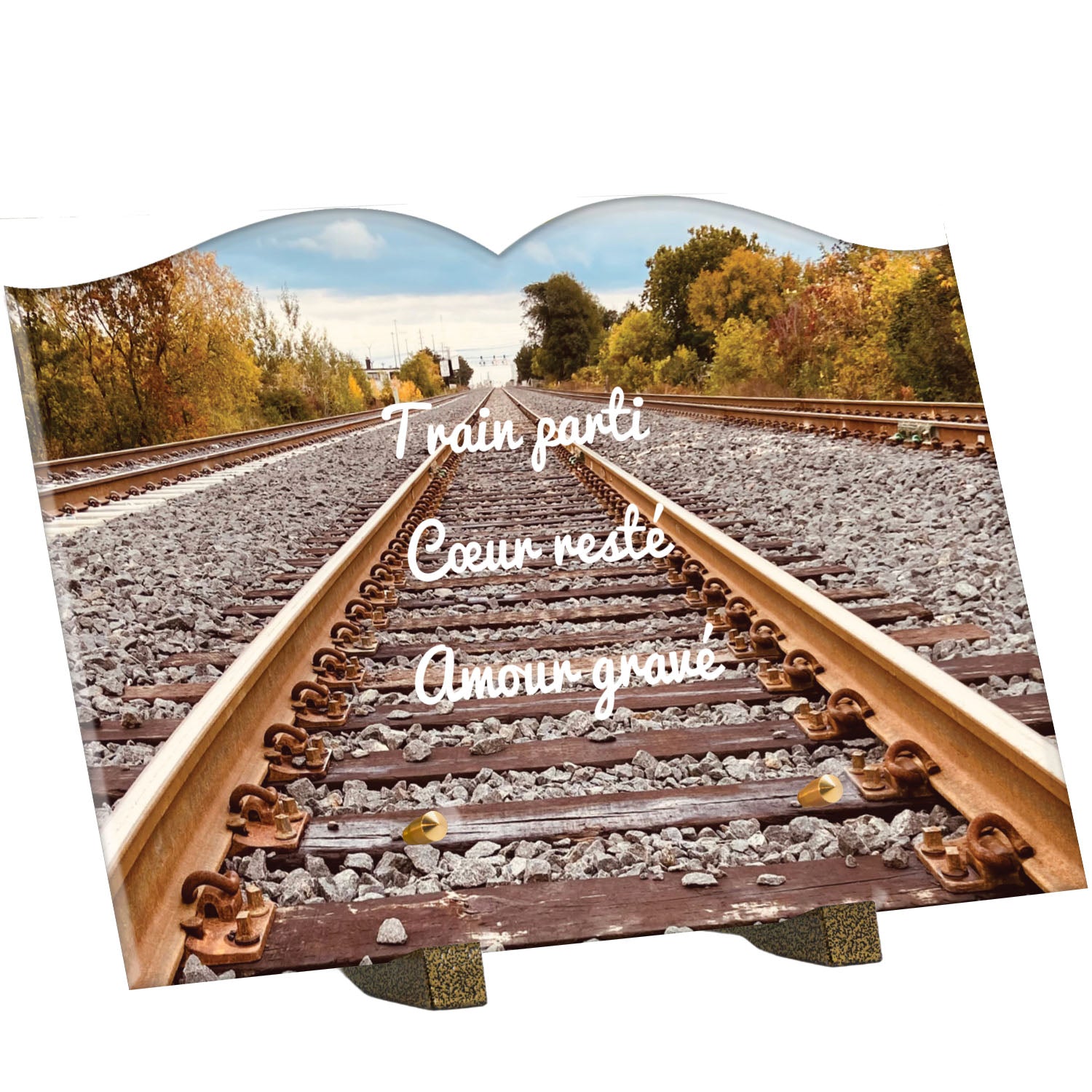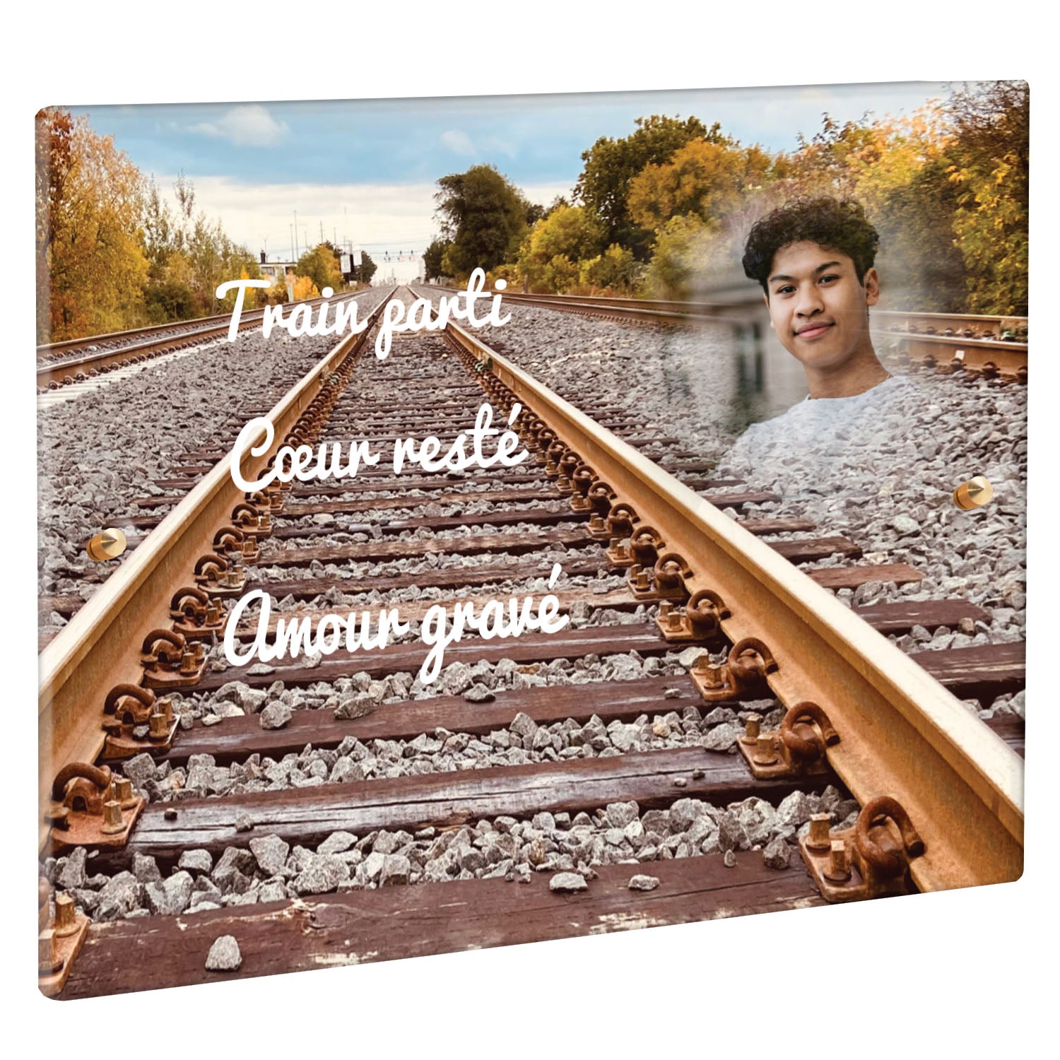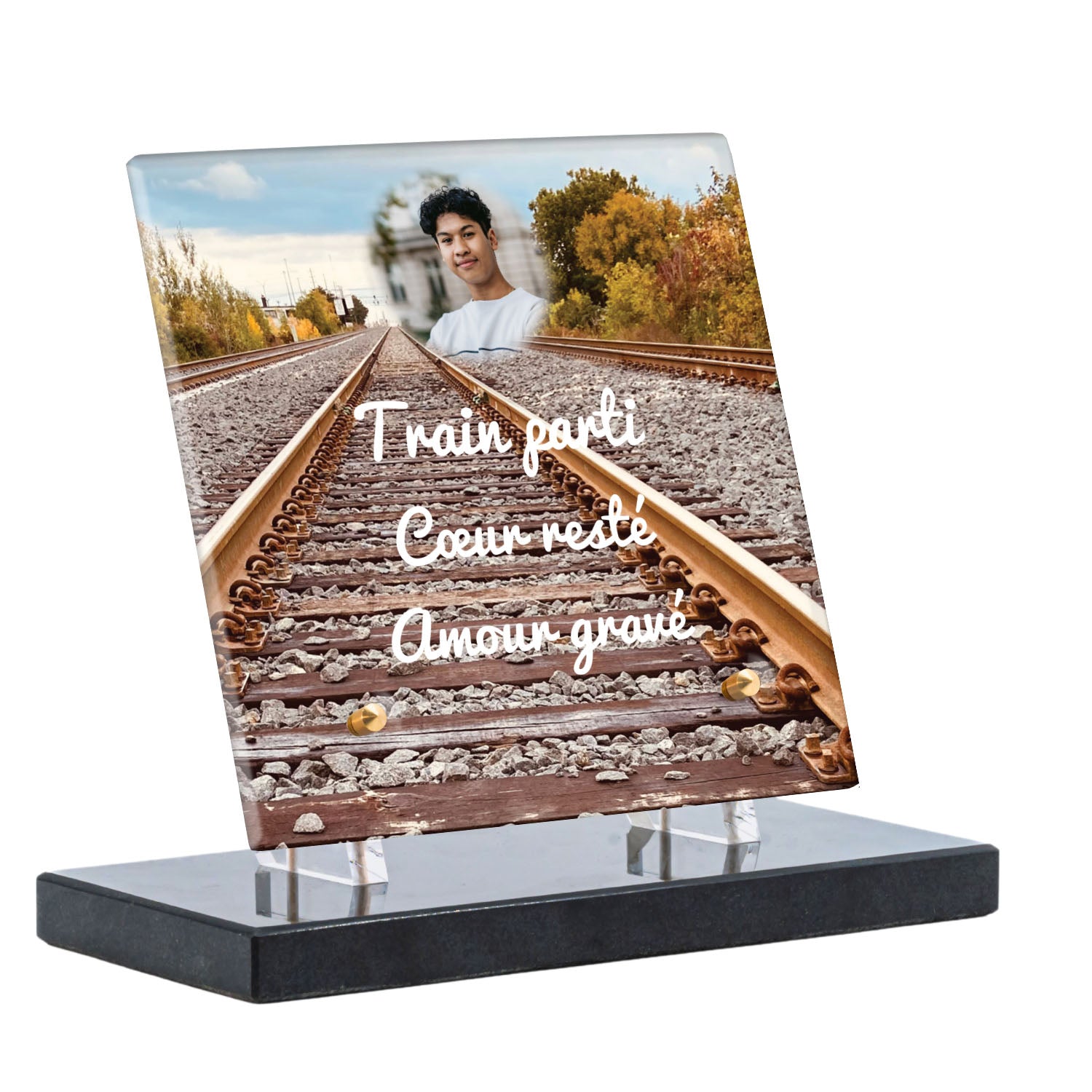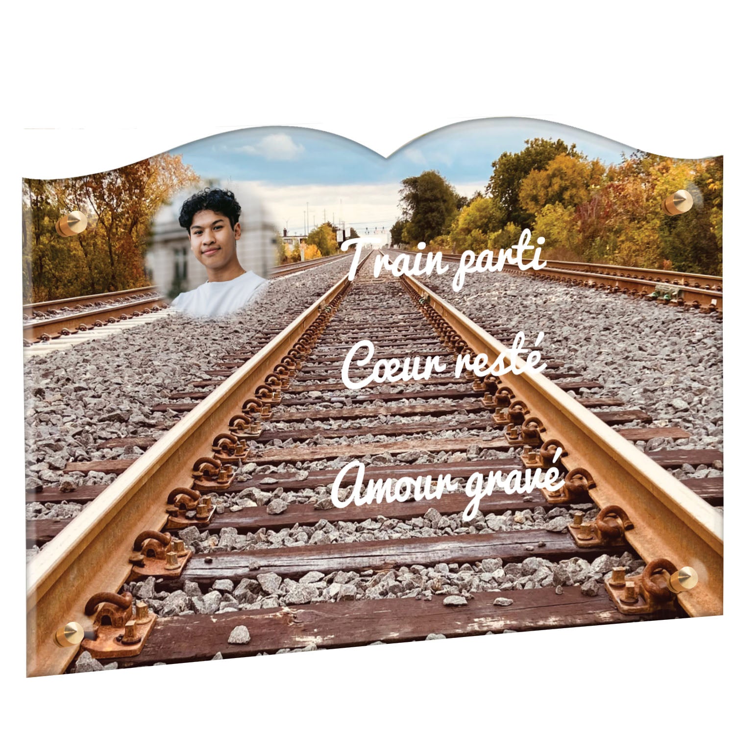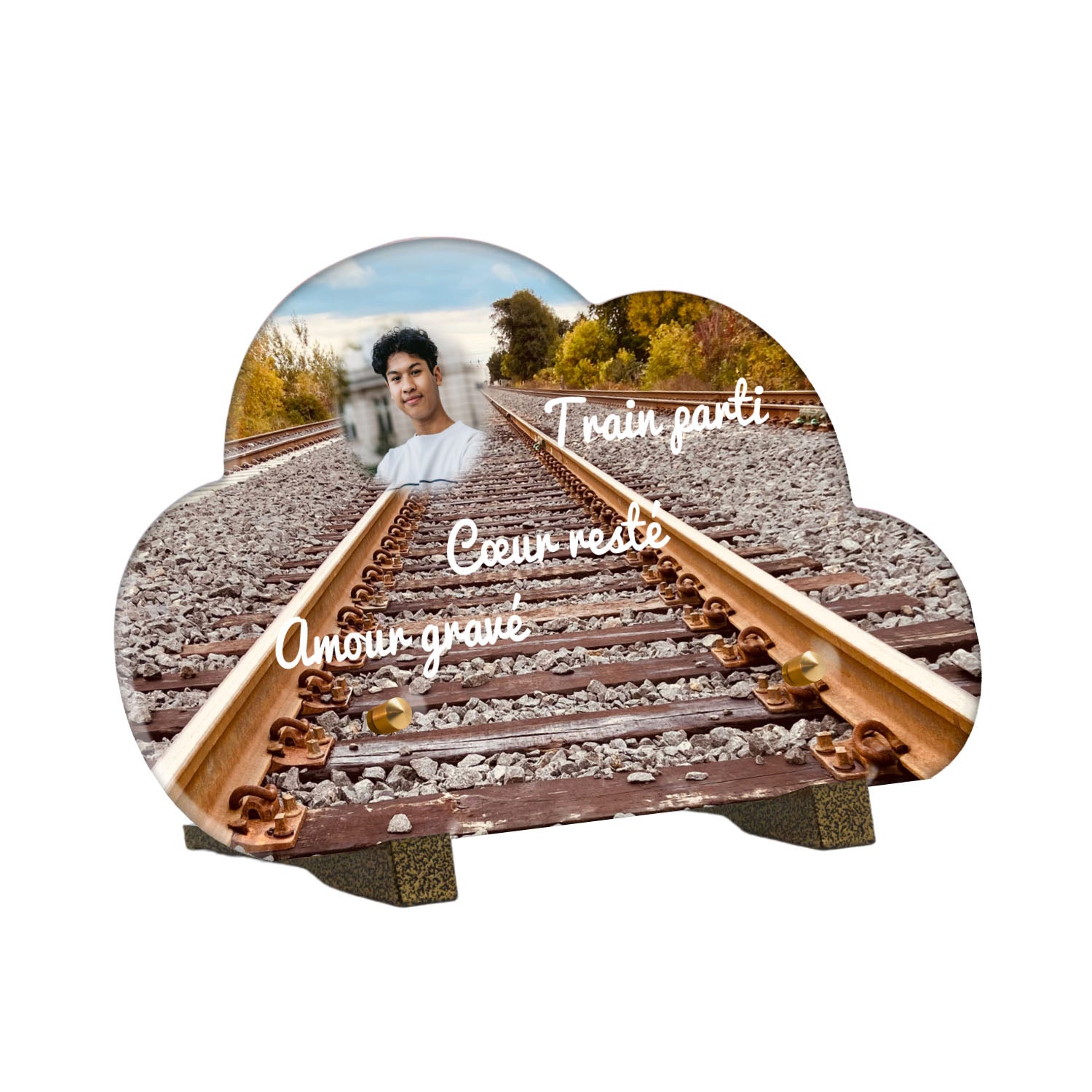 Exprimez votre hommage avec cette plaque funéraire personnalisée au motif unique d’un rail de train, symbolisant un voyage qui continue au-delà de la vie. Conçue en plexiglas moderne, cette plaque mortuaire allie esthétisme et simplicité, idéale pour une plaque funéraire moderne qui met en valeur à la fois mémoire et élégance.