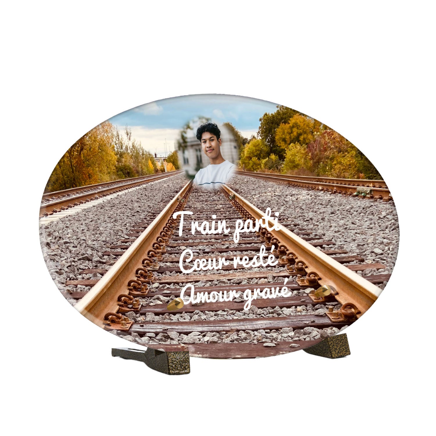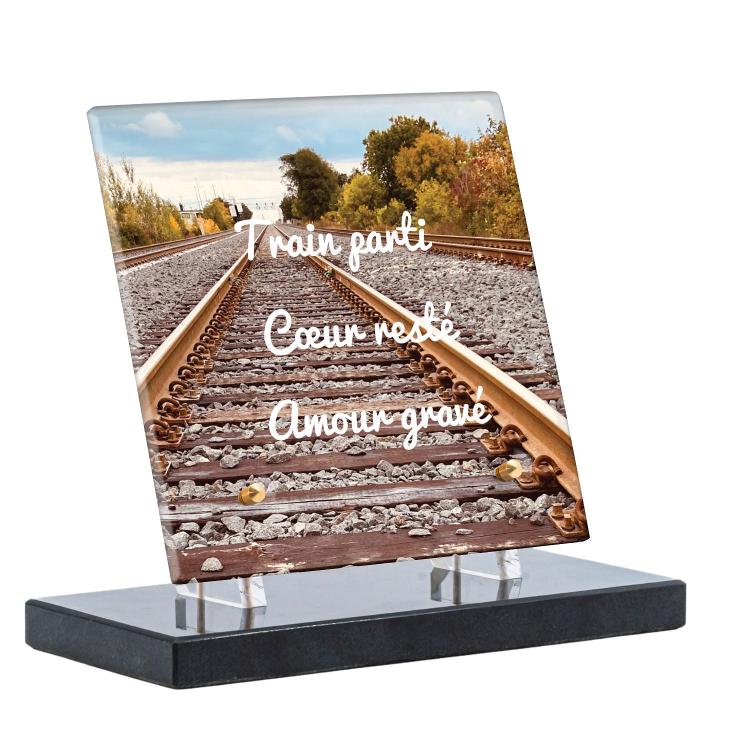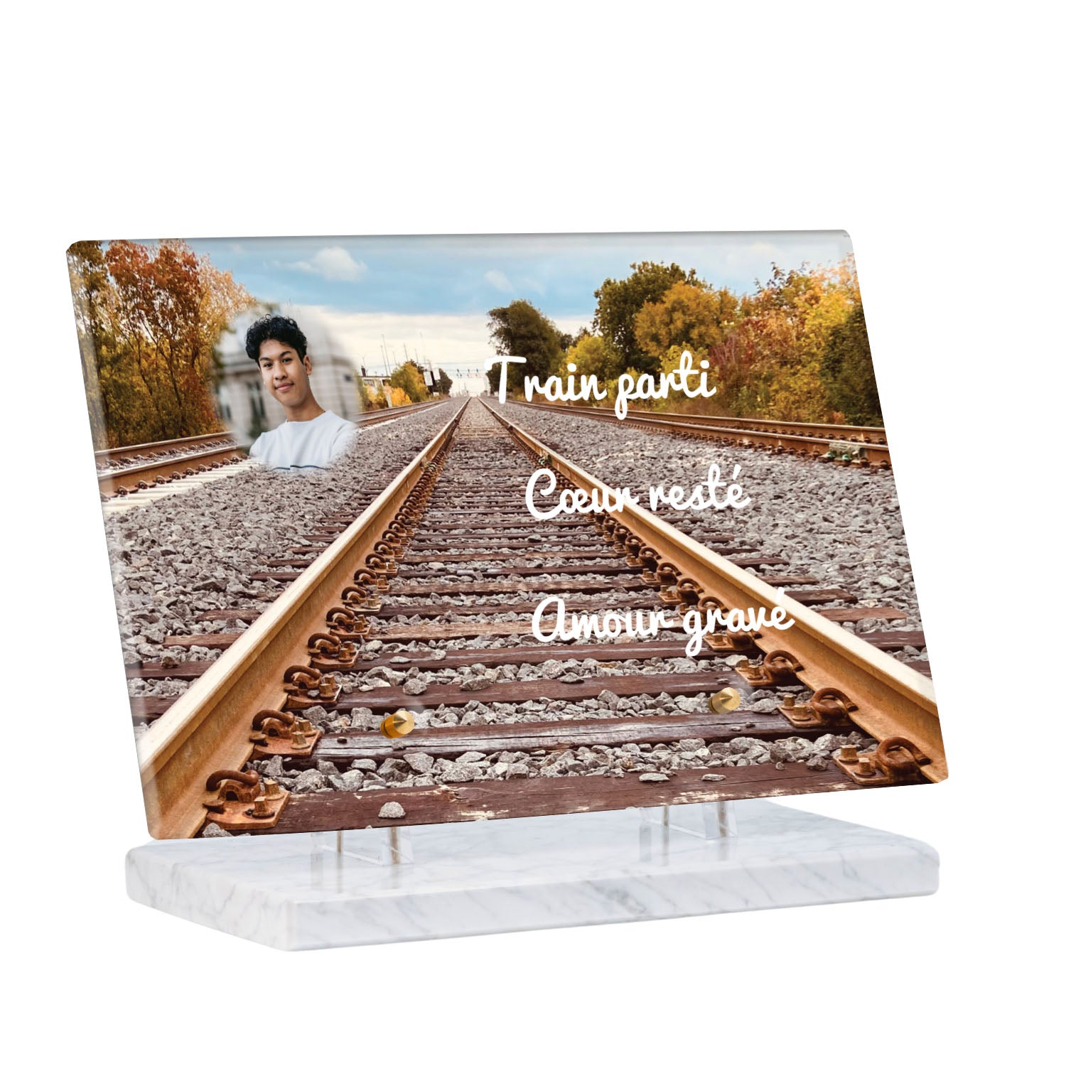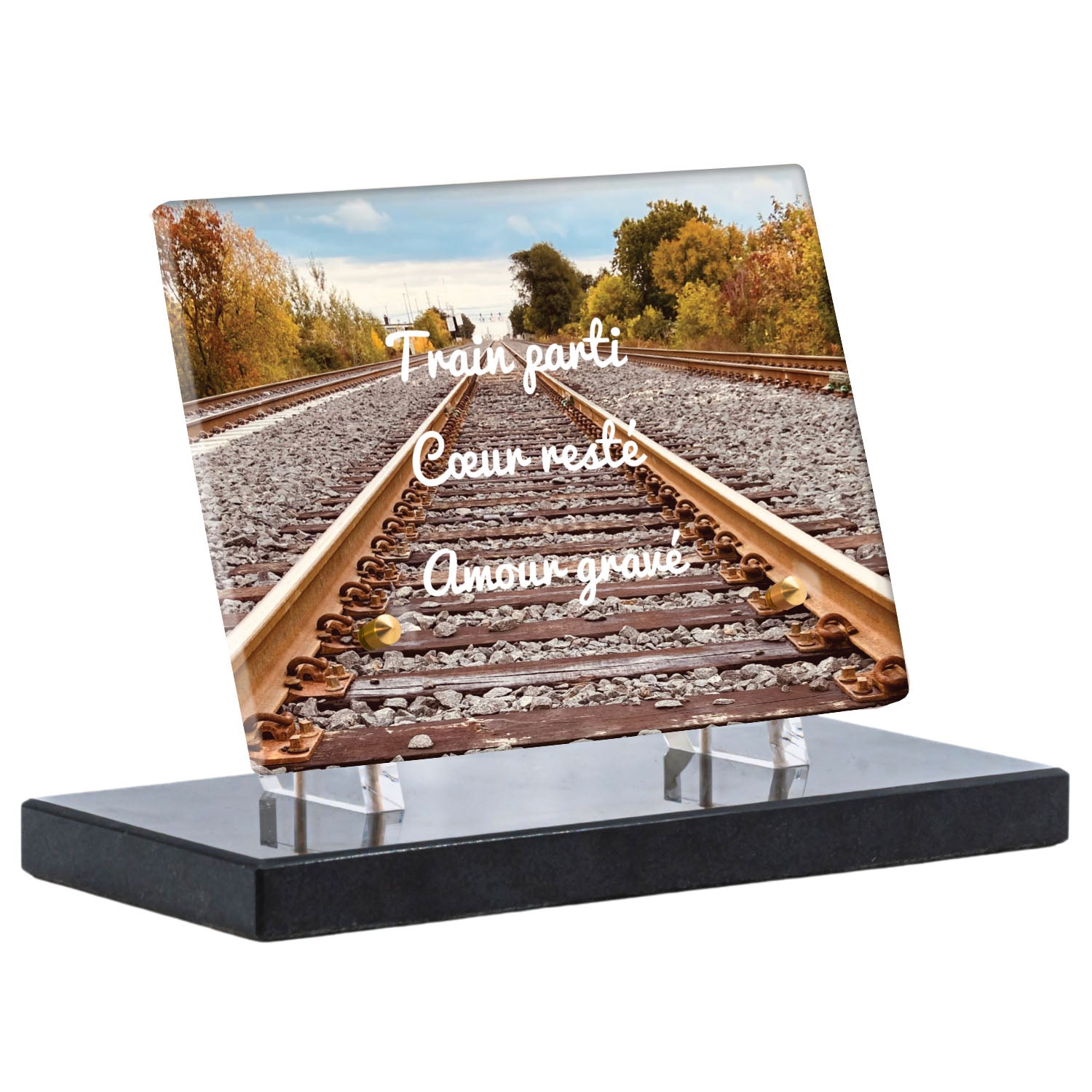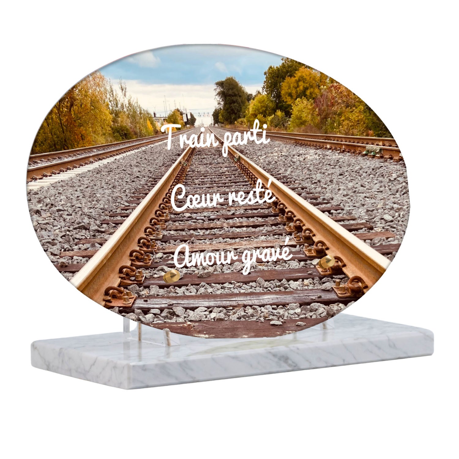 Exprimez votre hommage avec cette plaque funéraire personnalisée au motif unique d’un rail de train, symbolisant un voyage qui continue au-delà de la vie. Conçue en plexiglas moderne, cette plaque mortuaire allie esthétisme et simplicité, idéale pour une plaque funéraire moderne qui met en valeur à la fois mémoire et élégance.
