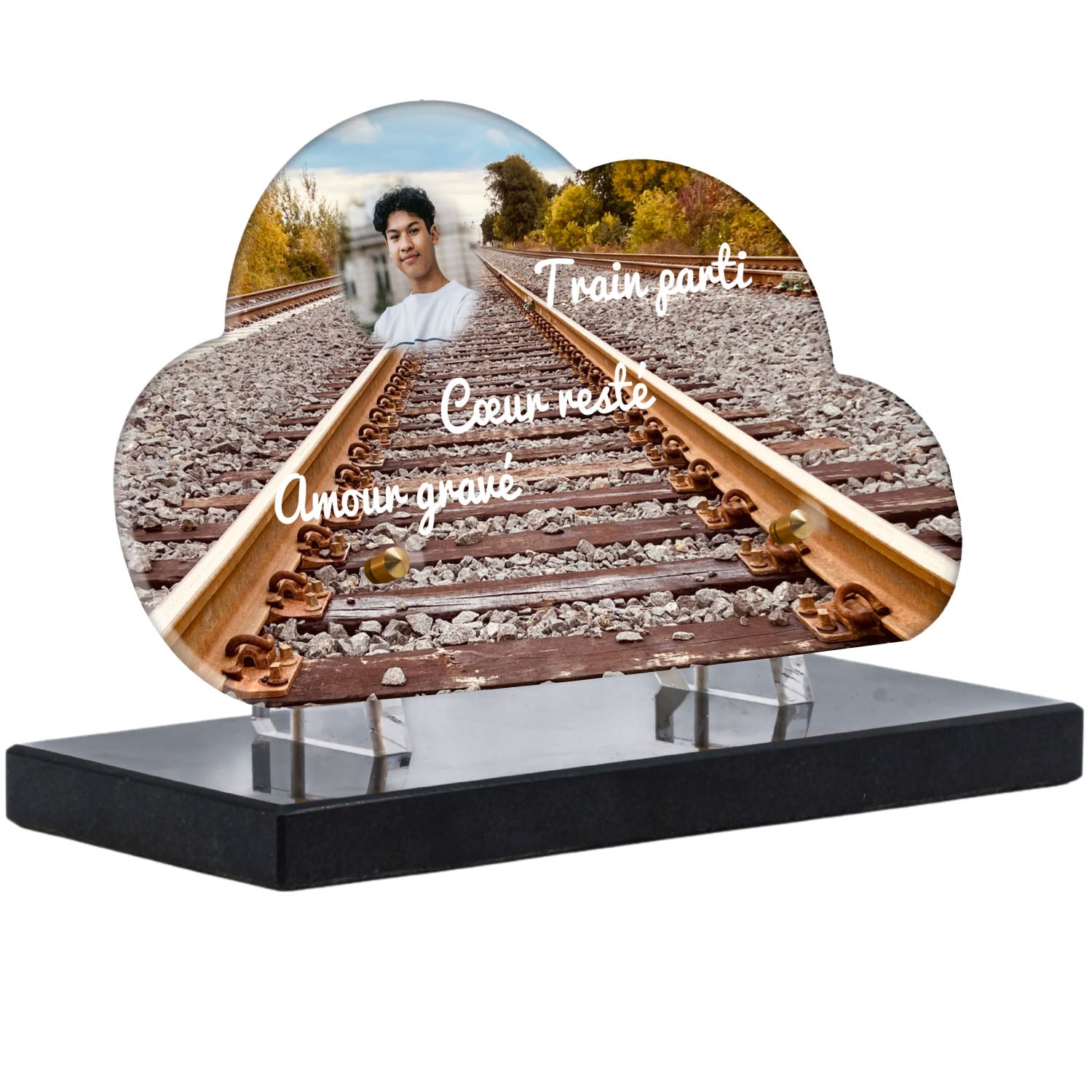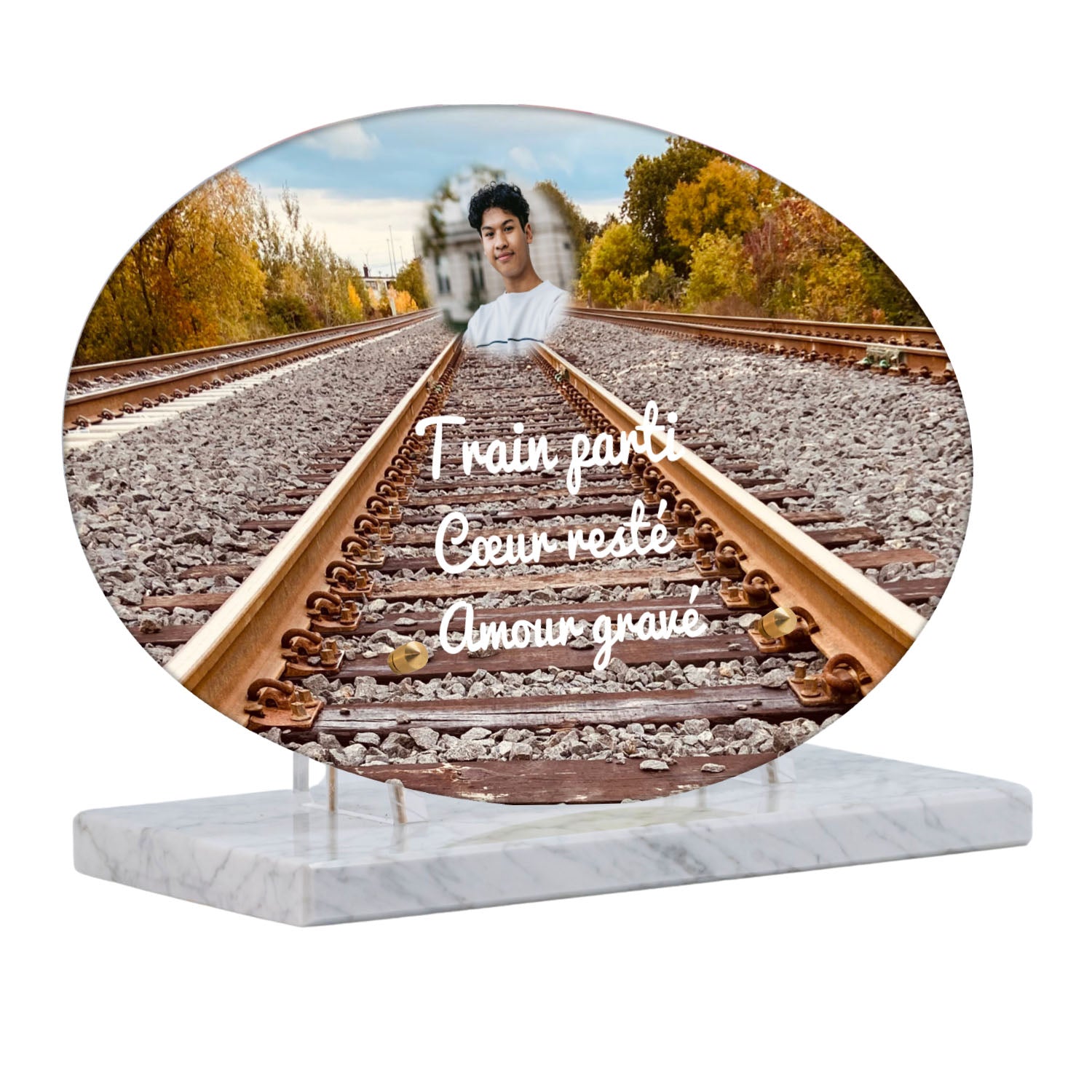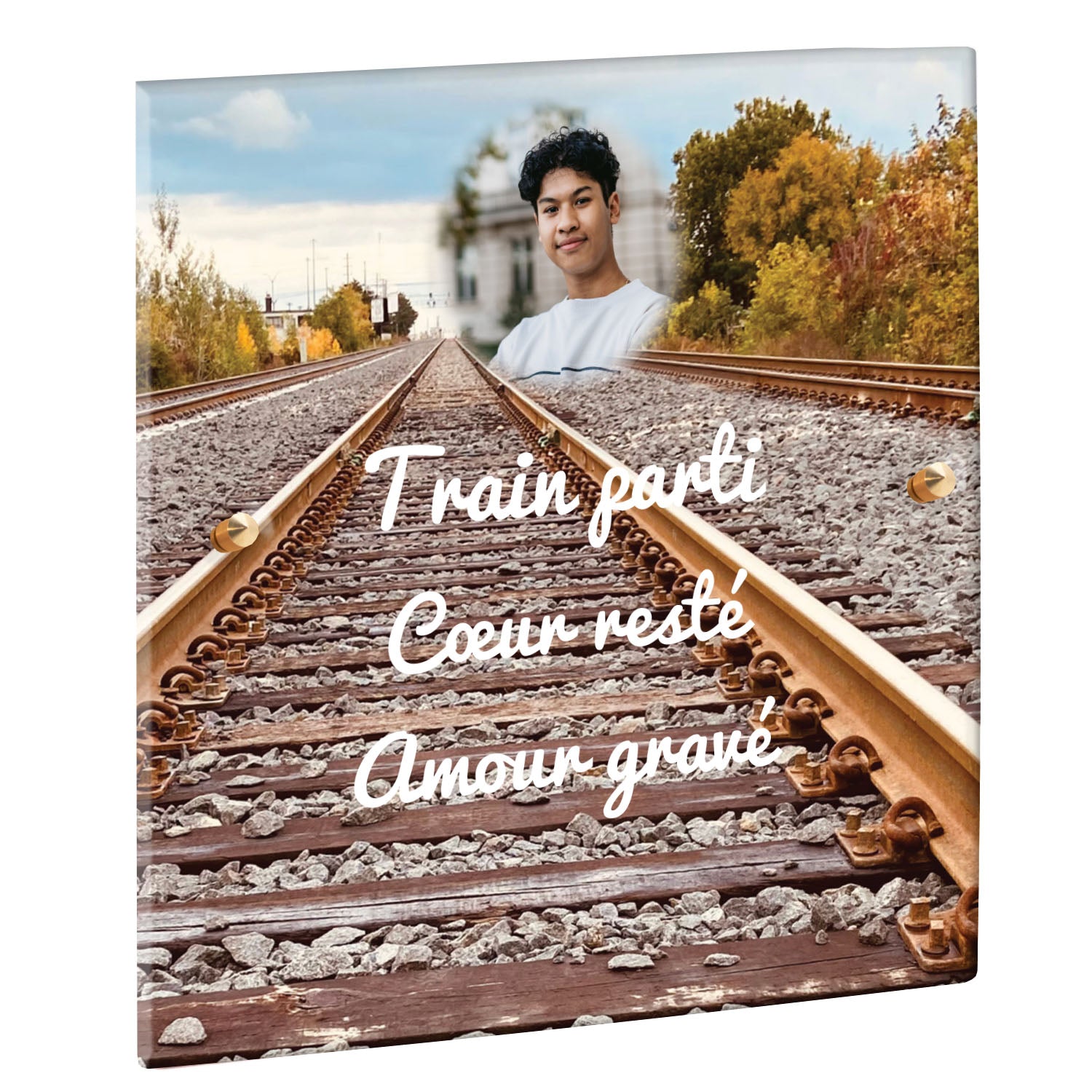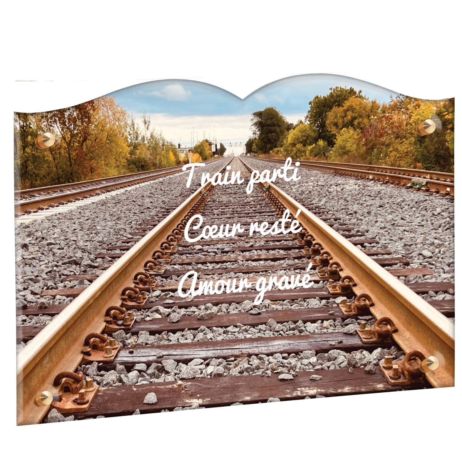 Exprimez votre hommage avec cette plaque funéraire personnalisée au motif unique d’un rail de train, symbolisant un voyage qui continue au-delà de la vie. Conçue en plexiglas moderne, cette plaque mortuaire allie esthétisme et simplicité, idéale pour une plaque funéraire moderne qui met en valeur à la fois mémoire et élégance.