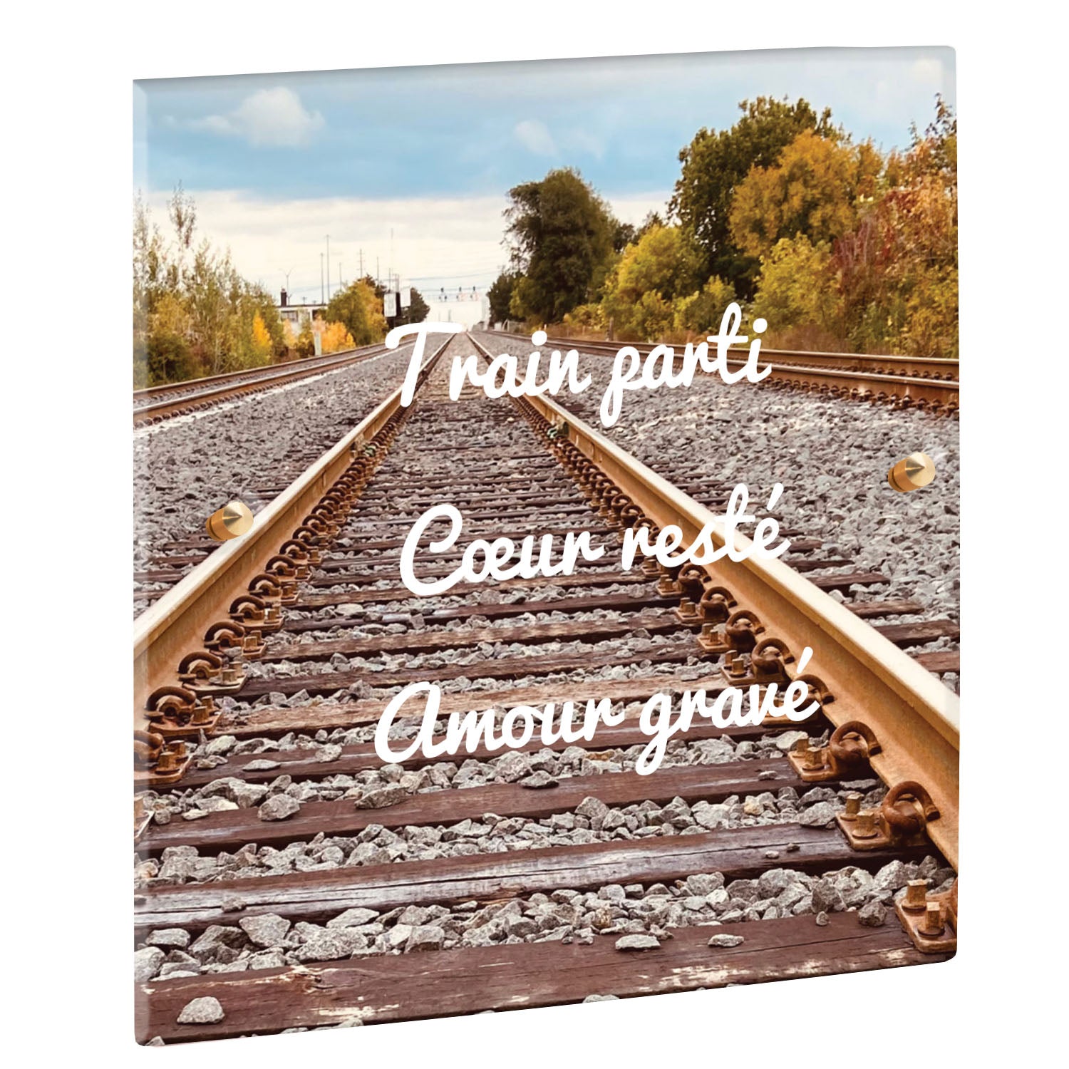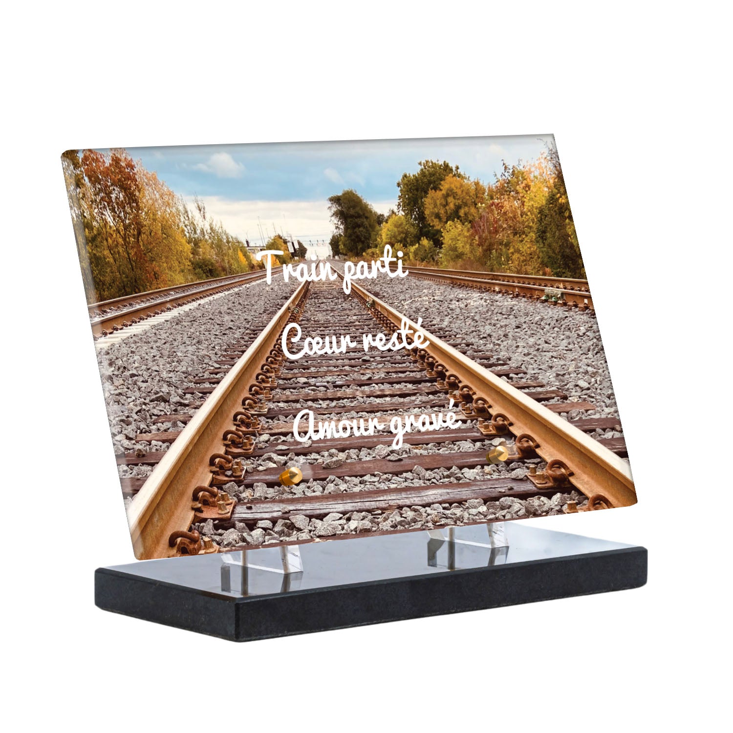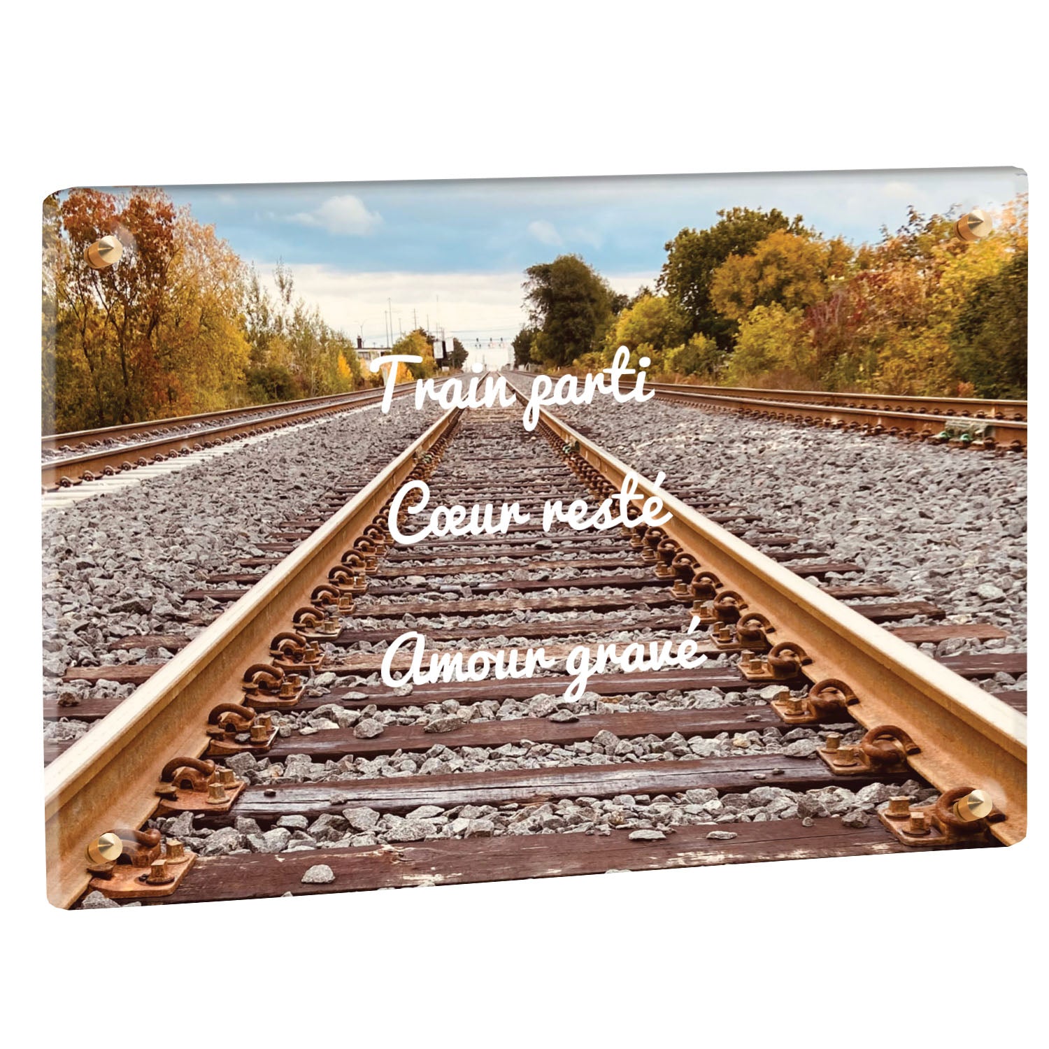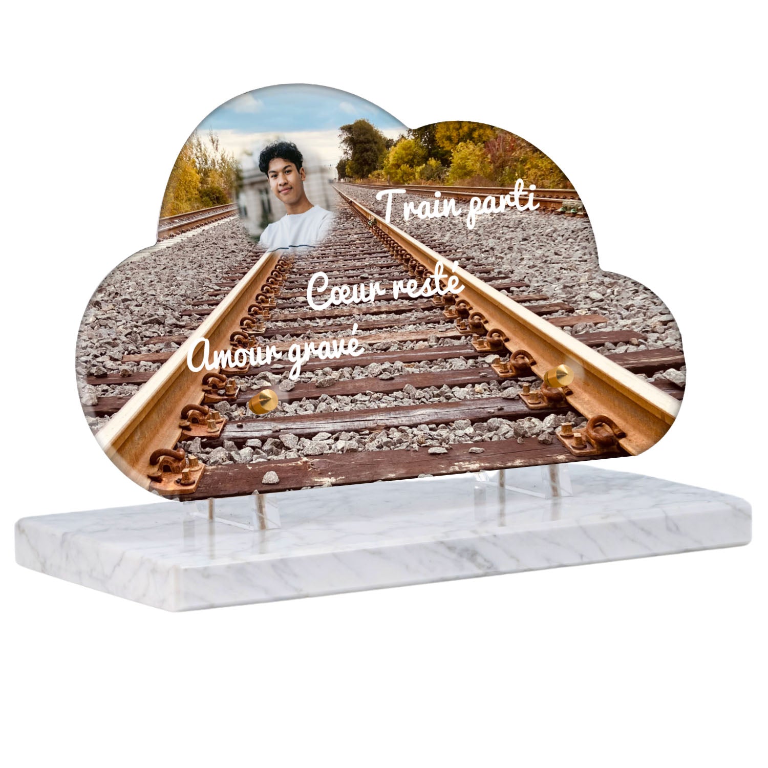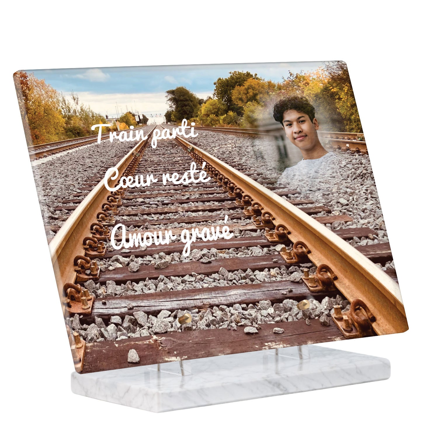 Exprimez votre hommage avec cette plaque funéraire personnalisée au motif unique d’un rail de train, symbolisant un voyage qui continue au-delà de la vie. Conçue en plexiglas moderne, cette plaque mortuaire allie esthétisme et simplicité, idéale pour une plaque funéraire moderne qui met en valeur à la fois mémoire et élégance.