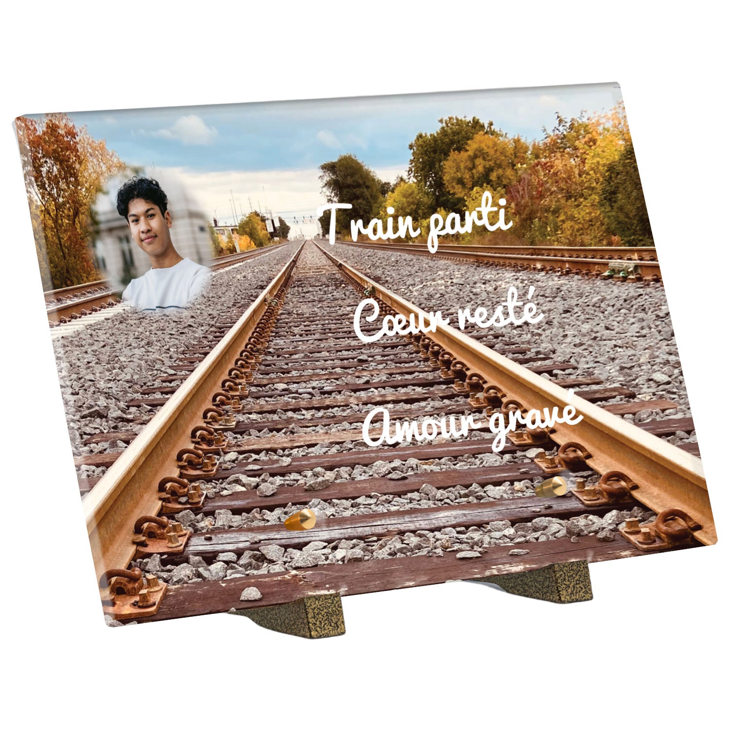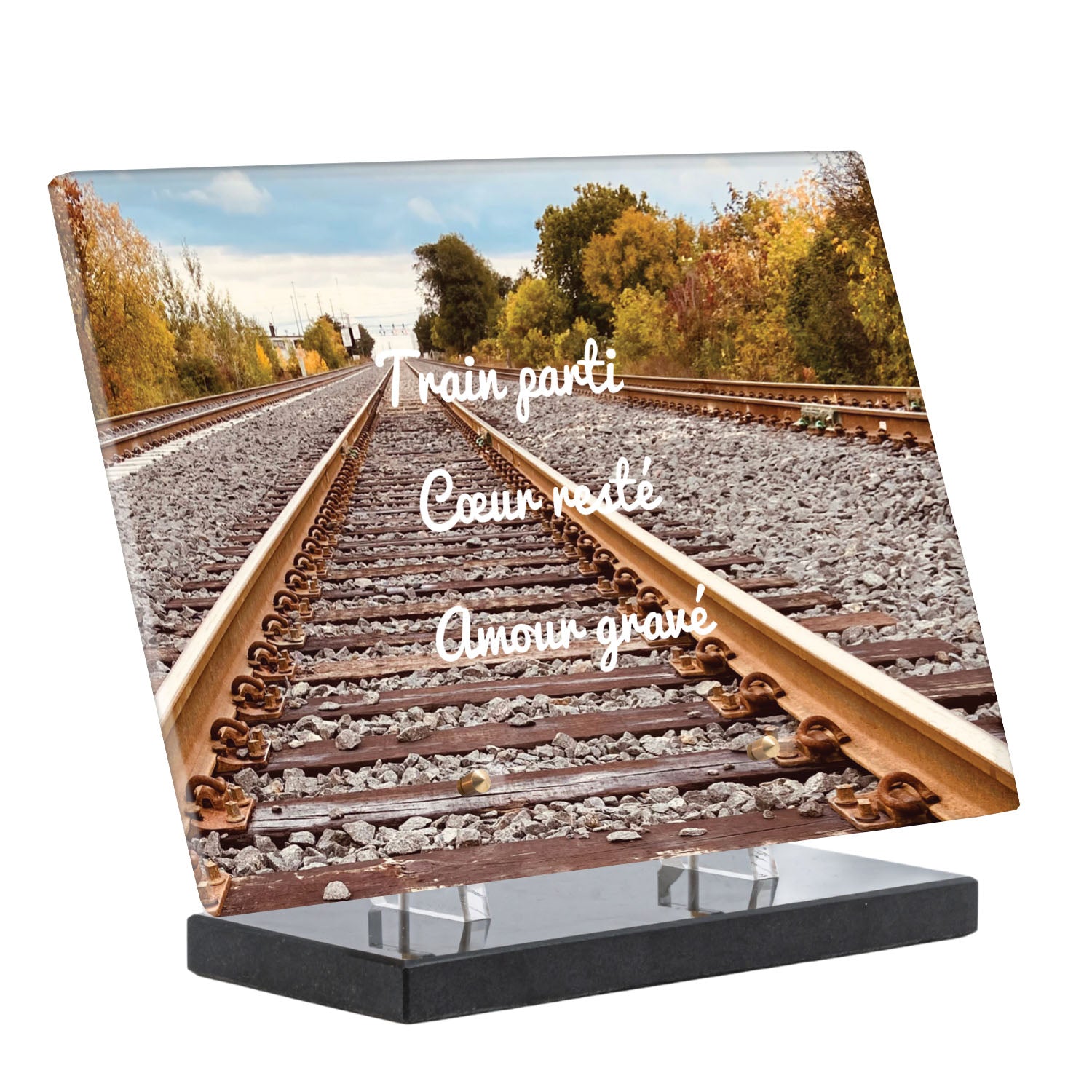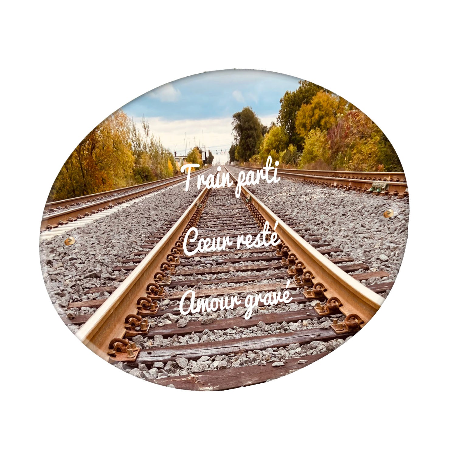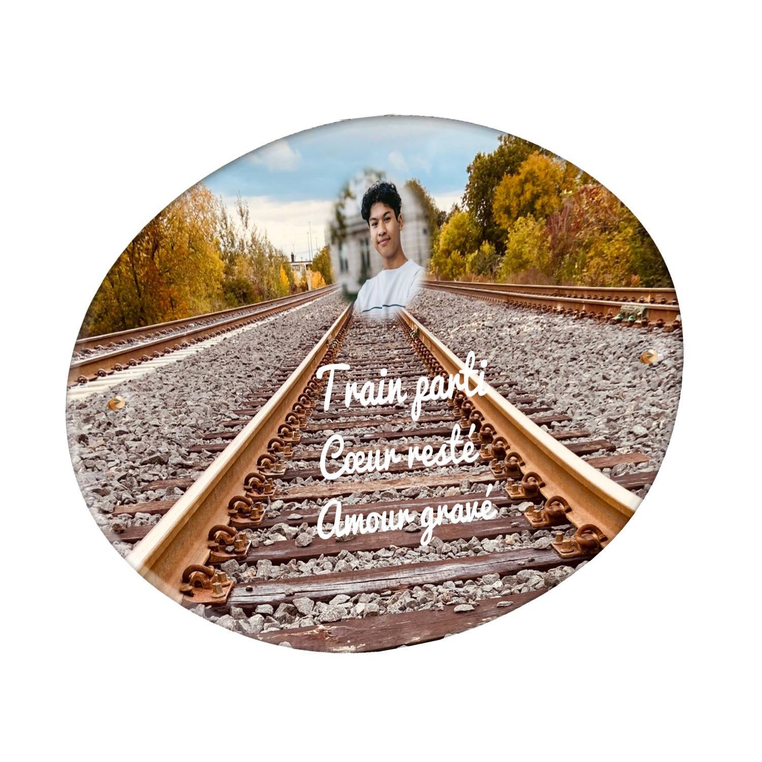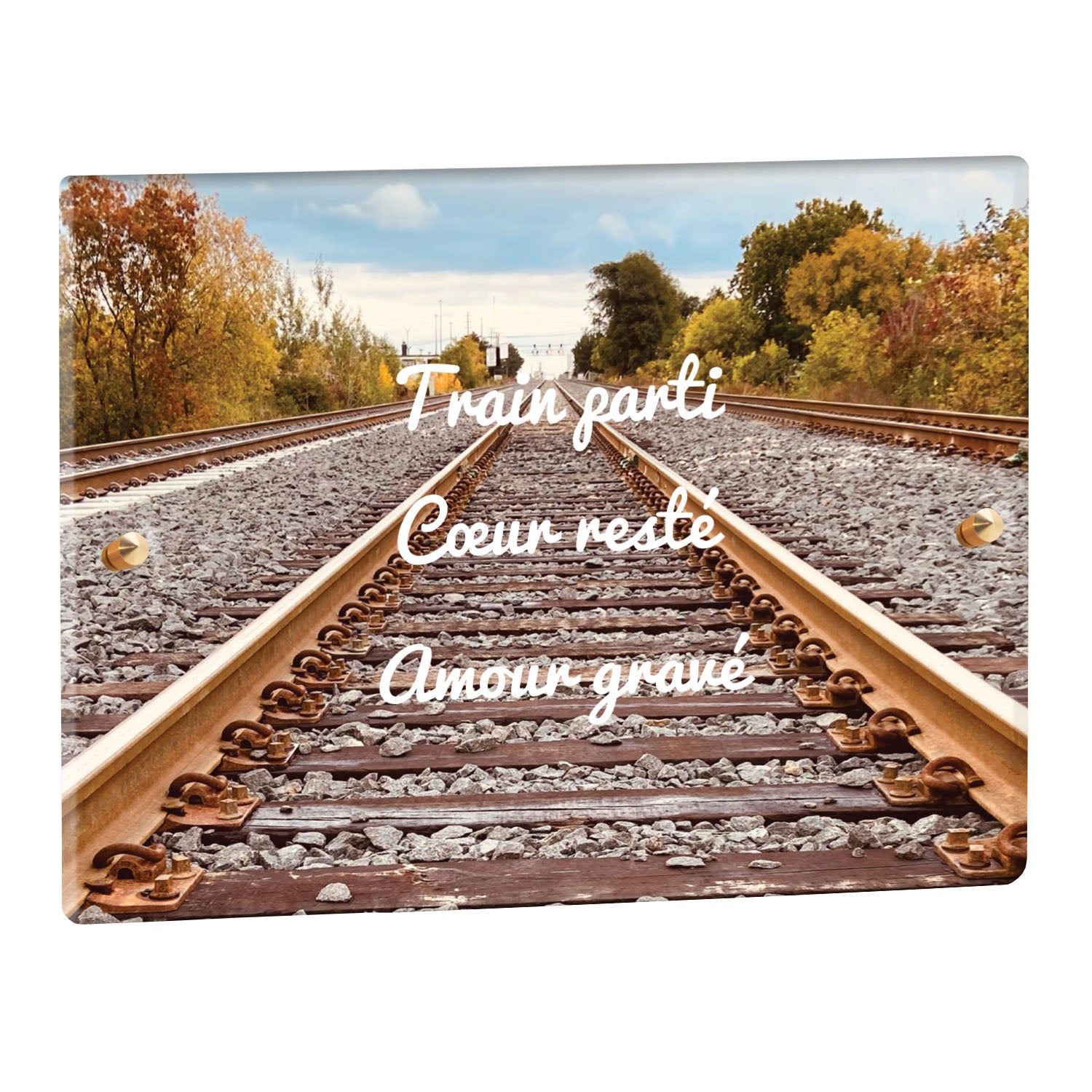 Exprimez votre hommage avec cette plaque funéraire personnalisée au motif unique d’un rail de train, symbolisant un voyage qui continue au-delà de la vie. Conçue en plexiglas moderne, cette plaque mortuaire allie esthétisme et simplicité, idéale pour une plaque funéraire moderne qui met en valeur à la fois mémoire et élégance.