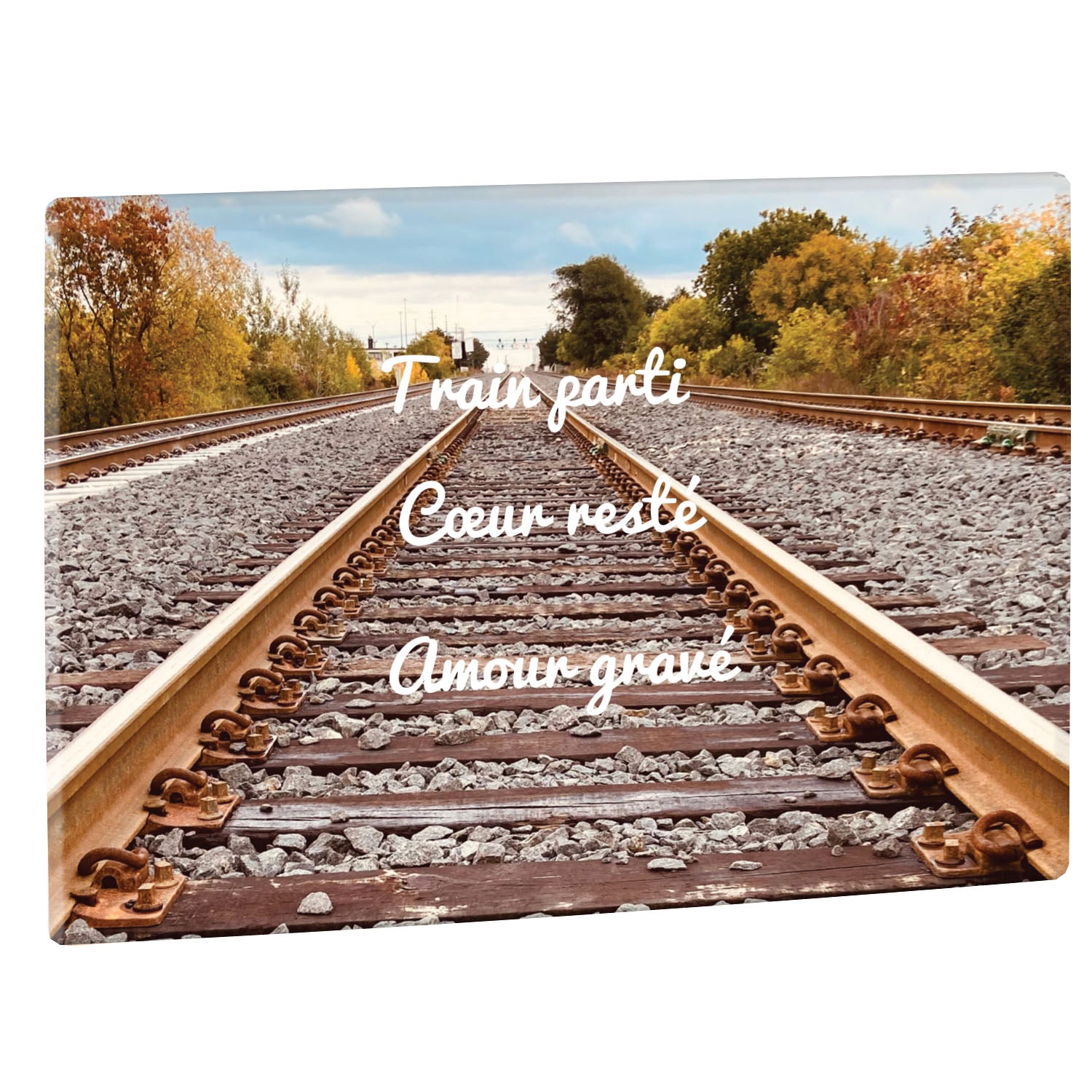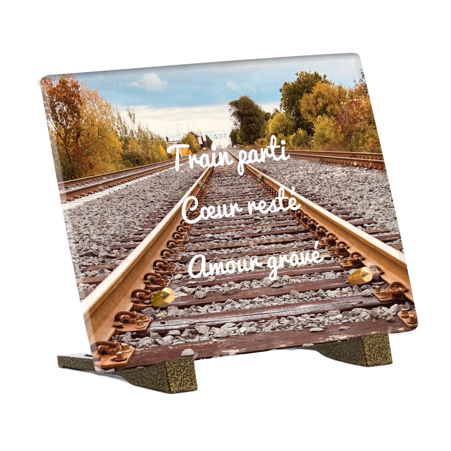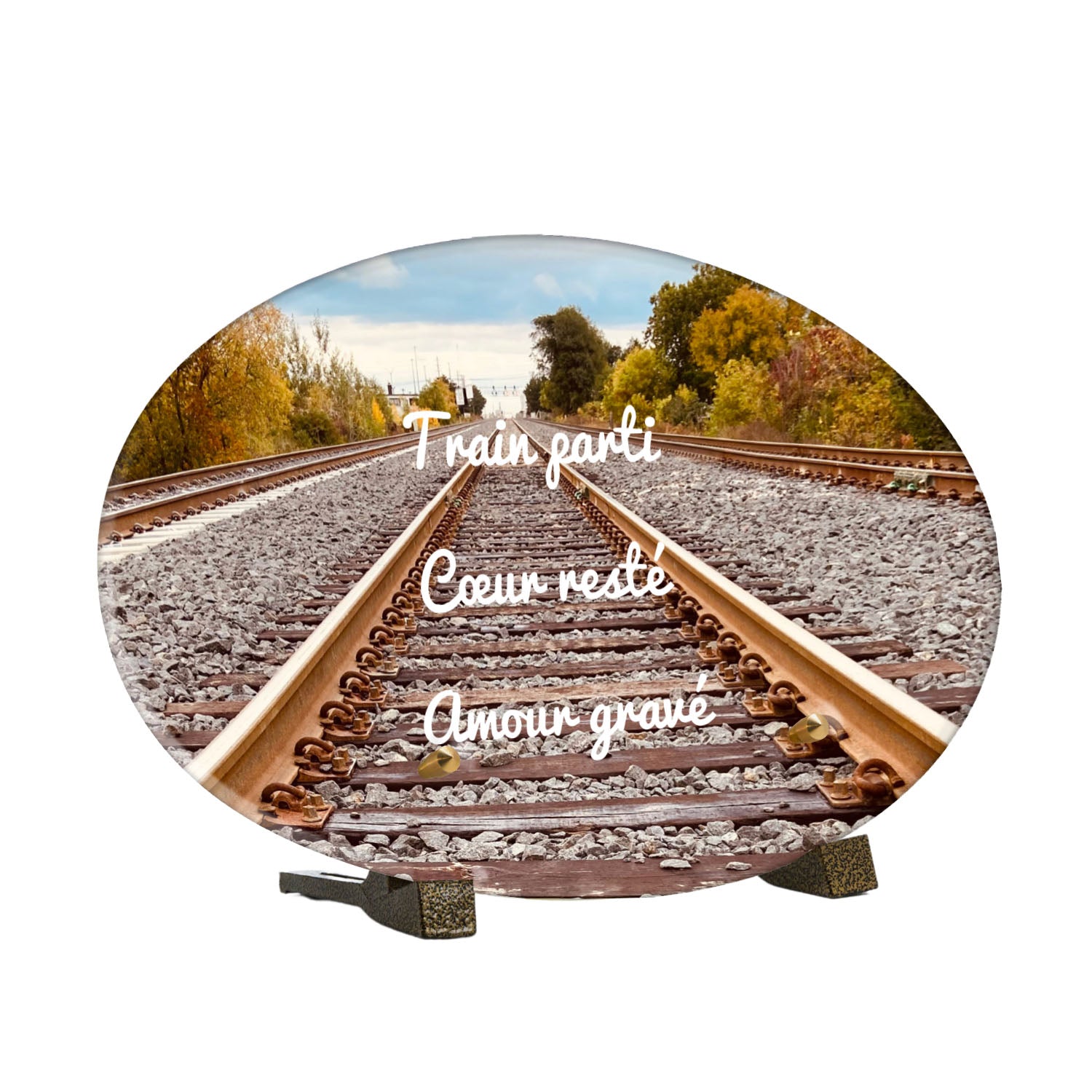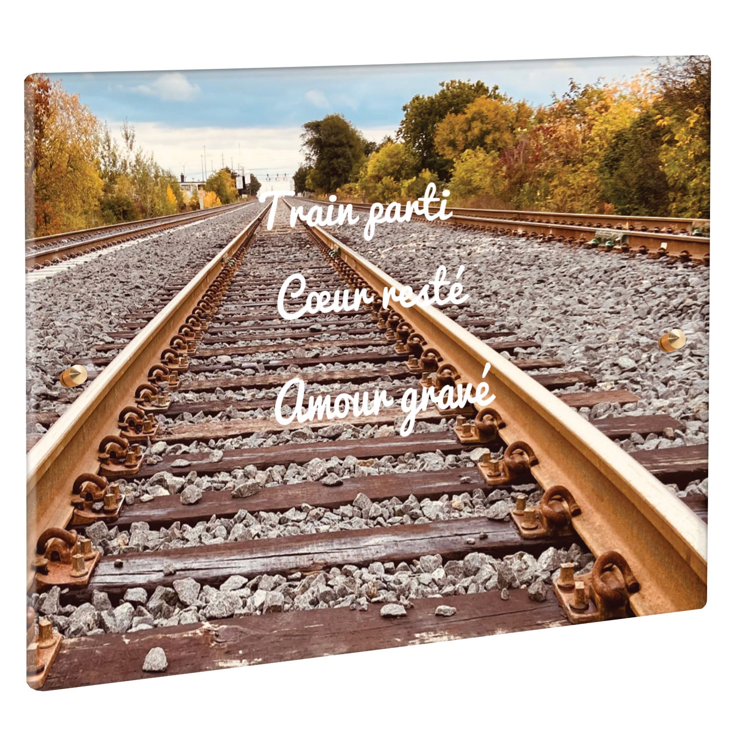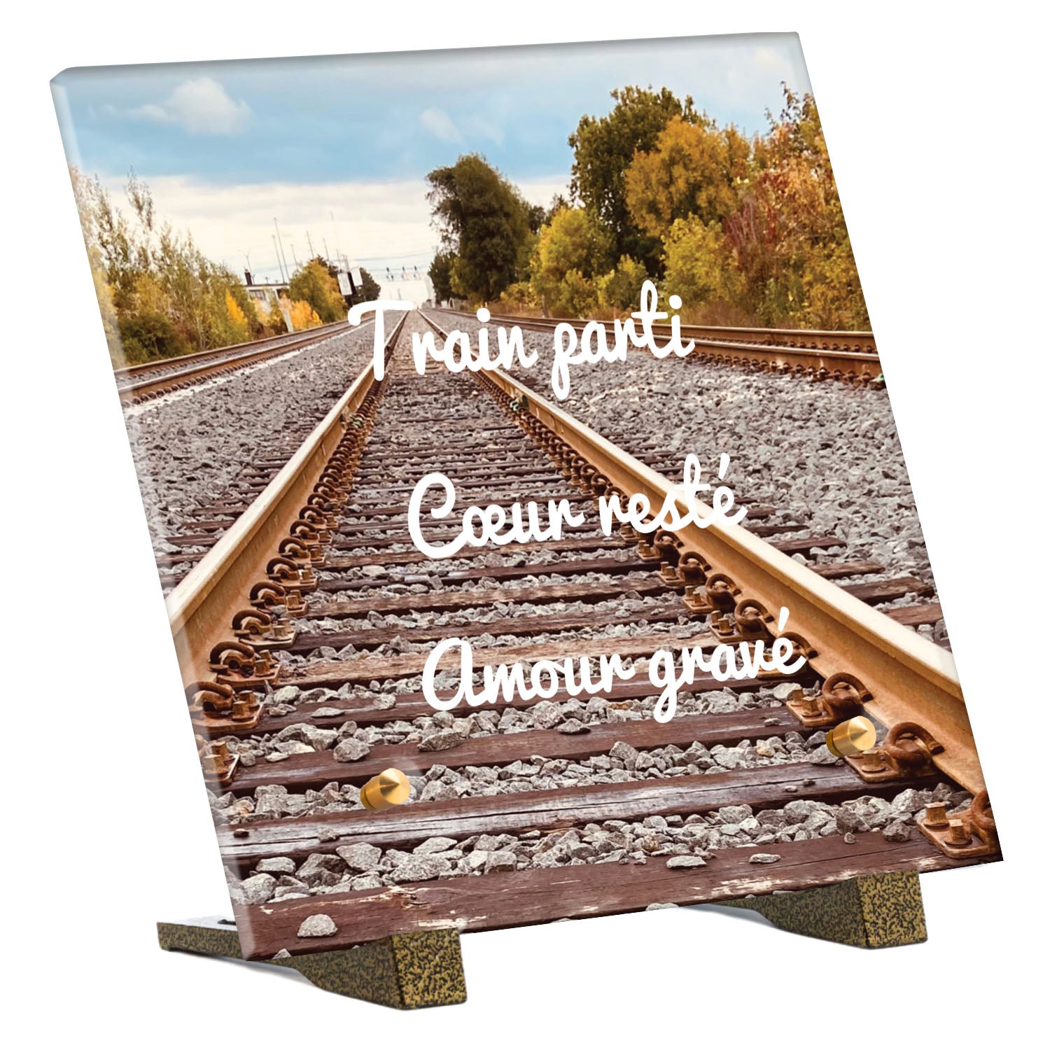 Exprimez votre hommage avec cette plaque funéraire personnalisée au motif unique d’un rail de train, symbolisant un voyage qui continue au-delà de la vie. Conçue en plexiglas moderne, cette plaque mortuaire allie esthétisme et simplicité, idéale pour une plaque funéraire moderne qui met en valeur à la fois mémoire et élégance.