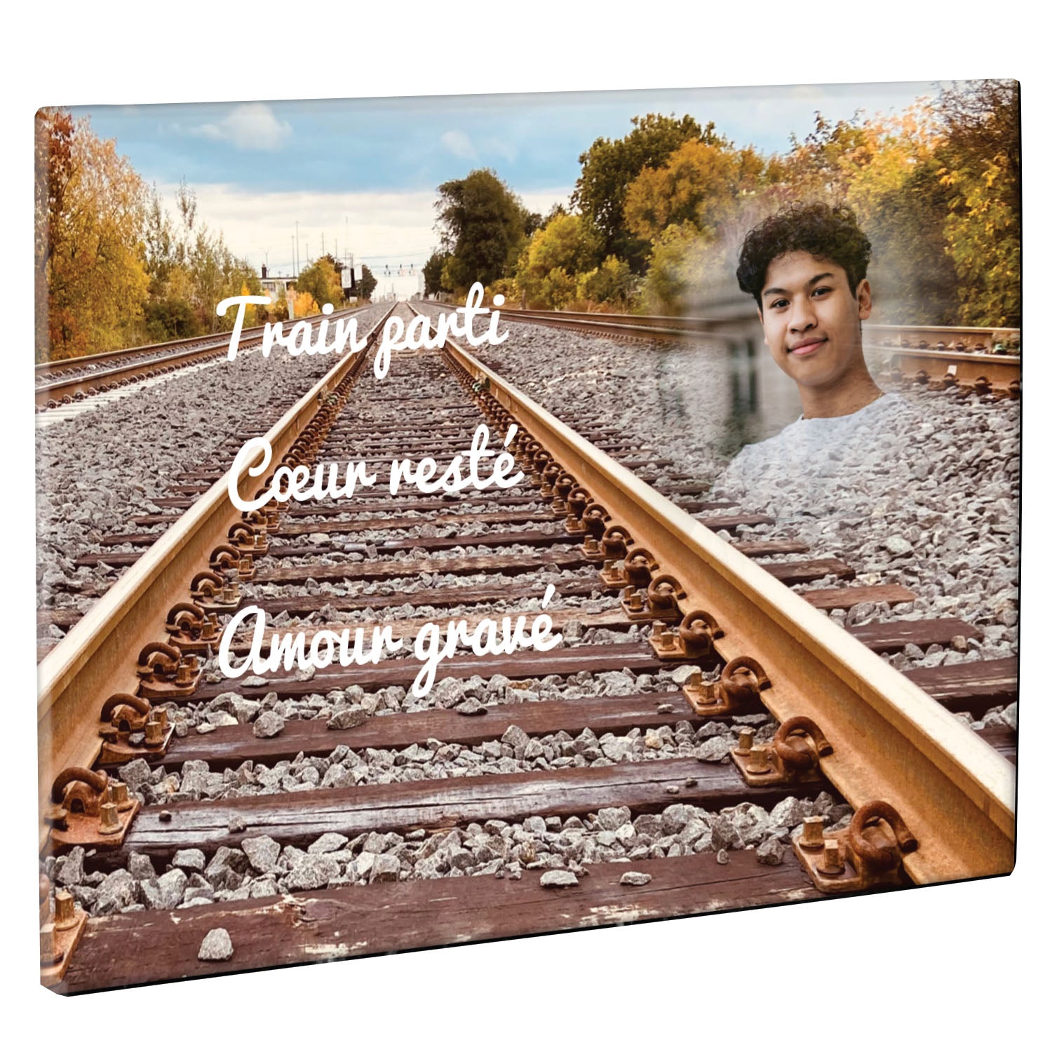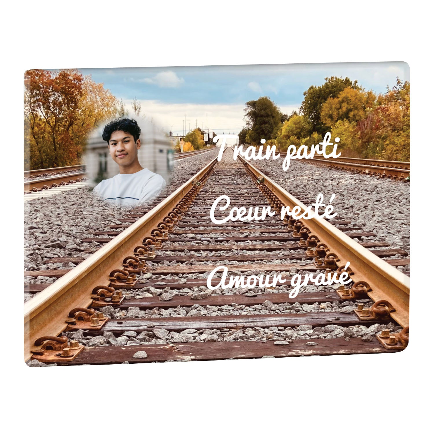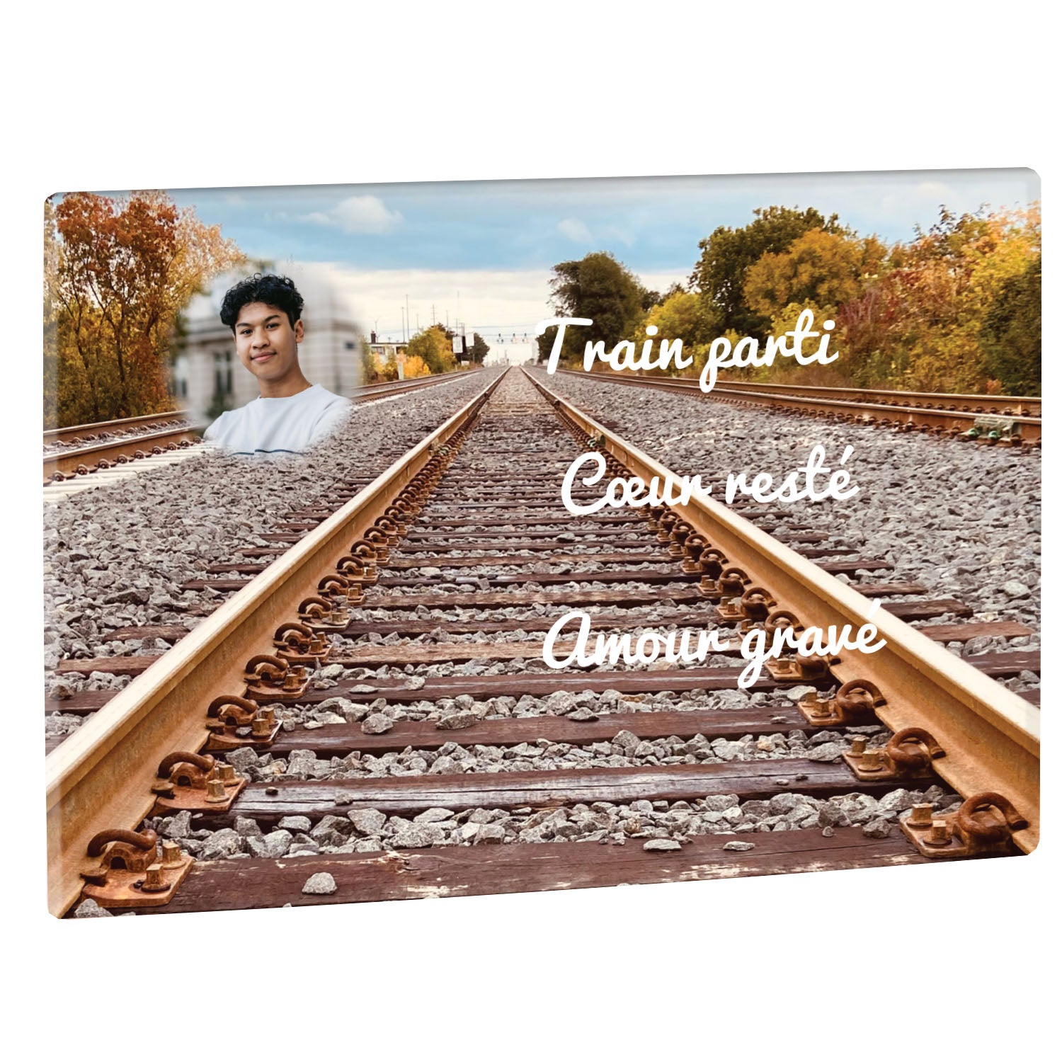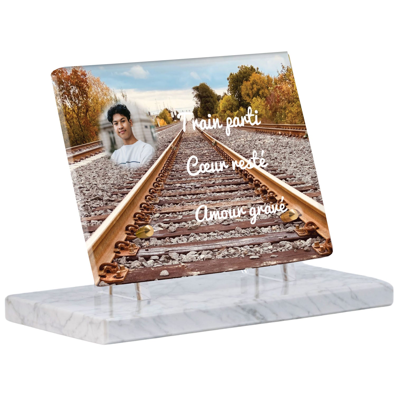 Exprimez votre hommage avec cette plaque funéraire personnalisée au motif unique d’un rail de train, symbolisant un voyage qui continue au-delà de la vie. Conçue en plexiglas moderne, cette plaque mortuaire allie esthétisme et simplicité, idéale pour une plaque funéraire moderne qui met en valeur à la fois mémoire et élégance.