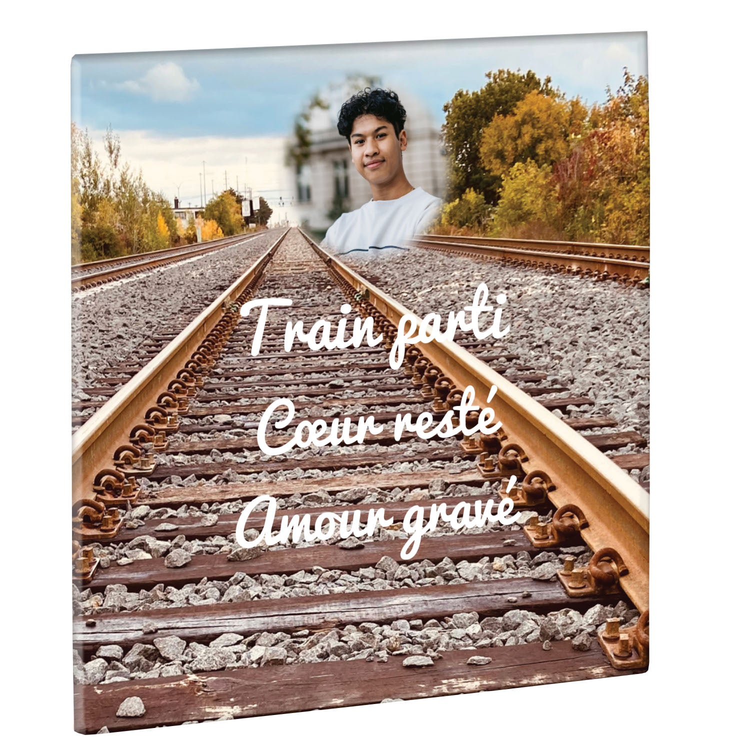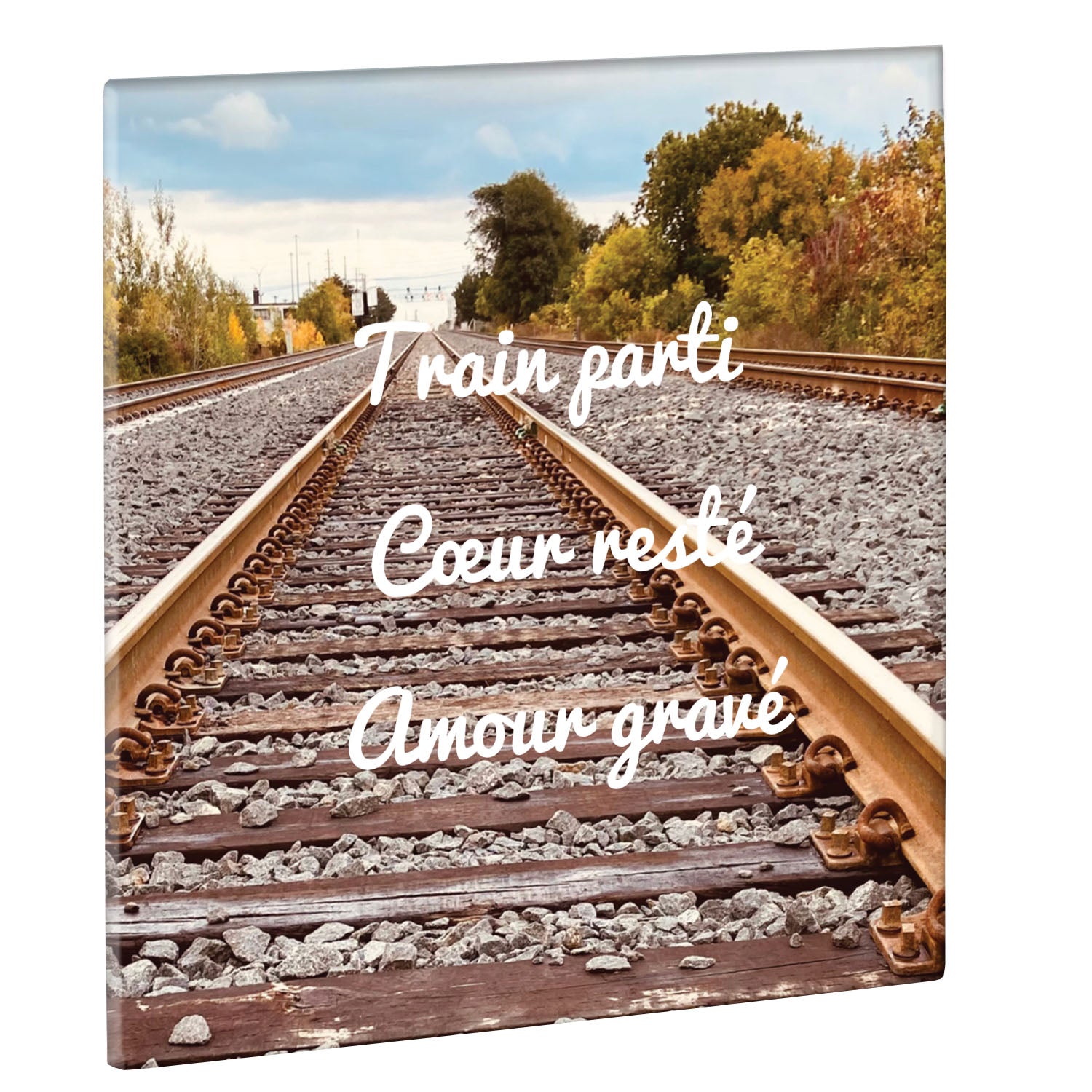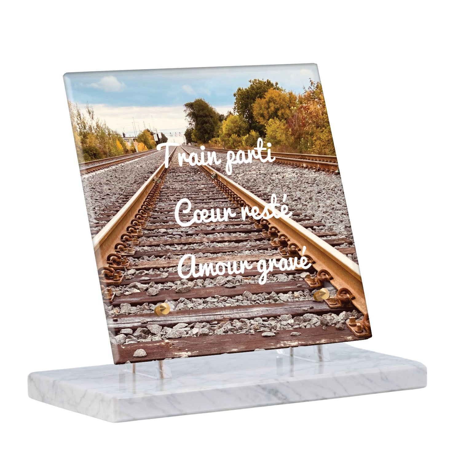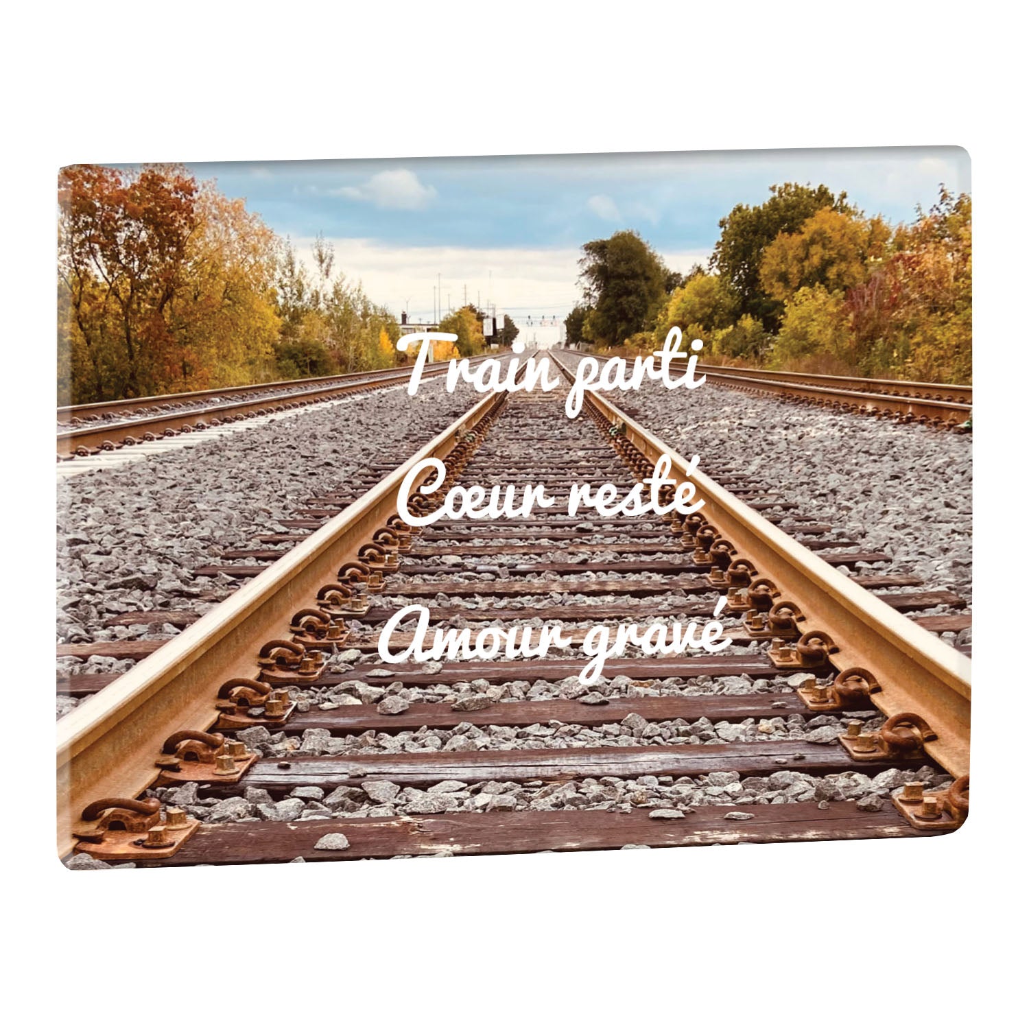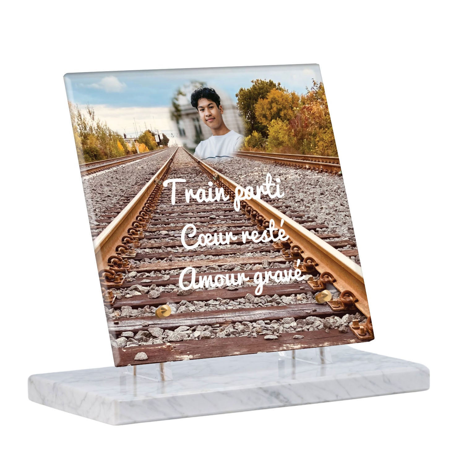 Exprimez votre hommage avec cette plaque funéraire personnalisée au motif unique d’un rail de train, symbolisant un voyage qui continue au-delà de la vie. Conçue en plexiglas moderne, cette plaque mortuaire allie esthétisme et simplicité, idéale pour une plaque funéraire moderne qui met en valeur à la fois mémoire et élégance.