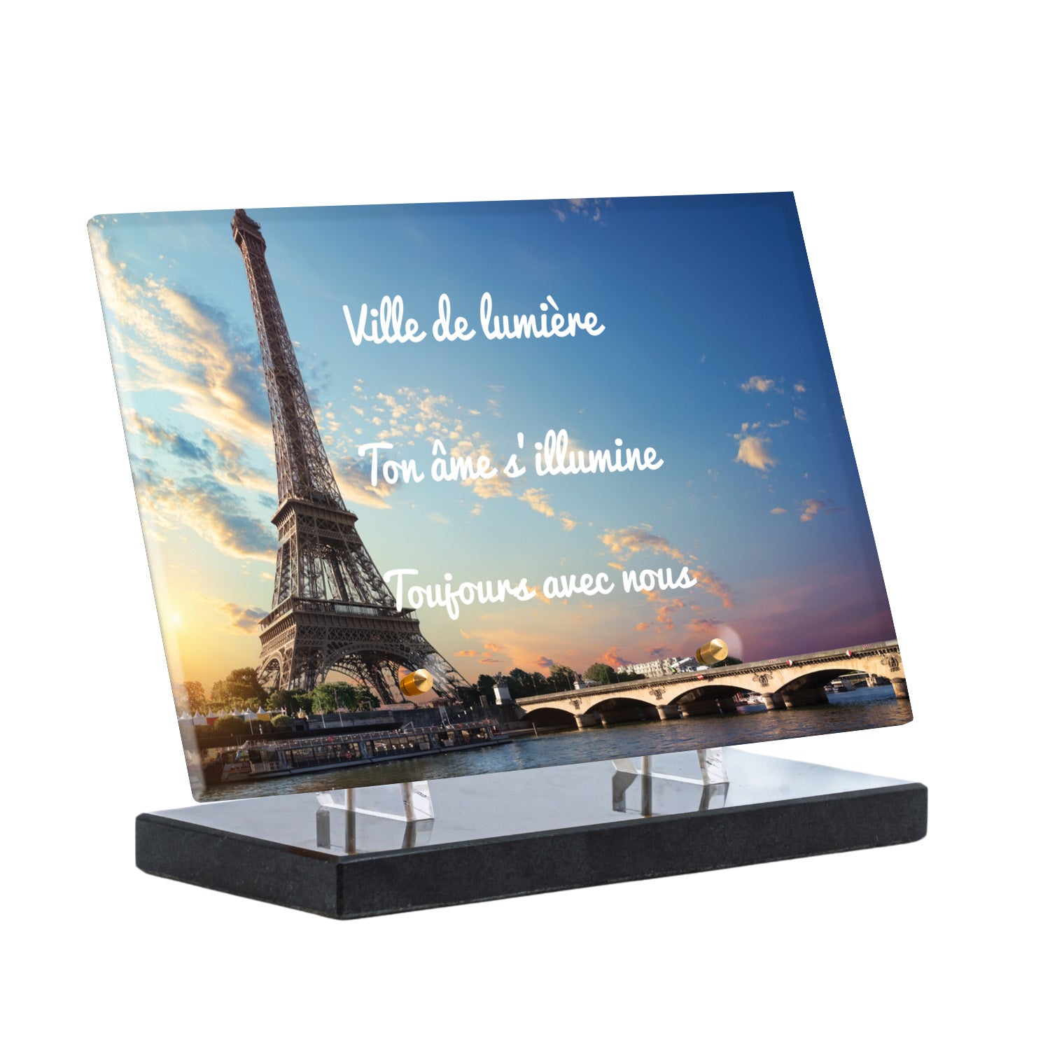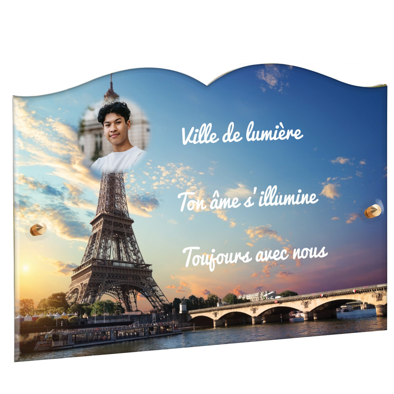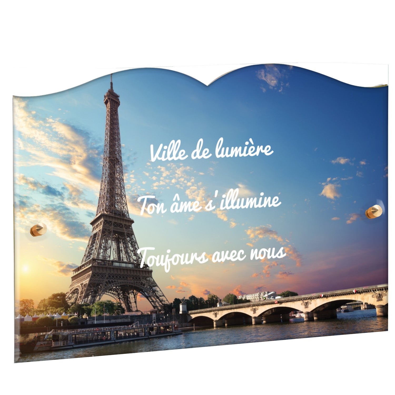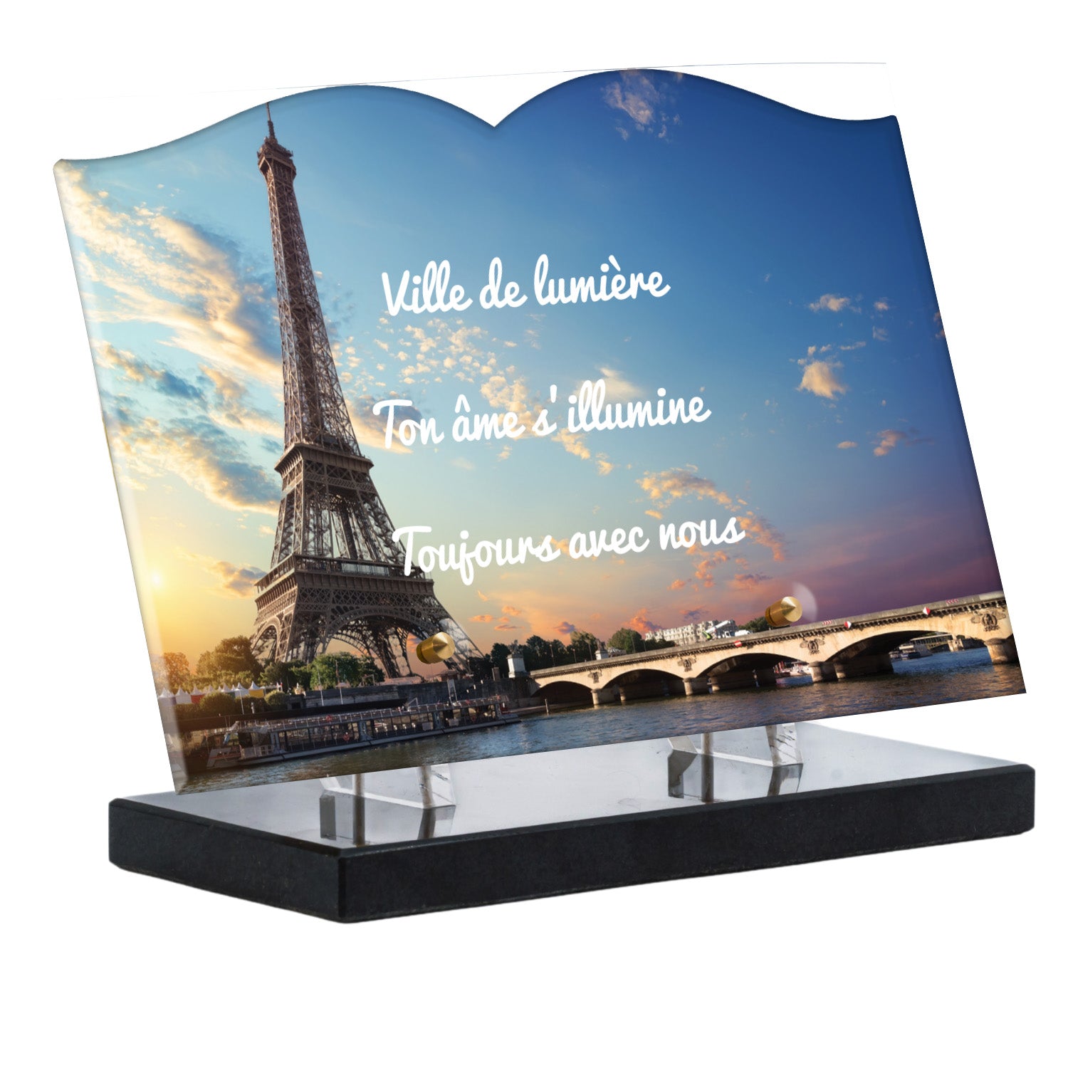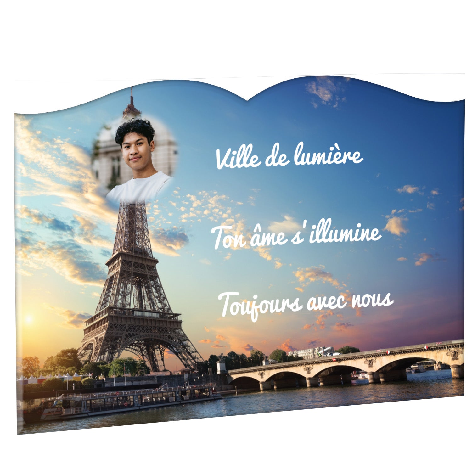 Découvrez cette plaque funéraire personnalisée illustrant délicatement la Tour Eiffel et la Seine, symbole intemporel de Paris. Conçue en plexiglas, cette plaque mortuaire allie modernité et élégance pour honorer dignement la mémoire de vos proches. Sa finition soignée en fait une plaque funéraire moderne, adaptée à tous types de mémoriaux.