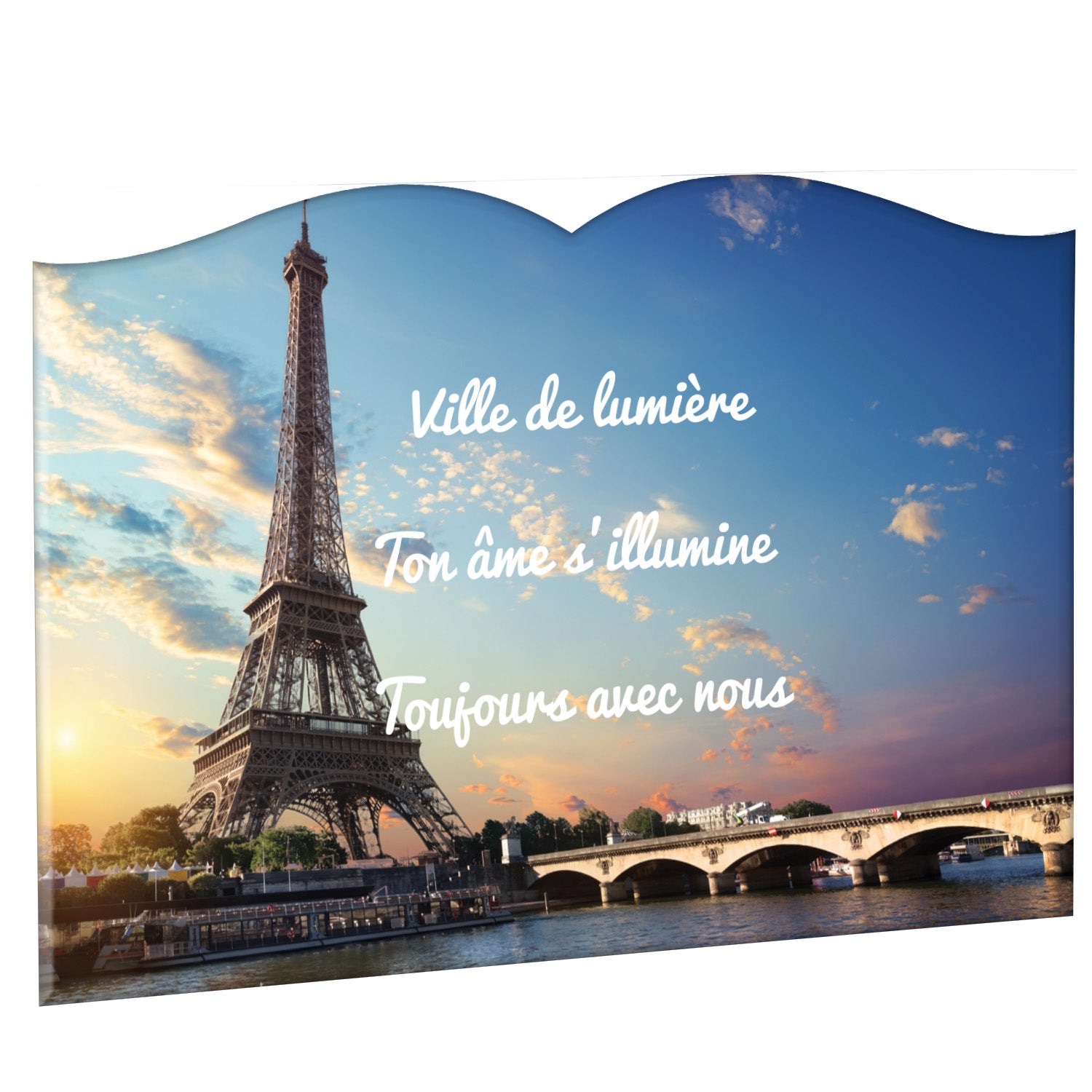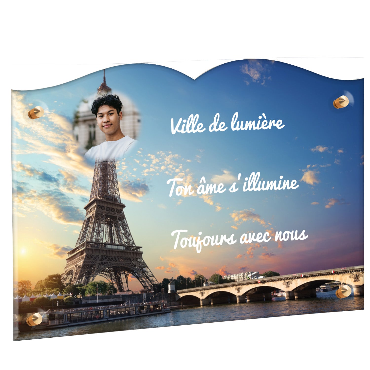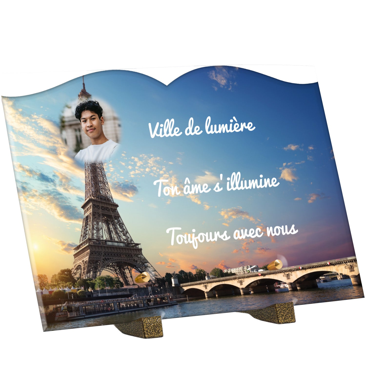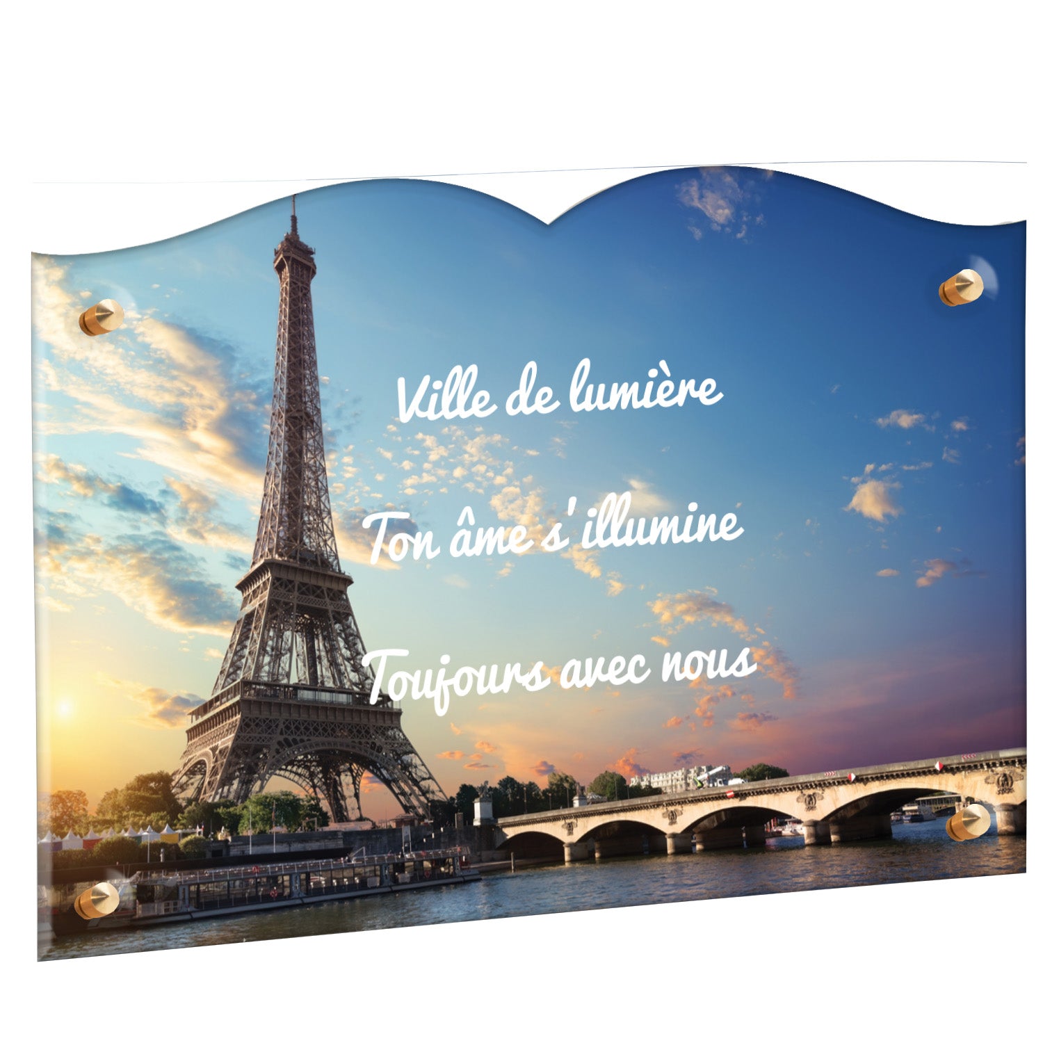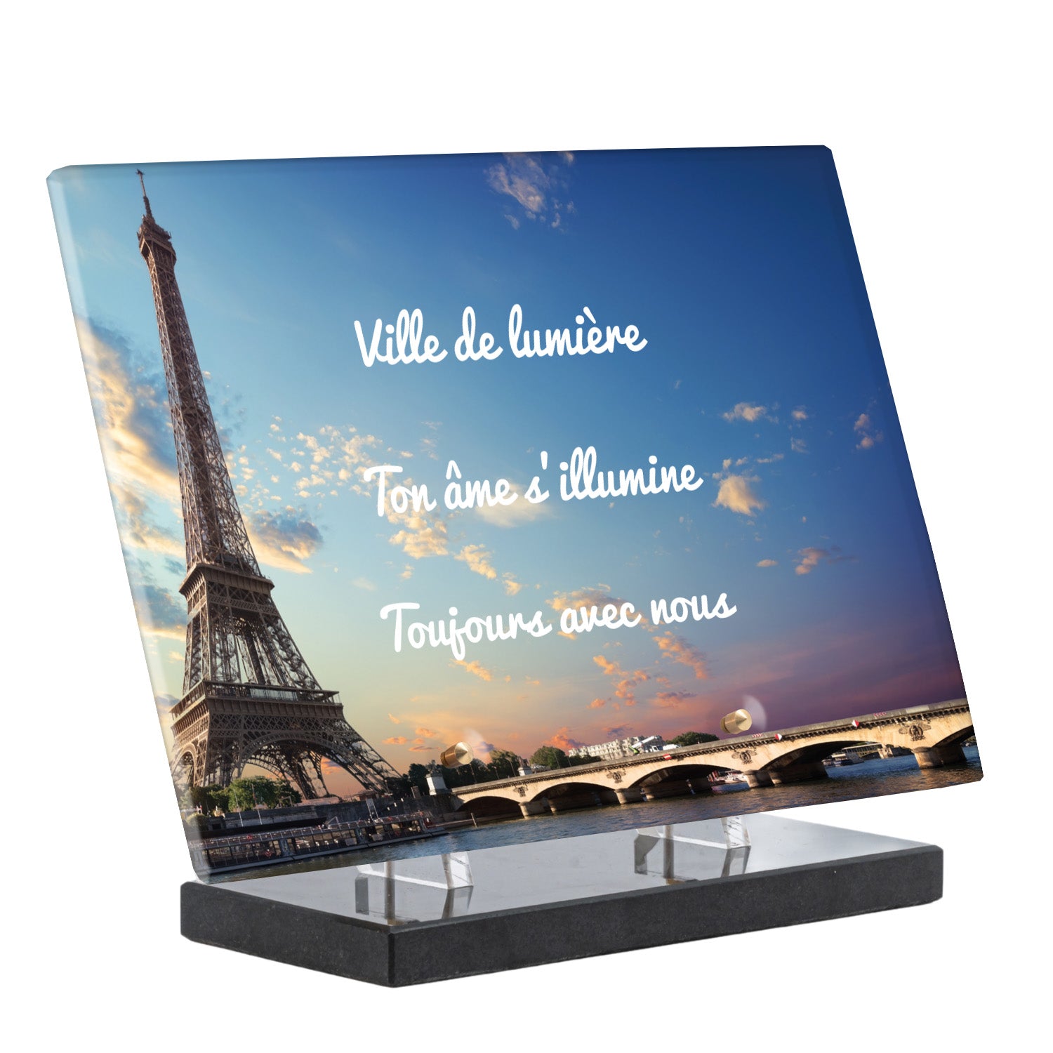 Découvrez cette plaque funéraire personnalisée illustrant délicatement la Tour Eiffel et la Seine, symbole intemporel de Paris. Conçue en plexiglas, cette plaque mortuaire allie modernité et élégance pour honorer dignement la mémoire de vos proches. Sa finition soignée en fait une plaque funéraire moderne, adaptée à tous types de mémoriaux.