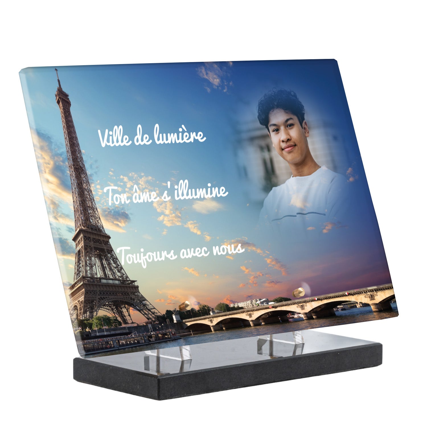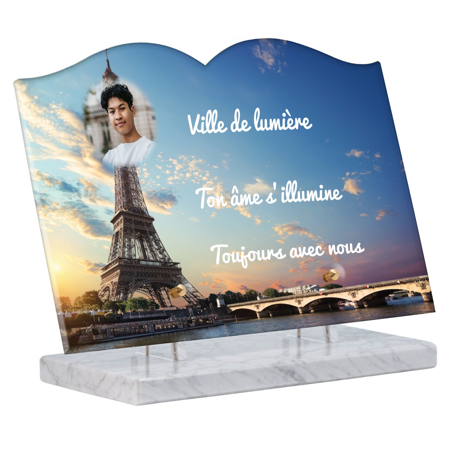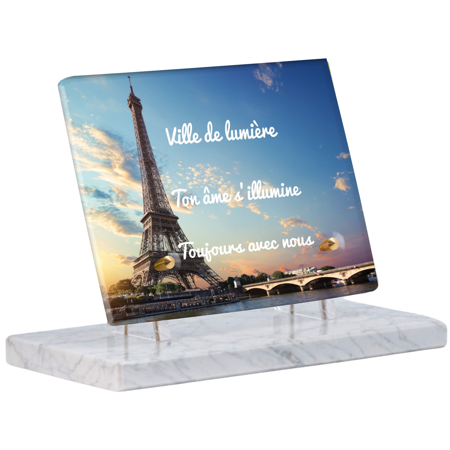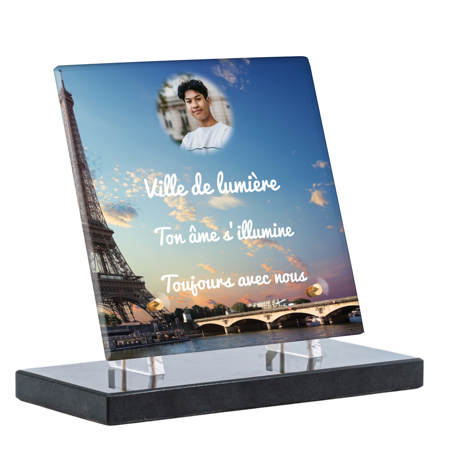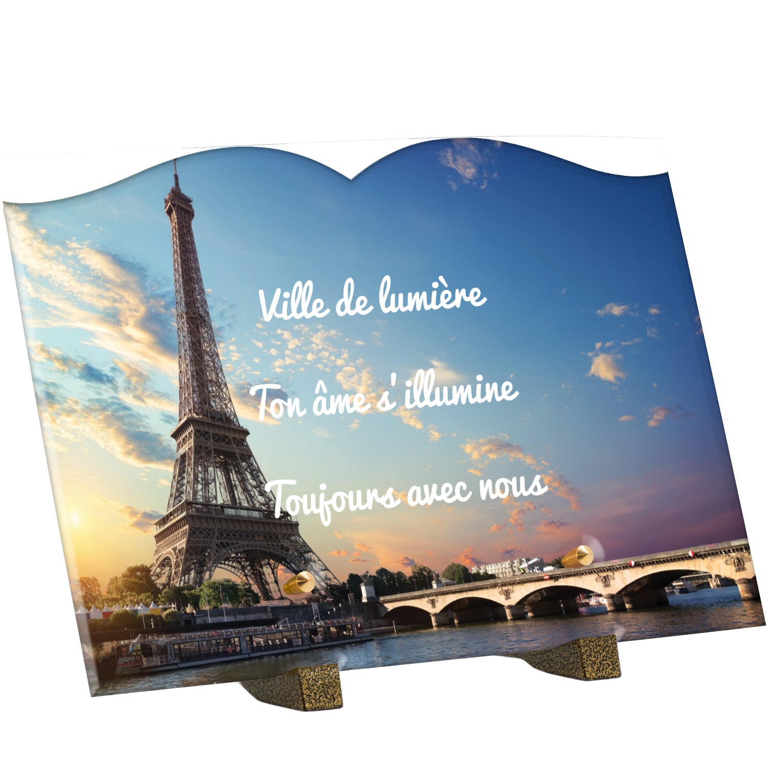 Découvrez cette plaque funéraire personnalisée illustrant délicatement la Tour Eiffel et la Seine, symbole intemporel de Paris. Conçue en plexiglas, cette plaque mortuaire allie modernité et élégance pour honorer dignement la mémoire de vos proches. Sa finition soignée en fait une plaque funéraire moderne, adaptée à tous types de mémoriaux.