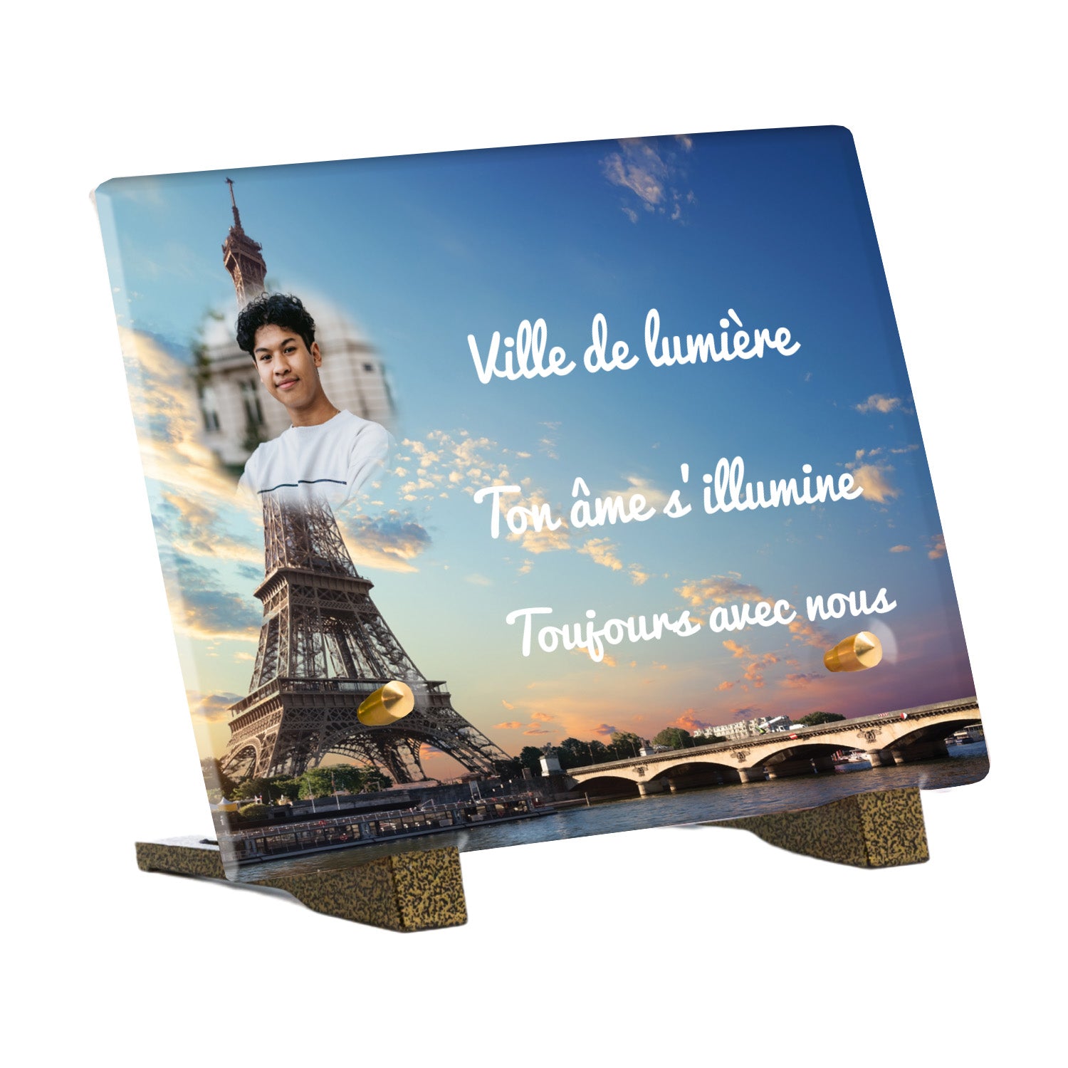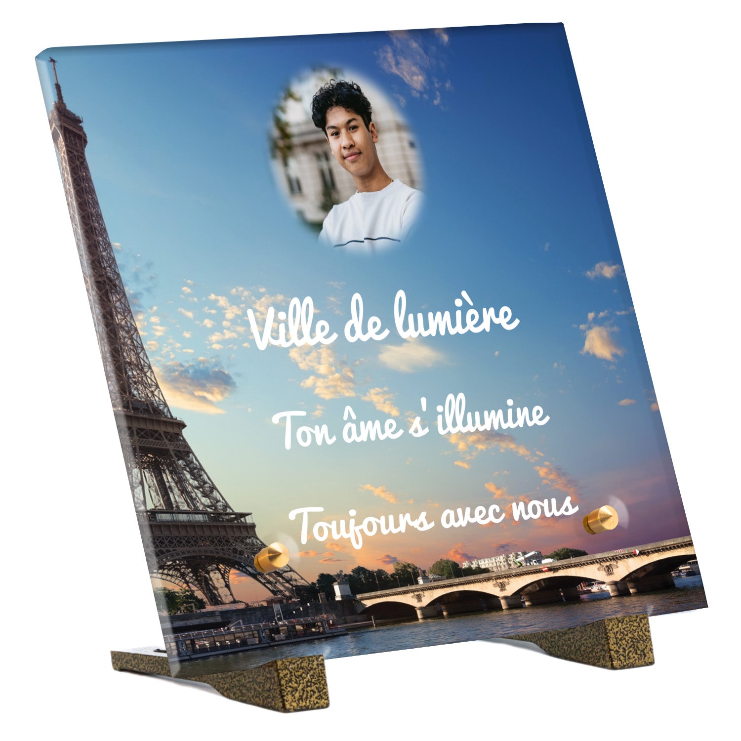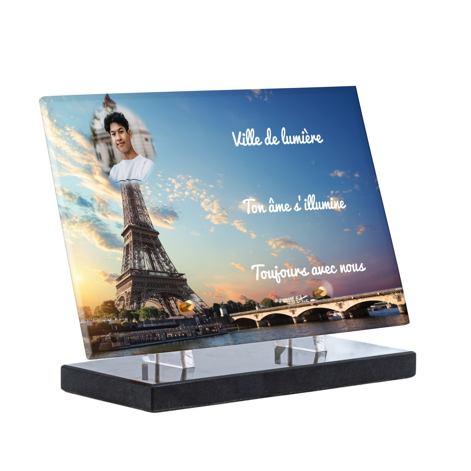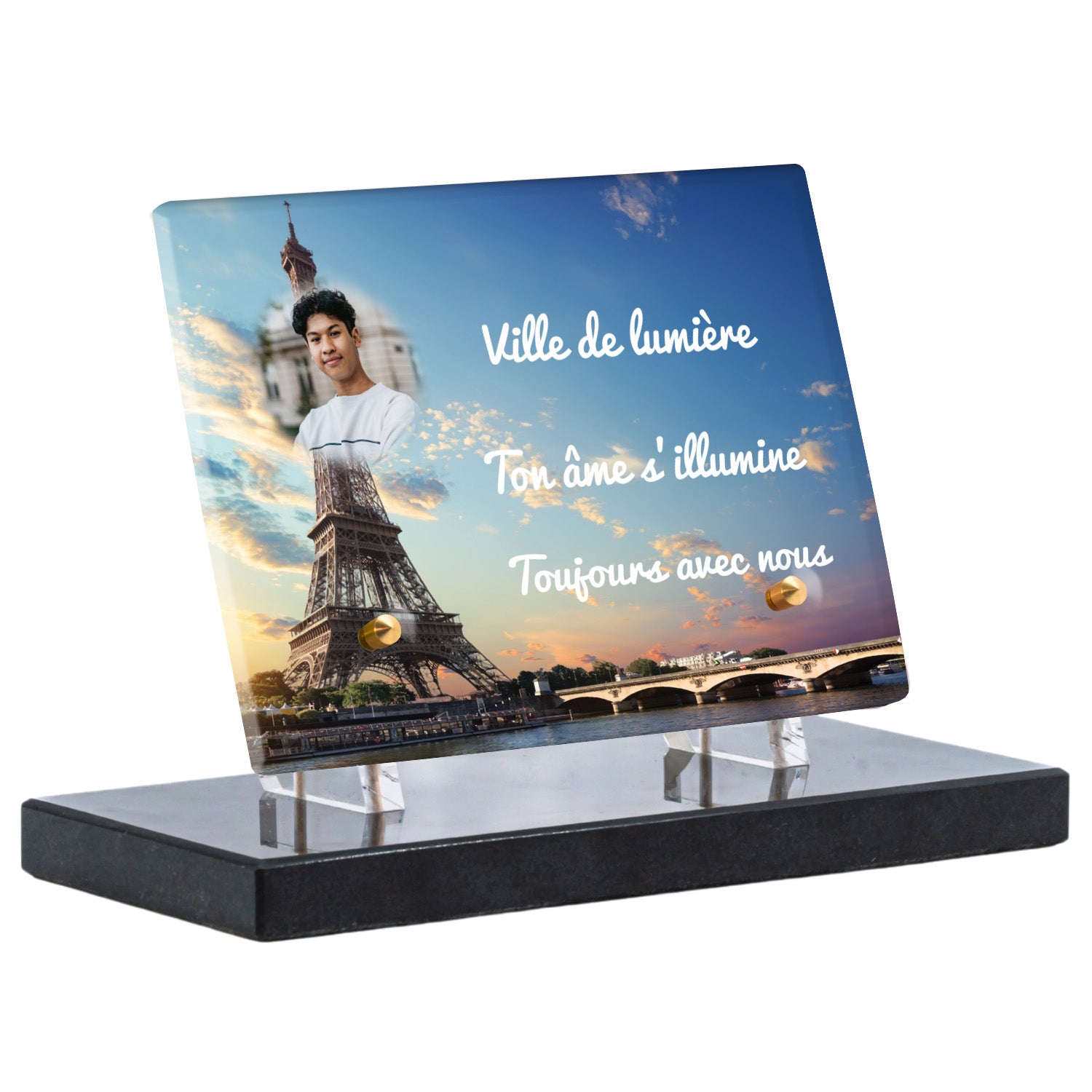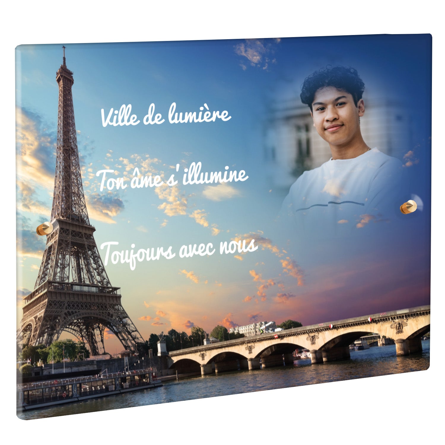 Découvrez cette plaque funéraire personnalisée illustrant délicatement la Tour Eiffel et la Seine, symbole intemporel de Paris. Conçue en plexiglas, cette plaque mortuaire allie modernité et élégance pour honorer dignement la mémoire de vos proches. Sa finition soignée en fait une plaque funéraire moderne, adaptée à tous types de mémoriaux.