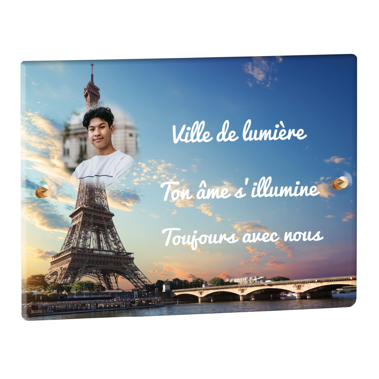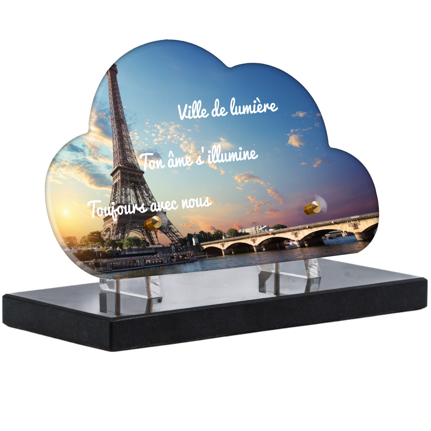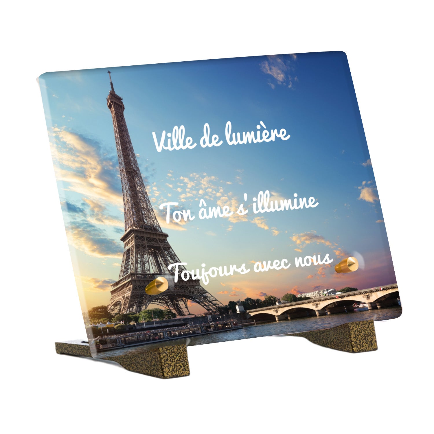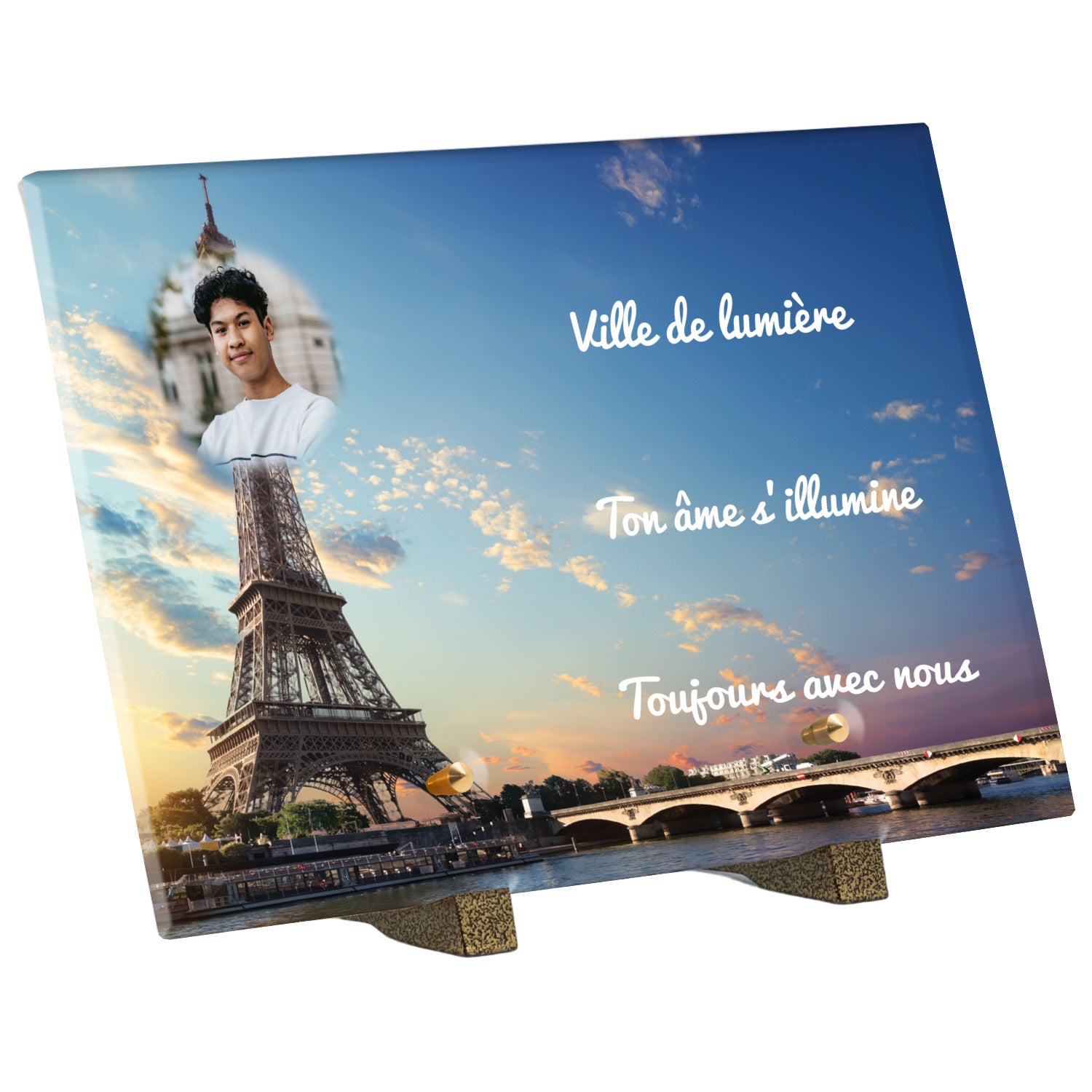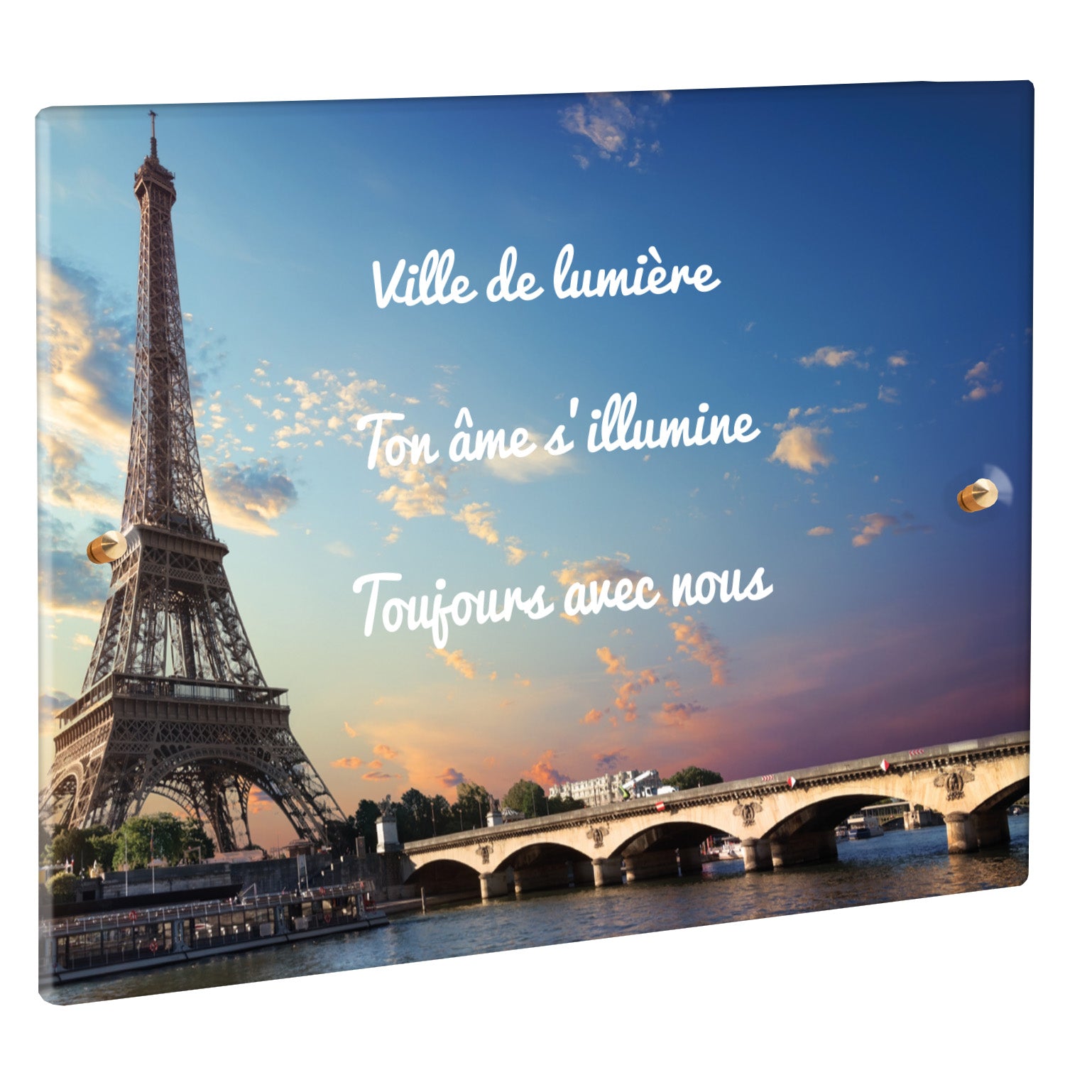 Découvrez cette plaque funéraire personnalisée illustrant délicatement la Tour Eiffel et la Seine, symbole intemporel de Paris. Conçue en plexiglas, cette plaque mortuaire allie modernité et élégance pour honorer dignement la mémoire de vos proches. Sa finition soignée en fait une plaque funéraire moderne, adaptée à tous types de mémoriaux.
