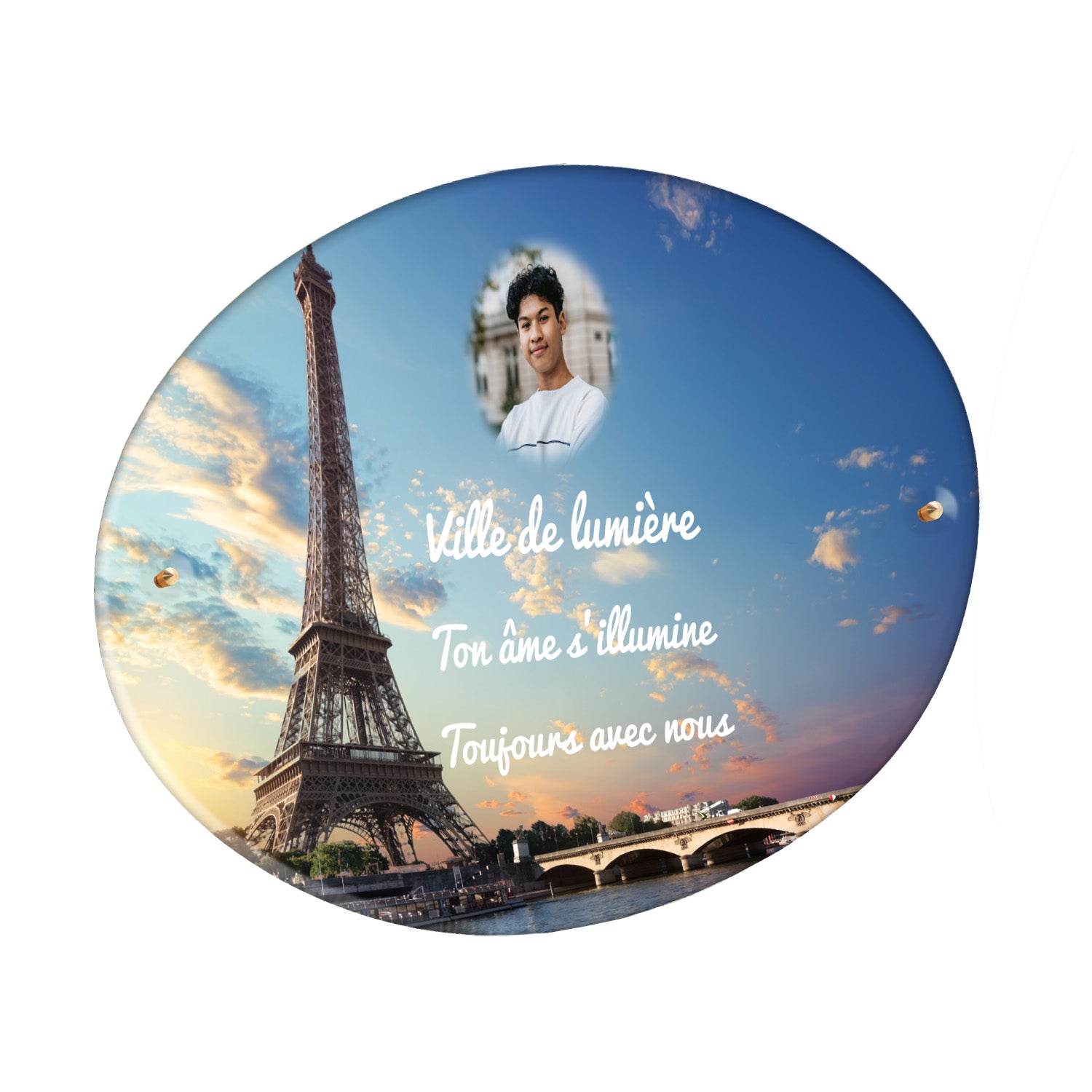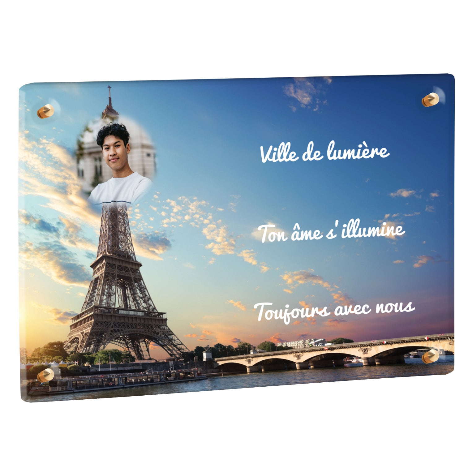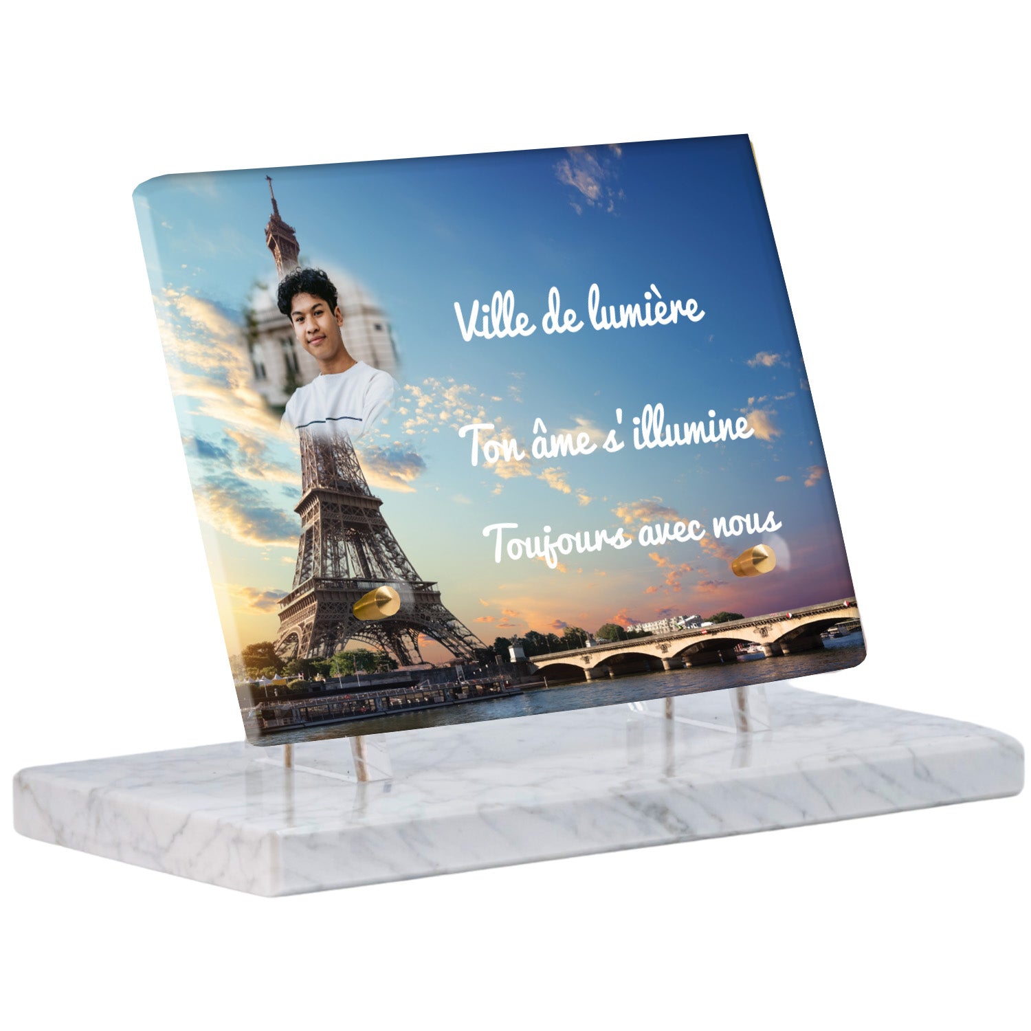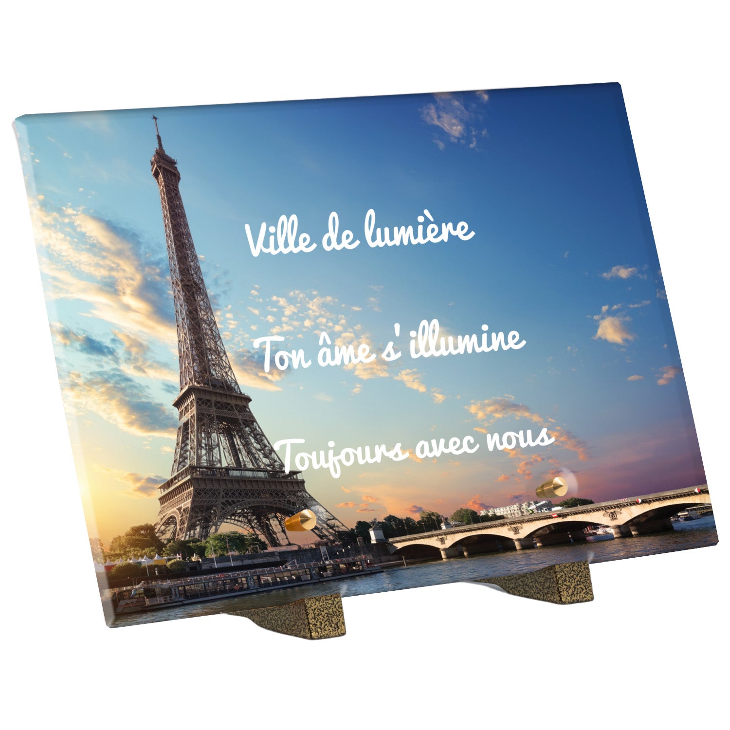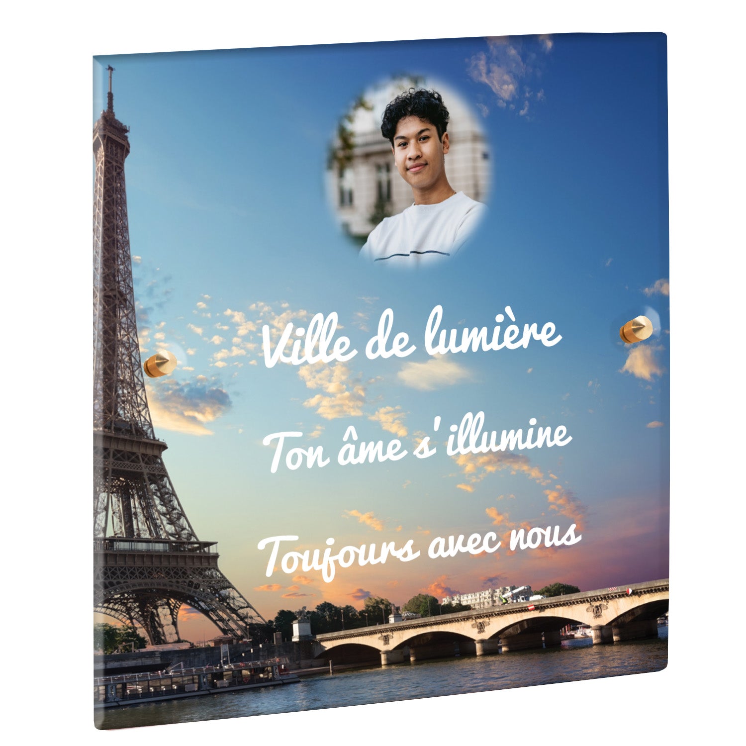 Découvrez cette plaque funéraire personnalisée illustrant délicatement la Tour Eiffel et la Seine, symbole intemporel de Paris. Conçue en plexiglas, cette plaque mortuaire allie modernité et élégance pour honorer dignement la mémoire de vos proches. Sa finition soignée en fait une plaque funéraire moderne, adaptée à tous types de mémoriaux.