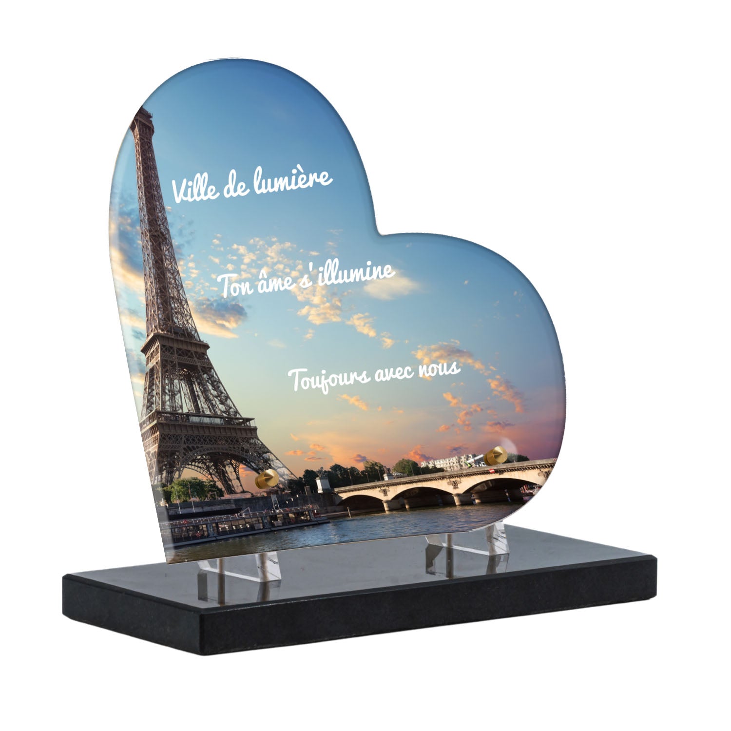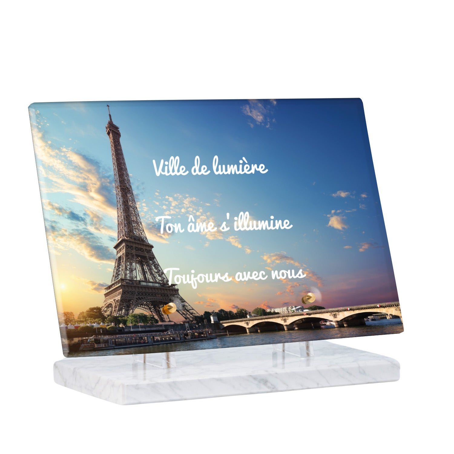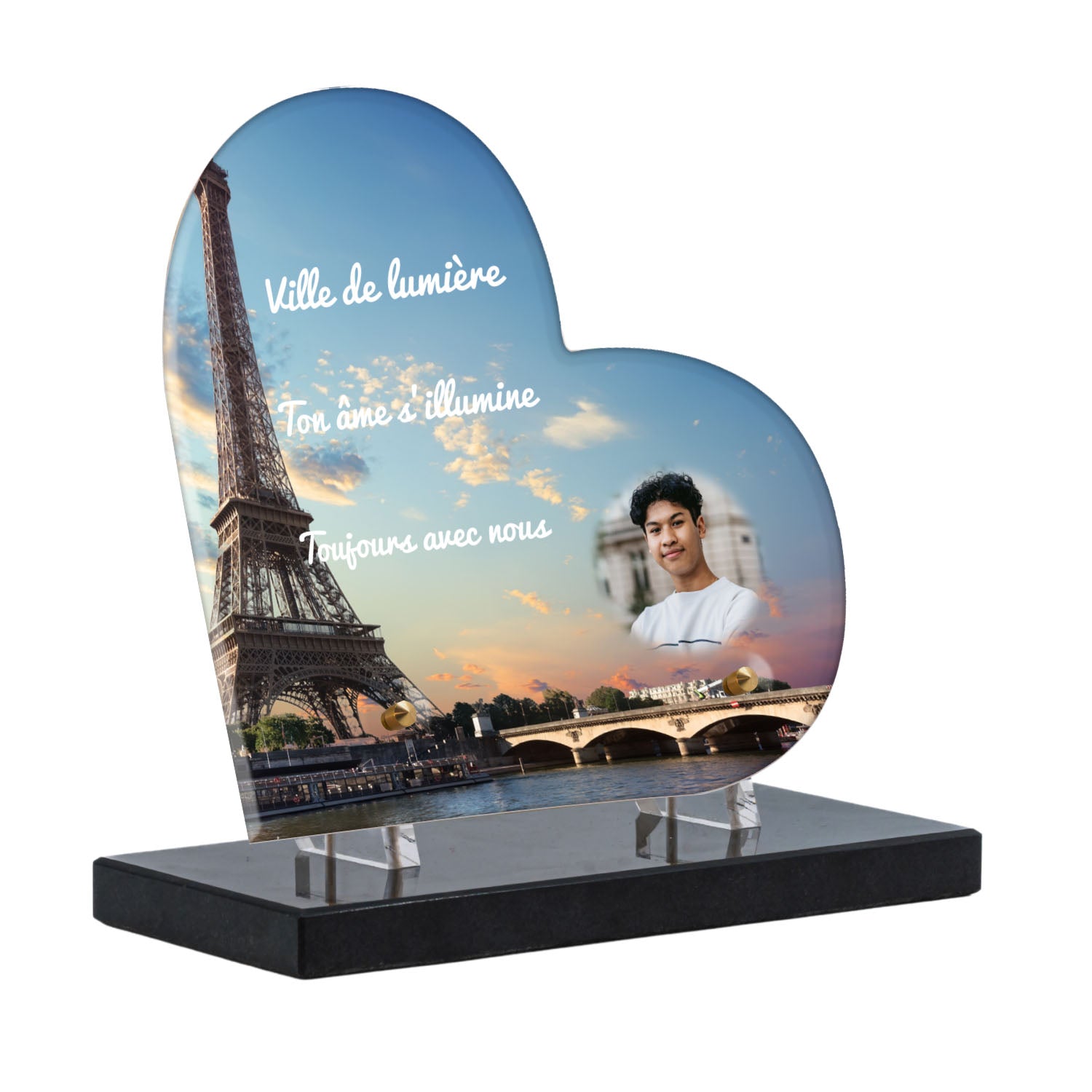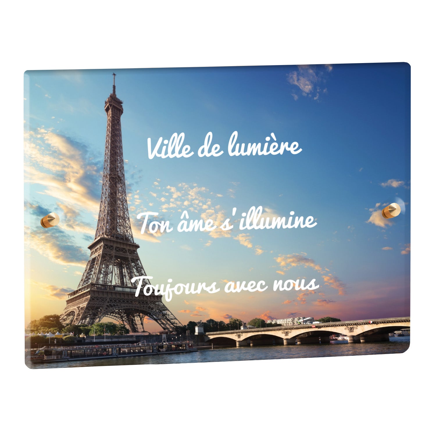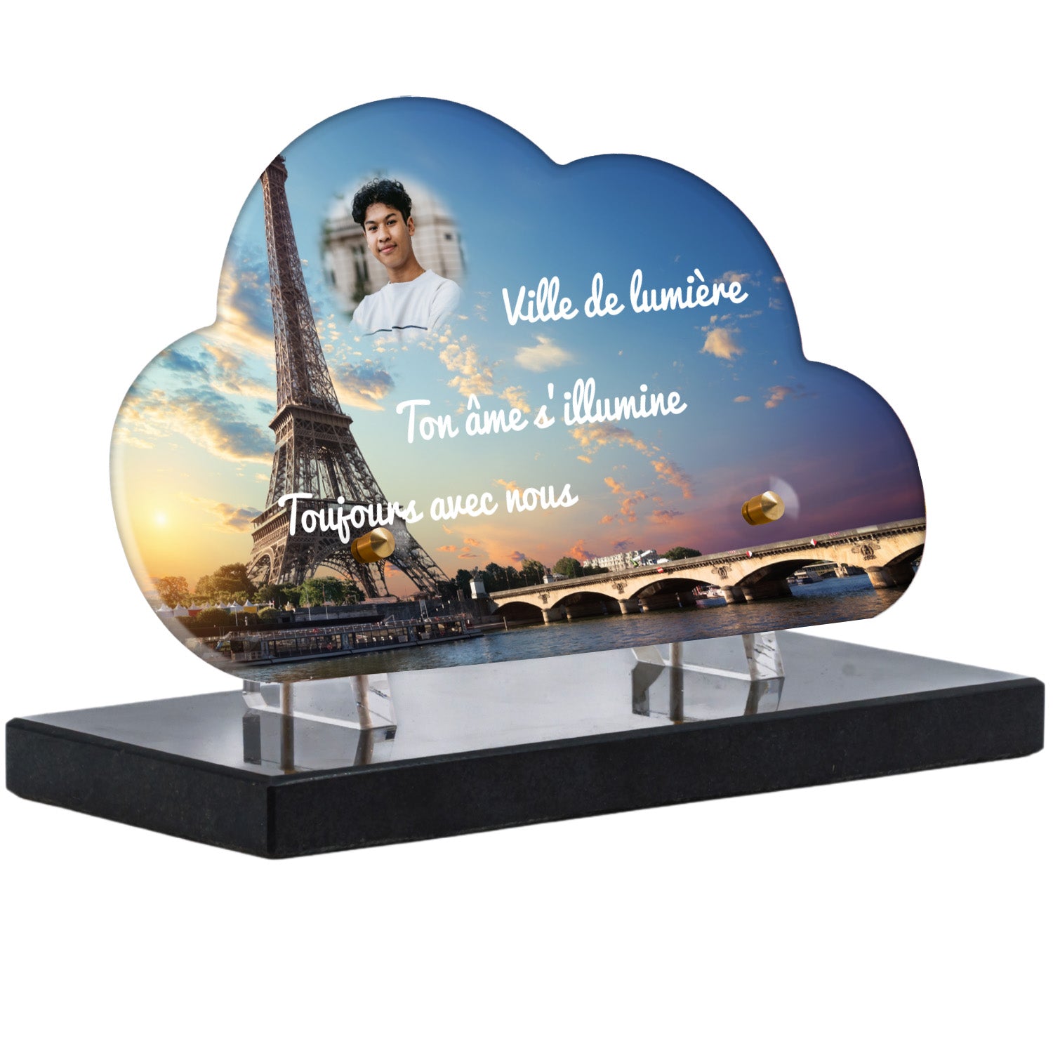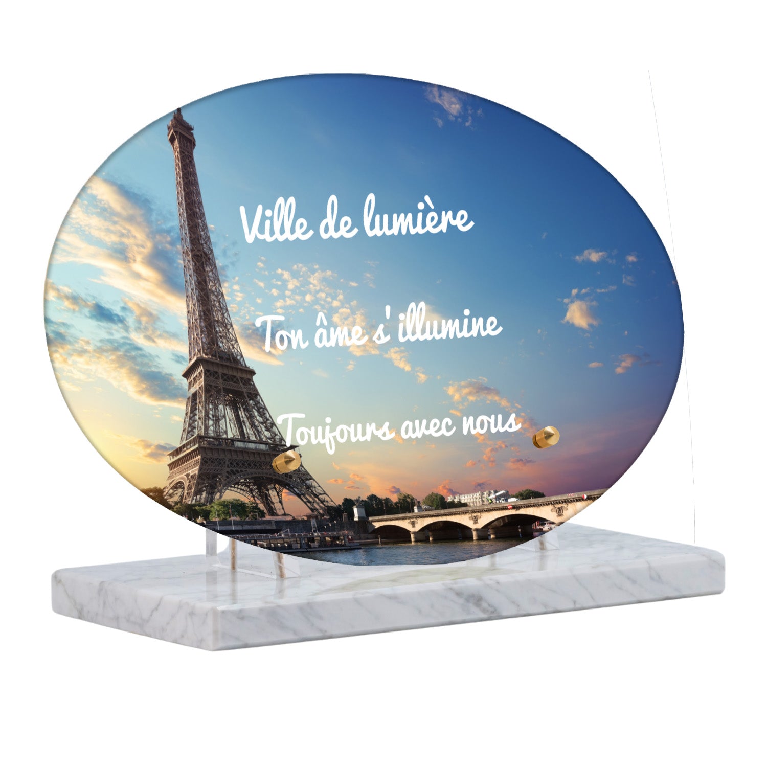 Découvrez cette plaque funéraire personnalisée illustrant délicatement la Tour Eiffel et la Seine, symbole intemporel de Paris. Conçue en plexiglas, cette plaque mortuaire allie modernité et élégance pour honorer dignement la mémoire de vos proches. Sa finition soignée en fait une plaque funéraire moderne, adaptée à tous types de mémoriaux.