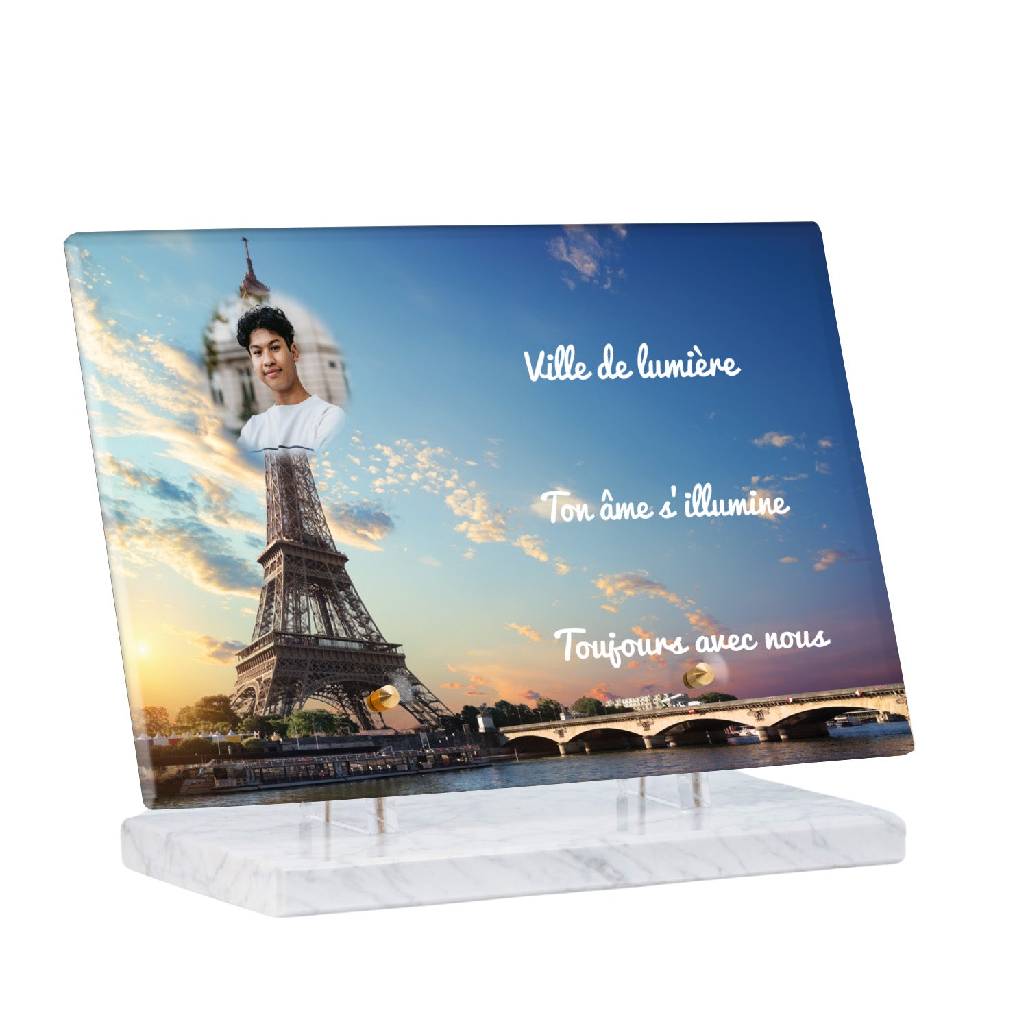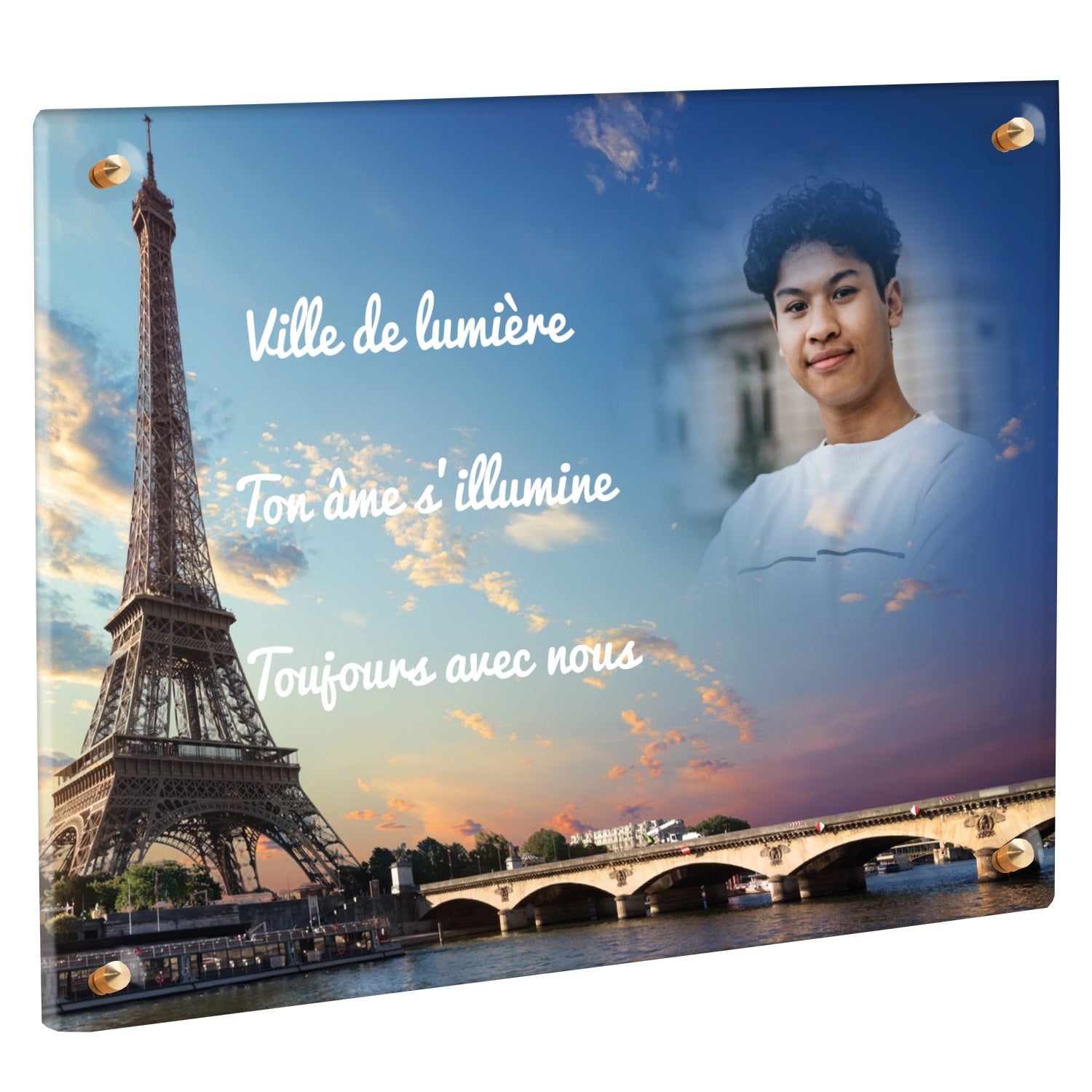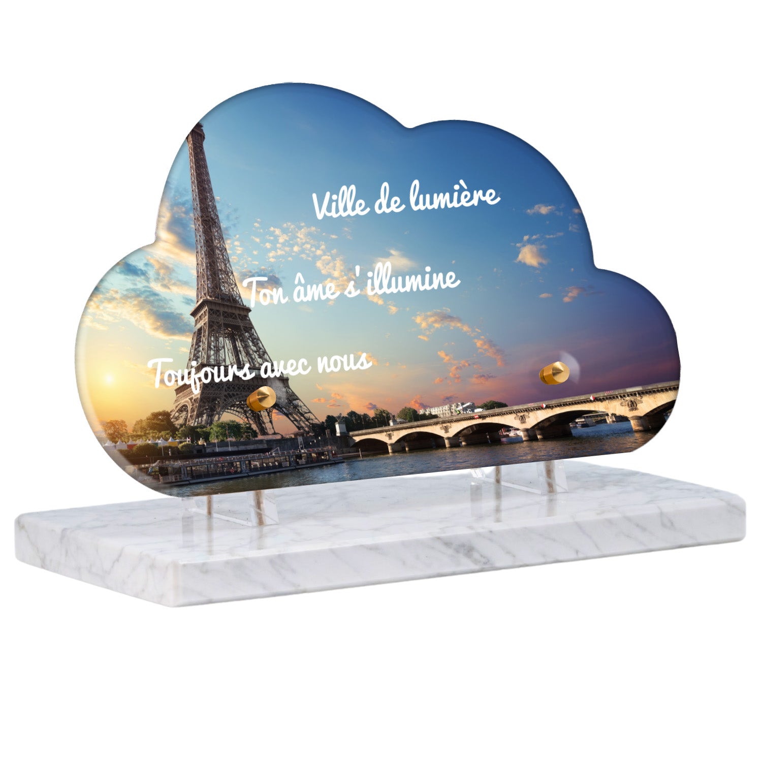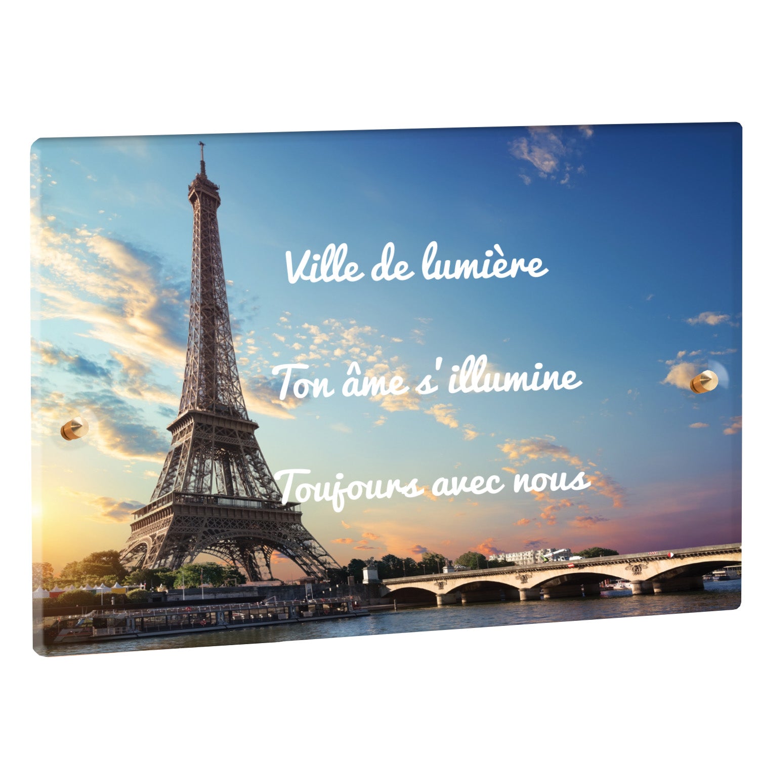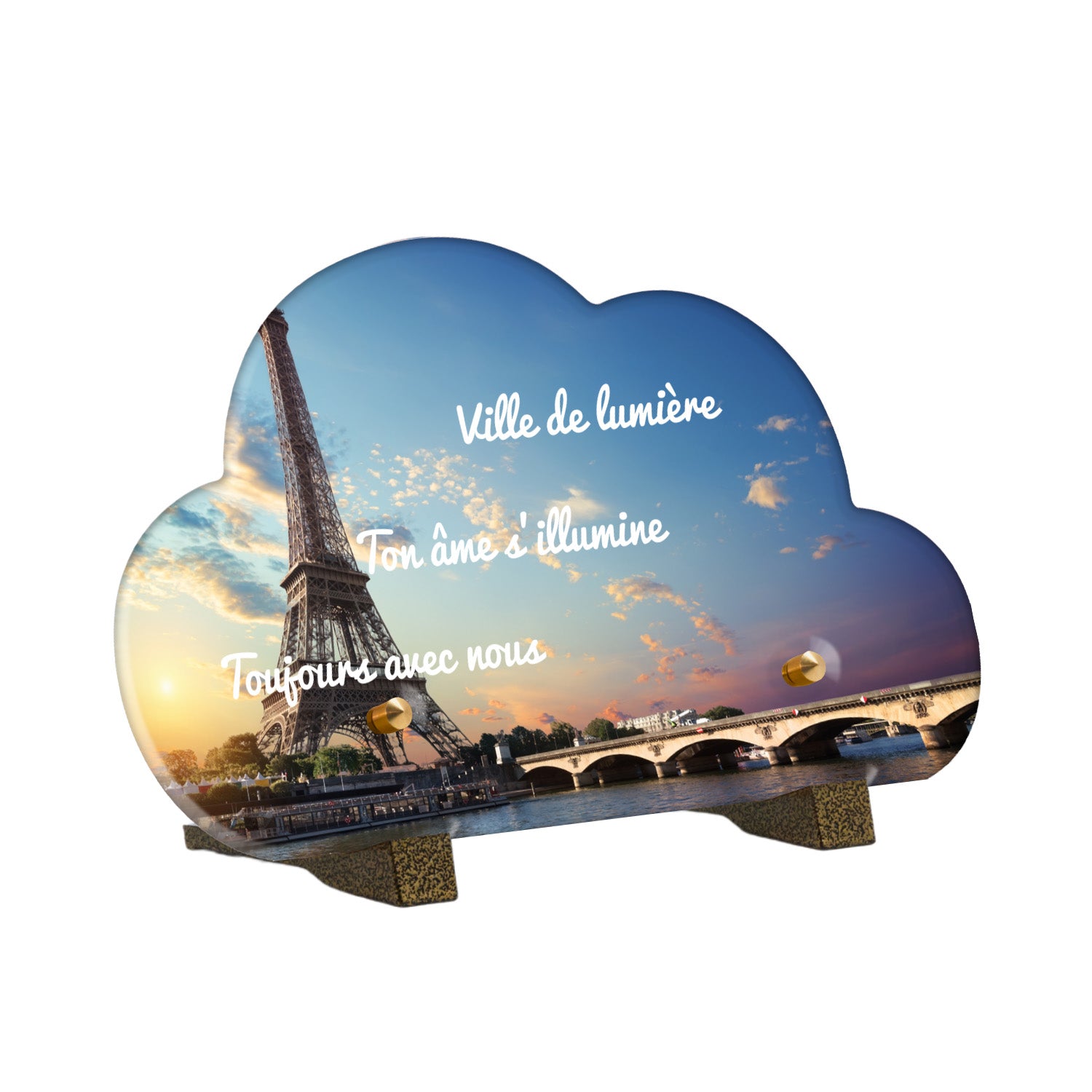Découvrez cette plaque funéraire personnalisée illustrant délicatement la Tour Eiffel et la Seine, symbole intemporel de Paris. Conçue en plexiglas, cette plaque mortuaire allie modernité et élégance pour honorer dignement la mémoire de vos proches. Sa finition soignée en fait une plaque funéraire moderne, adaptée à tous types de mémoriaux.