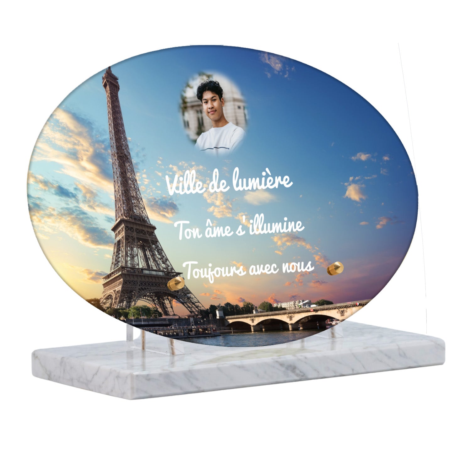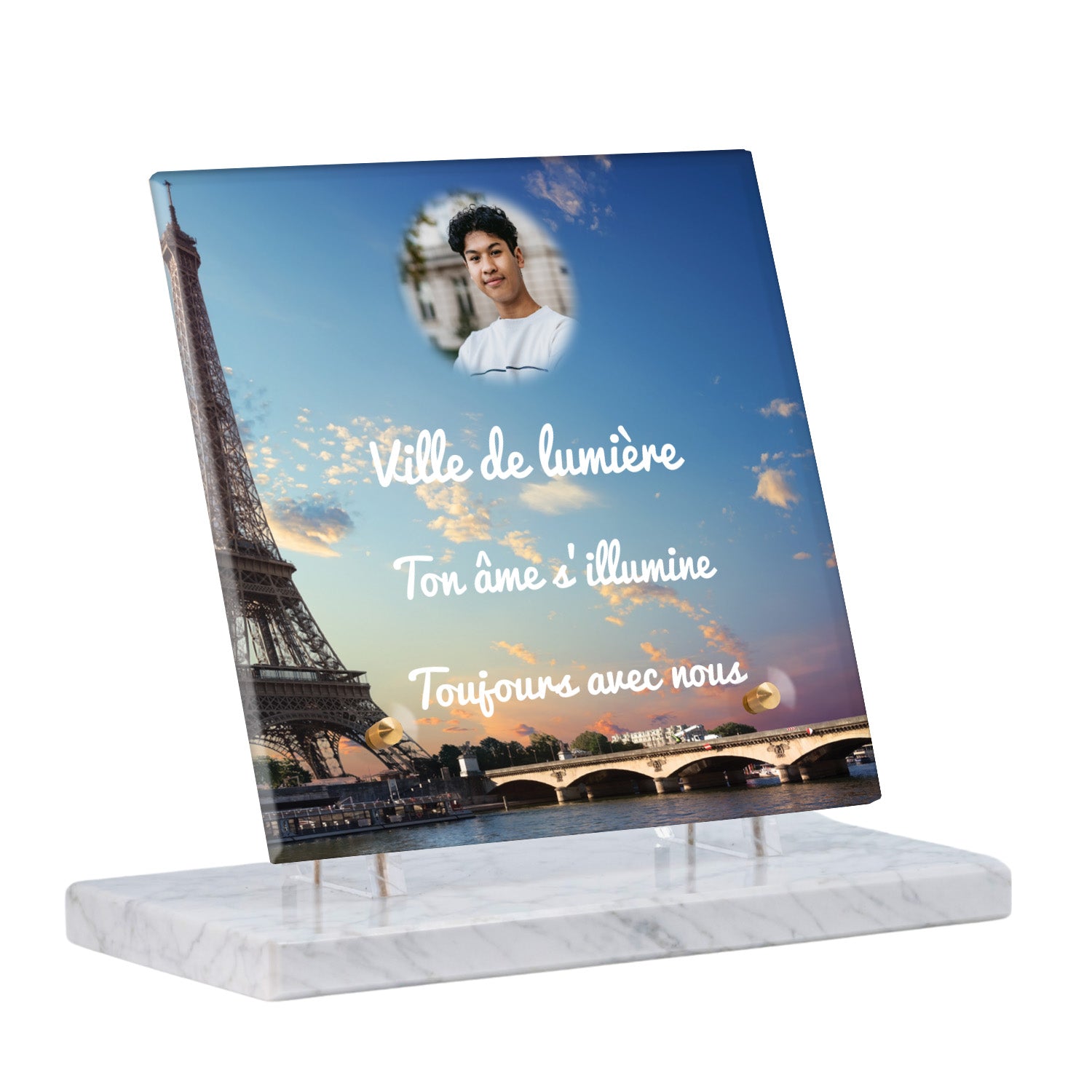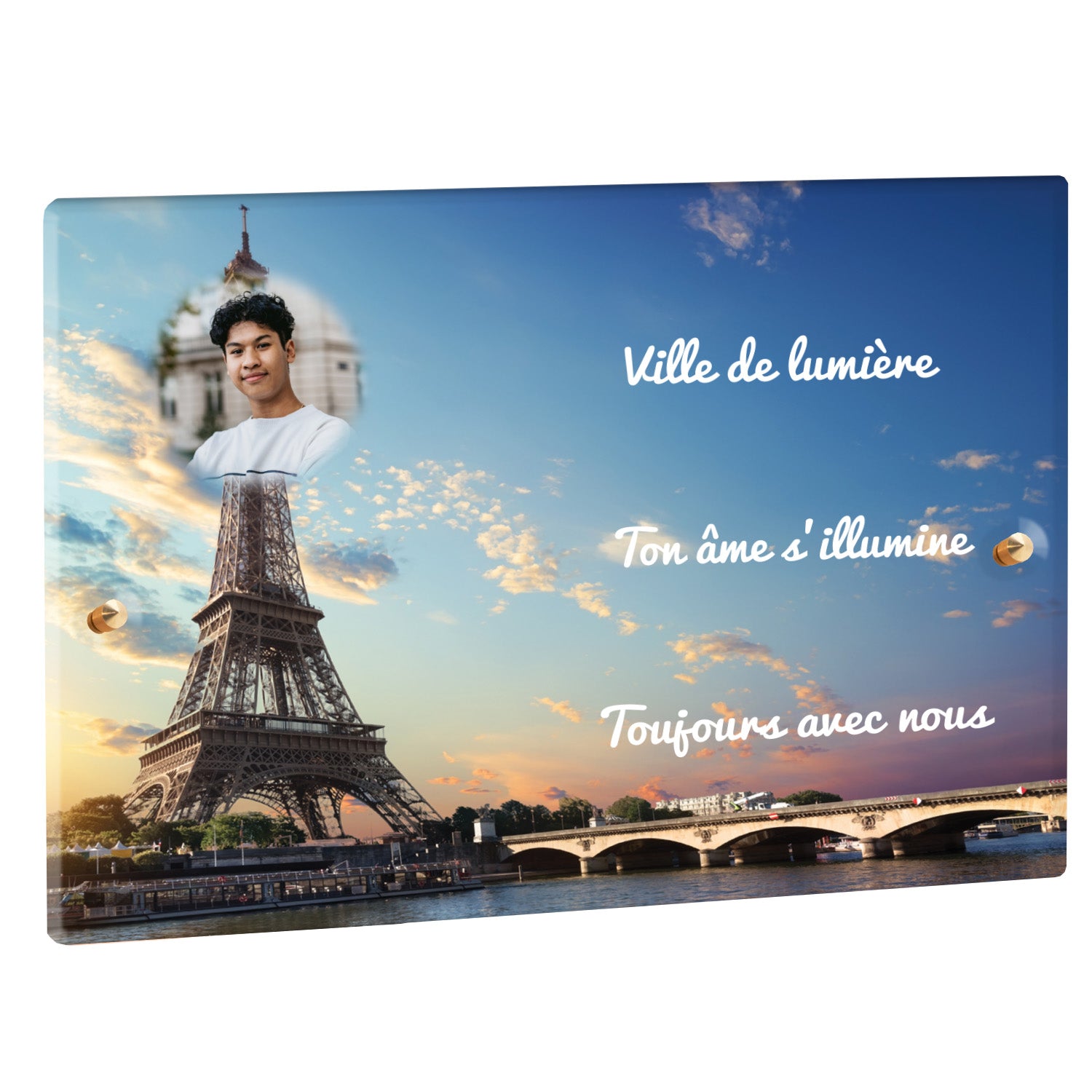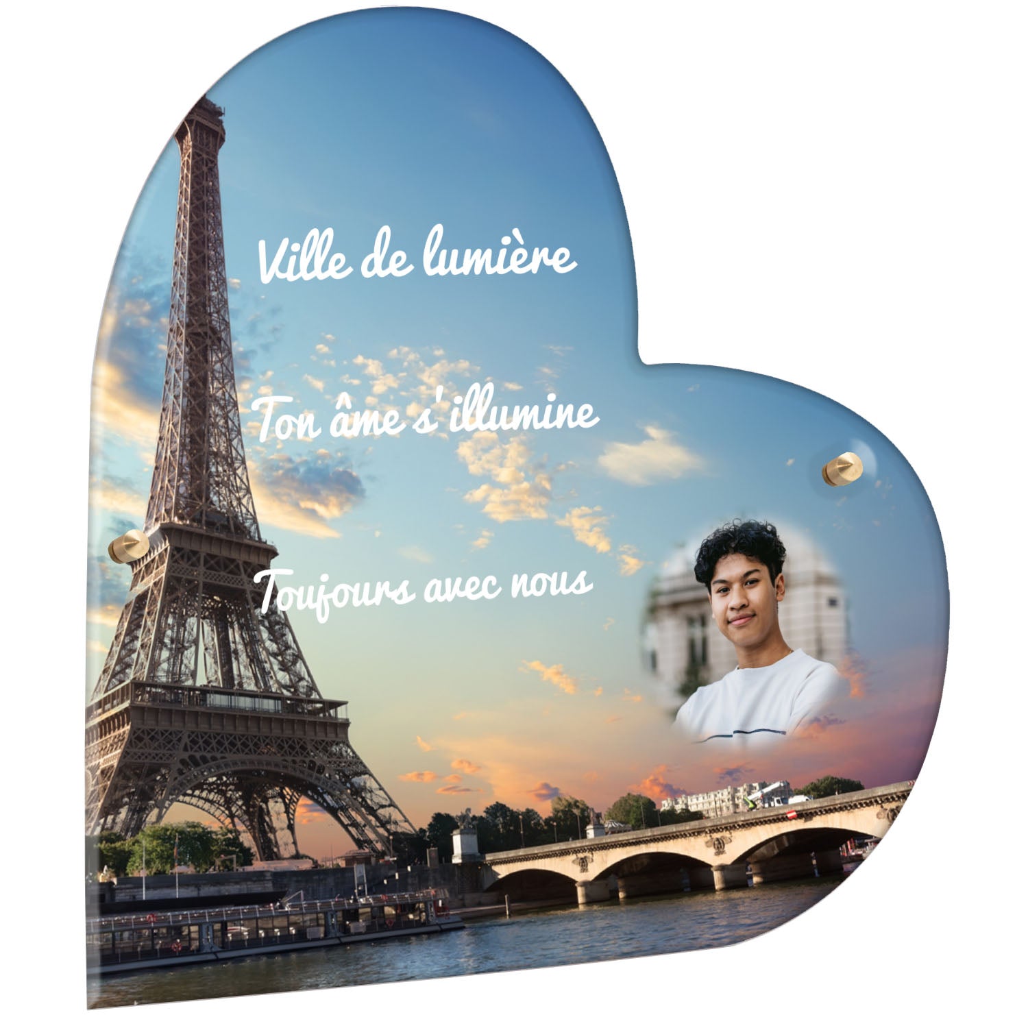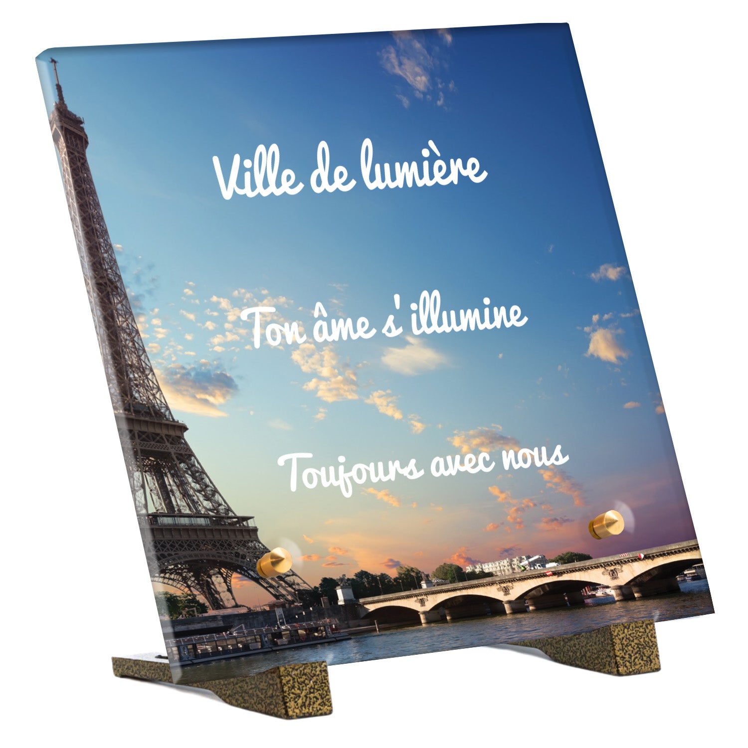 Découvrez cette plaque funéraire personnalisée illustrant délicatement la Tour Eiffel et la Seine, symbole intemporel de Paris. Conçue en plexiglas, cette plaque mortuaire allie modernité et élégance pour honorer dignement la mémoire de vos proches. Sa finition soignée en fait une plaque funéraire moderne, adaptée à tous types de mémoriaux.
