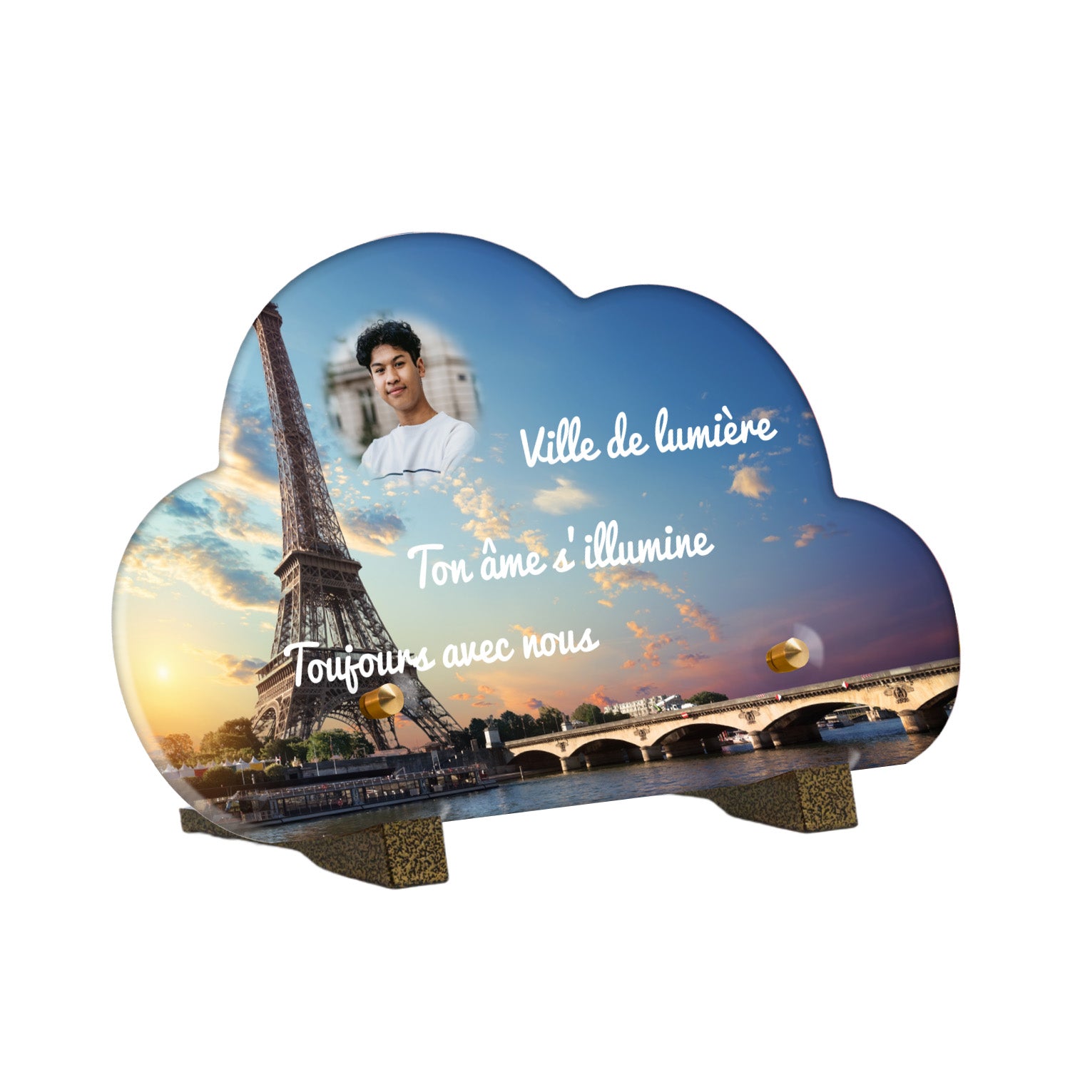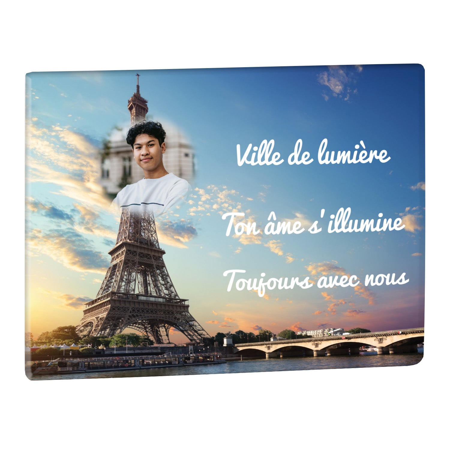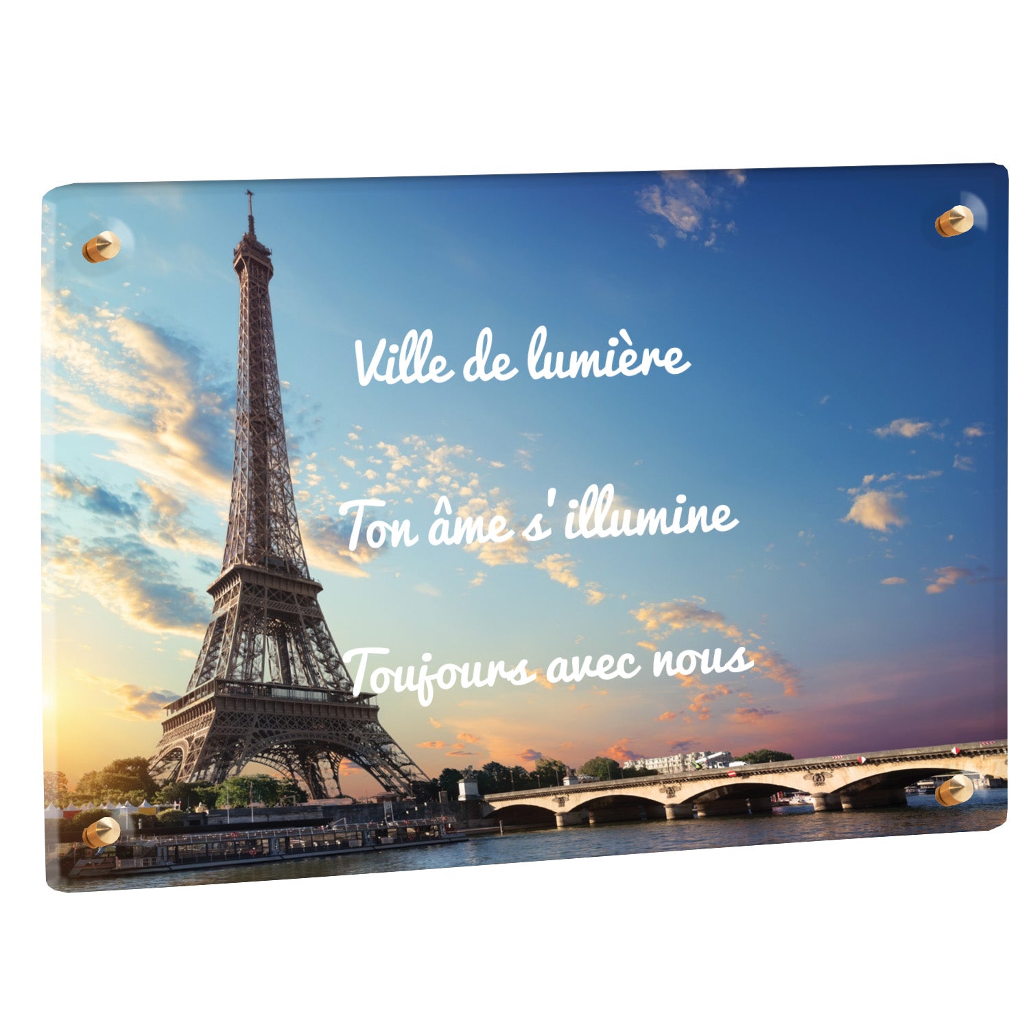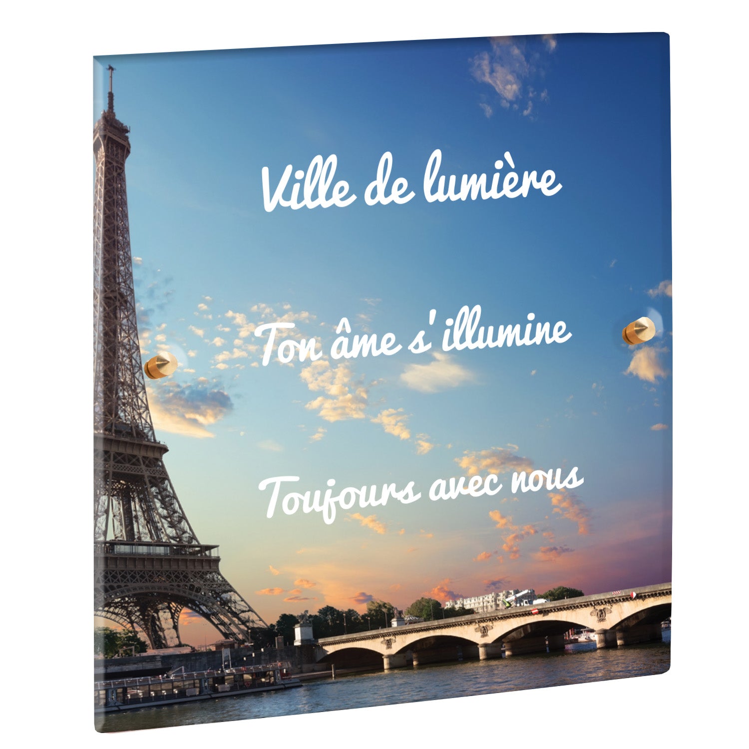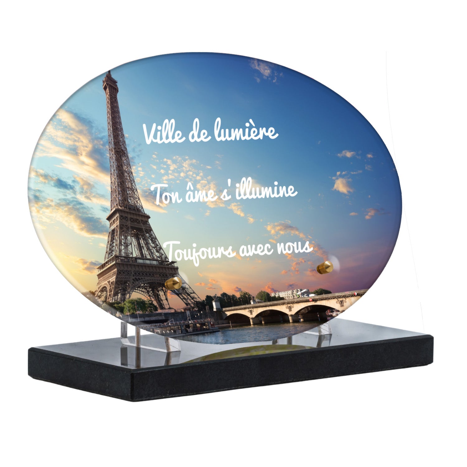 Découvrez cette plaque funéraire personnalisée illustrant délicatement la Tour Eiffel et la Seine, symbole intemporel de Paris. Conçue en plexiglas, cette plaque mortuaire allie modernité et élégance pour honorer dignement la mémoire de vos proches. Sa finition soignée en fait une plaque funéraire moderne, adaptée à tous types de mémoriaux.