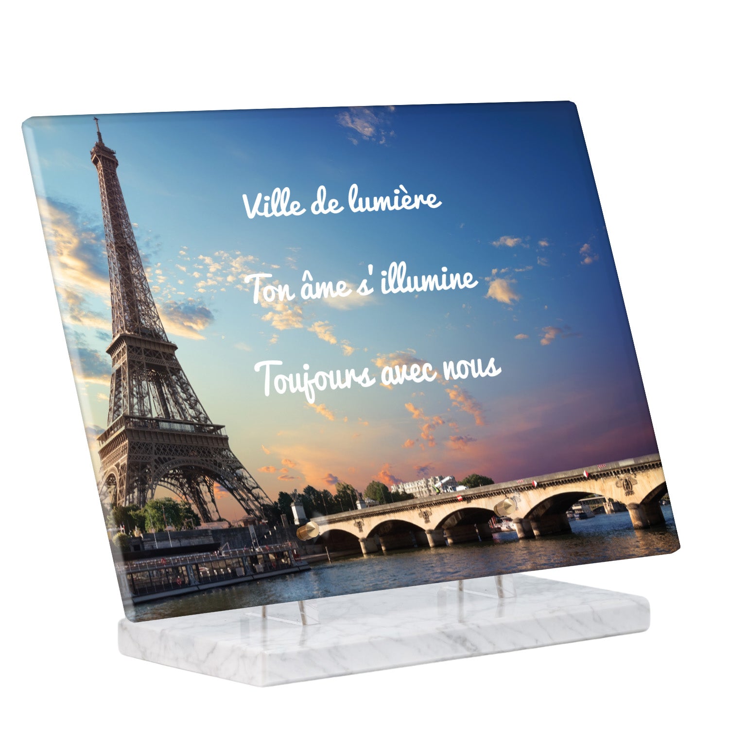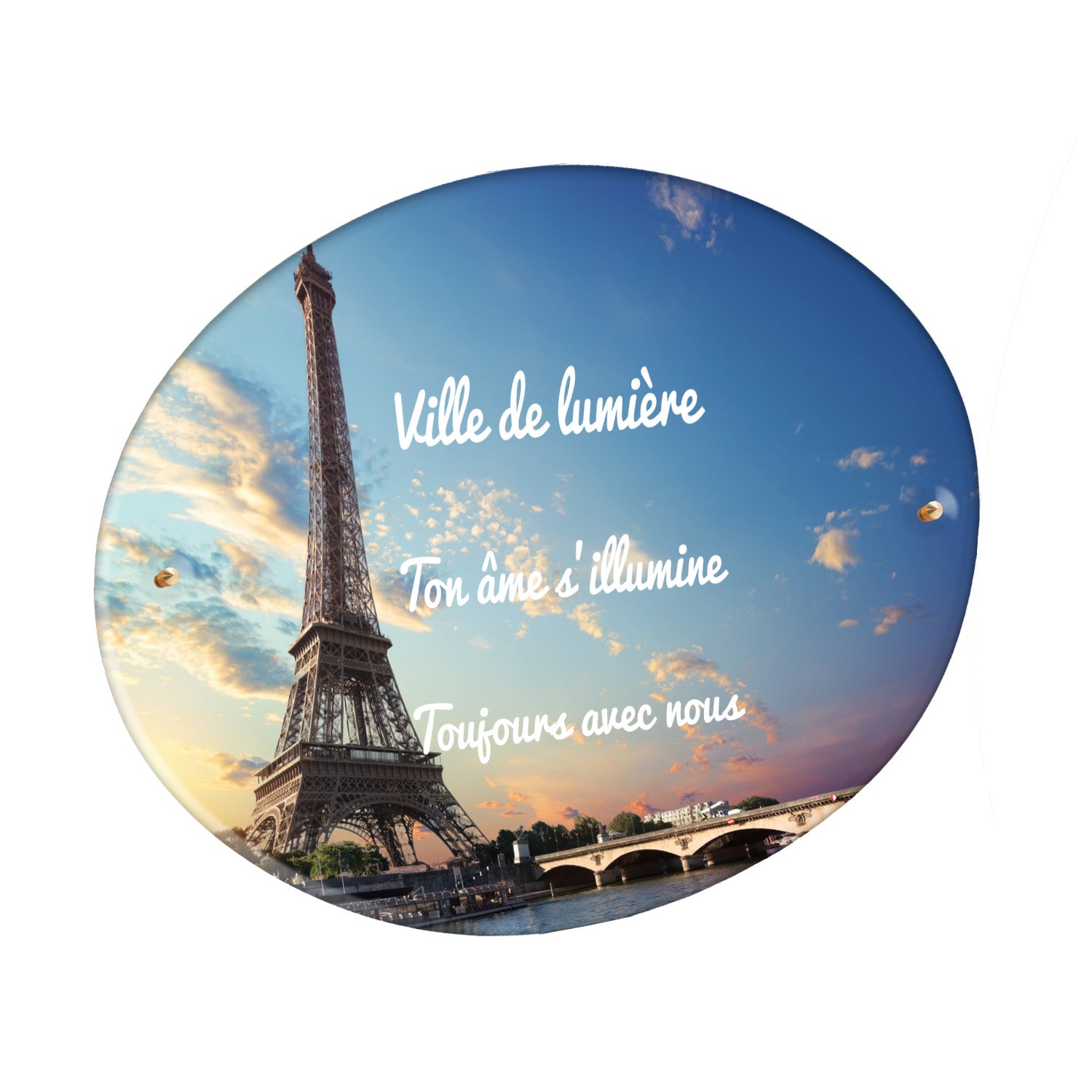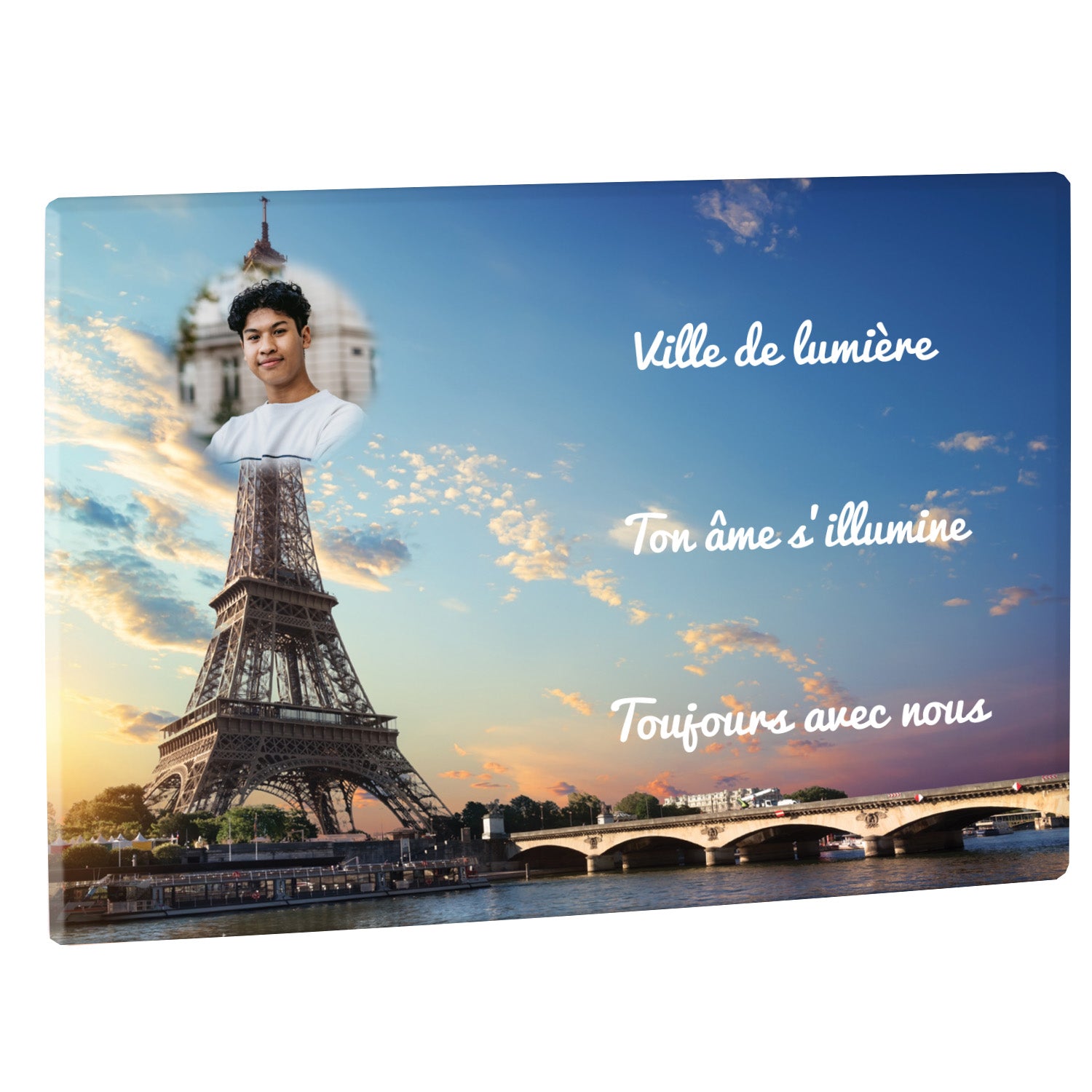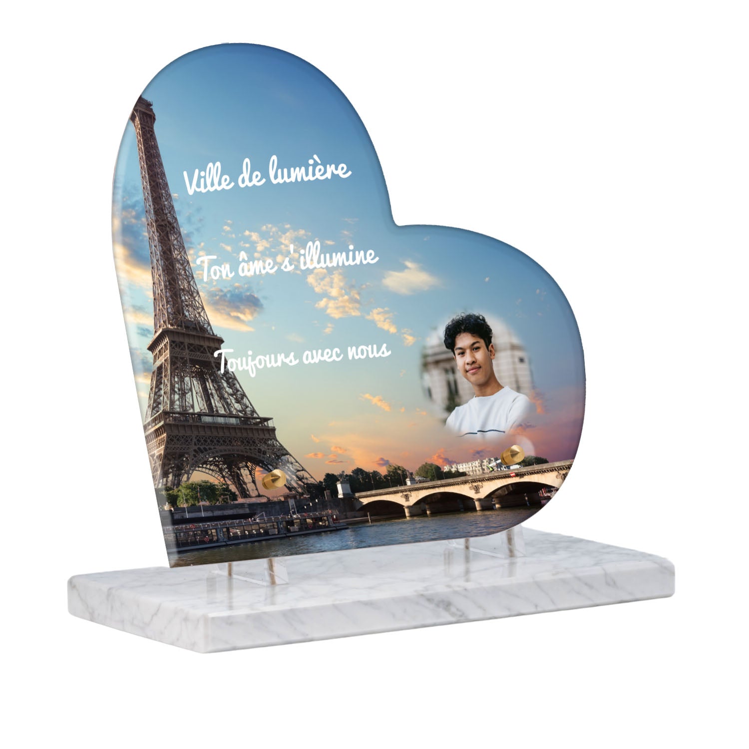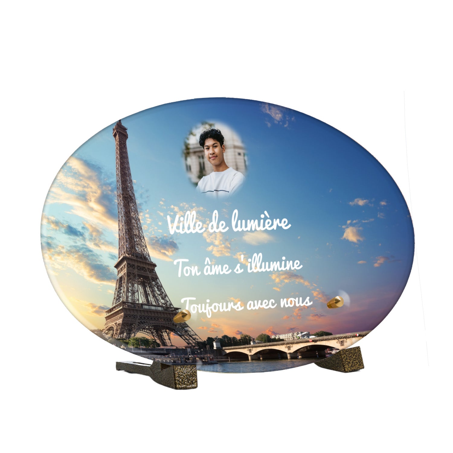 Découvrez cette plaque funéraire personnalisée illustrant délicatement la Tour Eiffel et la Seine, symbole intemporel de Paris. Conçue en plexiglas, cette plaque mortuaire allie modernité et élégance pour honorer dignement la mémoire de vos proches. Sa finition soignée en fait une plaque funéraire moderne, adaptée à tous types de mémoriaux.