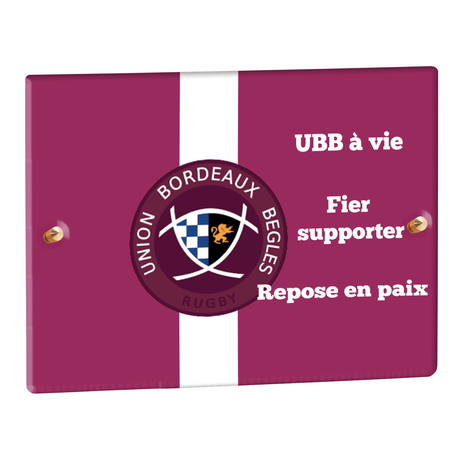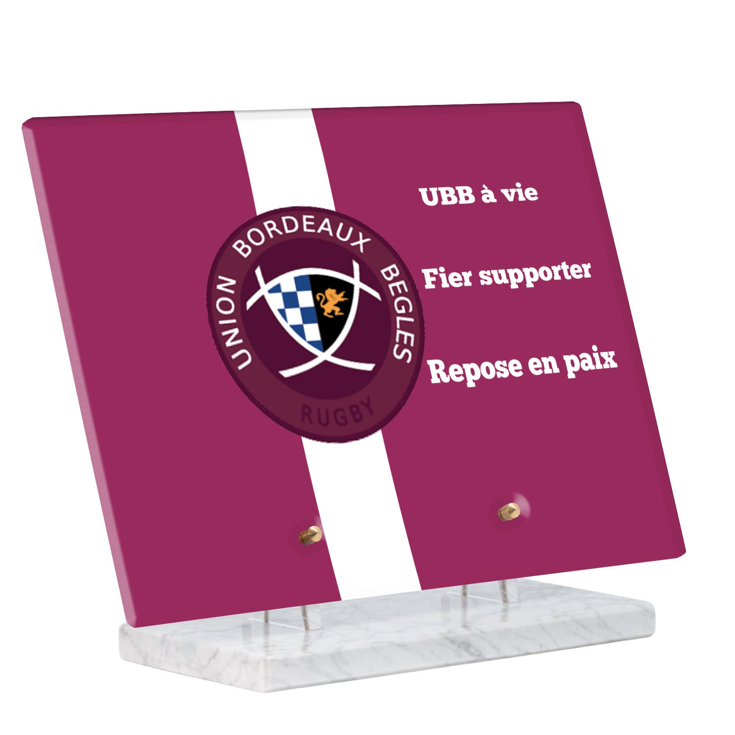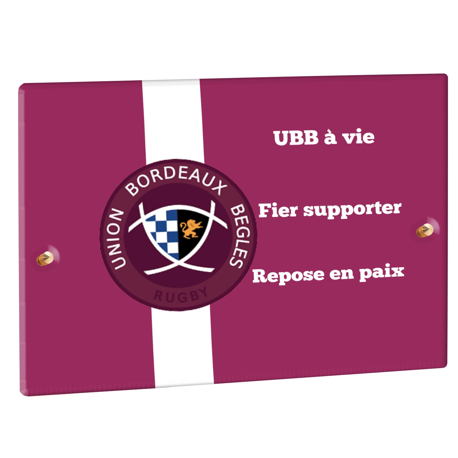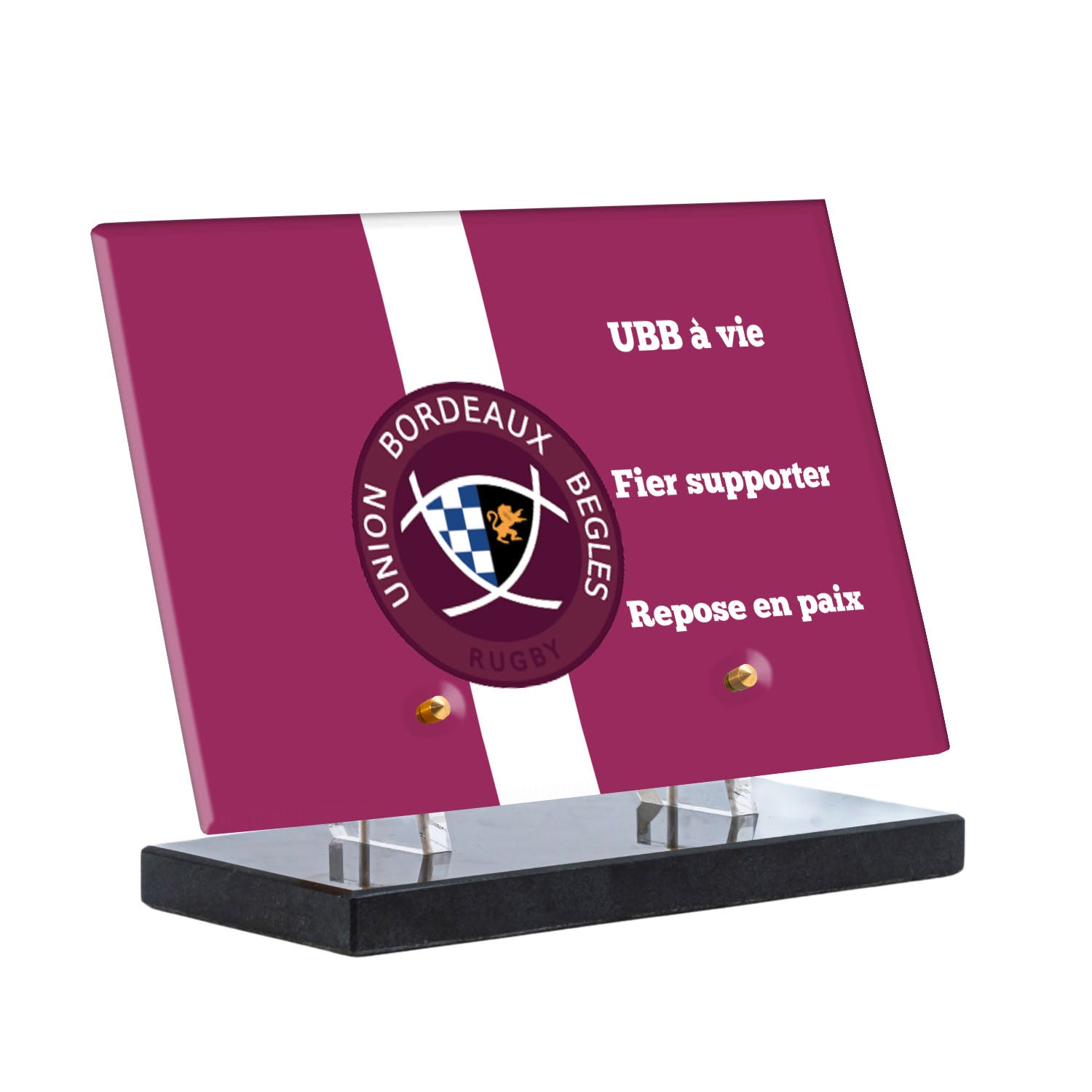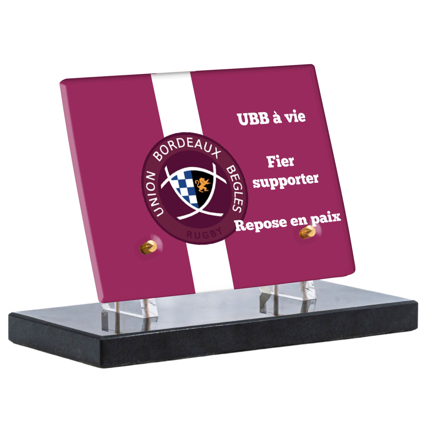 Offrez un hommage unique avec cette plaque funéraire personnalisée arborant fièrement le logo de l’Union Bordeaux Bègles (UBB). Conçue en plexiglas de haute qualité, cette plaque funéraire moderne allie élégance et durabilité, parfaite pour une plaque mortuaire qui respecte la mémoire de vos proches avec distinction.