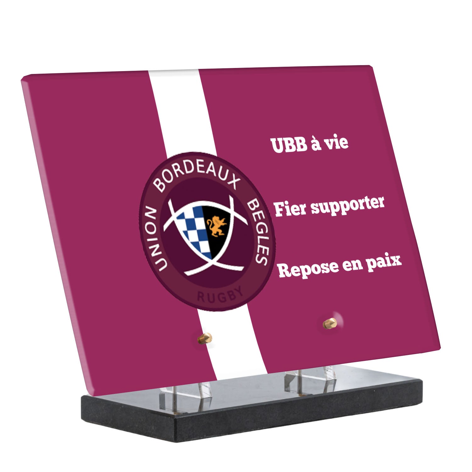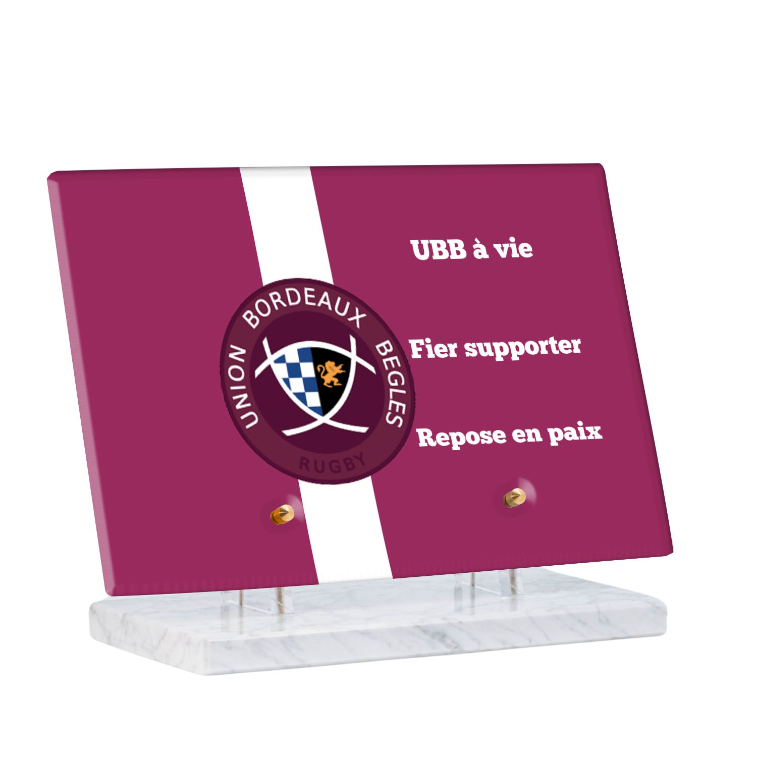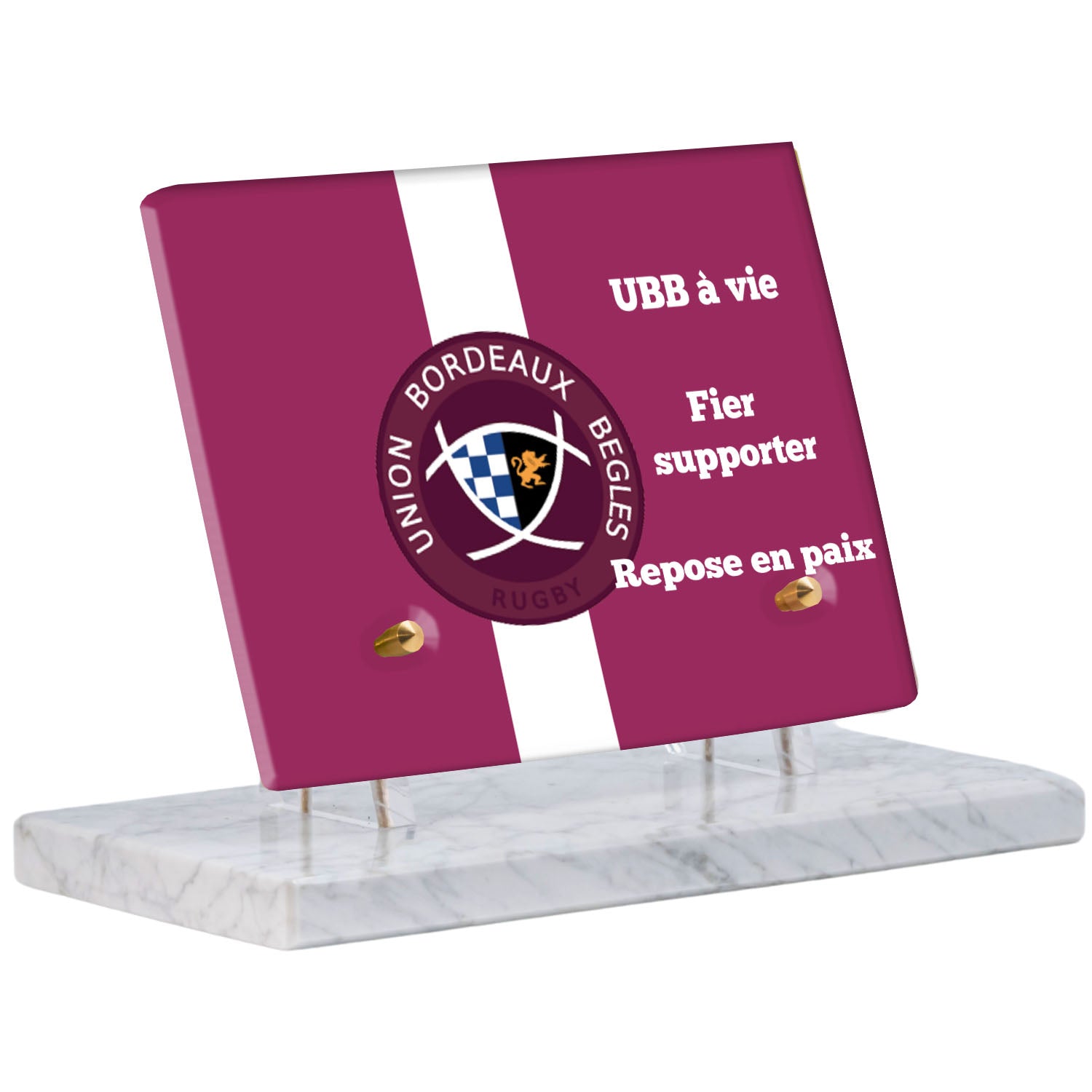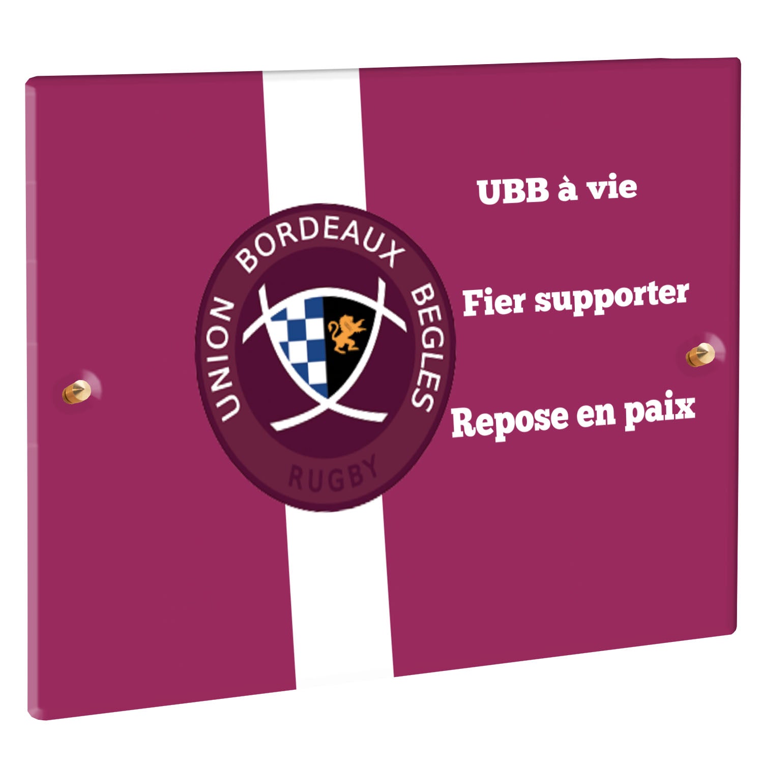 Offrez un hommage unique avec cette plaque funéraire personnalisée arborant fièrement le logo de l’Union Bordeaux Bègles (UBB). Conçue en plexiglas de haute qualité, cette plaque funéraire moderne allie élégance et durabilité, parfaite pour une plaque mortuaire qui respecte la mémoire de vos proches avec distinction.