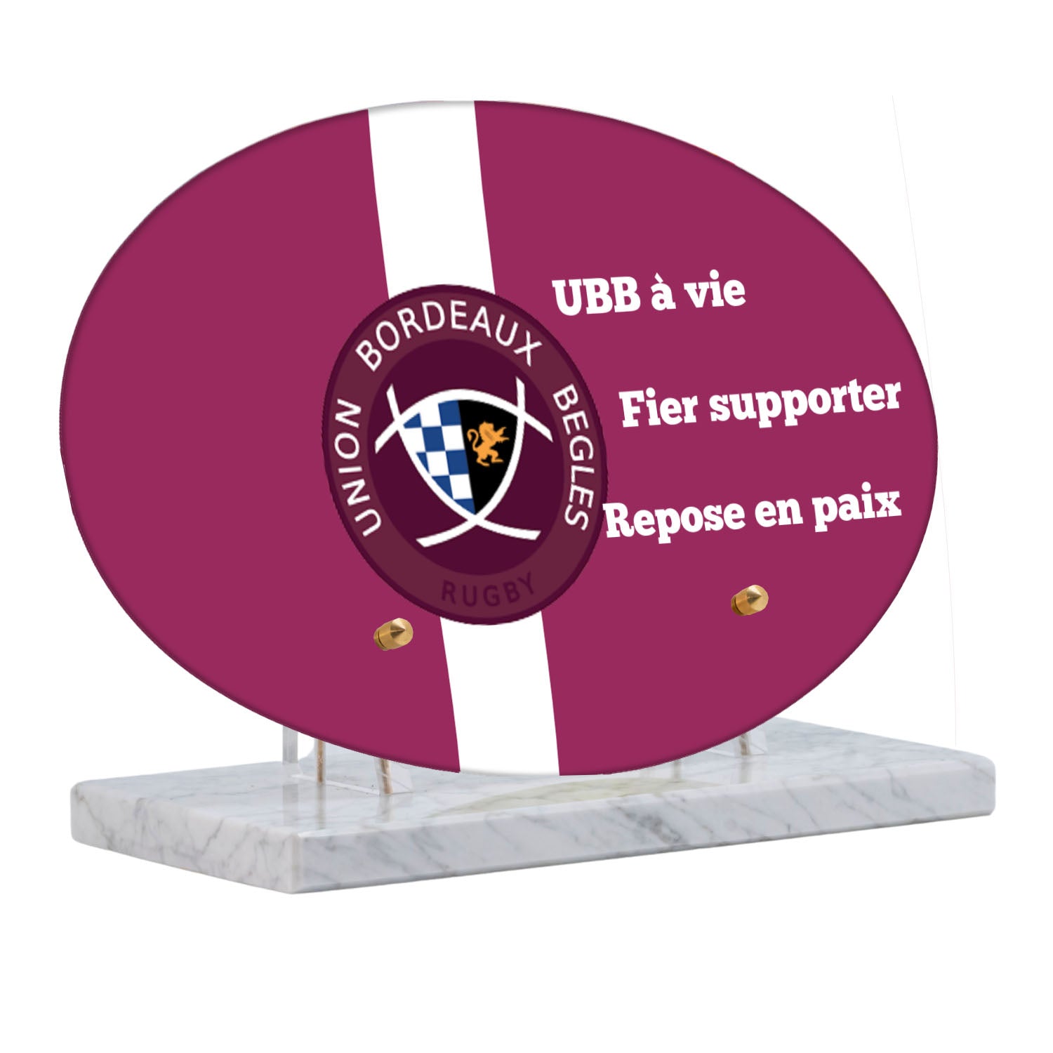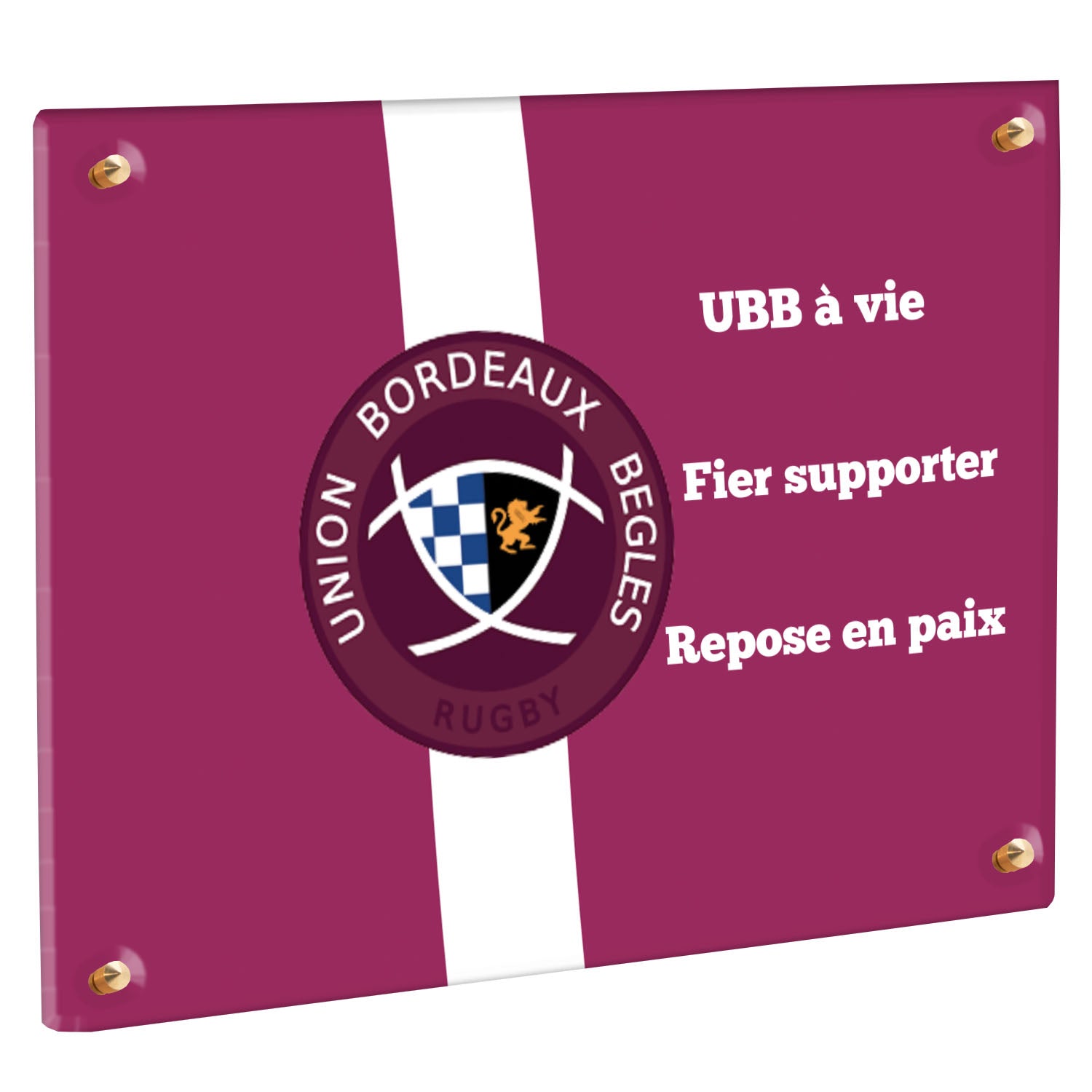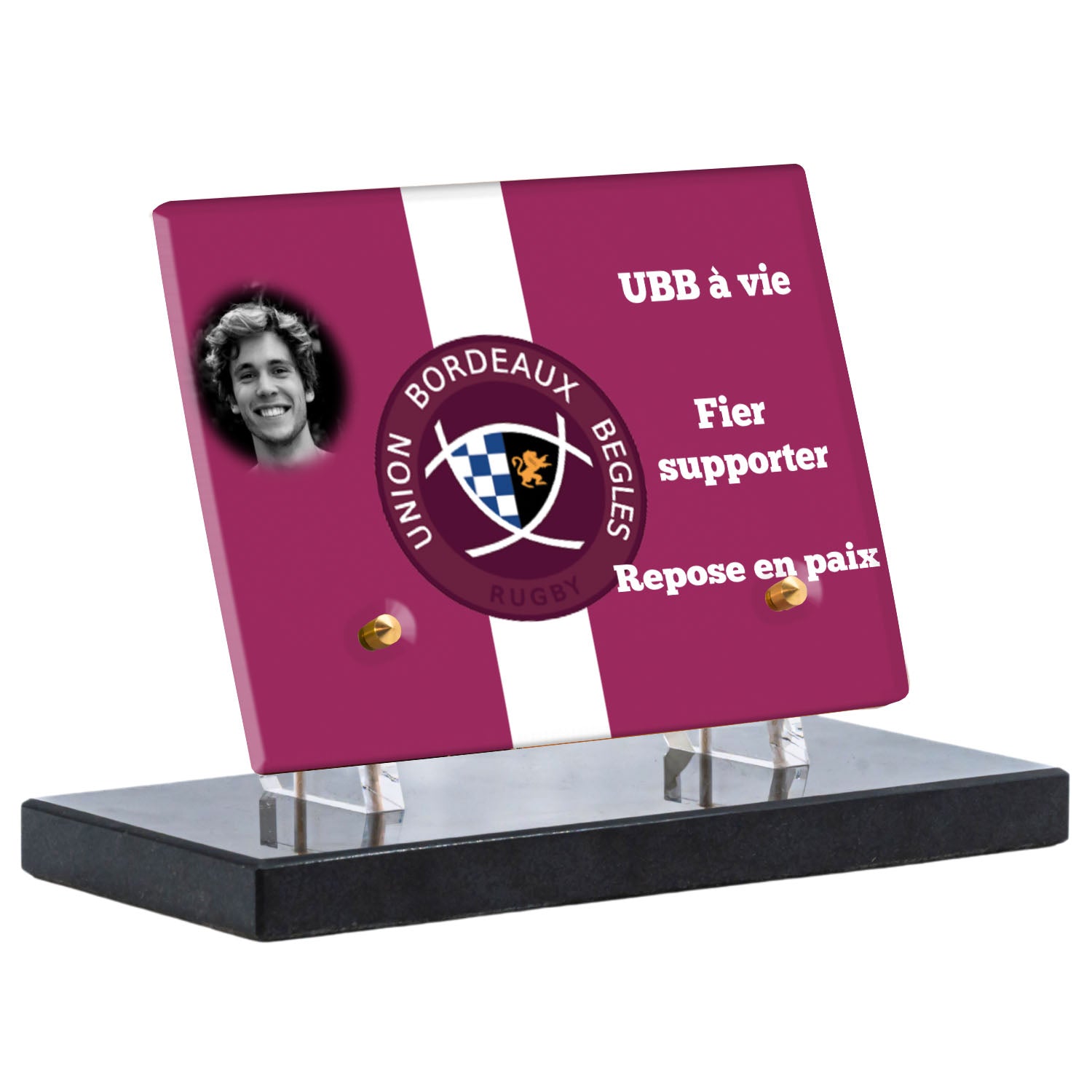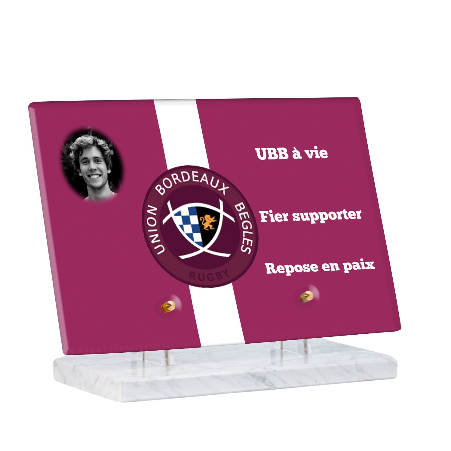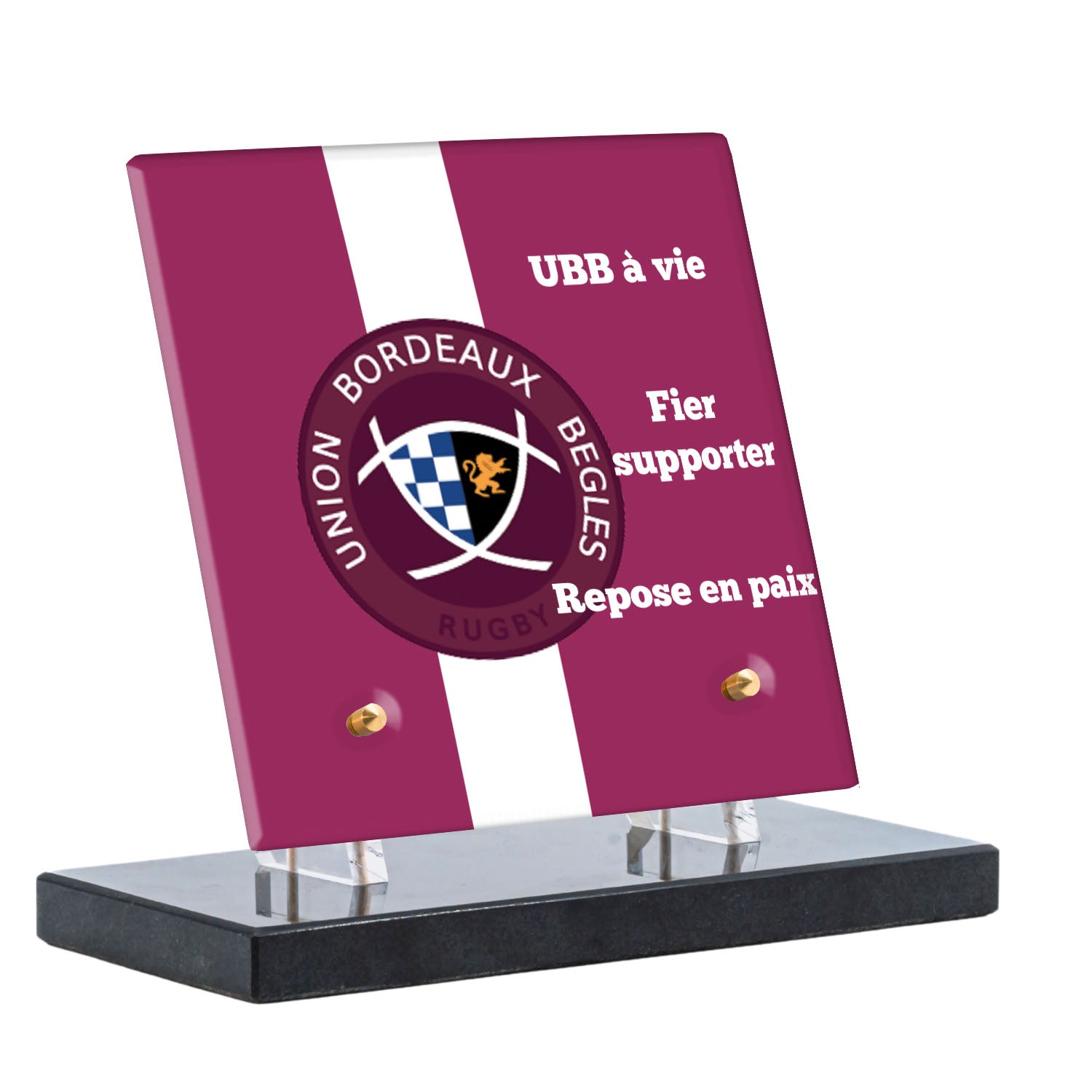 Offrez un hommage unique avec cette plaque funéraire personnalisée arborant fièrement le logo de l’Union Bordeaux Bègles (UBB). Conçue en plexiglas de haute qualité, cette plaque funéraire moderne allie élégance et durabilité, parfaite pour une plaque mortuaire qui respecte la mémoire de vos proches avec distinction.