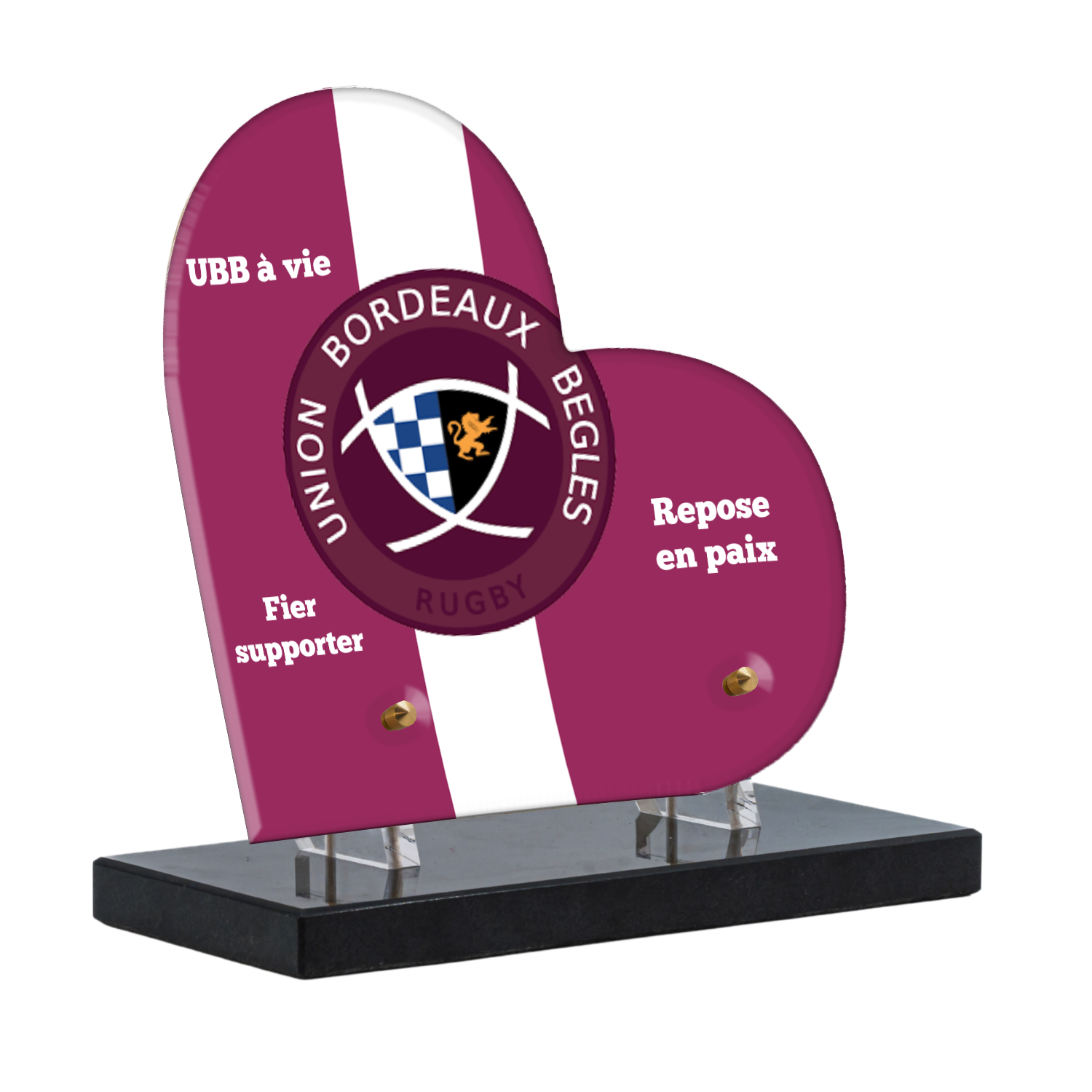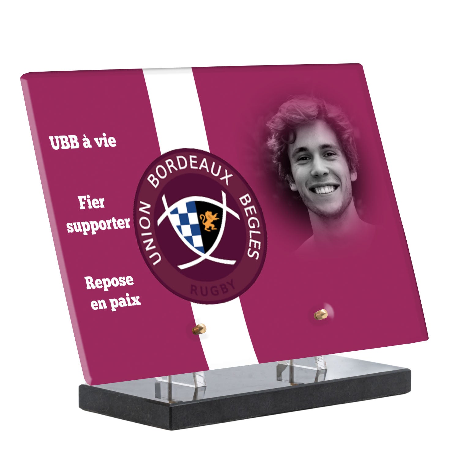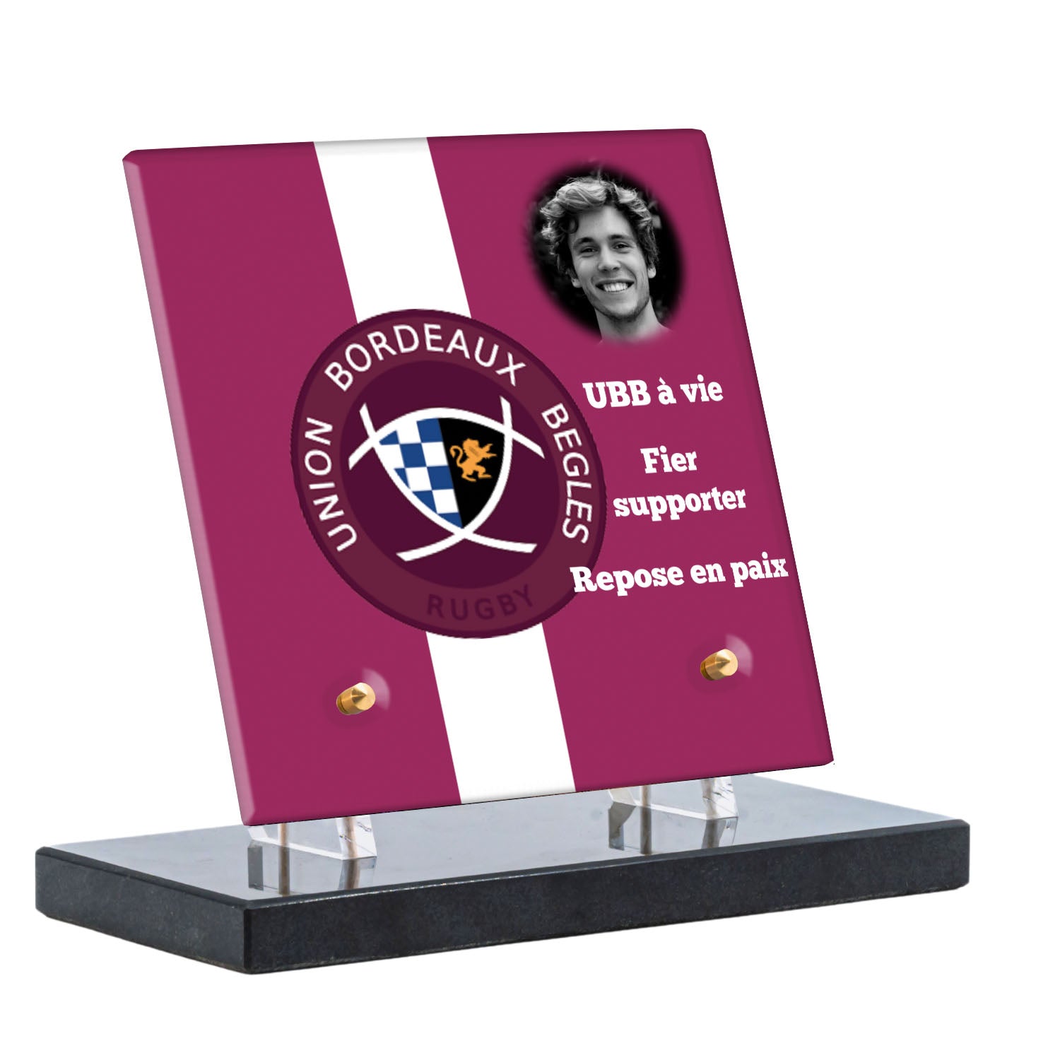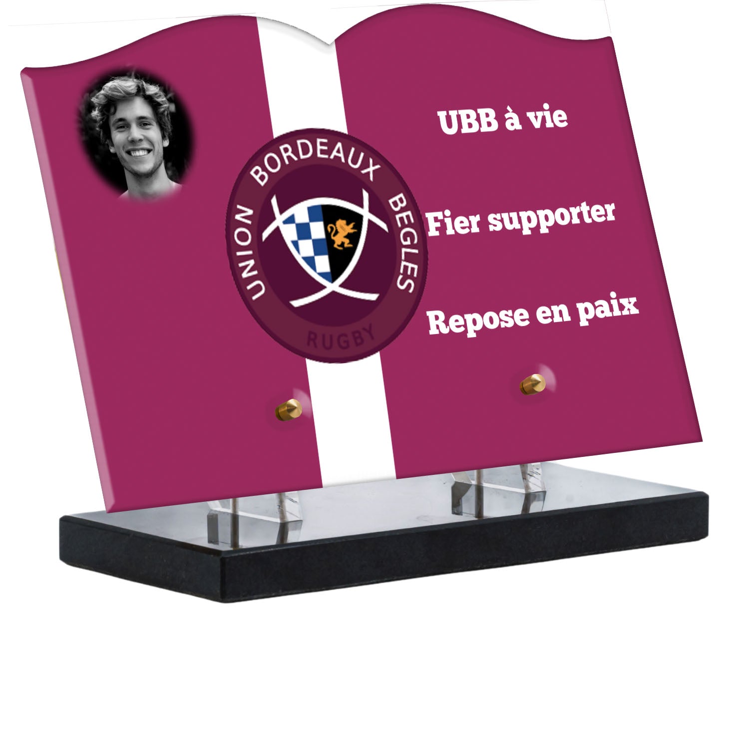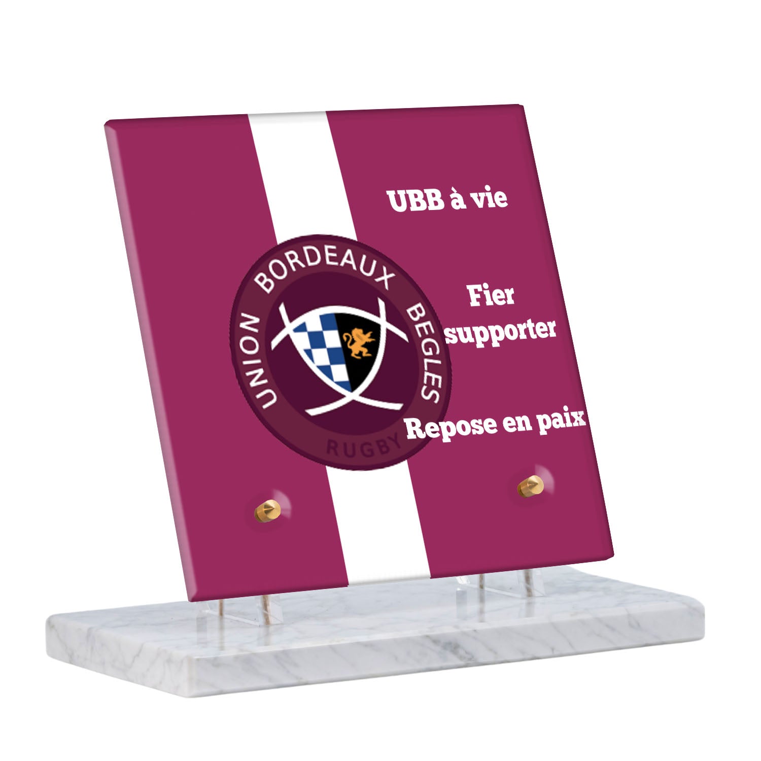 Offrez un hommage unique avec cette plaque funéraire personnalisée arborant fièrement le logo de l’Union Bordeaux Bègles (UBB). Conçue en plexiglas de haute qualité, cette plaque funéraire moderne allie élégance et durabilité, parfaite pour une plaque mortuaire qui respecte la mémoire de vos proches avec distinction.
