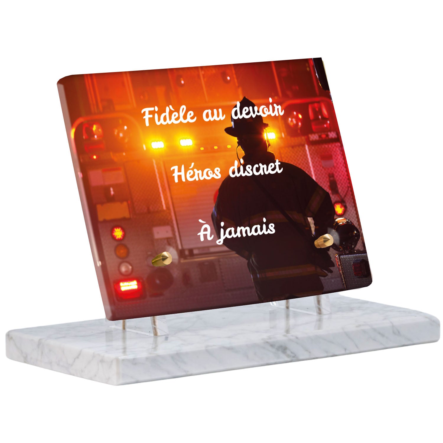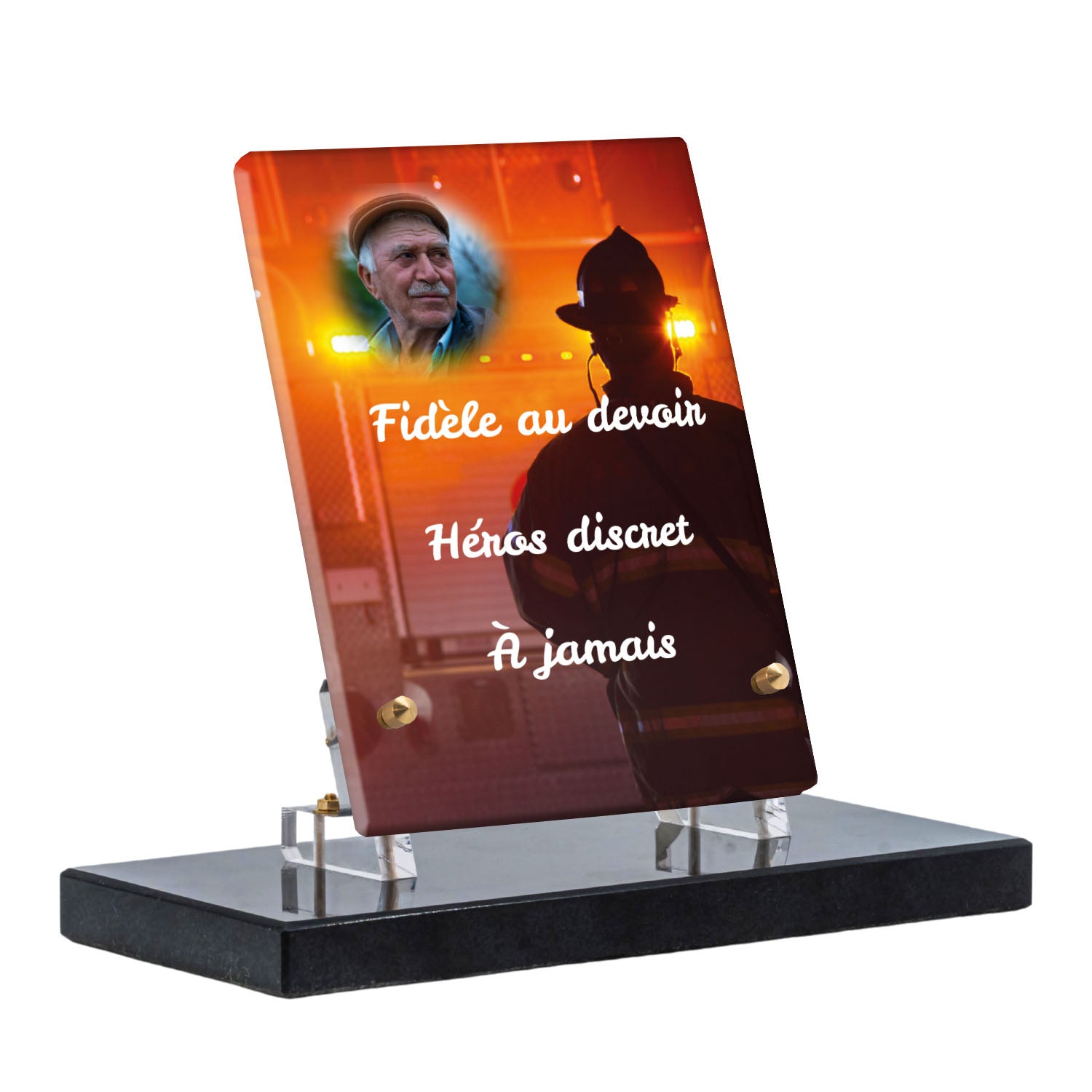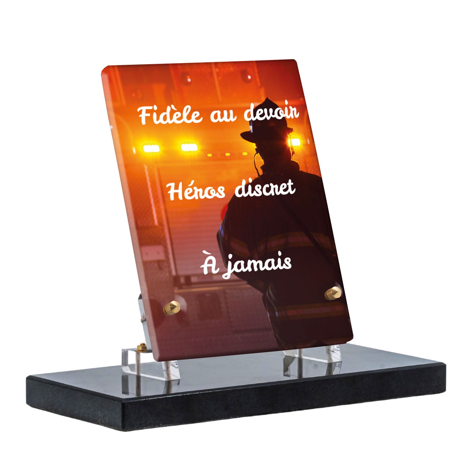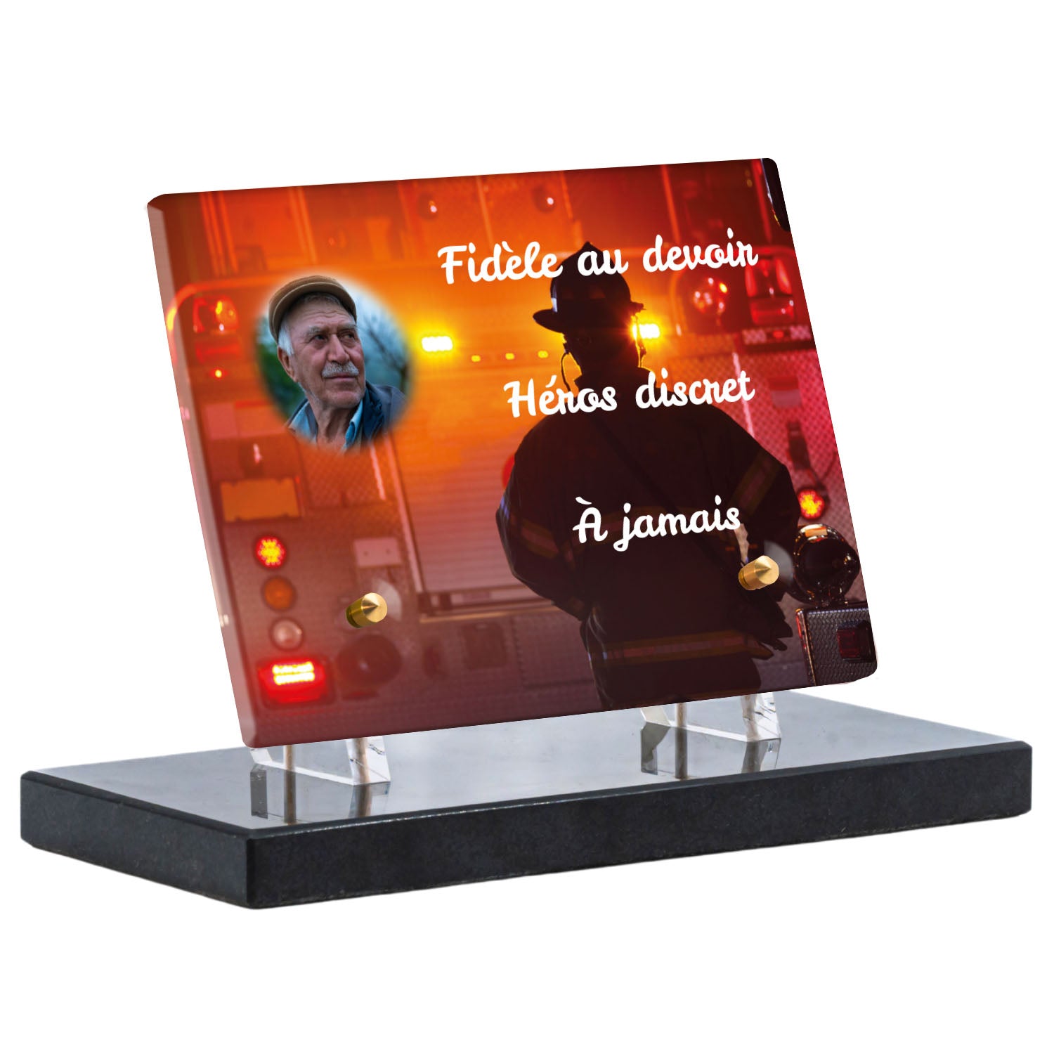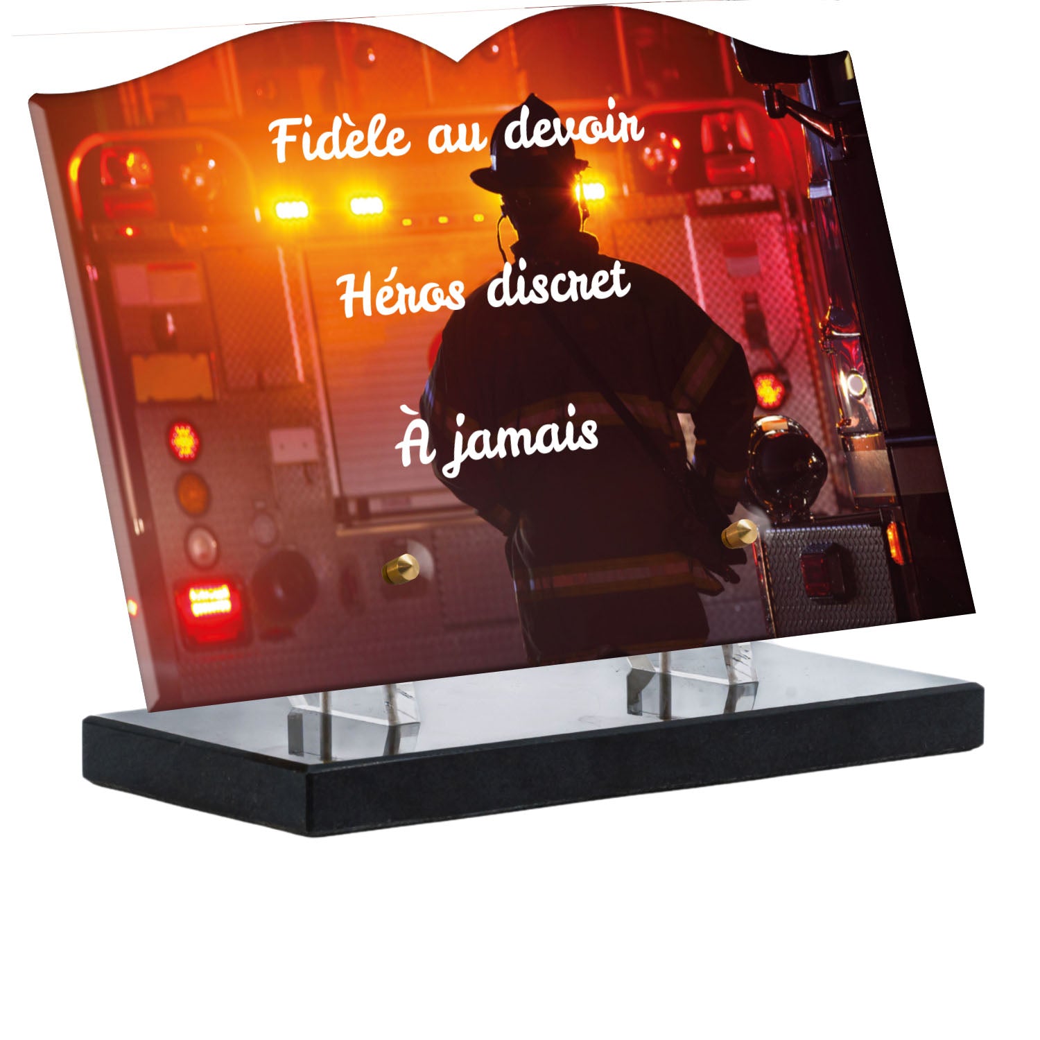 Cette plaque funéraire personnalisée rend hommage aux pompiers avec un design sobre et élégant. Réalisée en plexiglas, elle présente un visuel gravé représentant un casque de pompier et une lance d'incendie, symboles forts du courage et du dévouement. Ce modèle combine à la fois la modernité et le respect, faisant de cette plaque mortuaire un choix parfait pour une commémoration durable.
