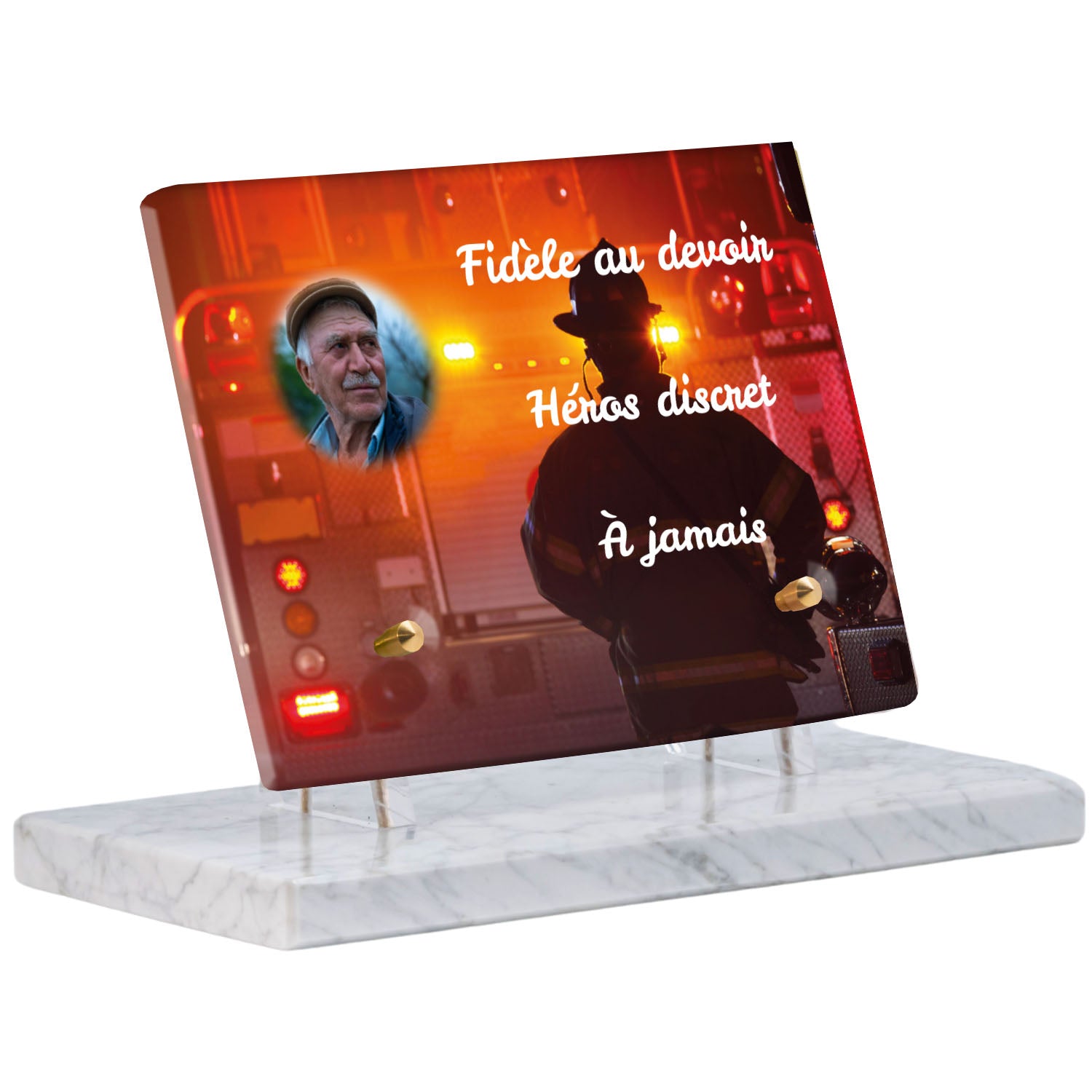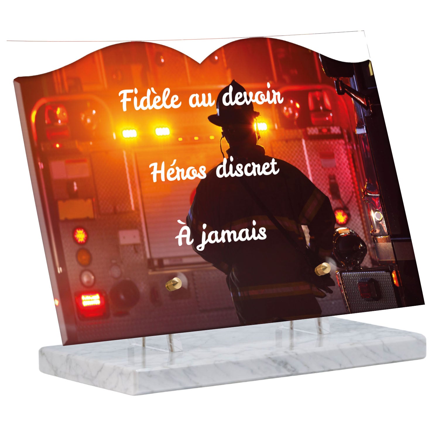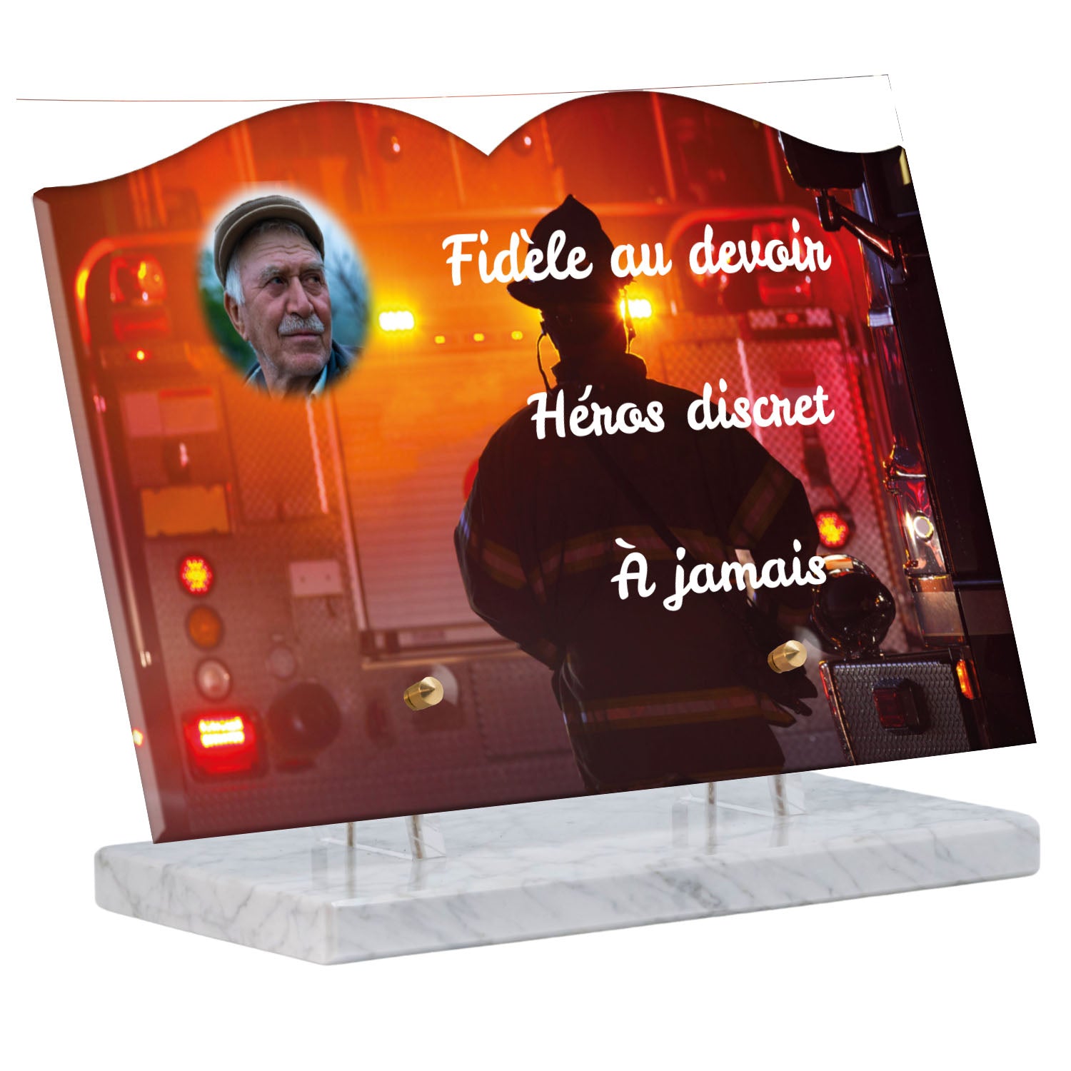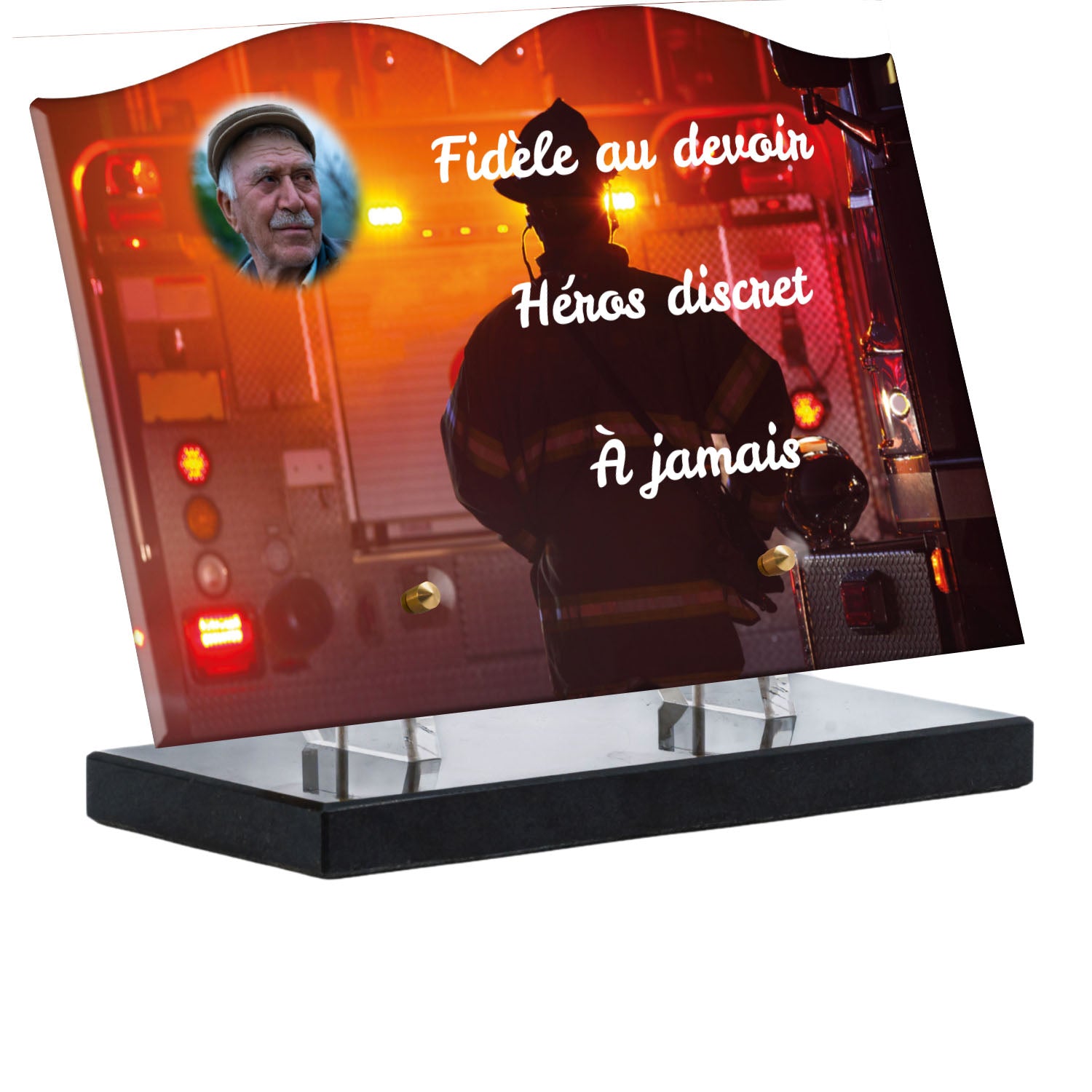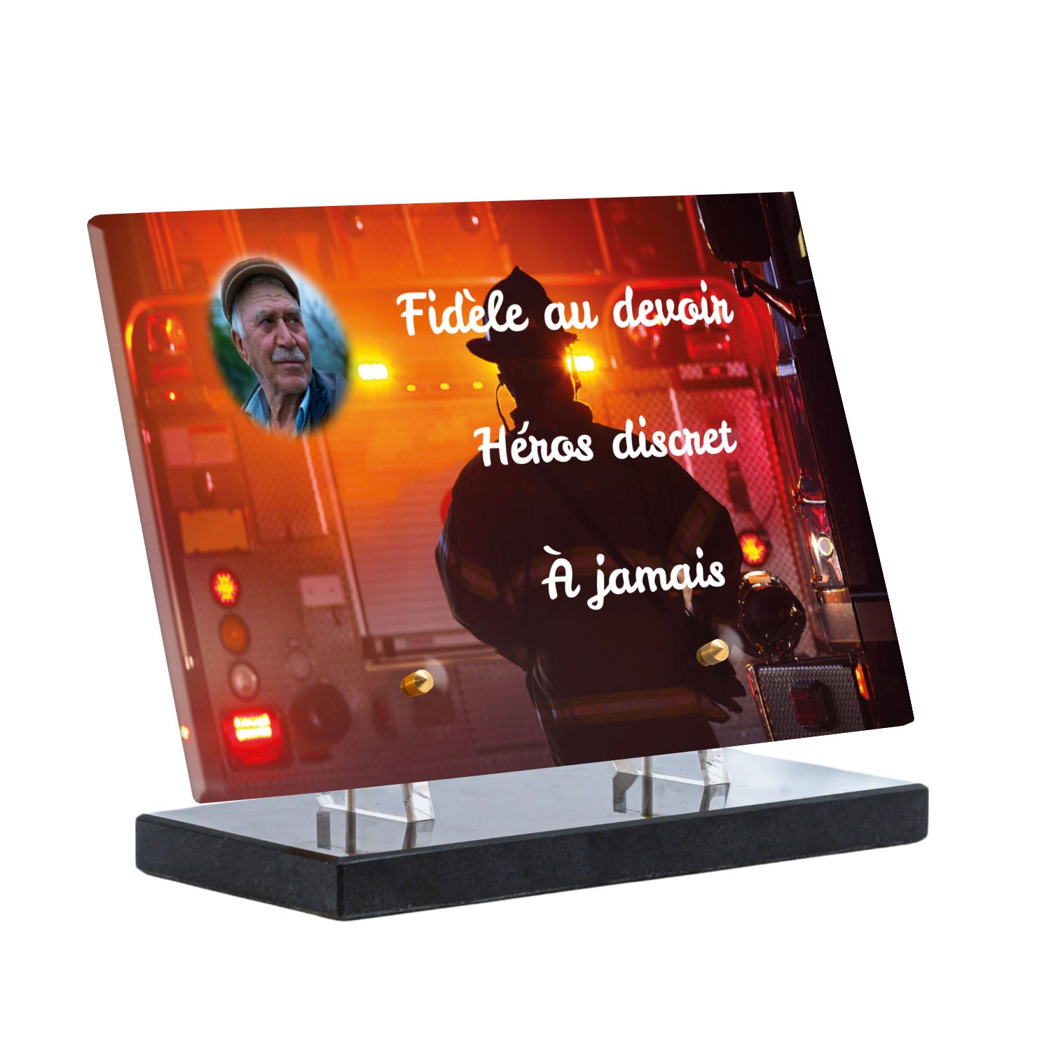 Cette plaque funéraire personnalisée rend hommage aux pompiers avec un design sobre et élégant. Réalisée en plexiglas, elle présente un visuel gravé représentant un casque de pompier et une lance d'incendie, symboles forts du courage et du dévouement. Ce modèle combine à la fois la modernité et le respect, faisant de cette plaque mortuaire un choix parfait pour une commémoration durable.