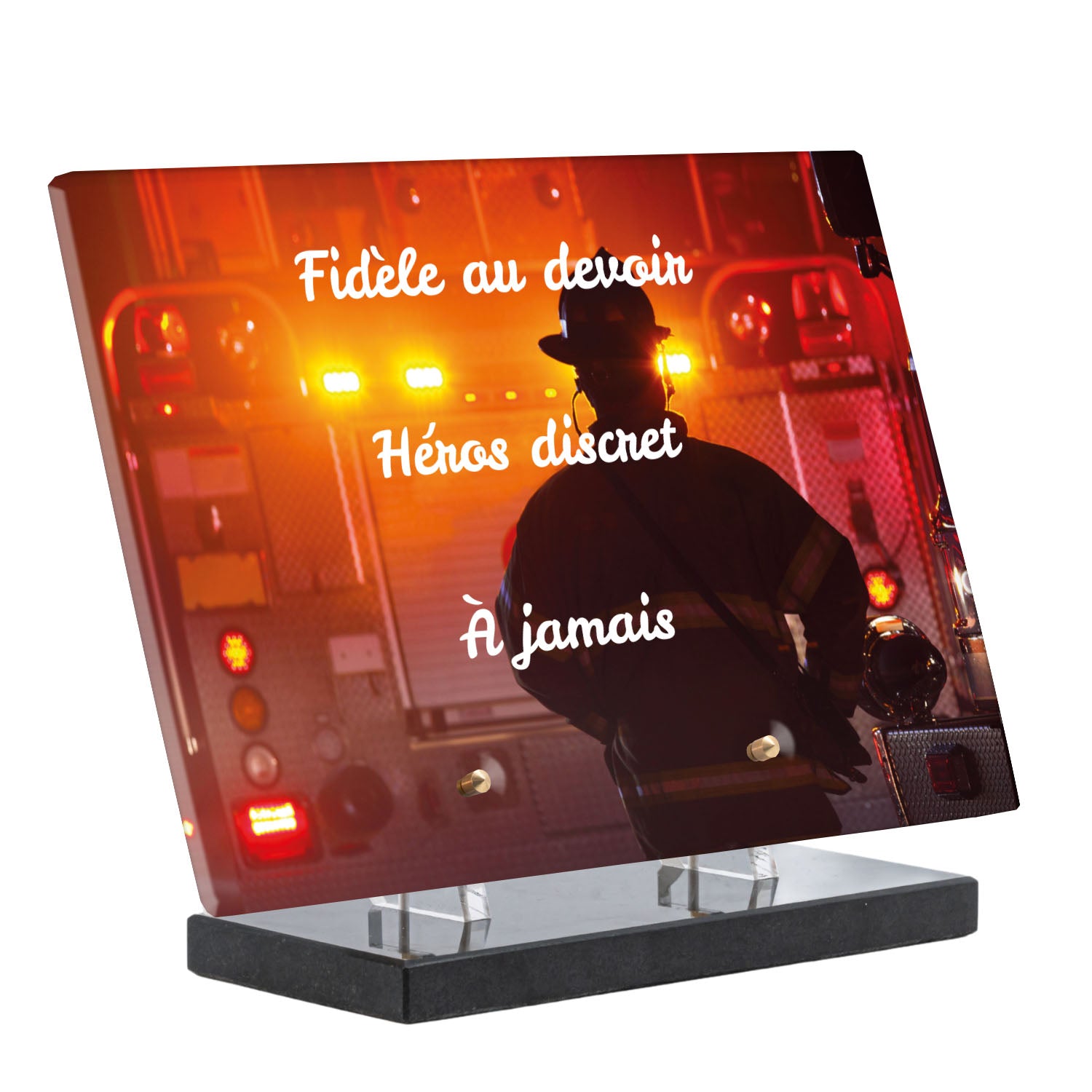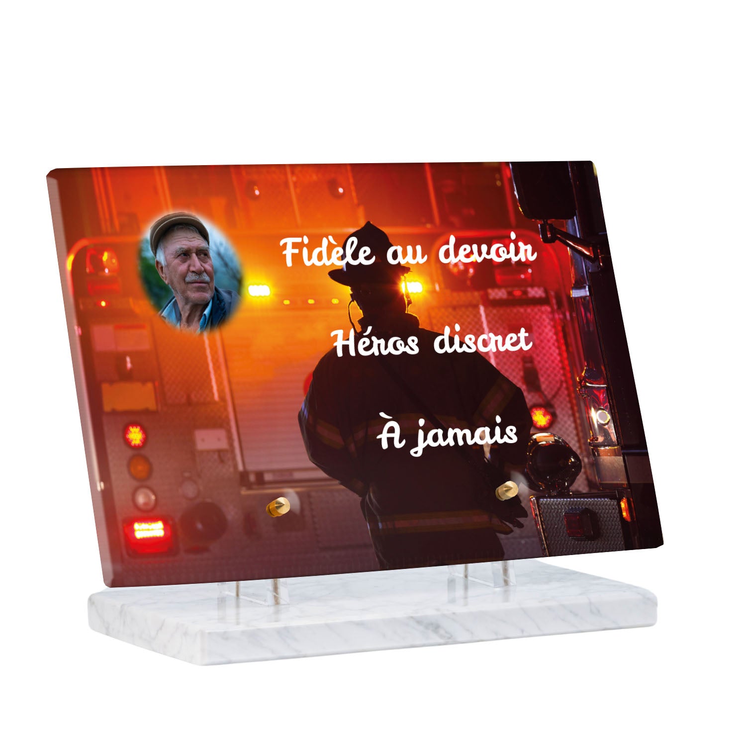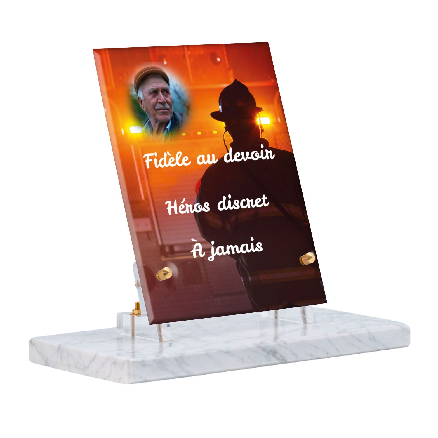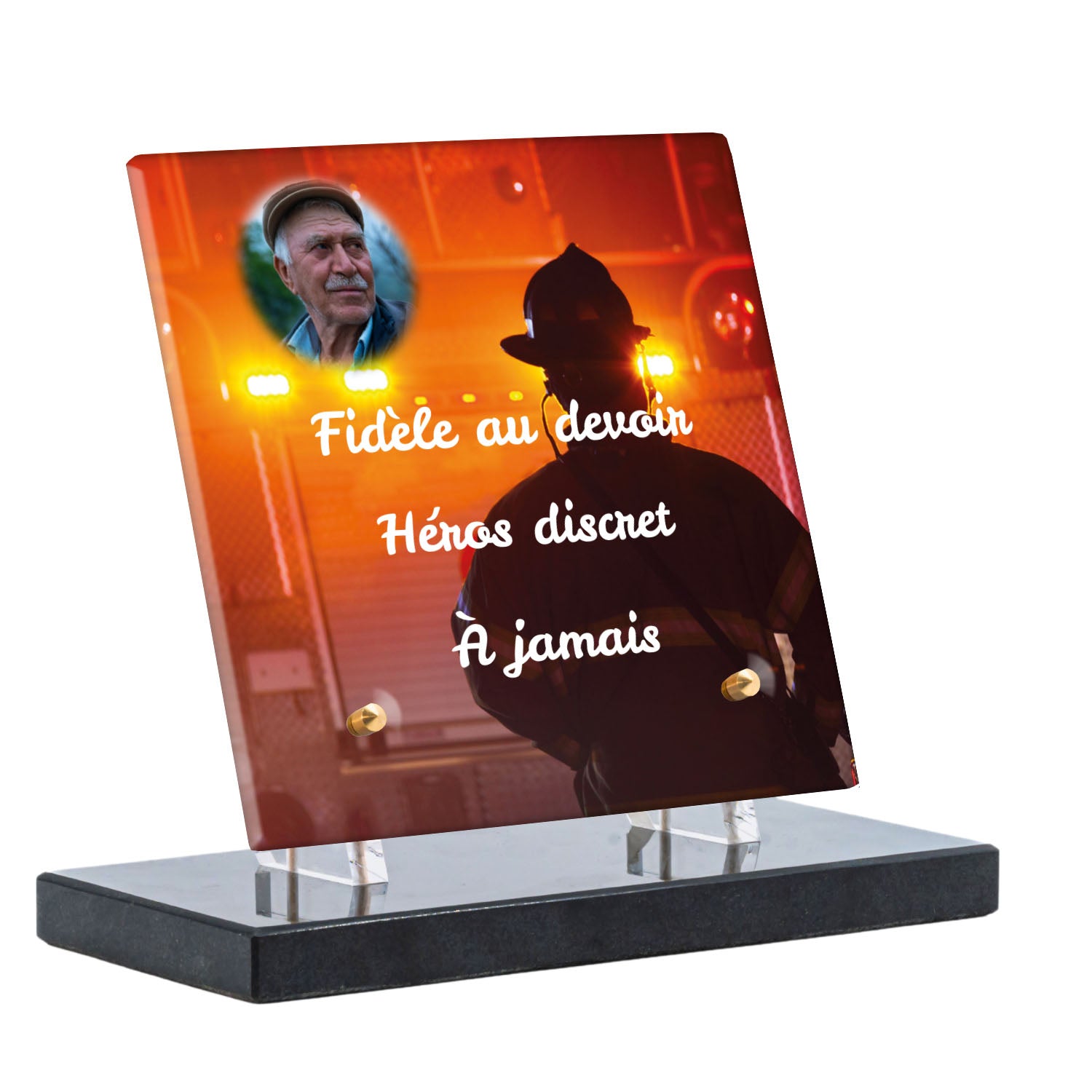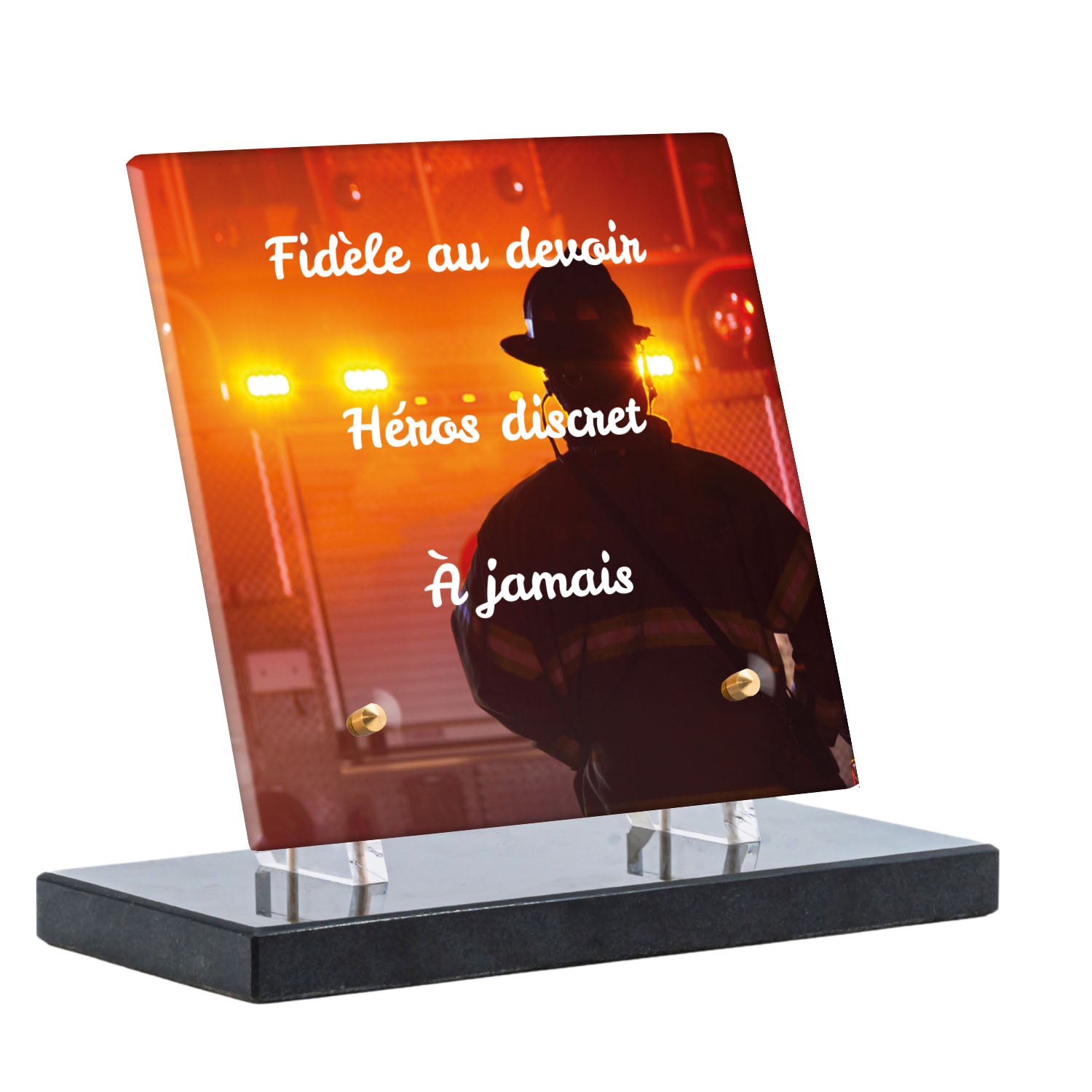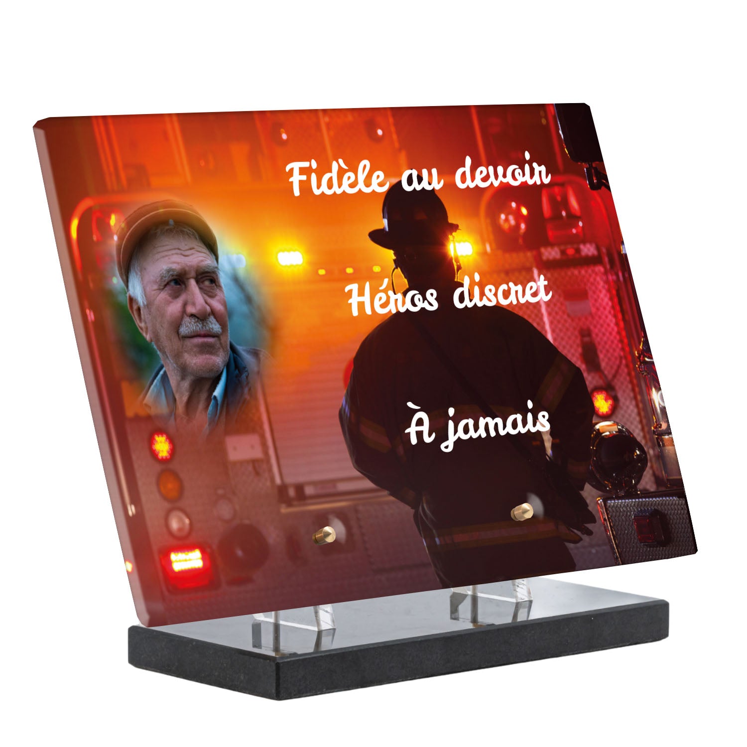 Cette plaque funéraire personnalisée rend hommage aux pompiers avec un design sobre et élégant. Réalisée en plexiglas, elle présente un visuel gravé représentant un casque de pompier et une lance d'incendie, symboles forts du courage et du dévouement. Ce modèle combine à la fois la modernité et le respect, faisant de cette plaque mortuaire un choix parfait pour une commémoration durable.